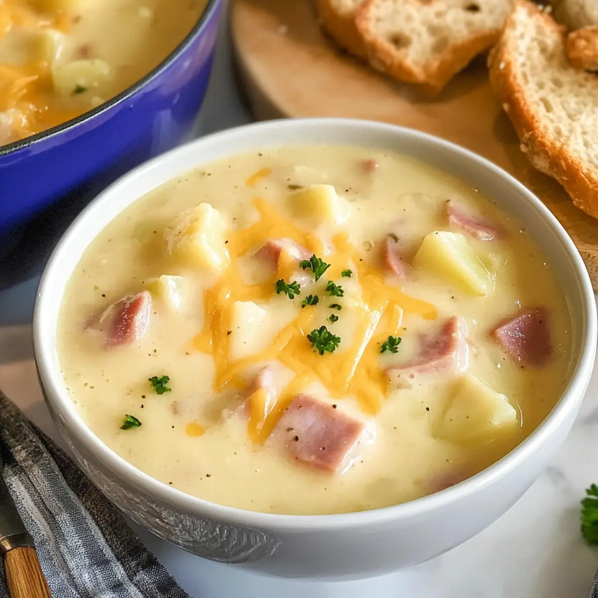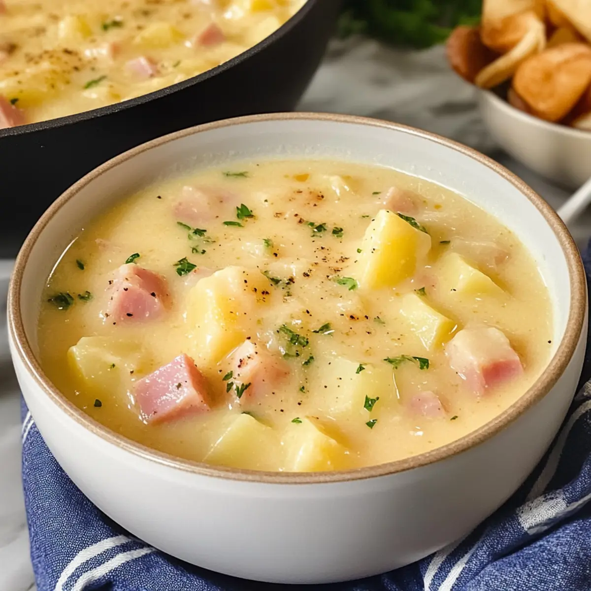 Diese Käse-Schinken-Kartoffelsuppe ist ein herzhaftes und cremiges Gericht, ideal für kalte Tage und bietet eine tolle Möglichkeit, übrig gebliebenen Schinken zu verwerten.