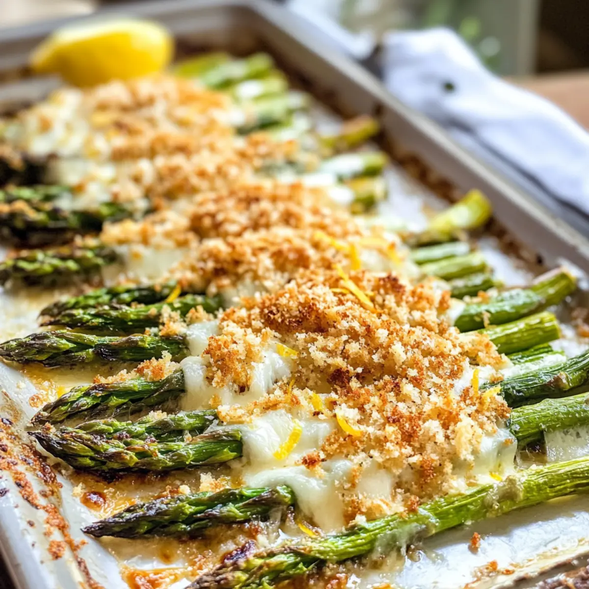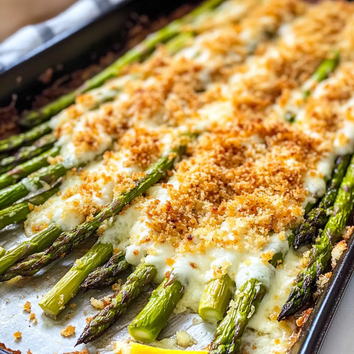 Die ersten Sonnenstrahlen des Frühjahrs wecken in mir das Verlangen nach frischen, leichten Gerichten, und nichts verkörpert diese Sehnsucht besser als mein Rezept für Käseüberbackenen Spargel. In dieser köstlichen Variante vereinen sich zarter Spargel und schmelzender Käse zu einer unwiderstehlichen Seite, die sich perfekt für sommerliche Grillabende oder festliche Menüs eignet. Diese leckere Kombination aus knusprigen Panko-Bröseln mit einem Hauch von Zitrone macht jeden Bissen zu einem Erlebnis. Ob als leichter Snack oder als Begleitung zu einem herzhaften Gericht – dieses Rezept ist nicht nur schnell zubereitet, sondern sorgt auch für Begeisterung bei Familie und Freunden. Wer kann da schon widerstehen? Lass uns gemeinsam die Geheimnisse dieses köstlichen Gerichts entdecken! Warum wirst du dieses Rezept lieben? Einfachheit pur: Die Zubereitung ist unkompliziert und benötigt nur wenige Grundkenntnisse in der Küche. Frischer Geschmack: Der zarte Spargel kombiniert mit schmelzendem Käse und spritziger Zitrone zaubert ein unvergessliches Aroma, das perfekt für den Sommer ist. Knusprige Texturen: Der knackige Panko-Belag sorgt für einen aufregenden Biss und macht jeden Löffel zu einem Geschmackserlebnis. Vielseitig: Egal, ob als Beilage zu einem Grillgericht oder als leichter Snack – dieser Käseüberbackene Spargel passt immer! Zeitersparnis: In nur 30 Minuten bist du bereit, deine Gäste mit diesem köstlichen Gericht zu verwöhnen. Wenn du weitere Ideen für einfache und schnelle Rezepte suchst, schau dir auch unseren Artikel zu leckeren vegetarischen Grillgerichten an! Käseüberbackener Spargel Zutaten • Für diesen köstlichen Käseüberbackenen Spargel benötigst du nur die besten Zutaten! Für den Spargel Spargel – Achte darauf, frische, grüne Stangen zu wählen und die holzigen Enden abzuschneiden. Olivenöl – Sorgt für einen reichhaltigen Geschmack und hilft, den Spargel gleichmäßig zu rösten; kann durch Avocadoöl ersetzt werden. Salz & Pfeffer – Unverzichtbare Gewürze für den perfekten Geschmack; verwende Meersalz für ein intensiveres Aroma. Für den Käse-Topping Mozzarella – Schmilzt wunderbar und sorgt für eine köstlich cremige Konsistenz; ersetzbar durch Provolone für einen herzhafteren Geschmack. Parmesan – Gibt eine salzige und nussige Note; kann durch Pecorino Romano ersetzt werden. Für die Panko-Kruste Butter – Wird verwendet, um die Panko-Brösel zu rösten und verleiht ihnen einen reichen, nussigen Geschmack; alternativ kann vegane Butter genutzt werden. Panko-Brösel – Erzeugt eine knusprige Kruste; für eine glutenfreie Variante verwende glutenfreies Panko. Knoblauchpulver – Fügt den Bröseln eine herzhafte Tiefe hinzu; frischer, gehackter Knoblauch ist ebenfalls eine gute Option. Zitronensaft und -schale – Bringt Frische und einen spritzigen Geschmack ins Spiel; verwende frische Zitrone für den besten Effekt. Mit dieser Zusammenstellung deiner Zutaten steht einem gelungenen Käseüberbackenen Spargel nichts mehr im Weg! Lass es dir schmecken! Schritt-für-Schritt-Anleitung für Käseüberbackenen Spargel Schritt 1: Ofen vorheizen Heize deinen Ofen auf 190 °C (375 °F) vor und fette ein Backblech mit etwas Olivenöl ein. Dadurch wird sichergestellt, dass der Käseüberbackene Spargel nicht anhaftet und schön gleichmäßig röstet. Ein gut vorgeheizter Ofen ist entscheidend für ein perfektes Ergebnis. Schritt 2: Spargel vorbereiten Wasche den frischen Spargel gründlich und schneide die holzigen Enden ab. Verteile die Spargelstangen gleichmäßig auf dem Backblech und beträufle sie mit Olivenöl. Würze sie mit Salz und Pfeffer, damit die Aromen gut zur Geltung kommen. Achte darauf, dass alle Stangen gut umhüllt sind. Schritt 3: Spargel rösten Röste den vorbereiteten Spargel im Ofen für etwa 15-17 Minuten, bis er zart und leicht gebräunt ist. Der Spargel sollte weich, aber immer noch bissfest sein. Diese erste Röstepause bringt die natürlichen Aromen zur Geltung und bereitet den Spargel auf das Käse-Topping vor. Schritt 4: Käse hinzufügen Nimm das Backblech mit dem Spargel aus dem Ofen und streue gleichmäßig den frischen Mozzarella und Parmesan darüber. Stelle das Blech wieder in den Ofen und backe es für weitere 2-3 Minuten, bis der Käse geschmolzen und leicht golden ist. Achte darauf, dass der Käse schön blubbert – das sieht nicht nur gut aus, sondern schmeckt auch fantastisch! Schritt 5: Panko-Kruste rösten Während der Spargel im Ofen ist, erhitze eine Pfanne bei mittlerer Hitze und lasse die Butter darin schmelzen. Füge die Panko-Brösel hinzu und röste sie für 5-7 Minuten, bis sie goldbraun und knusprig sind. Rühre regelmäßig um, damit sie gleichmäßig bräunen. Diese knusprige Kruste wird dem Käseüberbackenen Spargel eine wunderbare Textur verleihen. Schritt 6: Mit Zitrone würzen Streue nach dem Rösten der Panko-Brösel das Knoblauchpulver und den Zitronensaft hinzu und lasse alles für eine zusätzliche Minute in der Pfanne. Diese Kombination sorgt für eine spritzige Note, die perfekt mit dem Käseüberbackenen Spargel harmoniert und das Gericht hebt. Schritt 7: Anrichten und servieren Nehme den Käseüberbackenen Spargel aus dem Ofen und bestreue ihn großzügig mit den knusprigen Panko-Bröseln. Garniere das Gericht mit etwas frischer Zitronenschale, um die Aromen abzurunden. Serviere den Spargel warm aus dem Ofen, um die köstliche Textur des Käseüberbackenen Spargels zu bewahren und deine Gäste zu begeistern! Was passt zu Käseüberbackenem Spargel? Der köstliche Käseüberbackene Spargel ist ein Genuss, der sich perfekt in ein vollständiges sommerliches Menü integrieren lässt. Frische Tomatensalat: Ein leichter Salat aus reifen Tomaten und frischem Basilikum bringt leuchtende Farben und frische Aromen auf den Tisch, die wunderbar mit dem Käseüberbackenen Spargel harmonieren. Knusprige Bruschetta: Diese knusprigen Brothäppchen mit Tomaten und Knoblauch s