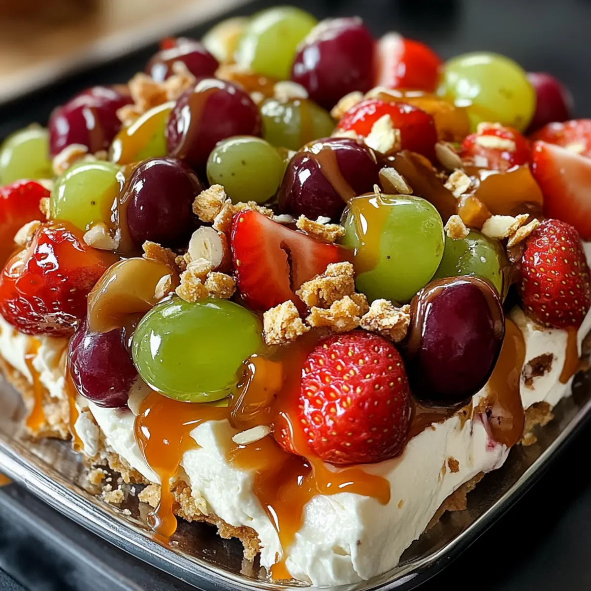 Ein köstlicher Karamell Crunch Käsekuchen Obstsalat, der cremigen Käsekuchen, frischen Früchten und knusprigem Karamell vereint - perfekt für den Sommer!