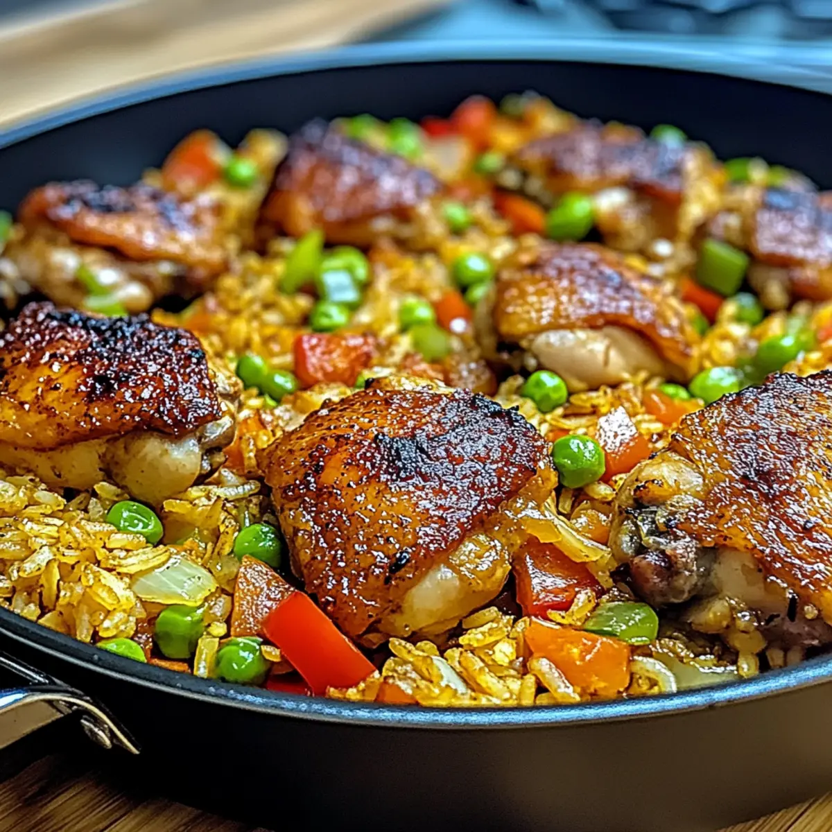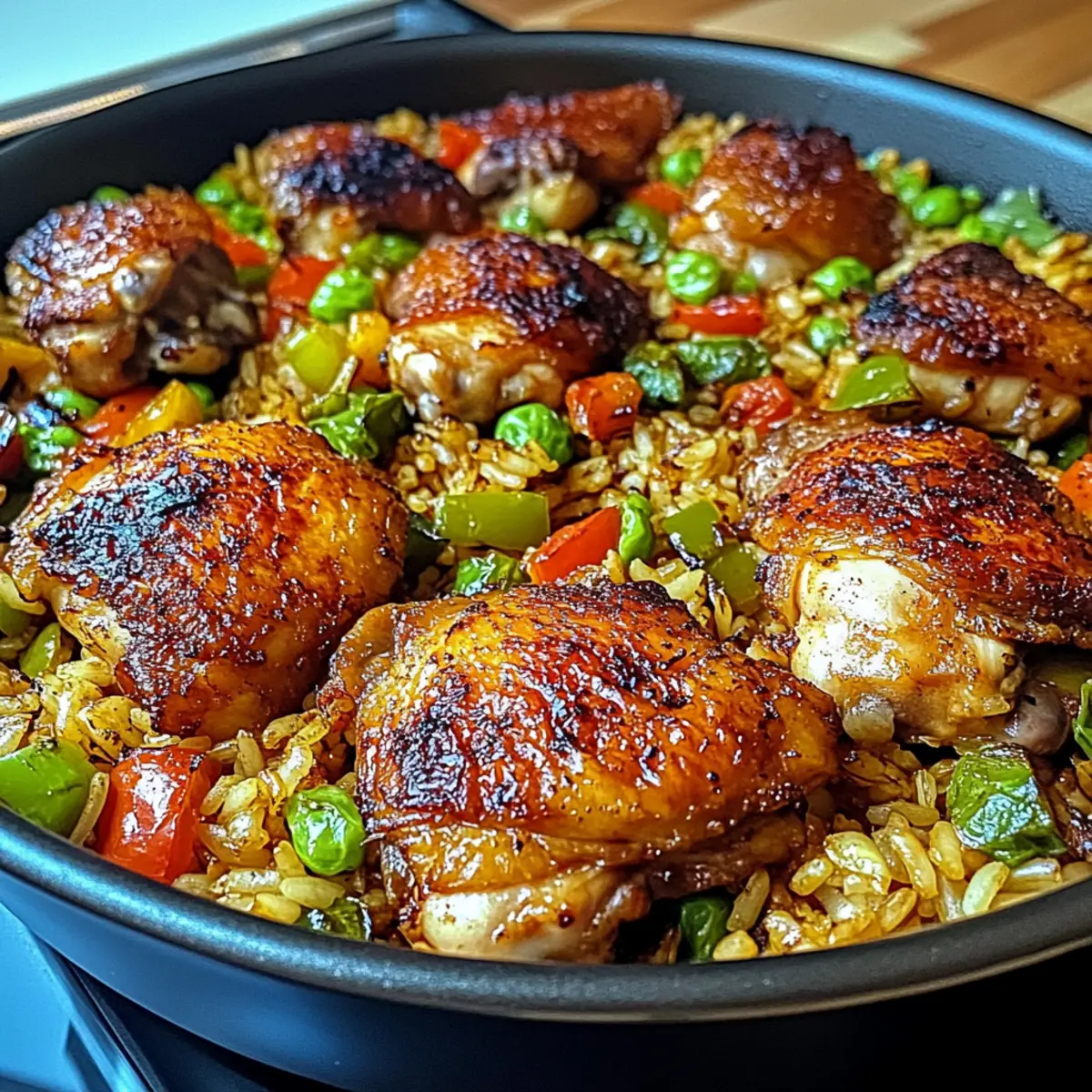 Auf dem Tisch verteilt sich der verlockende Duft von Gewürzen, während ich in meiner Küche stehe und die Zubereitung von Karibisches Hühnchen und Reis beginne. Dieses herzhafte Gericht bringt nicht nur ein Stück tropisches Flair in eurem Alltag, sondern lässt sich auch in weniger als einer Stunde zaubern. Die Kombination aus zarten Hühnchenschenkeln und cremigem Kokosnussreis wird selbst an hektischen Abenden zu einem wahren Genuss. Das Beste daran: Das Rezept ist äußerst anpassbar und erlaubt es euch, die Schärfe perfekt auf euren Geschmack abzustimmen. Seid ihr bereit, eure Geschmacksknospen auf eine kleine Reise in die Karibik zu entführen? Warum ist dieses Rezept ein Hit? Einfache Zubereitung: Mit nur einer Pfanne und minimalem Aufwand könnt ihr in kürzester Zeit ein köstliches Dinner zaubern. Vielseitig anpassbar: Ihr könnt die Zutaten je nach Vorlieben variieren — von extra scharf bis hin zu einer vegetarischen Option mit Tofu. Reichhaltiger Geschmack: Die Mischung aus Gewürzen und Kokosnuss verleiht diesem Gericht eine unerreichte Tiefe und Wärme. Familienfreundlich: Ideal für Familienessen, denn jeder kann mit einem Lächeln am Tisch sitzen und genießen. Zeitersparnis: Perfekt für hektische Wochentage — weniger Kochgeschirr bedeutet weniger Aufräumarbeit! Verwendet dieses Rezept als Grundlage und entdeckt weitere köstliche Variationen für Karibisches Hühnchen und Reis, um euer Abendessen noch aufregender zu gestalten! Karibisches Hühnchen und Reis Zutaten • Entdecke die Zutaten, die dir helfen, dieses köstliche karibische Gericht zu zaubern! Für das Hühnchen Hühnchenschenkel – Saftig und geschmackvoll; mit Knochen sorgt es für zusätzlichen Reichtum. Kann durch Hähnchenbrust oder Tofu ersetzt werden. Olivenöl – Zum Anbraten des Hühnchens; kann durch jede bevorzugte Pflanzenöloption ersetzt werden. Für den Reis Langkornreis – Jasmin oder Basmati absorbiert die Aromen perfekt; vor dem Kochen gründlich abspülen für eine lockere Konsistenz. Kokosmilch – Sorgt für eine cremige Textur und sanfte Süße; unbe sweetened für die besten Ergebnisse verwenden. Hühnerbrühe – Fügt Feuchtigkeit hinzu und verstärkt die herzhafte Tiefe; sowohl hausgemachte als auch gekaufte sind gut. Für das Gemüse Rote und grüne Paprika – Bringt Farbe, Knackigkeit und Süße; probiere auch Zucchini oder Mais für zusätzliche Variationen. Frühlingszwiebeln – Bieten einen frischen, milden Zwiebelgeschmack; können durch normale Zwiebeln ersetzt werden. Knoblauch – Aromatische Basis für intensiven Geschmack; Knoblauchpulver kann verwendet werden, wenn frischer nicht verfügbar ist. Frischer Thymian – Verleiht einen aromatischen, erdigen Geschmack; kann durch 1 Teelöffel getrockneten Thymian ersetzt werden. Für die Gewürze Gemahlener Piment – Schlüsselgewürz, das warme, aromatische Noten bietet, die für die karibische Küche einzigartig sind. Paprika – Fügt eine subtile Rauchnote hinzu; Cayenne kann verwendet werden, um zusätzliche Schärfe hinzuzufügen. Salz/Pfeffer – Essenzielle Gewürze für die Geschmacksbalance. Optionale Zusätze Cayenne oder scharfe Sauce – Verwende dies, um den gewünschten Schärfegrad anzupassen. Dieses Rezept für Karibisches Hühnchen und Reis ist nicht nur einfach zuzubereiten, sondern auch vollgepackt mit Flavour! Schritt-für-Schritt-Anleitung für Karibisches Hühnchen und Reis Step 1: Hühnchen vorbereiten Die Hühnchenschenkel trocken tupfen und anschließend mit Salz, Pfeffer, Piment und Paprika würzen. Diese Gewürzmischung sorgt für ein vollmundiges Aroma. Lass die gewürzten Hühnchen für etwa 10 Minuten ruhen, damit die Aromen einziehen können, während du die Pfanne vorbereitest. Step 2: Hühnchen anbraten Erhitze in einer großen Pfanne bei mittlerer bis hoher Hitze etwas Olivenöl. Sobald das Öl heiß ist, die Hühnchenschenkel mit der Hautseite nach unten hineinlegen und 5-6 Minuten goldbraun anbraten. Wende das Hühnchen und brate es weitere 2-3 Minuten, bis es leicht gegart ist. Dann nimm es aus der Pfanne und lege es beiseite. Step 3: Gemüse anbraten In derselben Pfanne, die du für das Hühnchen verwendet hast, die Hitze auf mittel reduzieren. Jetzt Knoblauch, Frühlingszwiebeln und die geschnittenen Paprika hinzufügen und für etwa 2-3 Minuten anbraten, bis sie leicht weich sind. Dies gibt dem Gemüse die nötige Zeit, seine Aromen freizusetzen und das Gericht lebendig zu machen. Step 4: Reis kochen Füge nun den Langkornreis in die Pfanne und rühre gut um, sodass er die Aromen aufnimmt. Verleih dem Gericht eine cremige Note, indem du die Kokosmilch und die Hühnerbrühe hinzufügst. Ein wenig frischen Thymian und eine Prise Salz dazugeben, alles gut vermischen und zum Simmern bringen. Step 5: Gericht köcheln lassen Im nächsten Schritt die angebratenen Hühnchenschenkel zurück in die Pfanne legen. Dann die Pfanne abdecken und das Ganze 20-25 Minuten bei niedriger Hitze köcheln lassen, bis der Reis gar und das Hühnchen vollständig durchgegart ist (innere Temperatur von 75 °C). Halte einen Blick auf die Flüssigkeit und rühre gelegentlich um. Step 6: Haut knusprig machen Für die letzten 5 Minuten der Kochzeit den Deckel abnehmen, um die Haut des Hühnchens knusprig zu machen und überschüssige Flüssigkeit verdampfen zu lassen. Dies verleiht dem Gericht eine wunderschöne Textur und Intensität. Step 7: Garnieren und servieren Vor dem Servieren die Hühnchenschenkel auf Teller anrichten und mit frischen, geschnittenen Frühlingszwiebeln garnieren. Serviere das Karibische Hühnchen und Reis warm und genieße das wunderbare Aroma und die Farben dieses tropischen Gerichts. Was passt gut zu Karibischem Hühnchen und Reis? Das perfekte Gericht ist nur der Anfang — entdecke, wie du mit köstlichen Beilagen ein komplettes Essen zauberst! Frittierte Plantains: Süß und knusprig sind frittierte Plantains der ideale Begleiter, um ein süßes Gegengewicht zu dem herzhaft