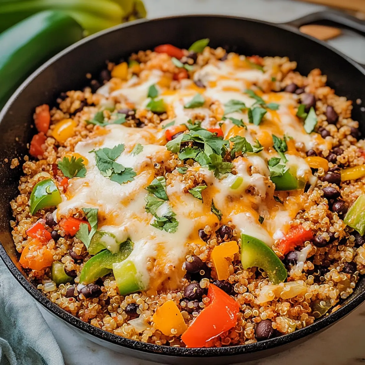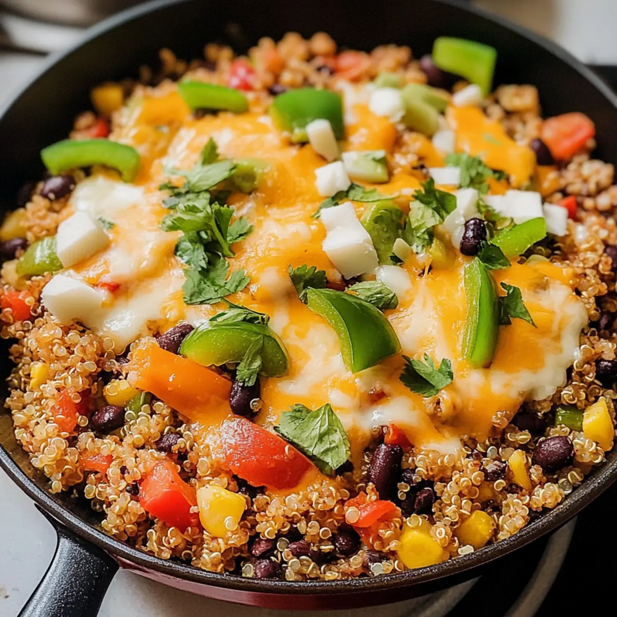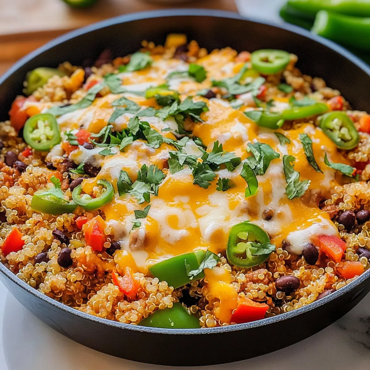 Eines Abends, als ich in meiner Küche stand und immer wieder die gleichen, eintönigen Rezepte durchging, überkam mich die Sehnsucht nach etwas Neuem. Genau in diesem Moment entstand die Idee für die Käse-Quinoa & Schwarze-Bohnen-Taco-Pfanne! Diese vegetarische Mahlzeit ist nicht nur ein Hochgenuss, sondern auch ein echtes Powerpaket voller Proteine und Nährstoffe – und das alles in weniger als 30 Minuten! Mit der herzhaften Kombination von Quinoa, schwarzen Bohnen und schmelzendem Käse wird jeder Bissen zu einem Erlebnis, das nicht nur sättigt, sondern auch begeistert. Und das Beste daran? Diese Pfanne ist super gesund und ideal für alle, die dem Fast-Food-Alltag entkommen möchten. Bist du bereit, die bunte und köstliche Welt dieser Taco-Pfanne zu entdecken? Warum wirst du dieses Rezept lieben? Einfachheit: Diese Käse-Quinoa & Schwarze-Bohnen-Taco-Pfanne ist in weniger als 30 Minuten zubereitet! Perfekt für hektische Abende, an denen du ein schnelles, aber schmackhaftes Essen möchtest. Gesundheit: Mit Quinoa und schwarzen Bohnen ist dieses Gericht vollgepackt mit Proteinen und Ballaststoffen, die deine Energie steigern. Vielseitigkeit: Du kannst die Zutaten nach deinem Geschmack anpassen, sei es durch zusätzliche Gemüse wie Zucchini oder durch die Wahl anderer Käsesorten. Köstlicher Geschmack: Die Kombination aus herzhaften Gewürzen und schmelzendem Käse sorgt für ein Geschmackserlebnis, das bei der ganzen Familie beliebt ist. Wenig Aufwand: Keine komplizierten Schritte, alles in einer Pfanne! Rentierbar zum Kochen für dich und deine Gäste. Entdecke jetzt auch andere schnelle und gesunde Rezepte für den Alltag, die deinen Speiseplan aufpeppen werden! Käse-Quinoa & Schwarze-Bohnen-Taco-Pfanne Zutaten Für die Basis Quinoa – sorgt für eine proteinreiche und ballaststoffreiche Grundlage. Substitution: Verwende braunen Reis für eine ähnliche Textur. Wasser – entscheidend für das Kochen der Quinoa; keine Substitution nötig. Für das Gemüse Olivenöl – dient zum Sautieren der Gemüse und verleiht einen reichen Geschmack. Substitution: Avocadoöl funktioniert auch gut. Gelbe Zwiebel – bringt Süße und ein aromatisches Fundament ins Gericht. Substitution: Rote Zwiebeln für einen kräftigeren Geschmack. Paprika (Rot und Gelb) – sorgt für Süße und Knusprigkeit. Substitution: Jede Paprika-Variante kann verwendet werden. Jalapeno – verleiht einen pikanten Geschmack; optional je nach Vorliebe für Schärfe. Substitution: Eine Prise rote Paprikaflocken für etwas Würze. Knoblauch – sorgt für aromatischen Geschmack und Tiefe; benutze frischen Knoblauch für intensiveren Genuss. Feuergeröstete Tomaten aus der Dose – bringen Frische und Feuchtigkeit; Substitution: Gewöhnliche gehackte Tomaten sind auch möglich. Für die Beläge Schwarze Bohnen – proteinreicher Hauptbestandteil; gibt dem Gericht Fülle und Herzhaftigkeit. Substitution: Nimm Kidneybohnen für eine abwechslungsreiche Note. Chilipulver – verleiht dem Gericht Wärme und Geschmacksfülle; für das Taco-Gewürz unerlässlich. Keine Substitutionen empfohlen. Kreuzkümmel – verstärkt die Erdigkeit der Gerichte; unverzichtbar für den Geschmack. Keine Substitutionen empfohlen. Knoblauchpulver – fügt intensiven Knoblauchgeschmack hinzu. Optional: durch frischen Knoblauch ersetzen. Zwiebelpulver – ergänzt den Geschmack der frischen Zwiebel; optional. Paprika – sorgt für Farbe und eine milde Rauchigkeit; verwende geräuchertes Paprika für zusätzlichen Umami-Geschmack. Salz und Pfeffer – wesentliche Würze, die nach Geschmack angepasst werden kann. Für das Topping Geriebener Käse (Cheddar oder Tex-Mex) – sorgt für Cremigkeit und Geschmack; eine wichtige Zutat für den perfekten Abschluss. Substitution: Veganer Käse für eine pflanzliche Variante. Korianderblätter, Avocado, gehackter grüner Zwiebel (optional zum Servieren) – frische Garnierungen, die Farbe und Geschmack hinzufügen. Mit diesen Zutaten bist du bereit, eine köstliche Käse-Quinoa & Schwarze-Bohnen-Taco-Pfanne zuzubereiten. Viel Spaß beim Kochen! Schritt-für-Schritt-Anleitung für Käse-Quinoa & Schwarze-Bohnen-Taco-Pfanne Step 1: Quinoa kochen Bring in einem mittelgroßen Topf 2 Tassen Wasser zum Kochen. Füge die Quinoa hinzu und reduziere die Hitze auf niedrige Stufe. Lass die Quinoa etwa 15 Minuten lang köcheln, bis das Wasser absorbiert ist und die Körner fluffig erscheinen. Achte darauf, die Quinoa gelegentlich zu überprüfen, damit sie nicht anbrennt. Step 2: Zwiebel und Gemüse anbraten Erhitze in einer großen Pfanne bei mittlerer Hitze einen Esslöffel Olivenöl. Gib die gewürfelte gelbe Zwiebel hinzu und sauté für 2-3 Minuten, bis sie duftet und leicht glasig wird. Achte darauf, dass das Gemüse gleichmäßig angebraten wird, damit sich die Aromen gut entfalten können. Step 3: Paprika und Gewürze hinzufügen Füge die gewürfelten roten und gelben Paprika, den Jalapeno und den Knoblauch zur Pfanne hinzu. Brate alles 3-4 Minuten an, bis das Gemüse weich ist und Farbe annimmt. Rühre zwischendurch um, damit nichts anbrennt und die Aromen sich gut vermischen. Step 4: Tomaten und schwarze Bohnen einrühren Gib die feuergerösteten Dosen-Tomaten samt Saft sowie die abgespülten schwarzen Bohnen in die Pfanne. Würze die Mischung mit Chili-Pulver, Kreuzkümmel, Knoblauchpulver, Zwiebelpulver, Paprika, Salz und Pfeffer. Koche alles für 2-3 Minuten, bis es gut durchwärmt ist und die Aromen sich verbinden. Step 5: Quinoa untermischen Reduziere die Hitze auf niedrig und füge die gekochte Quinoa in die Pfanne hinzu. Mische alles gut durch, sodass die Quinoa gleichmäßig mit den Gewürzen und den anderen Zutaten verbunden ist. Lass die Mischung weitere 2 Minuten auf niedriger Hitze kochen, um die Aromen zu intensivieren. Step 6: Käse hinzufügen und schmelzen Streue den geriebenen Käse gleichmäßig über die Quinoa- und Bohnenmischung. Decke die Pfanne ab und lass den Käse für 3-5 