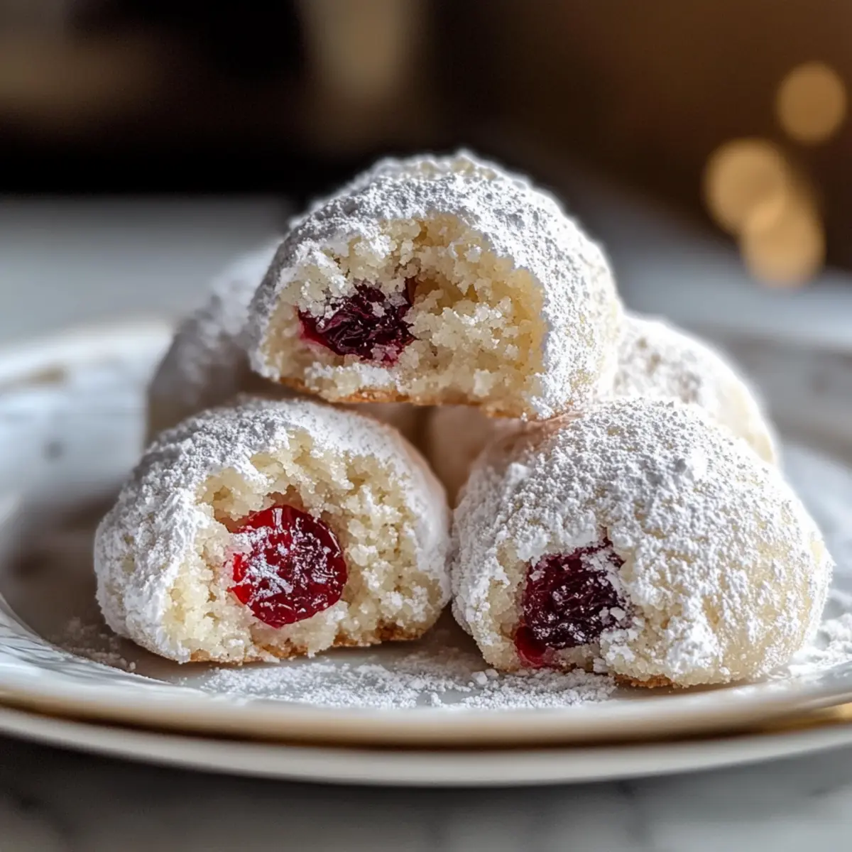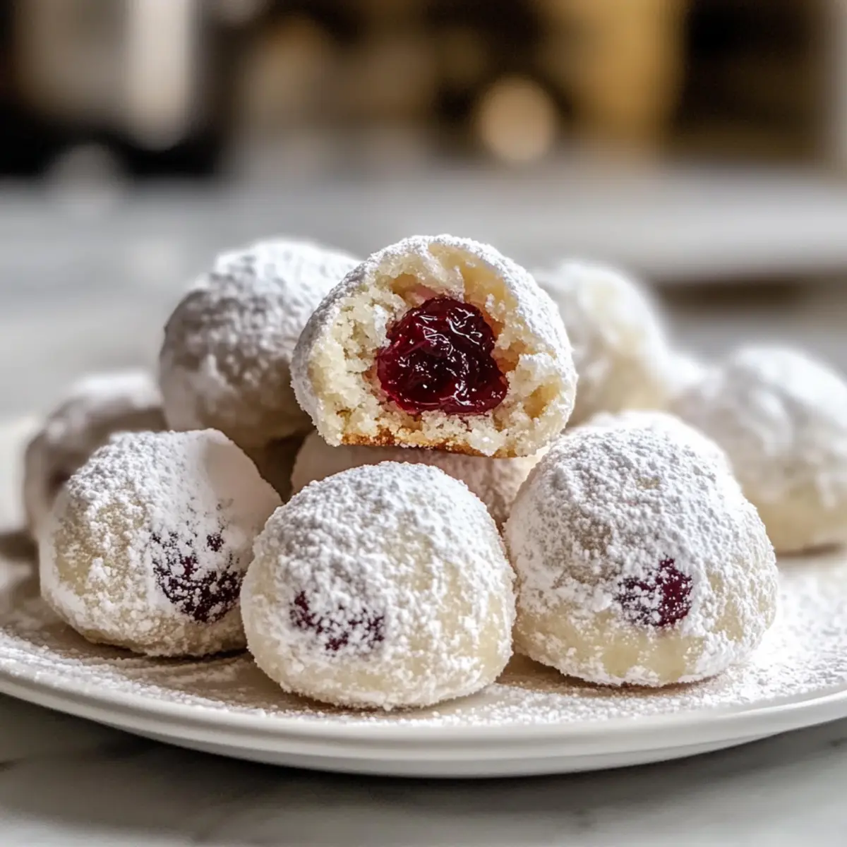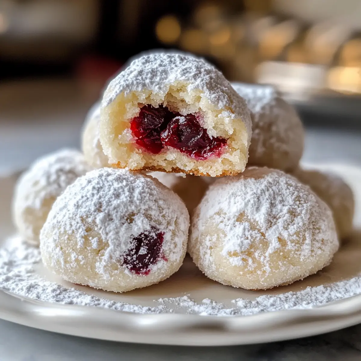 Mit einem sanften Plätschern erinnere ich mich an meine Kindheit, als der Duft von frisch gebackenen Kirschen-Schneeball-Keksen den ganzen Raum erfüllte. Diese zarten, buttrigen Köstlichkeiten schmelzen förmlich auf der Zunge und bringen die süß-saure Frische von Kirschen perfekt zur Geltung — umhüllt von einer pudrigen Zuckerschicht, die an frisch gefallenen Schnee erinnert. Ideal für festliche Anlässe oder einfach als Verwöhnung für einen gemütlichen Nachmittag, kombinieren diese Kekse spielerisch Einfachheit mit einer eleganten Note und sind damit ein absoluter Hit für jeden Kaffeeklatsch. Sie sind schnell zubereitet und passen hervorragend zu einem warmen Getränk, das den Herbst umarmt. Bereit, Ihren nächsten Keks-Abend zu einem besonderen Erlebnis zu machen? Warum sind Kirschen-Schneeball-Kekse ein Muss? Unvergleichlicher Geschmack: Diese Kirschen-Schneeball-Kekse vereinen zarte Butterigkeit mit dem fruchtigen Kick von Kirschen. Einfache Zubereitung: Schnelle Schritte und wenige Zutaten machen die Herstellung zum Kinderspiel, ideal für jede Kochkunst. Vielseitige Variationen: Experimentieren Sie mit verschiedenen Nüssen oder Füllungen, um neue Geschmackserlebnisse zu schaffen! Perfect für jede Gelegenheit: Ob als festliches Dessert oder einfach zum Kaffee — sie sind immer ein Hit! Ein Hauch von Nostalgie: Diese Kekse wecken Erinnerungen an warme Kindheitstage, die jeden Bissen besonders machen. Schnelles Teigrezept: Bereiten Sie den Teig in kurzer Zeit vor — mehr Zeit für das Genießen und weniger für das Kochen! Kirschen-Schneeball-Kekse Zutaten • Diese köstlichen Kirschen-Schneeball-Kekse benötigen einige einfache, aber qualitativ hochwertige Zutaten für das beste Geschmackserlebnis! Für den Teig Ungesalzene Butter – sorgt für einen reichen Geschmack und eine zarte Textur; stellen Sie sicher, dass sie weich genug ist für einfaches Mischen. Puderzucker – verleiht die nötige Süße und wird für die finale Beschichtung verwendet; auch nach dem Backen ist zusätzliche Zuckermenge nötig. Reiner Vanilleextrakt – intensiviert die Aromen; erwägen Sie, für mehr Komplexität auch Mandel- oder Kokosnuss-Extrakt zu verwenden. Allzweckmehl – liefert die Hauptstruktur; für eine luftige Textur gut sieben. Salz – hebt die Aromen hervor und balanciert die Süße. Getrocknete sauer Kirschen – sorgen für einen süß-säuerlichen Kick; ersetzen Sie frisch verpackte Kirschen durch andere getrocknete Früchte wie Cranberries. Pekannüsse oder Walnüsse – fügen einen knusprigen Biss hinzu; können durch andere fein gehackte Nüsse wie Mandeln oder Haselnüsse ersetzt werden. Für die Dekoration Zusätzlicher Puderzucker – ideal, um die Kekse nach dem Backen in den „Schnee“ zu tauchen; sorgt für eine hübsche und köstliche Präsentation. Schritt-für-Schritt-Anleitung für Kirschen-Schneeball-Kekse Schritt 1: Zutaten vorbereiten Stellen Sie sicher, dass die ungesalzene Butter zimmerwarm und weich ist, damit sie sich leicht mischen lässt. Sieben Sie das Allzweckmehl in eine Schüssel, um Klumpen zu entfernen, und hacken Sie die getrockneten sauer Kirschen sowie die Nüsse grob. Diese Vorbereitung ist entscheidend, um die Kirschen-Schneeball-Kekse gleichmäßig zuzubereiten. Schritt 2: Butter und Zucker cremig rühren In einer großen Rührschüssel die weiche Butter mit einem Handmixer oder einer Küchenmaschine geschmeidig rühren. Fügen Sie nach und nach 1/2 Tasse Puderzucker hinzu und schlagen Sie alles für etwa 3-4 Minuten, bis die Mischung hell und cremig ist. Diese Textur sorgt für die zarte Basis der Kirschen-Schneeball-Kekse. Schritt 3: Aromen hinzufügen Bei niedriger Geschwindigkeit die Vanille und optional den Mandel- oder Kokosnuss-Extrakt in die Butter-Zucker-Mischung einarbeiten. Dies stärkt den Geschmack der Kirschen-Schneeball-Kekse und sorgt dafür, dass die Aromen gut miteinander harmonieren. Schritt 4: Trockene Zutaten vermengen In einer separaten Schüssel das gesiebte Mehl mit einer Prise Salz gut vermischen. Diese Mischung sorgt für die Struktur der Kekse und hilft dabei, die Süße der Kirschen auszugleichen. Schritt 5: Mehl zur Buttermischung geben Die Mischung aus Mehl und Salz schrittweise in die Butter-Mischung falten. Rühren Sie den Teig nur so lange, bis gerade alles integriert ist. Vermeiden Sie Übermischung, um die Zartheit der Kirschen-Schneeball-Kekse zu gewährleisten. Schritt 6: Kirschen und Nüsse unterheben Mit einem Teigschaber die gehackten Kirschen und Nüsse vorsichtig unter den Teig heben. Achten Sie darauf, dass die Zutaten gleichmäßig verteilt sind, damit jede Keksportion einen köstlichen Biss der saftigen Kirschen und knusprigen Nüsse bietet. Schritt 7: Teig kühlen (optional) Den Keks-teig in Frischhaltefolie wickeln und für 30 Minuten bis zu 1 Stunde im Kühlschrank ruhen lassen. Dies erleichtert das Formen der Kekse und sorgt dafür, dass sie beim Backen ihre Form behalten. Schritt 8: Ofen vorheizen Heizen Sie den Ofen auf 175°C (350°F) vor und bereiten Sie ein Backblech mit Backpapier vor. Durch das Vorheizen des Ofens wird die optimale Temperatur für perfekt gebackene Kirschen-Schneeball-Kekse sichergestellt. Schritt 9: Kekse formen Nehmen Sie etwa einen Esslöffel Teig und formen Sie ihn zu kleinen Kugeln. Platzieren Sie diese auf dem Backblech mit einem Abstand von 2,5 cm zueinander, um ein Verkleben während des Backens zu verhindern. Schritt 10: Kekse backen Die Kirschen-Schneeball-Kekse 10-12 Minuten im vorgeheizten Ofen backen. Die Kekse sind fertig, wenn die Ränder goldbraun werden und die Mitte leicht fest ist. Achten Sie darauf, dass sie nicht überbacken werden, um die Zartheit zu bewahren. Schritt 11: Abkühlen lassen Die Kekse 5 Minuten auf dem Backblech ruhen lassen, damit sie etwas fester werden. Danach die Kekse vorsichtig auf ein Kuchengitter transferieren, um vollständig abzukühlen. Schritt 12: Erste Beschichtung (solange sie warm sind) Die noch warmen Kirs