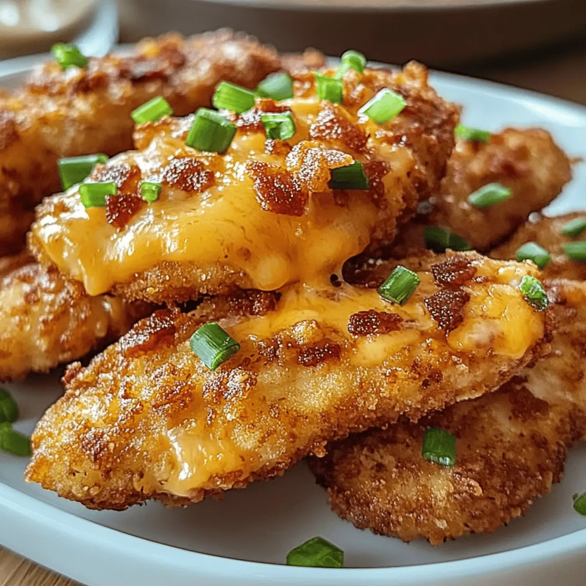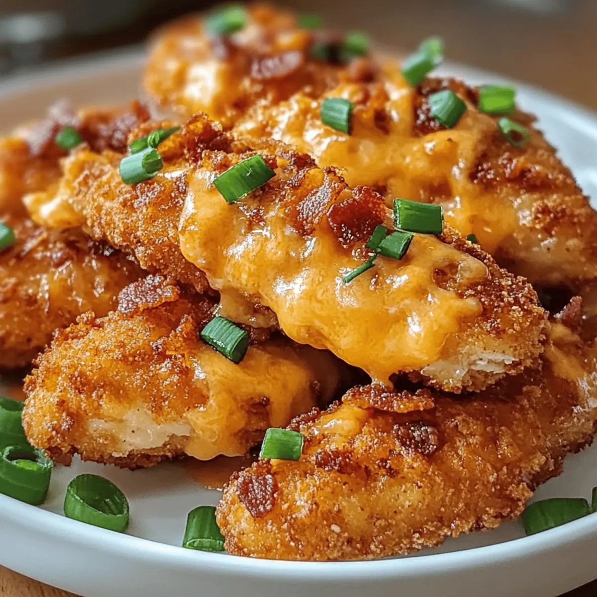 Stell dir vor, duklärst eine neue Geschmacksdimension in deiner Küche – mit knackigen Hähnchenstreifen, die so köstlich sind, dass sie schnell zum neuen Favoriten für jeden Abend werden! Diese knusprigen, käsigen Leckereien sind nicht nur ein ultimativer Genuss für die ganze Familie, sondern auch perfekt für gesellige Abende mit Freunden. Mit einer cremigen Mischung aus Frischkäse und würzigem Ranch-Dressing, garniert mit knusprigem Speck und geschmolzenem Cheddar, zauberst du im Nu ein Gericht, das sowohl auf dem Tisch groß aussieht als auch sich gut anfühlt. Zudem sind diese Hähnchenstreifen low-carb und anpassbar für jeden Geschmack – von kinderfreundlich bis hin zu scharfen Optionen. Bist du bereit, deine Küche in ein geschmackliches Abenteuer zu verwandeln? Warum sind knackige Hähnchenstreifen ein Hit? Knackige Hähnchenstreifen sind der perfekte Snack für jede Gelegenheit! Einfach zuzubereiten, sie benötigen nur wenige Zutaten und sind in kurzer Zeit fertig. Köstliche Vielfalt erwartet dich, denn du kannst die Mischung nach deinem Geschmack anpassen – von scharfen Jalapeños bis zu extra Käse. Ideal für gesellige Abende, ob als Fingerfood oder über einem frischen Salat serviert. Und das Beste? Sie sind low-carb und passen perfekt zu einer gesunden Ernährung. Mach dich bereit, deine Familie und Freunde mit diesen unwiderstehlichen Hähnchenstreifen zu begeistern! Knackige Hähnchenstreifen Zutaten • Entdecke die besten Zutaten für deine knackigen Hähnchenstreifen und bereite dich auf ein Geschmackserlebnis vor! Hähnchenstreifen – Hauptproteinquelle, die Struktur und Geschmack liefert. Substitution: Verwende Putenstreifen für eine magerere Option. Frischkäse – Sorgt für Cremigkeit und bindet die Gewürze. Substitution: Griechischer Joghurt für eine leichtere Variante möglich. Ranch-Gewürzmischung – Verleiht eine würzige, kräutrige Note. Substitution: Selbstgemachte Ranch-Gewürzmischung mit getrockneten Kräutern ist eine tolle Alternative. Knoblauchpulver – Intensiviert die Geschmackstiefe. Auf frischen Knoblauch kann auch zurückgegriffen werden, wenn gewünscht. Zwiebelpulver – Bringt herzhafte Nuancen ins Gericht. Keine Substitution erforderlich. Geriebener Cheddar – Bietet Schmelz und reichhaltigen Geschmack. Substitution: Pfefferjack oder Mozzarella für eine interessante Wendung. Gekochte Speckstücke – Fügen Rauchigkeit und Knusprigkeit hinzu. Substitution: Verwende Putenbacon für eine gesündere Wahl. Olivenöl/Spray – Gewährleistet Knusprigkeit. Keine Substitution notwendig. Gehackte Frühlingszwiebeln (optional) – Bietet Garnitur und frischen Geschmack. Substitution: Frische Petersilie kann verwendet werden. Schritt-für-Schritt-Anleitung für Knackige Hähnchenstreifen Step 1: Ofen vorheizen Heize deinen Ofen auf 190°C (375°F) vor und lege ein Backblech mit Backpapier oder Alufolie aus. Dies sorgt dafür, dass deine knackigen Hähnchenstreifen nicht ankleben und schön gleichmäßig garen. Wenn der Ofen vorgeheizt ist, bist du bereit für die nächste Schritt. Step 2: Mischung zubereiten In einer Schüssel glatt gerührten Frischkäse, Ranch-Gewürzmischung, Knoblauchpulver, Zwiebelpulver und die Hälfte des geriebenen Cheddars gut vermengen. Die cremige Mischung gibt den knackigen Hähnchenstreifen eine würzige Note, während das Rühren sicherstellt, dass alles gut kombiniert ist. Bereite dich vor, den Geschmack in dein Gericht zu bringen! Step 3: Hähnchen vorbereiten Verteile die Hähnchenstreifen gleichmäßig auf dem vorbereiteten Backblech. Sprühe sie leicht mit Olivenöl oder einem Kochspray ein, um sicherzustellen, dass deine knackigen Hähnchenstreifen perfekt knusprig werden. Die Olivenöl-Schicht hilft dabei, die Außenseite schön goldbraun zu braten. Step 4: Mischung auftragen Verteile die cremige Frischkäsemischung gleichmäßig über jede Hähnchenstreifen, sodass sie gut bedeckt sind. Achte darauf, dass jeder Bissen ein Stück der köstlichen Ranch-Cremigkeit enthält. Dies wird die Basis für die köstlichen zusätzlichen Aromen, die noch hinzukommen werden. Step 5: Toppings hinzufügen Streue den restlichen geriebenen Cheddar sowie die knusprigen Speckstücke großzügig über die Hähnchenstreifen. Das sorgt für zusätzliche Aromen und eine köstliche, knusprige Schicht oben drauf. Du willst eine wunderbare Kombination aus Käse- und Speckgeschmack kreieren, die deine knackigen Hähnchenstreifen perfekt abrundet. Step 6: Backen Schiebe das Backblech in den vorgeheizten Ofen und backe die Hähnchenstreifen für 20 bis 25 Minuten. Sie sind fertig, wenn das Hähnchen eine Temperatur von 74°C (165°F) erreicht hat und der Käse schön blubbert und goldbraun aussieht. Halte ein Auge darauf, damit sie nicht verbrennen. Step 7: Garnieren Nimm die knackigen Hähnchenstreifen nach dem Backen aus dem Ofen. Falls gewünscht, streue frisch gehackte Frühlingszwiebeln darüber, um einen frischen Geschmack und eine schöne Garnitur hinzuzufügen. Das ist der letzte Schliff für diese delikate Speise, die jeden begeistert! Variationen & Substitutionen Lass deiner Kreativität freien Lauf, während du dieses Rezept nach deinem Geschmack anpasst! Von geschmackvollen Extras bis hin zu gesunden Alternativen – der Genuss kennt keine Grenzen. Glutenfrei: Verwende glutenfreies Breadcrumbs oder Mandelmehl für die Panade, um diese Köstlichkeit glutenfrei zu genießen. Keto-freundlich: Ersetze die normale Ranch-Gewürzmischung durch eine zuckerfreie Alternative, um den Kohlenhydratgehalt niedrig zu halten. Würzige Variante: Füge angebratene Jalapeños zur Frischkäsemischung hinzu, um den Hähnchenstreifen eine feurige Note zu verleihen. Vegan: Tausche Hühnchen gegen Kichererbsen oder Tofu aus und nutze veganen Frischkäse für eine pflanzliche Option, die ebenso köstlich ist. Käsevielfalt: Experimentiere mit verschiedenen Käsesorten wie Gouda oder Blauschimmelkäse für aufregende Geschmackserlebn