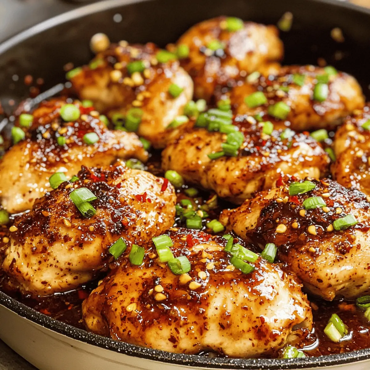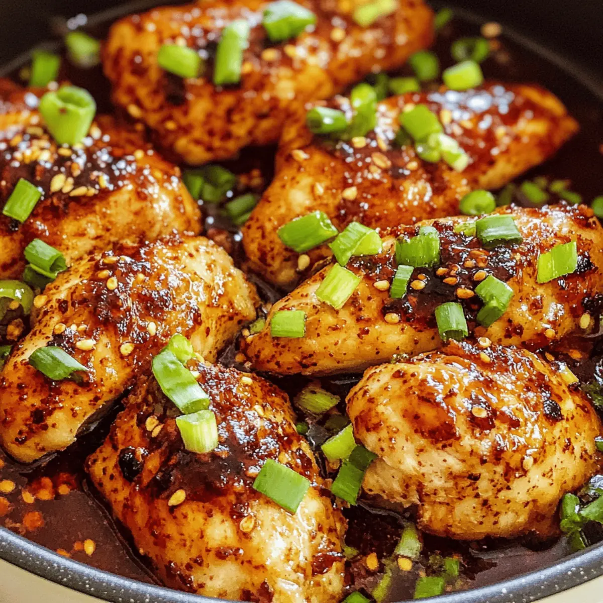 Das Geräusch von brutzendem Hähnchen hat meine Küche erfüllt, als ich zum ersten Mal dieses Rezept für knallbetrunkenes Hähnchen ausprobierte. Die Kombination aus süßem und scharfen Aromen hat mich sofort verzaubert und ich wusste, dass ich ein weiteres schnelles und einfaches Gericht für meine wöchentliche Menüplanung gefunden hatte. Mit einer köstlichen, klebrigen Sauce, die das Hähnchen umhüllt, ist dieses Gericht nicht nur ein echter Gaumenschmaus, sondern auch im Handumdrehen zubereitet. Egal, ob du nach einer gesunden Alternative zu Fast Food suchst oder einfach nur einen aufregenden Abendessen-Genuss möchtest, knallbetrunkenes Hähnchen ist genau das Richtige. Welche Variante wirst du als nächstes ausprobieren? Warum wirst du dieses Rezept lieben? Einfachheit: Die Zubereitung ist kinderleicht und benötigt keine speziellen Kochkünste – perfekt für Anfänger! Köstliche Aromen: Die Mischung aus süßem und würzigem Geschmack wird deine Geschmacksnerven begeistern und jedem Gaumen schmeicheln. Vielfältige Variationen: Du kannst Hähnchenbrust durch Hähnchenkeulen oder sogar Rindfleisch ersetzen und so neue spannende Geschmackserlebnisse kreieren. Schnell und praktisch: In nur 30 Minuten hast du ein leckeres, frisch zubereitetes Abendessen auf dem Tisch – ideal für stressige Wochentage! Gesunde Alternative: Vergiss Fast Food, dieses knallbetrunkene Hähnchen ist nicht nur lecker, sondern auch nährstoffreich. Wenn du auf der Suche nach mehr schnellen Rezepten bist, schau dir auch mein Rezept für schnelle Rindfleisch-Tacos an! Knallbetrunkene Hähnchen Zutaten Für das Hähnchen Hähnchenbrust – ca. 1,5 lbs, verwendbar sind auch Hähnchenkeulen für mehr Saftigkeit. Für die Sauce Knoblauch – 3 Zehen, frisch gehackt sorgt für aromatische Tiefe. Ingwer – 1 Teelöffel, frisch gehackt gibt einen würzigen Kick und kann durch gemahlenen Ingwer ersetzt werden. Olivenöl – ¼ Tasse, sorgt für Geschmack und Feuchtigkeit; alternativ eignet sich auch Pflanzenöl. Sojasauce – ¼ Tasse, verwendet niedrigen Natriumgehalt für gesundere Variante; Tamari ist glutenfrei. Brauner Zucker – 2 Esslöffel, dieser balanciert die Aromen; Honig kann auch verwendet werden. Rote Paprikaflocken – 1 Teelöffel, für die Schärfe; einfach nach persönlichem Schärfewunsch anpassen. Scharfe Sauce – 1 Esslöffel, wie Sriracha, um einen zusätzlichen Kick hinzuzufügen. Schwarzer Pfeffer – 1 Teelöffel, für die Feinheit der Gewürze. Für die Garnitur Frühlingszwiebel – optional, Hacken für Farbe und Frische. Petersilie – optional, frisch gehackt bringt Helligkeit ins Gericht. Dieses Rezept für knallbetrunkenes Hähnchen wird dir nicht nur helfen, deine Kochkünste zu verbessern, sondern bietet auch eine gesunde und schmackhafte Abwechslung im Alltag! Schritt-für-Schritt-Anleitung für knallbetrunkenes Hähnchen Step 1: Backofen vorheizen Heize deinen Backofen auf 230°C (450°F) vor. Während der Ofen sich aufheizt, kannst du sicherstellen, dass alle Zutaten für das knallbetrunkene Hähnchen bereit sind. Bereite eine große Auflaufform vor, in die du später das Hähnchen legen wirst. Step 2: Sauce zubereiten In einer großen Schüssel vermischst du Knoblauch, Ingwer, Olivenöl, Sojasauce, braunen Zucker, rote Paprikaflocken, scharfe Sauce und schwarzen Pfeffer. Verrühre die Zutaten gründlich, bis sich der Zucker auflöst und eine glatte, aromatische Sauce entsteht, die später das Hähnchen perfekt umhüllt. Step 3: Hähnchen vorbereiten Lege die Hähnchenbrüste oder -keulen in die vorbereitete Auflaufform. Gieße die Hälfte der vorbereiteten Sauce über das Hähnchen und verwende einen Pinsel, um sie gleichmäßig zu verteilen. Dadurch wird das Fleisch beim Backen schön saftig und geschmackvoll. Step 4: Hähnchen wenden Drehe das Hähnchen um, sodass die andere Seite nach oben zeigt. Gieße die restliche Sauce darüber und achte darauf, dass jedes Stück gut mit der Sauce bedeckt ist. Dies sorgt dafür, dass das Hähnchen beim Backen den köstlichen Geschmack der Sauce aufnimmt. Step 5: Backen Schiebe die Auflaufform in den vorgeheizten Ofen und backe das knallbetrunkene Hähnchen 18 bis 25 Minuten lang, bis es eine goldene Farbe annimmt und eine Innentemperatur von 75°C (165°F) erreicht. Überprüfe mit einem Fleischthermometer, ob das Hähnchen durchgegart ist. Step 6: Ruhen lassen Nachdem das Hähnchen fertig gebacken ist, nimm die Auflaufform aus dem Ofen und lass das Fleisch etwa 5 Minuten ruhen. Dies ermöglicht es den Säften, sich zu setzen, wodurch das Hähnchen besonders saftig bleibt, bevor du es servierst oder anschnitten. Expertentipps für knallbetrunkenes Hähnchen Würze anpassen: Reduziere die Menge an roten Paprikaflocken und scharfer Sauce, wenn du eine mildere Version des knallbetrunkenes Hähnchen preferierst. Fleischwahl: Verwende Hähnchenkeulen oder Drumsticks für mehr Saftigkeit; verlängere dabei die Backzeit um einige Minuten. Marinieren: Lasse das Hähnchen bis zu einem Tag in der Sauce marinieren, um den Geschmack zu intensivieren und das Fleisch zarter zu machen. Einfrieren: Decke das unbackene Gericht gut ab und friere es bis zu 3 Monate ein, um immer eine praktische Mahlzeit zur Hand zu haben. Achtung beim Backen: Überprüfe die Innentemperatur des Hähnchens mit einem Fleischthermometer, um sicherzustellen, dass es perfekt gegart ist. Variationen & Alternativen für knallbetrunkenes Hähnchen Lass deiner Kreativität freien Lauf und passe dieses köstliche Rezept ganz nach deinem Geschmack an! Dairy-Free: Verwende Kokosnussmilch anstelle von Sahne in der Sauce für eine cremige, milchfreie Variante. Glutenfrei: Ersetze die Sojasauce durch Tamari, um die Sauce glutenfrei zu gestalten. Proteinalternativen: Tausche Hähnchen gegen Lachs oder Tofu aus für eine aufregende vegane Option. Beide passen wunderbar zur Sauce! Fruchtige Note: Füge Ananas- oder Mango-Stücke zur Sauce hinzu, um eine fruchtige Süße zu integr