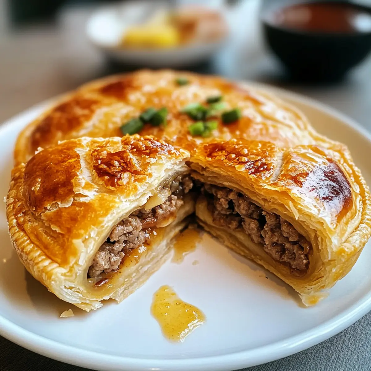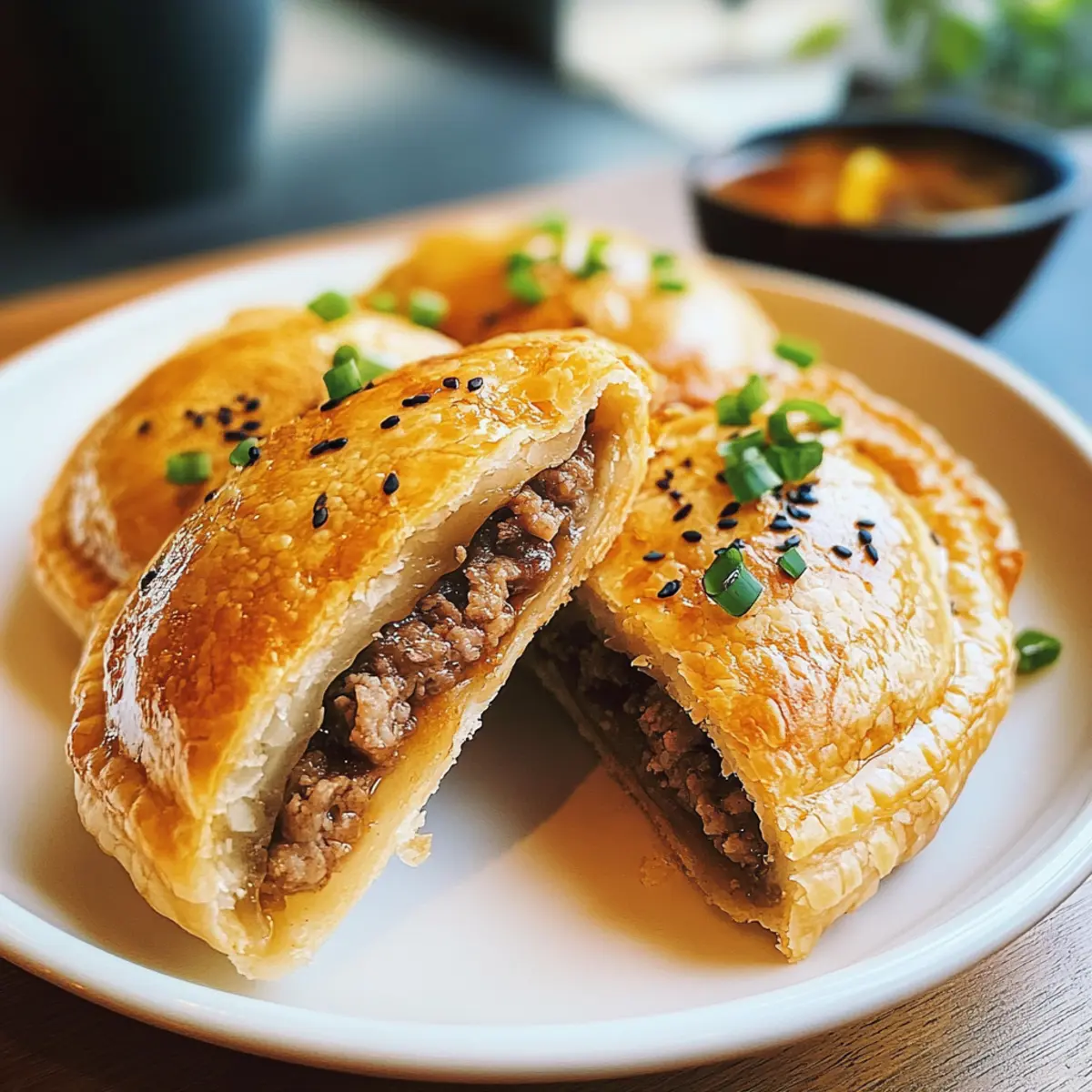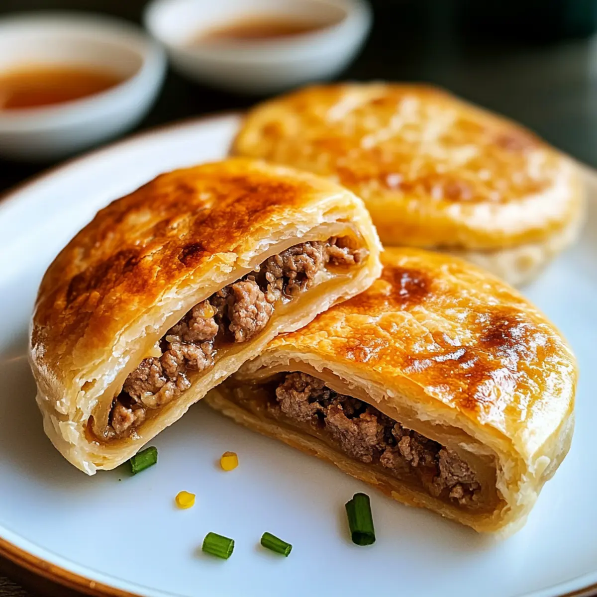 Als ich das erste Mal in die leuchtend roten Lichter der asiatischen Straßenmärkte eintauchte, konnte ich den verlockenden Duft von frisch gebratenen Knusprigen Fleisch-Rindfleisch-Pasteten kaum widerstehen. Diese kleinen, goldenen Teigtaschen sind nicht nur ein echter Gaumenschmaus, sondern auch unglaublich vielseitig – perfekt als Snack, Vorspeise oder sogar als leichtes Hauptgericht. Die Zubereitung dieser köstlichen Pasteten ist überraschend einfach, sodass sie auch für Kochanfänger bestens geeignet sind. Darüber hinaus sind sie die ideale Lösung, um die Tiefkühltruhe aufzufüllen und im hektischen Alltag immer eine leckere Option griffbereit zu haben. Bist du bereit, die Geheimnisse dieser köstlichen asiatischen Delikatesse zu entdecken und deinen nächsten Dinnerabend aufzupeppen? Warum wirst du dieses Rezept lieben? Einfache Zubereitung: Der gesamte Prozess ist unkompliziert und erfordert nur wenige grundlegende Kochfähigkeiten, was er perfekt für Anfänger macht. Vielseitig und anpassbar: Du kannst die Füllungen nach deinem Geschmack variieren, indem du z.B. gemahlenes Truthahnfleisch oder Tofu verwendest. Knuspriger Genuss: Der perfekte goldene Teig trifft auf eine saftige Füllung – jeder Biss ist ein Genuss! Zeitersparnis: Diese Pasteten sind tiefkühlfreundlich, sodass du sie im Voraus zubereiten und im Gefrierschrank aufbewahren kannst. Sie sind immer bereit, wenn der kleine Hunger kommt! Ideal für alle: Egal, ob als Snack, Vorspeise oder leichtes Hauptgericht – sie sind bei jedem Anlass ein Hit. Probiere sie aus und entdecke ihre Vielseitigkeit in Kombination mit hausgemachtem Chiliöl. Zutaten für Knusprige Fleisch-Rindfleisch-Pasteten • Hier findest du alles, was du für diese leckeren Pasteten benötigst! Für den Teig Mehl – bildet die Grundlage des Teigs; du kannst glutenfreies Mehl verwenden, wenn du eine glutenfreie Variante möchtest. Salz – intensiviert den Geschmack des Teigs; kann für eine salzarme Ernährung reduziert werden. Warmes Wasser – hydratisiert den Teig und hilft bei der Glutenentwicklung; achte darauf, dass es warm ist, um die richtige Konsistenz zu erreichen. Öl – verleiht dem Teig Reichhaltigkeit und sorgt für eine zarte Kruste; neutralen Pflanzenöl verwenden. Für die Füllung Frühlingszwiebel – sorgt für frischen Geschmack und einen Hauch von Knusprigkeit; kann durch Schnittlauch ersetzt werden. Zwiebel – fügt der Füllung Tiefe hinzu; du kannst jede Zwiebelart verwenden. Rinderhackfleisch – die Hauptproteinquelle; ersetze es durch gemahlenes Truthahnfleisch für eine magerere Option oder benutze Pilze für eine vegetarische Version. Austernsauce – sorgt für einen umami-reichen Geschmack; verwende Sojasauce für eine vegetarische Alternative. Sojasauce – bringt Salzigkeit und Tiefe in die Füllung. Schwarzer Pfeffer – sorgt für Schärfe; nach Geschmack anpassen. Ingwer (frisch, gerieben) – verleiht der Füllung eine aromatische Note; kann im Notfall durch gemahlenen Ingwer ersetzt werden. Wasser (¼ Tasse) – hilft, die Füllung saftig zu halten; wichtig für leckere Bissen beim Kochen. Für das Topping Schwarze und weiße Sesamsamen – sorgen für Crunch und dekorative Wirkung; optional, aber empfohlen für den traditionellen Geschmack. Schritt-für-Schritt-Anleitung für Knusprige Fleisch-Rindfleisch-Pasteten Schritt 1: Teig zubereiten Mehl, Salz, warmes Wasser und Öl in einer großen Schüssel vermengen. Knete die Mischung kräftig mit den Händen oder einem Teigschaber, bis ein glatter Teig entsteht. Anschließend den Teig abdecken und 30 Minuten bei Raumtemperatur ruhen lassen, damit sich das Gluten entspannen kann. Schritt 2: Füllung vorbereiten In einer separaten Schüssel das Rinderhackfleisch, die Frühlingszwiebeln, die Zwiebel, Austernsauce, Sojasauce, schwarzen Pfeffer, Ingwer und ¼ Tasse Wasser gut vermischen. Die Füllung sollte gut durchmischt und saftig sein. Für einen Geschmackstest eine kleine Menge in der Mikrowelle erhitzen und gegebenenfalls nachwürzen. Schritt 3: Teig ausrollen Nach der Ruhezeit den Teig auf eine bemehlte Arbeitsfläche geben und in acht gleich große Stücke teilen. Rolles jeden Teigball mit einem Nudelholz dünn aus, bis er einen gleichmäßigen Durchmesser von etwa 10 cm hat. Achte darauf, dass die Teigblätter gleichmäßig dick sind, um eine gleichmäßige Garzeit zu gewährleisten. Schritt 4: Pasteten füllen Lege jeweils etwa 2,5 Esslöffel der Füllung in die Mitte jedes ausgerollten Teigblattes. Klappe die Teigblätter zusammen, um die Füllung einzuschließen, und drücke die Ränder gut zu, um sie zu versiegeln. Optionale: Die Oberseite der Pasteten leicht in Wasser tauchen und in den Sesamsamen wälzen, um zusätzliche Textur und Geschmack zu erhalten. Schritt 5: Pasteten braten Erhitze in einer Antihaftpfanne etwas Öl bei mittlerer Hitze. Wenn das Öl heiß ist, lege vorsichtig die gefüllten Pasteten hinein und brate sie für etwa 4 Minuten auf jeder Seite, bis sie goldbraun und knusprig sind. Achte darauf, die Pfanne nicht zu überfüllen, damit die Pasteten gleichmäßig garen. Schritt 6: Servieren Die knusprigen Fleisch-Rindfleisch-Pasteten aus der Pfanne nehmen und auf Küchenpapier abtropfen lassen, um überschüssiges Öl zu entfernen. Serviere sie heiß mit hausgemachtem Chiliöl oder schwarzem Essig als Dipp. Genieße jeden Bissen dieser köstlichen Delikatesse! Lagerungstipps für Knusprige Fleisch-Rindfleisch-Pasteten Zimmertemperatur: Halte die Pasteten bei Raumtemperatur nicht länger als 1-2 Stunden, um ihre Frische zu sichern und Bakterienbildung zu vermeiden. Kühlschrank: Bewahre die übrig gebliebenen Knusprigen Fleisch-Rindfleisch-Pasteten in einem luftdichten Behälter bis zu 3 Tage im Kühlschrank auf. Vor dem Verzehr gründlich erhitzen. Gefriertruhe: Die Pasteten können bis zu 2 Monate in einem luftdichten Behälter eingefroren werden. Friere sie ungekocht ein, um die beste Textur zu erhalten. Wiedererhitzen: F