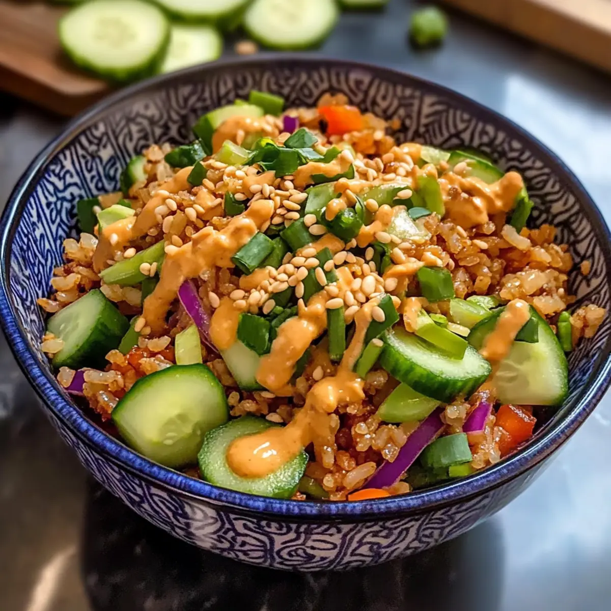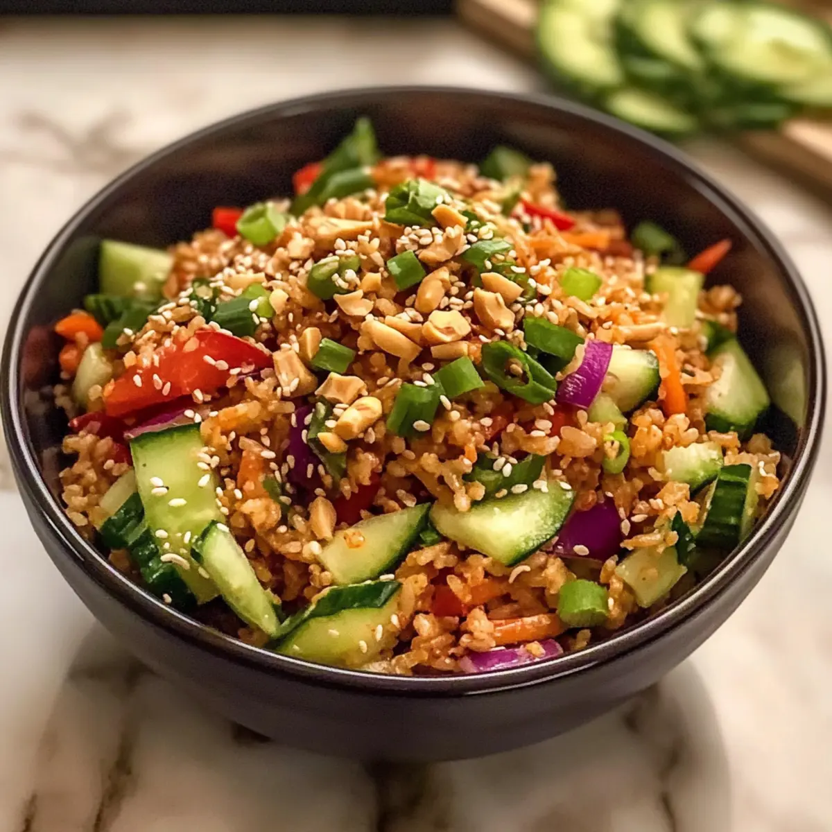 In einer kleinen Küche, erfüllt von köstlichen Düften, hörte ich das leise Knistern des Reises, der im Ofen geröstet wurde. Der Knusprige Reissalat mit Erdnuss-Sesam-Dressing ist nicht nur ein Fest für die Sinne, sondern auch eine zeitsparende Lösung für geschäftige Tage. Die goldenen Reiskrümel harmonieren perfekt mit knackigem Gemüse und einer nussigen Sauce, die all das zusammenbringt. Dieses Rezept ist ideal für alle, die auf der Suche nach einer schnellen Mahlzeit sind und gleichzeitig die frischen Aromen Asiens genießen möchten. Am besten ist, dass sich der Salat wunderbar vorbereiten lässt und mit jeder Minute, die er steht, an Geschmack gewinnt. Neugierig, welche Variationen Sie ausprobieren können? Warum werden Sie dieses Rezept lieben? Einfachheit pur: Die Zubereitung ist unkompliziert und erfordert keine ausgeklügelten Kochkünste – perfekt für alle, die schnell etwas Leckeres zaubern möchten. Vielfalt der Aromen: Die Kombination aus nussigem Erdnuss- und würzigem Sesamdressing sorgt für einen geschmacklichen Höhepunkt, den jeder lieben wird. Gesund und frisch: Mit knackigem Gemüse und gesunden Zutaten ist dieser Salat eine gute Wahl für ein leichtes Mittagessen oder ein frisches Abendessen. Perfekt zum Vorkochen: Bereiten Sie den Salat vor und genießen Sie ihn am nächsten Tag. Er wird durch das Sitzen nur besser! Egal ob für ein Picknick oder als Meal Prep – Sie können nichts falsches machen. Kreative Abwandlungen: Probieren Sie je nach Saison verschiedene Gemüsesorten aus oder ersetzen Sie Erdnussbutter durch Tahini für eine nussfreie Variante! Knuspriger Reissalat Zutaten • Für den Salat Jasminreis – sorgt für die ideale Textur beim Rösten; am besten verwendet man Tag alten Reis für optimale Knusprigkeit. Sesamöl – verleiht dem Reis und dem Dressing einen reichhaltigen, nussigen Geschmack; darauf achten, dass es heiß ist, bevor man den Reis hinzufügt. Sojasauce/Tamari – für Würze und Umami; verwenden Sie Tamari für eine glutenfreie Alternative. Chili Crunch – sorgt für Schärfe und Knusprigkeit; die Menge je nach Vorliebe anpassen. Erdnussbutter/Tahini – die Basis des Dressings, die Cremigkeit liefert; Tahini kann als nussfreie Option verwendet werden. Reisessig & Limettensaft – sorgen für die nötige Säure; frisch verwenden, um den Geschmack zu intensivieren. Honig – bringt Süße ins Dressing; kann für vegane Optionen durch Ahornsirup ersetzt werden. Gemüse (Kohl, Gurke, Paprika, Karotte, Zuckerschoten, Frühlingszwiebeln) – fügt Frische und Knusprigkeit hinzu; saisonales Gemüse sorgt für den besten Geschmack. Geröstete Sesamsamen – eine Garnierung, die sowohl den Geschmack als auch die Präsentation verfeinert. • Für das Dressing Reisessig – bietet zusätzliche Säure und hebt die Aromen hervor; verwenden Sie frischen für den besten Effekt. Ingwer – bringt eine besondere Note ins Dressing; frisch gerieben ist am besten. Dieser Knusprige Reissalat mit Erdnuss-Sesam-Dressing lässt sich hervorragend variieren und bereitet Freude beim Zubereiten! Schritt-für-Schritt-Anleitung für Knuspriger Reissalat mit Erdnuss-Sesam-Dressing Step 1: Reis vorbereiten Heizen Sie den Ofen oder die Heißluftfritteuse auf 200 °C vor. Vermengen Sie den Tag alten Jasminreis in einer Schüssel mit einem Esslöffel Sesamöl, Sojasauce und Chili Crunch. Verteilen Sie die Mischung gleichmäßig auf ein mit Backpapier ausgelegtes Blech, um eine knusprige Textur zu erzielen. Step 2: Reis knusprig backen Backen Sie den Reis in der Heißluftfritteuse für 16-18 Minuten oder im Ofen für etwa 40 Minuten, bis er goldbraun und schön knusprig ist. Überwachen Sie den Reis während des Backens, um sicherzustellen, dass er nicht anbrennt – das perfekte Zeichen ist eine goldene Farbe und ein köstlicher Duft. Step 3: Dressing zubereiten In einer Schüssel das Sesamöl, Erdnussbutter, Sojasauce, Reisessig, Limettensaft, Honig, Chili Crunch und frisch geriebenen Ingwer gut miteinander verquirlen, bis eine cremige und glatte Konsistenz entsteht. Schmecken Sie das Dressing ab und passen Sie die Gewürze nach Ihren Vorlieben an, um den perfekten Geschmack für Ihren Knusprigen Reissalat mit Erdnuss-Sesam-Dressing zu erreichen. Step 4: Salat kombinieren In einer großen Schüssel alle vorbereiteten und gehackten Gemüsesorten wie Kohl, Gurke, Paprika, Karotte, Zuckerschoten und Frühlingszwiebeln mit dem knusprigen Reis vermischen. Geben Sie das zubereitete Dressing darüber und werfen Sie alles vorsichtig, damit das Gemüse knackig bleibt und das Dressing gleichmäßig verteilt ist. Step 5: Servieren Vor dem Servieren den Knusprigen Reissalat mit Erdnuss-Sesam-Dressing großzügig mit gerösteten Sesamsamen bestreuen. Diese Garnierung verleiht dem Salat nicht nur zusätzlichen Geschmack, sondern sorgt auch für eine ansprechende Präsentation. Genießen Sie den Salat frisch zubereitet für das beste Geschmackserlebnis! Was passt gut zu Knusprigem Reissalat mit Erdnuss-Sesam-Dressing? Genießen Sie ein schmackhaftes Erlebnis, indem Sie diese köstlichen Begleiter zu Ihrem knusprigen Reissalat hinzufügen. Gegrilltes Hähnchen: Zarte, würzige Hähnchenbrust ergänzt die Frische des Reissalats und bietet eine proteinreiche, sättigende Komponente. Gebackener Tofu: Knusprig gebratener Tofu ist eine hervorragende vegane Proteinquelle. Er sorgt für eine zusätzliche Textur und harmoniert perfekt mit der Erdnusssauce. Frischer Gurkensalat: Eine leichte, erfrischende Beilage, die mit Zitrone und Minze gewürzt ist, bringt Kühle in Kombination mit dem nussigen Dressing des Reissalats. Geröstete Süßkartoffeln: Die natürliche Süße und die weiche Textur der gerösteten Süßkartoffeln stehen im Kontrast zu dem knusprigen Reis und sorgen für ein sattes Aroma. Chili Knoblauch Brot: Eine knusprige, aromatische Ergänzung, die mit ihren würzigen Noten sowohl den Salat als auch alle asiatischen Aromen perfekt ergänzt. Kokosnuss-Banan