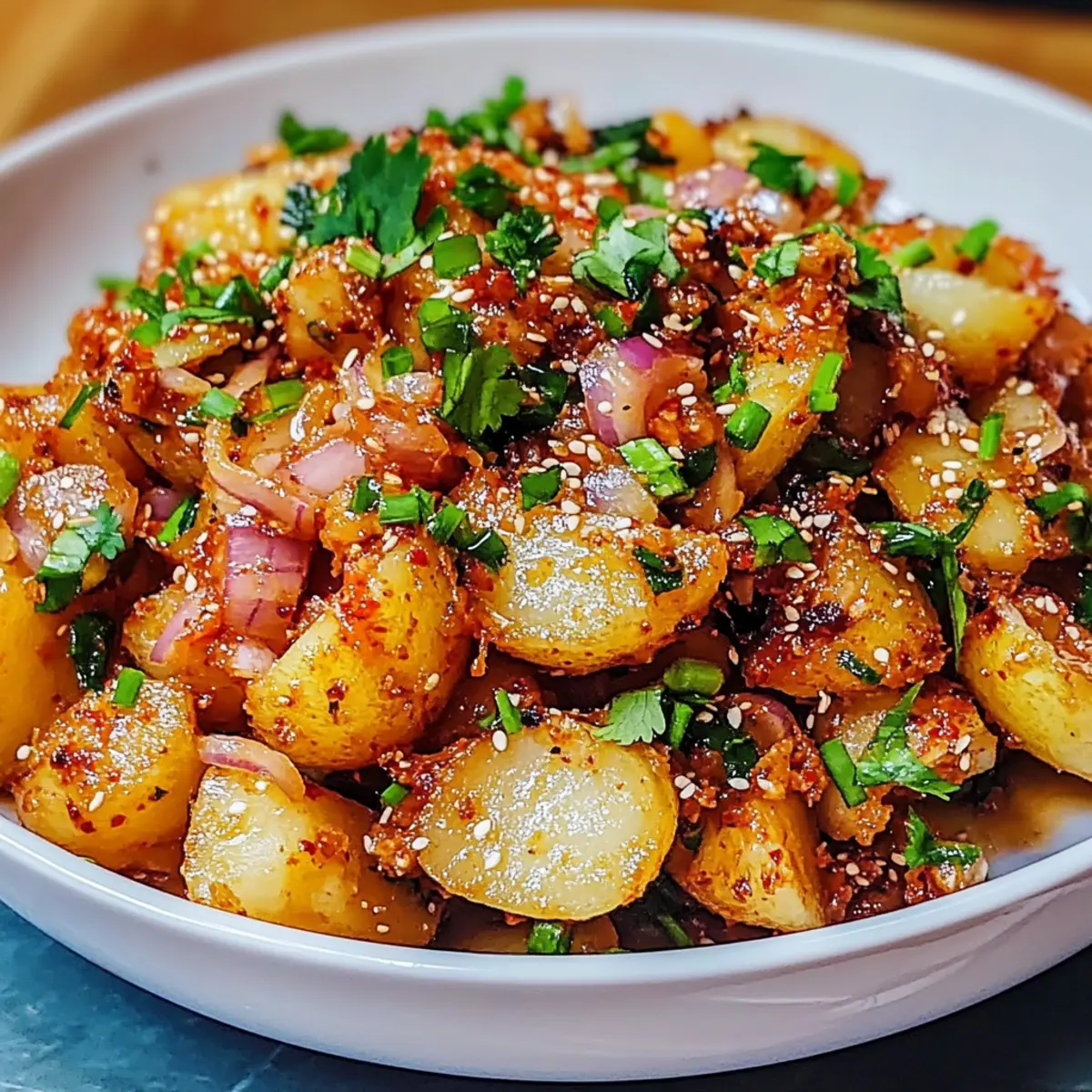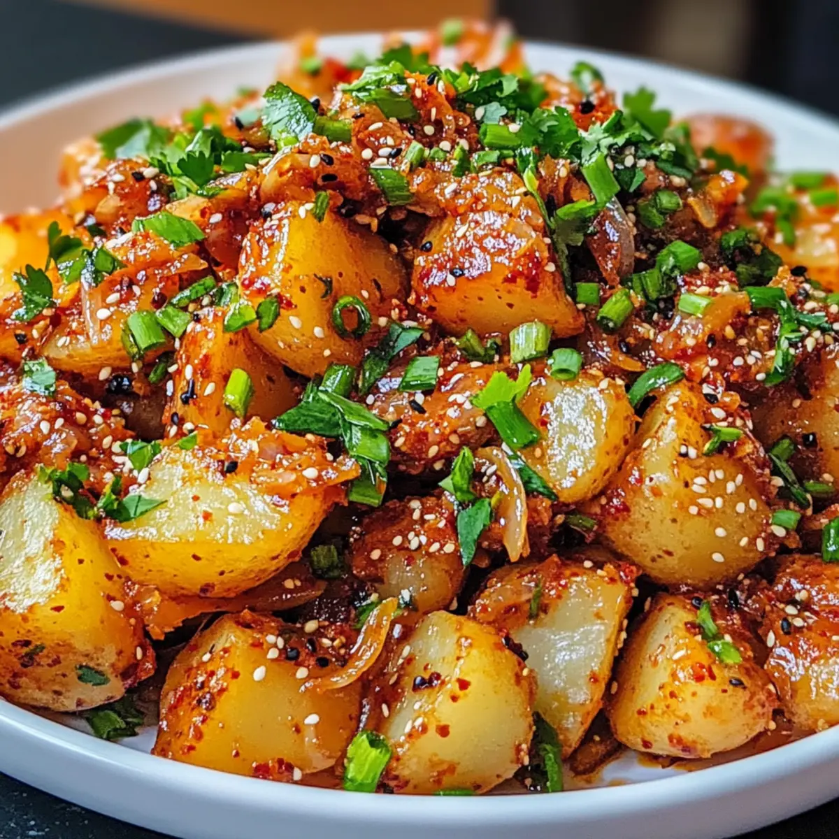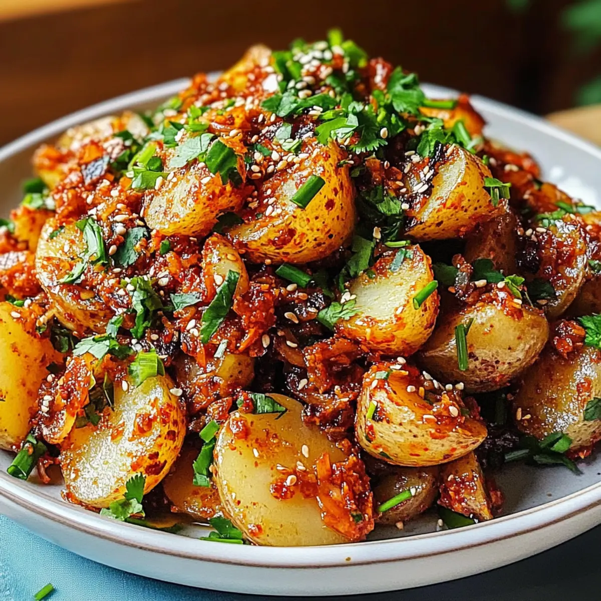 Auf einer meiner letzten Reisen nach Seoul entdeckte ich ein ganz besonderes Gericht, das meine Geschmacksknospen in den Bann zog: knusprige koreanische Kartoffeln! Diese goldenen, leicht zerdrückten Kartoffeln sind nicht nur ein echter Hingucker, sondern sie warten auch mit einem unwiderstehlichen Crunch auf – perfekt für alle, die der Einheitskost entfliehen und sich nach etwas Heimeligem sehnen. Mit einem würzigen Gochujang-Dressing, erfrischenden Schalotten und frischen Kräutern, kann ich euch garantieren, dass dieser Genuss sowohl Veganer als auch Fleischliebhaber begeistert. Schnell zubereitet und als Beilage oder Hauptgericht geeignet, wird dieses knusprige koreanische Kartoffelgericht zum Highlight jeder Mahlzeit. Seid ihr bereit, euer nächstes Lieblingsgericht zu entdecken? Warum sind koreanische Kartoffeln einzigartig? Knuspriger Genuss: Diese knusprigen koreanischen Kartoffeln bieten mit ihrem goldenen, knusprigen Äußeren und dem fluffigen Inneren ein Texturerlebnis, das einfach überzeugt. Würziger Kick: Das Gochujang-Dressing verleiht dem Gericht eine schöne, würzige Note, die für den extra „Wow“-Faktor sorgt. Es ist eine perfekte Balance zwischen süß, scharf und sauer – ein Genuss für die Geschmacksknospen! Vielseitigkeit: Egal, ob als Beilage zu Korean BBQ oder als Hauptgericht, dieses Rezept passt problemlos zu vielen Gerichten. Serviert sie mit Knuspriges Honig Feta oder gegrilltem Tempeh für ein vollständiges Menü! Einfache Zubereitung: Mit nur wenigen Zutaten und simplen Schritten ist diese Speise schnell zubereitet – ideal für hektische Tage, an denen ihr dennoch etwas Besonderes genießen möchtet. Anpassbar: Dank der Variationsmöglichkeiten könnt ihr den Schärfegrad ganz nach eurem Geschmack anpassen. Perfekt für alle, die gerne kreativ in der Küche sind! Knuspriges koreanisches Kartoffelgericht Zutaten • Hinweis: Hier sind die Zutaten, die ihr benötigt, um dieses köstliche knusprige koreanische Kartoffelgericht zuzubereiten. Für die Kartoffeln: Kleine wachsige Kartoffeln – sorgen für die perfekte Textur; Ideal sind Fingerlings oder andere wachsige Sorten. Feines Salz – hebt den Geschmack während des Kochens hervor. Geschmolzene pflanzliche Butter oder Pflanzenöl – verleiht den Kartoffeln zusätzlichen Geschmack und Reichtum. Knoblauchpulver – bringt eine angenehme, herzhafte Note hinein. Koreanisches Chili-Pulver (Gochugaru) – sorgt für die gewünschte Schärfe; passt die Menge je nach Vorliebe an. Für den Dressing: Veganer Mayo – sorgt für Cremigkeit; kann durch herkömmliche Mayo oder Kewpie ersetzt werden, um mehr Würze zu erhalten. Koreanische Chili-Paste (Gochujang) – bringt eine einzigartige süß-scharfe Note ins Spiel; passt die Menge nach gewünschter Schärfe an. Pflanzliche Fischsauce-Ersatz – fügt umami Geschmack hinzu; kann weggelassen werden, wenn nicht vorhanden. Frische Schalotten – geben einen milden Zwiebelgeschmack; sie können auch eingelegt werden, um einen spritzigen Geschmack zu erzielen. Limettensaft – sorgt für die nötige Säure und Helligkeit, um die Aromen auszubalancieren. Für das Garnieren: Frische Korianderblätter – bringen frische, kräuterige Noten ins Gericht. Frische Schnittlauch – fügt einen milden Zwiebelgeschmack hinzu; kann auch durch Frühlingszwiebeln ersetzt werden. Geröstete schwarze Sesamsamen – optionale Garnitur für zusätzlichen Crunch und Nussigkeit. Schritt-für-Schritt-Anleitungen für Knuspriges koreanisches Kartoffelgericht Step 1: Kartoffeln kochen Die kleinen wachsigen Kartoffeln gründlich abspülen und in einem großen Topf mit ausreichend Wasser und einer Prise feinem Salz zum Kochen bringen. Die Kartoffeln sollen ca. 10 Minuten kochen, bis sie mit einer Gabel leicht durchstochen werden können. Anschließend die Kartoffeln abgießen und in eine große Schüssel geben. Step 2: Kartoffeln würzen Während die Kartoffeln noch warm sind, geschmolzene pflanzliche Butter oder Pflanzenöl, Knoblauchpulver, Koreanisches Chili-Pulver (Gochugaru) und eine weitere Prise Salz hinzufügen. Alles gut vermengen, sodass die Kartoffeln gleichmäßig mit den Gewürzen überzogen sind, und dann beiseite stellen. Step 3: Kartoffeln zerdrücken Ein Backblech mit Backpapier auslegen und die gewürzten Kartoffeln gleichmäßig darauf verteilen. Mit einem Glas oder einer anderen flachen Oberfläche sanft auf die Kartoffeln drücken, bis sie leicht zerdrückt sind. Dadurch entstehen die perfekte Textur für das knusprige koreanische Kartoffelgericht. Step 4: Kartoffeln rösten Den Ofen auf 200°C (Umluft) vorheizen. Die zerdrückten Kartoffeln im vorgeheizten Ofen für etwa 20 Minuten rösten, bis sie goldbraun und knusprig sind. Achte darauf, dass die Ränder schön gebräunt sind und den unwiderstehlichen Crunch erreicht haben. Step 5: Schalotten vorbereiten Während die Kartoffeln in den Ofen rösten, die frischen Schalotten fein hacken und in eine kleine Schüssel geben. Mit Limettensaft übergießen und für etwa 5 Minuten stehen lassen, damit sie leicht eingelegt werden und ihr aromatisches Aroma entfalten. Step 6: Dressing anrühren In einer separaten Schüssel die vegane Mayo, die koreanische Chili-Paste (Gochujang), die pflanzliche Fischsauce und die eingelegten Schalotten zusammenrühren. Mit einem Schneebesen gut umrühren, bis eine cremige und glatte Konsistenz erreicht wird. Step 7: Servieren Die knusprigen Kartoffeln leicht abkühlen lassen und dann die Hälfte des Dressings über die Kartoffeln träufeln. Mit frischem Schnittlauch und gerösteten schwarzen Sesamsamen garnieren. Das restliche Dressing separat dazu servieren, damit jeder nach Belieben nachnehmen kann. Lagerungstipps für knuspriges koreanisches Kartoffelgericht Kühlschrank: Bewahre die übrig gebliebenen knusprigen koreanischen Kartoffeln in einem luftdichten Behälter im Kühlschrank auf und genieße sie innerhalb von 3 Tagen. Gefriertruhe: Diese Kartoffeln können nicht gut