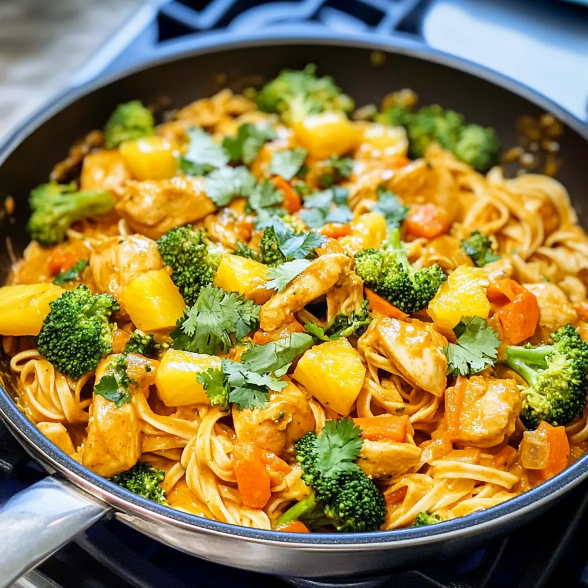 Während ich in meiner Küche stand und frische Zutaten vorbereitete, überkam mich der verlockende Duft von Gewürzen und Kokosnuss. Das Gericht, das ich zubereiten wollte, war das Kokosnuss-Curry-Hühnchen und Reisnudeln – ein cremiger Genuss, der mich sofort in die tropischen Gefilde Thailands entführte. In nur 30 Minuten zauberst du dieses schnelle, aber unglaublich befriedigende Essen auf den Tisch. Die Kombination aus zartem Hühnchen, knackigem Gemüse und einer aromatischen Kokosnuss-Curry-Sauce macht nicht nur satt, sondern bringt auch die ganze Familie zusammen. Und das Beste? Du kannst das Rezept ganz nach deinem Geschmack anpassen – von der Gemüseauswahl bis zur Schärfe. Bereit, deinen Kochlöffel zu schwingen und die Geschmacksknospen zu erfreuen? Lass uns gemeinsam in die Welt von Kokosnuss und Curry eintauchen! Warum wirst du dieses Rezept lieben? Simplicity: Die Zubereitung ist so einfach, dass du es ganz entspannt nachkochen kannst – ideal für Kochneulinge und Profis. Vielseitigkeit: Mit der Möglichkeit, verschiedene Gemüsesorten und Proteine zu verwenden, bleibt dieses Rezept niemals langweilig. Aromatische Gewürze: Die Kombination aus Kokosmilch und rotem Currypaste sorgt für einen intensiven, wohltuenden Geschmack, der sofort ins Herz geht. Schnell zubereitet: In nur 30 Minuten steht das komplette Gericht auf dem Tisch – perfekt für ein stressfreies Abendessen nach einem langen Tag. Familienfreundlich: Dieses Gericht ist nicht nur lecker, sondern auch ein Hit bei Groß und Klein. Du kannst die Schärfe leicht anpassen, sodass jeder mitessen kann. Gesund und nahrhaft: Mit einer ausgewogenen Mischung aus Proteinen, gesunden Fetten und frischem Gemüse macht das Kokosnuss-Curry-Hühnchen eine gute Figur in deiner Ernährung. Lass dich von dieser köstlichen Mahlzeit inspirieren und entdecke auch unsere weiteren inspirierenden Rezepte! Kokosnuss-Curry-Hühnchen und Reisnudeln Zutaten • Ein köstlicher Start für dein asiatisches Abendessen! Für das Hühnchen Hähnchenschenkel ohne Knochen und Haut – die zarte Wahl für saftigen Geschmack; kann auch durch Hähnchenbrust oder Tofu ersetzt werden. Öl (Kanola oder Pflanzenöl) – nötig zum Anbraten; Olivenöl kann ebenfalls verwendet werden, könnte aber den Geschmack verändern. Für die Sauce Kokosmilch – die Basis des Currys, die Cremigkeit verleiht; für einen reichhaltigen Geschmack Vollfette verwenden. Rote Currypaste – Hauptgeschmacksgeber; passe die Menge je nach gewünschtem Schärfegrad an, oder verwende grüne Currypaste für einen anderen Geschmack. Knoblauchzehen (gerieben) – fügt ein aromatisches Element hinzu; frischer Ingwer kann ebenfalls für einen intensiveren Geschmack hinzugefügt werden. Sojasauce – für Umami und salzige Tiefe; benutze Tamari für eine glutenfreie Option. Sriracha (optional) – fördert die Schärfe; je nach Vorliebe anpassbar oder ganz weglassbar. Für die Nudeln und Gemüse Reisnudeln (8-12 Unzen) – das Hauptkohlenhydrat, das für Struktur sorgt; zuvor 45-60 Minuten in heißem Wasser einweichen. Brokkoli-Röschen (2-3 Tassen) – bringt Farbe und Nährstoffe; kann durch Paprika oder Zuckerschoten ersetzt werden. Geriebene Karotten (1 Tasse) – sorgen für Süße und Crunch; optional, können auch weggelassen oder durch Zucchini ersetzt werden. Ananaswürfel (1 Tasse, optional) – fügt eine süß-saftige Note hinzu; Mango kann ebenfalls eine fruchtige Alternative sein. Korianderblätter (zum Garnieren) – frisches Kraut für einen hellen Abschluss des Gerichts; kann auch durch Petersilie ersetzt werden. Entdecke die Vielfalt der Geschmäcker und genieße dein eigenes Kokosnuss-Curry-Hühnchen und Reisnudeln, das du ganz nach deinem Geschmack anpassen kannst! Schritt-für-Schritt-Anleitung für Kokosnuss-Curry-Hühnchen und Reisnudeln Step 1: Nudeln vorbereiten Spüle die Reisnudeln unter kaltem Wasser ab und lege sie in eine Schüssel mit heißem Wasser. Lass die Nudeln 45-60 Minuten einweichen, bis sie zart, aber noch bissfest sind. Alternativ kannst du sie für 3-4 Minuten kochen. Die richtige Zubereitung der Nudeln ist entscheidend für das perfekte Kokosnuss-Curry-Hühnchen und Reisnudeln. Step 2: Hühnchen garen Erhitze 1 Esslöffel Öl in einem Wok oder einer großen Pfanne bei mittelhoher Hitze. Füge die gewürfelten Hähnchenschenkel hinzu, würze sie mit Salz und Pfeffer und brate sie 5-7 Minuten, bis sie durchgegart und goldbraun sind. Achte darauf, dass das Hühnchen gleichmäßig gegart ist, um den besten Geschmack zu erzielen. Step 3: Gemüse hinzufügen Gib den Brokkoli, die Ananas, die Karotten, die Sojasauce und einen weiteren Schuss Öl in die Pfanne. Lasse alles etwa 5 Minuten köcheln, bis das Gemüse zart, aber noch knackig ist. Die Hinzufügung von frischen Zutaten ist essentiell für das Aroma des Kokosnuss-Curry-Hühnchen und Reisnudeln. Step 4: Kokosnuss-Curry-Sauce zubereiten Gib in die gleiche Pfanne die Kokosmilch, die rote Currypaste, den geriebenen Knoblauch und die Sriracha. Rühre alles gut um und lasse die Sauce 5-7 Minuten lang köcheln, bis sie leicht eindickt. Die Aromen werden intensiv und erfüllen die Küche mit einem köstlichen Duft. Step 5: Nudeln und Sauce kombinieren Füge die eingeweichten Reisnudeln zur Pfanne hinzu und mische sie gut mit der Sauce. Lass alles einige Minuten köcheln, bis die Nudeln die Aromen aufgenommen haben. Gib das Hühnchen und das Gemüse zurück in die Pfanne und wirf alles zusammen, bis alles gleichmäßig mit der Sauce bedeckt ist. Step 6: Servieren Verteile die Kokosnuss-Curry-Hühnchen und Reisnudeln auf Teller und garniere sie mit frischen Korianderblättern. Das Gericht ist jetzt bereit, serviert zu werden. Genieß die harmonische Kombination der Geschmäcker mit Familie und Freunden. Expertentipps für Kokosnuss-Curry-Hühnchen und Reisnudeln Gewürze anpassen: Beginne mit einer kleinen Menge roter Currypaste und steigere nach Geschmack die Schärfe. So bleibt das Geri