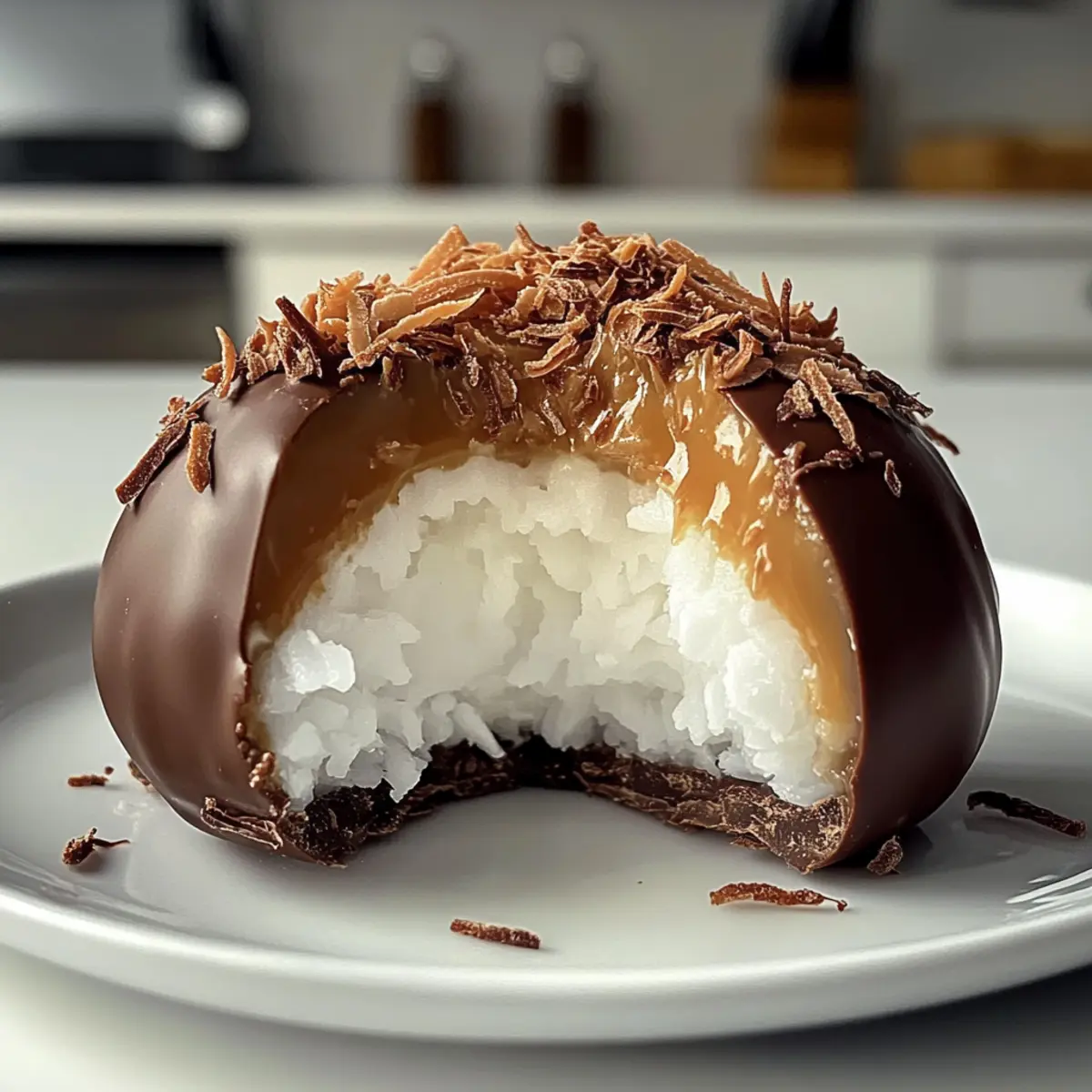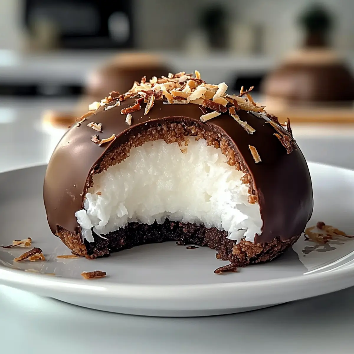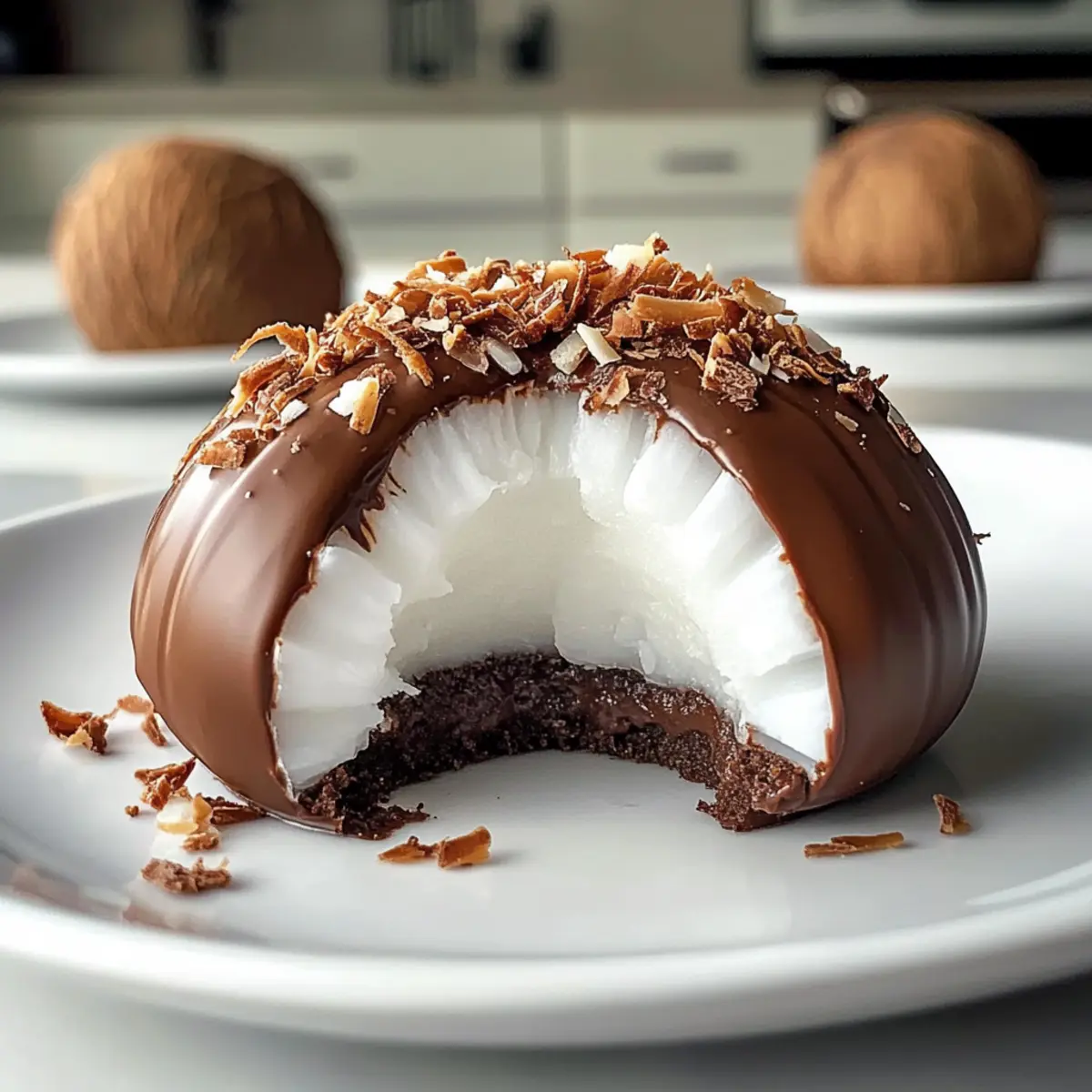 Kokosnusskuppel mit Schokolade vereint zarte Kokosfüllung und samtige Schokoladenganache in einem unwiderstehlichen Dessert.