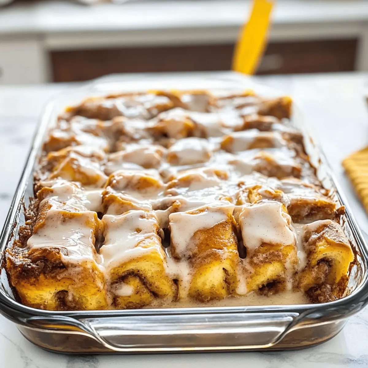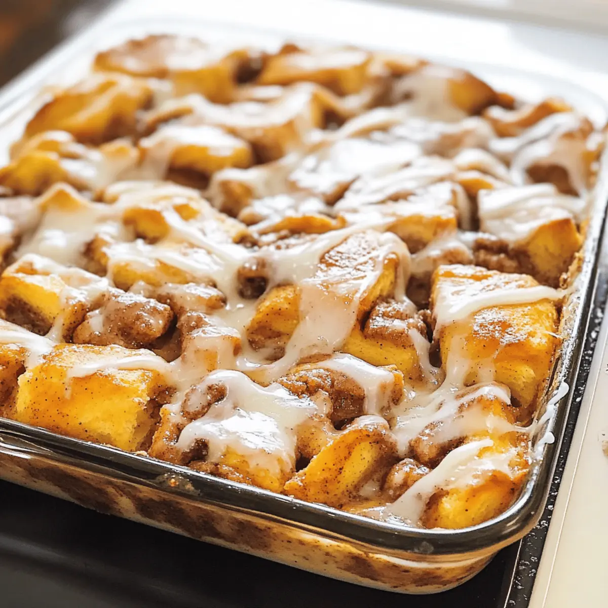 Gießen Sie die vorbereitete Füllung gleichmäßig über die verstreuten Zimtschnecken-Stücke in der Auflaufform. Drizzeln Sie die Glasur, die im Teig enthalten ist, gleichmäßig über die Mischung. Stellen Sie die Auflaufform auf ein Backblech, um eventuelles Überlaufen aufzufangen, und backen Sie den Auflauf für etwa 40 Minuten, bis er goldbraun und in der Mitte fest ist.