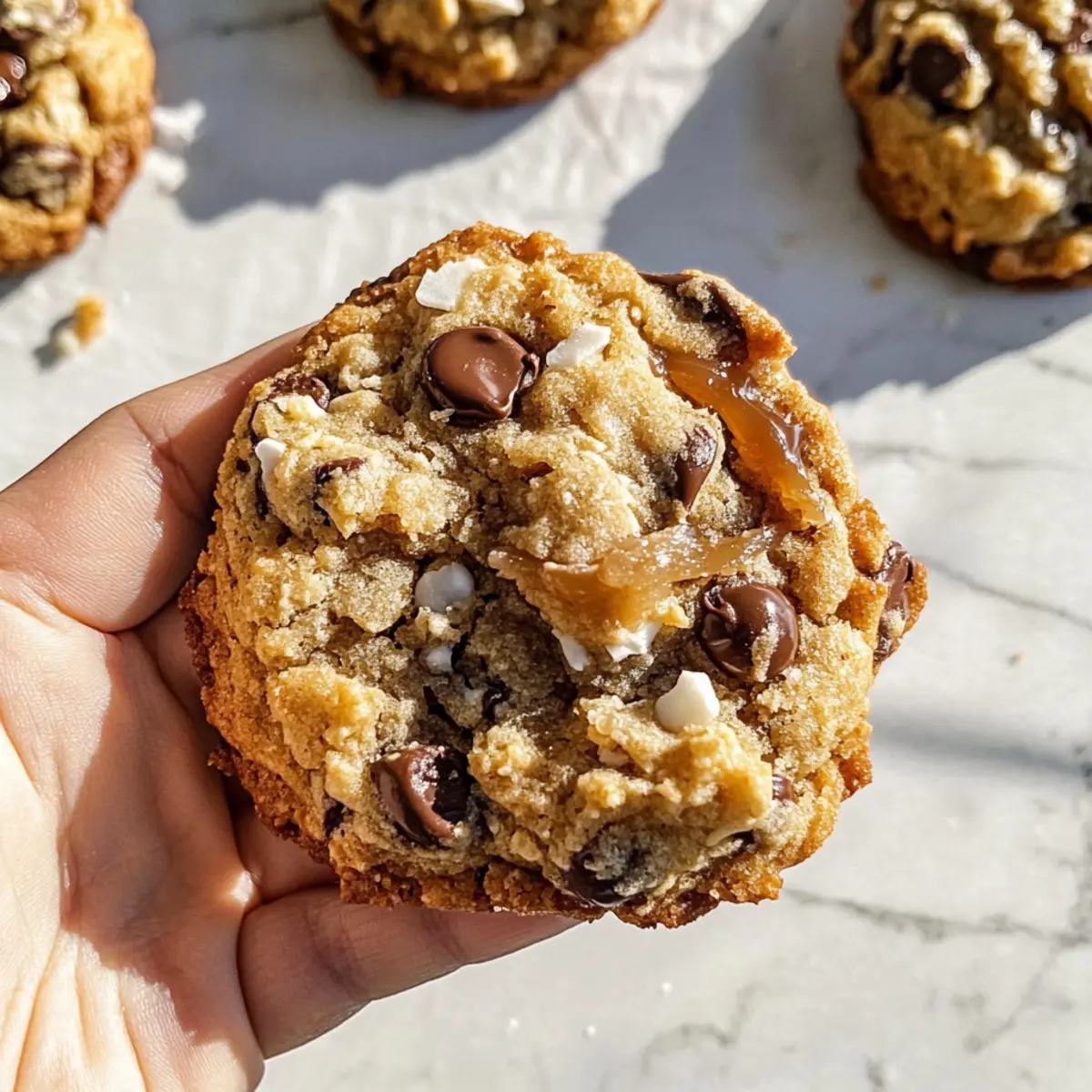 Diese Levain Kokosnuss Karamelkekse sind außen goldbraun und innen weich, perfekt für alle, die köstliche Kekse lieben.
