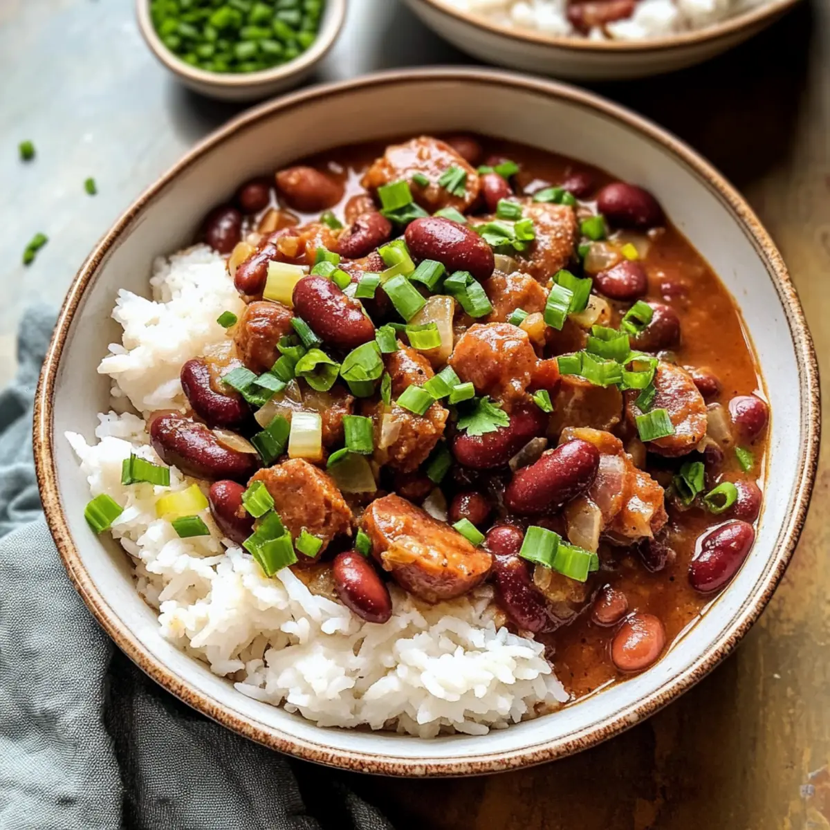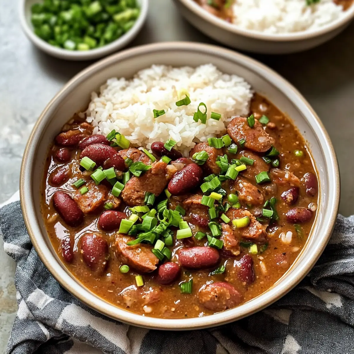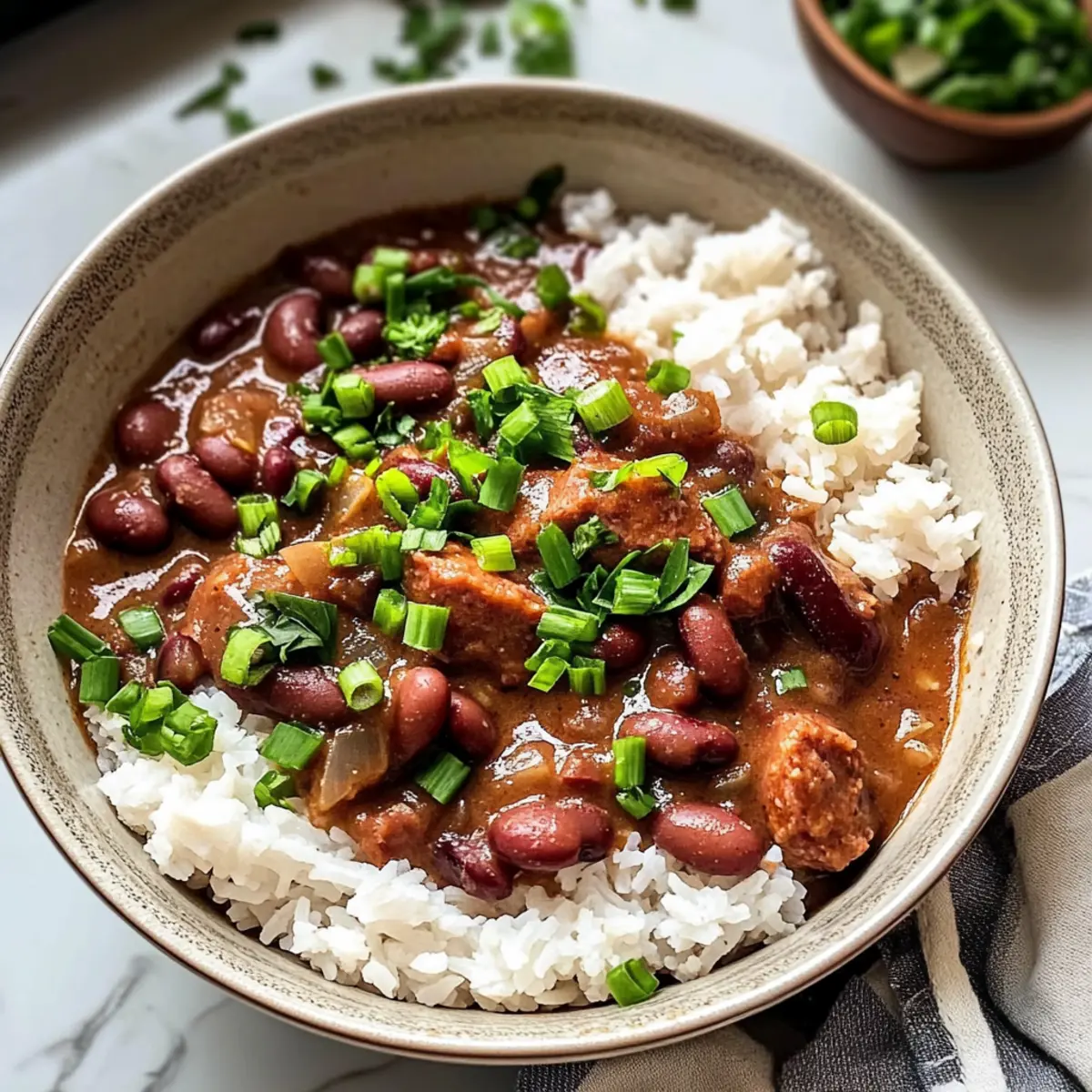 In der warmen, einladenden Küche New Orleans‘ vermische ich gerade die Aromen, die mir ein Gefühl von Zuhause geben. Der köstliche Duft von Louisiana Rote Bohnen und Reis steigt auf, während ich die zarten Bohnen, frisches Gemüse und würzige Andouille-Wurst zum Kochen bringe. Dieses herzhafte Gericht ist nicht nur ein Lieblingsgericht, sondern auch ein echtes Komfortessen, das sich leicht zubereiten lässt und perfekt für ein gemütliches Abendessen während der Woche ist. Die Bohnen sorgen für eine nahrhafte Basis, während die Wurst dem Ganzen eine rauchige Note verleiht. Und hier ist der Clou: Man kann alles im Voraus zubereiten und sogar Reste einfrieren, was es zu einer idealen Wahl für stressige Tage macht. Bist du bereit, dich in die Welt der südstaatlichen Küche zu stürzen? Warum wirst du dieses Rezept lieben? Gemütlichkeit und Tradition: Louisiana Rote Bohnen und Reis ist ein Klassiker, der den Komfort des Südens auf deinen Tisch bringt. Einfachheit pur: Die Zubereitung ist unkompliziert und benötigt nur grundlegende Kochfähigkeiten. Herzhafter Geschmack: Mit der Kombination aus Fleisch und Gewürzen erzielst du ein unverwechselbares Aroma. Vielseitigkeit: Diese Rezeptur lässt sich leicht anpassen, falls du auf Fleisch verzichten oder andere Bohnen verwenden möchtest. Zeitersparnis: Perfekt für Meal Prep, da du die Bohnen im Voraus zubereiten und die Reste bequem einfrieren kannst. Und nicht zu vergessen, es ist ein absoluter Publikumsliebling – egal, ob du eine kleine Feier oder ein Familienessen veranstaltest! Zutaten für Louisiana Rote Bohnen und Reis • Für dieses herzhafte Gericht benötigst du einige Grundzutaten, die jeder in seiner Küche haben sollte! Rote Bohnen – Diese sind entscheidend für die Proteinquelle und geben dem Gericht seine charakteristische Textur; optimal ist es, sie über Nacht einzuweichen. Andouille-Wurst – Sie verleiht dem Gericht eine rauchige Tiefe; kann durch andere geräucherte Würste ersetzt oder ganz weggelassen werden. Geräuchertes Fleisch (z.B. Schinkenhaxe) – Fügt einen köstlichen Reichtum hinzu; verwende Reste vom Sonntagabend. Kann auch durch Speck ersetzt oder weggelassen werden. Zwiebel, Paprika, Sellerie (die „Heilige Dreifaltigkeit“) – Diese bilden die geschmackliche Basis; frisches Gemüse ist hier das A und O. Knoblauch – Intensiviert das Aroma; frischer Knoblauch ist ideal, aber Pulver tut es auch in der Not. Lorbeerblätter – Sorgen für einen wunderbaren Duft; vor dem Servieren entfernen. Creole- oder Cajun-Gewürz – Der Schlüssel zu authentischem Geschmack; sowohl selbstgemacht als auch gekauft ist in Ordnung. Hühnerbrühe/-fond – Fügt Feuchtigkeit und Geschmack hinzu; Gemüsebrühe kann für eine vegetarische Variante verwendet werden. Butter und Olivenöl – Zum Anbraten; Butter bringt zusätzlich Geschmack, kann aber durch Öl ersetzt werden. Langkornreis – Ideal zum Servieren mit dem Eintopf; brauner Reis ist ebenfalls möglich, benötigt jedoch eine Anpassung der Kochzeit. Lass uns zusammen diesen Klassiker zubereiten und das Gefühl von Louisiana in deine Küche bringen! Step-by-Step Instructions für Louisiana Rote Bohnen und Reis Step 1: Bohnen vorbereiten Sortiere die roten Bohnen gründlich und weiche sie über Nacht in kaltem Wasser ein. Dies hilft nicht nur bei der Verdauung, sondern sorgt auch dafür, dass die Bohnen gleichmäßig garen. Achte darauf, dass genügend Wasser vorhanden ist, da die Bohnen aufquellen. Step 2: Wurst anbraten Erhitze in einem großen Topf bei mittlerer Hitze etwas Olivenöl und brate die Andouille-Wurst darin an, bis sie schön gebräunt und knusprig ist, etwa 5-7 Minuten. Nimm die Wurst anschließend aus dem Topf und stelle sie beiseite, um überschüssiges Fett zu entfernen und den vollen Geschmack zu bewahren. Step 3: Gemüse anbraten Im verbliebenen Fett im Topf gibst du die Zwiebel, Paprika und Sellerie hinzu, die du etwa 5 Minuten lang anbrätst, bis sie weich sind und ihre Aromen freisetzen. Füge dann den Knoblauch hinzu und brate ihn für weitere 1-2 Minuten, bis er duftet. Diese Mischung bildet die aromatische Basis für die Louisiana Rote Bohnen und Reis. Step 4: Zutaten kombinieren Jetzt füge die eingeweichten Bohnen, das geräucherte Fleisch, die gebratene Wurst, Lorbeerblätter, Hühnerbrühe und Worcestershire-Sauce in den Topf. Rühre alles gut um, damit die Aromen sich verbinden, und bringe die Mischung zum Kochen. Dies sollte gut 10 Minuten dauern. Step 5: Köcheln lassen Reduziere die Hitze, decke den Topf ab und lasse die Mischung für 1,5 bis 2 Stunden köcheln, bis die Bohnen zart sind. Rühre die Mischung gelegentlich um, um ein Anbrennen zu verhindern. Die Konsistenz sollte cremig und einladend sein, während sich die Aromen intensivieren. Step 6: Fleisch zerkleinern Nimm das geräucherte Fleisch nach dem Kochen aus dem Topf, zerkleinere es und gib es zurück in den Topf. Um eine cremige Textur zu erreichen, kannst du auch einige Bohnen mit einem Kartoffelstampfer leicht zerdrücken. Dies sorgt für eine angenehme Dicke des Eintopfs. Step 7: Würzen und Servieren Würze das Gericht mit Creole-Gewürz und frisch gemahlenem Pfeffer nach Geschmack. Lasse es weitere 15-20 Minuten unbedeckt köcheln, um die Aromen zu intensivieren. Serviere die Louisiana Rote Bohnen und Reis heiß über dampfendem Langkornreis, garniert mit frischen Frühlingszwiebeln oder Petersilie für eine schöne Präsentation. Was serviert man zu Louisiana Rote Bohnen und Reis? Nichts bringt das festliche Feeling eines gemütlichen Essens wie die perfekte Begleitung zu diesem herzhaften Eintopf. Cremiger Kartoffelbrei: Eine glatte, samtige Textur, die perfekt mit der dicken Konsistenz der Bohnen harmoniert und jede Gabel zu einem Genuss macht. Frischer Coleslaw: Der knackige, frische Salat bietet einen tollen Kontrast zu den gemütlichen Aromen und bindet das Gericht mit seiner Säure. Maisbrot: Dieses süßliche, saftige Brot ergänzt hervor