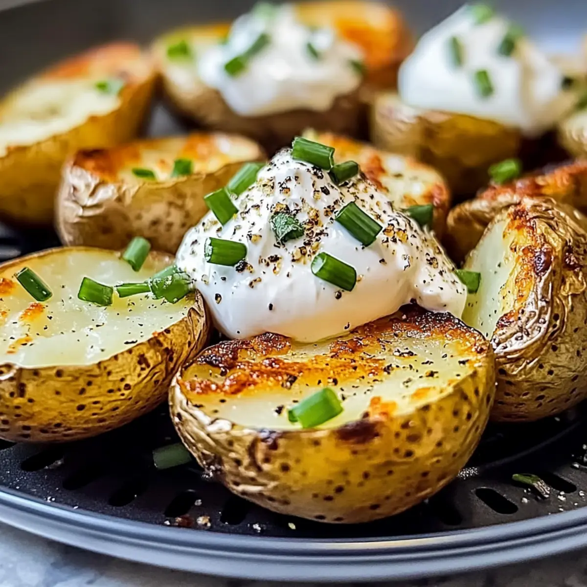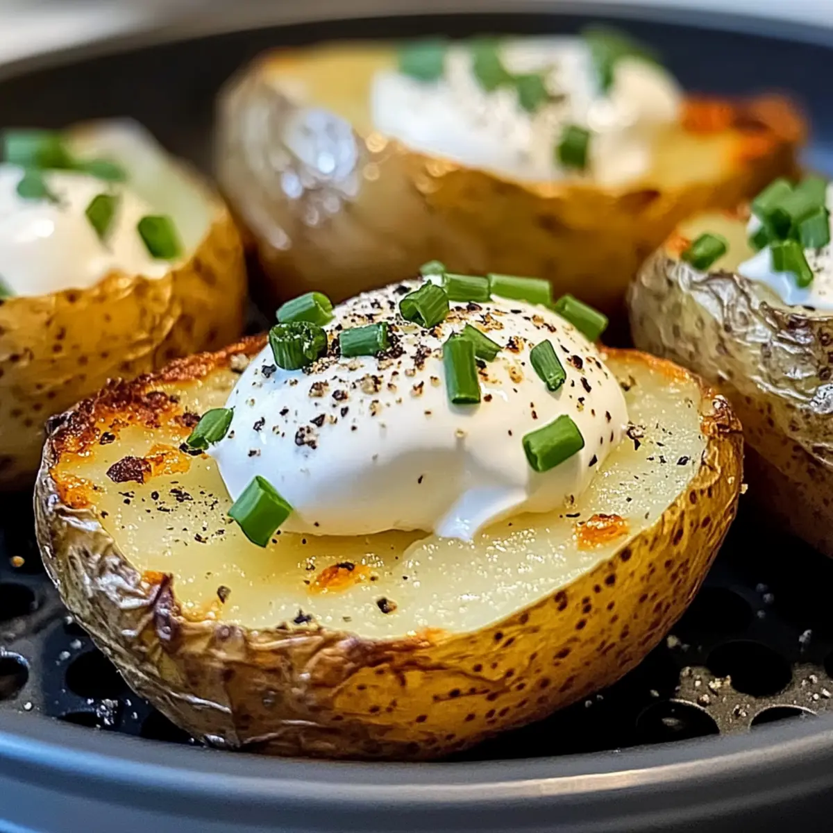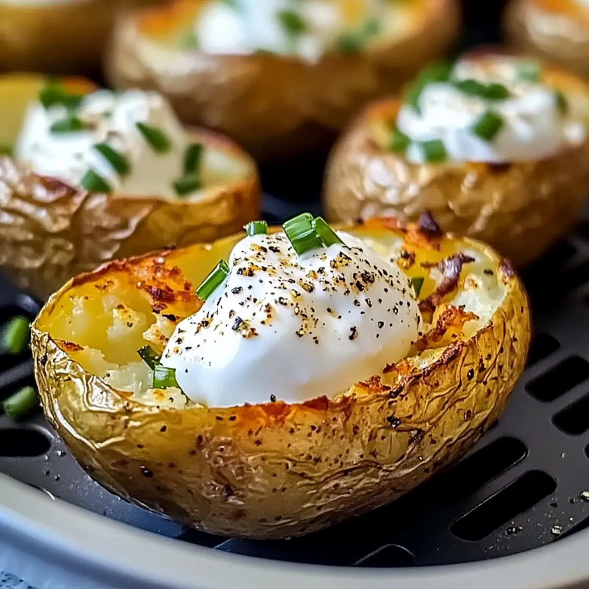Eines der besten Dinge beim Kochen ist die Freude, die ein einfaches Gericht bereiten kann. Ich kann kaum beschreiben, wie sehr ich den Geruch von frisch gebackenen Kartoffeln in der Luftfritteuse liebe – diese perfekte Mischung aus knuspriger Schale und fluffiger Innenseite ist einfach unwiderstehlich. Mit meinem Rezept für Luftfritteuse gebackene Kartoffeln wird das Ganze zum Kinderspiel, denn in weniger als 40 Minuten kannst du ein köstliches, vielseitiges Gericht auf den Tisch zaubern. Diese Kartoffeln sind nicht nur glutenfrei, sondern auch ideal für eine low-carb oder vegane Ernährung – perfekt als Beilage zu deinem Hauptgang oder einfach nur mit deinen Lieblings-Toppings als Snack. Bist du bereit, deine eigene Kartoffelkunst zu kreieren? Lass uns loslegen! Warum wirst du dieses Rezept lieben? Einfachheit: Dieser Prozess ist unkompliziert und erfordert nur grundlegende Kochfähigkeiten, sodass du sofort durchstarten kannst. Vielfältige Toppings: Egal, ob du es klassisch mit Butter und Sahne magst oder etwas Exotisches ausprobierst – die Möglichkeiten sind endlos! Perfekte Textur: Mit einer knusprigen Schale und einem weichen, fluffigen Inneren bist du schnell begeistert von jedem Bissen. Zeitersparnis: In nur 35-40 Minuten hast du ein köstliches Gericht bereit, ohne stundenlang in der Küche zu stehen. Gesundheitlich unbedenklich: Dieses Gericht ist nicht nur lecker, sondern auch glutenfrei und vegan-freundlich – ideal für jeden Gast. Beliebtheit garantiert: Diese Kartoffeln werden bei deiner nächsten Dinner-Party garantiert ein Hit – niemand kann dem verführerischen Duft widerstehen! Wenn du auf der Suche nach weiteren köstlichen Rezepten bist, schau dir auch unseren Spargelauflauf mit Kartoffeln und Schinken an! Luftfritteuse gebackene Kartoffeln Zutaten • Dieses Rezept für luftfrittierte gebackene Kartoffeln erfordert nur einige einfache Zutaten. Für die Kartoffeln Russische oder Idaho-Kartoffeln – Die Hauptzutat; wähle mittlere Kartoffeln (7 Unzen) für besten Geschmack und Textur. Olivenöl – Verbessert die Knusprigkeit; kann durch jedes hitzebeständige Öl ersetzt werden. Koscheres Salz – Pro Kartoffel verwenden, um Geschmack zu verstärken und eine knusprige Textur zu erzeugen; vermeide Tafelsalz für die besten Ergebnisse. Schwarzer Pfeffer – Optionale Würze, um den Geschmack zu intensivieren; nach Geschmack anpassen. Für die Toppings Sauerrahm/Joghurt – Eine optionale Füllung für zusätzliche Cremigkeit und Reichtum. Butter – Für Geschmack und eine klassische Note, ebenfalls optional. Chili und Schnittlauch – Toppings für etwas Schärfe, ideal für Feinschmecker. Brokkoli oder Käse – Vielseitige Optionen für mehr Nährstoffe und Geschmack. Mit diesen Zutaten bist du bestens ausgestattet, um luftfrittierte gebackene Kartoffeln zu kreieren, die sowohl geschmacklich überzeugen als auch anpassbar sind! Schritt-für-Schritt-Anleitung für Luftfritteuse gebackene Kartoffeln Step 1: Kartoffeln vorbereiten Wasche die Russischen oder Idaho-Kartoffeln gründlich und trockne sie anschließend mit einem Küchentuch ab. Steche dann mit einer Gabel mehrmals in jede Kartoffel, um zu verhindern, dass sie beim Garen platzen. Das präparierte Gemüse ist bereit für die Luftfritteuse, was die Zubereitung der luftfrittierte gebackene Kartoffeln einfach macht. Step 2: Öl und Würzen Besprühe die vorbereiteten Kartoffeln gleichmäßig mit Olivenöl, um eine knusprige Textur zu gewährleisten. Anschließend streue koscheres Salz und optional schwarzen Pfeffer großzügig über jede Kartoffel, um den Geschmack zu intensivieren. Achte darauf, dass die Gewürze gleichmäßig verteilt sind, um das Aroma der luftfrittierte gebackene Kartoffeln zu maximieren. Step 3: Luftfrittieren Lege die Kartoffeln vorsichtig in den Korb der Luftfritteuse und stelle die Temperatur auf 200 °C ein. Gare die Kartoffeln für 35-40 Minuten, wobei du sie einmal während des Garvorgangs nach der Hälfte der Zeit wendest. Du erkennst, dass sie fertig sind, wenn die Schale goldbraun und knusprig ist und die Kartoffeln sich leicht anstechen lassen. Step 4: Garzeit überprüfen Nach etwa 35 Minuten kannst du mit einem scharfen Messer in die dickste Stelle der Kartoffel stechen. Wenn das Messer leicht eindringt, sind deine luftfrittierte gebackene Kartoffeln perfekt gegart und bereit zum Servieren. Sollte es noch Widerstand geben, gare sie für weitere 5 Minuten und überprüfe erneut. Step 5: Servieren Sobald die Kartoffeln gar sind, nimm sie vorsichtig aus der Luftfritteuse und lasse sie eine Minute ruhen. Du kannst sie dann nach Belieben mit deinen favorisierten Toppings wie Sauerrahm, Butter, Käse oder frischem Gemüse belegen. Genieße die perfekt luftfrittierte gebackene Kartoffeln als Beilage oder als herzhaften Snack! Was passt zu luftfrittierte gebackene Kartoffeln? Erlebe ein harmonisches Geschmackserlebnis, wenn du diese köstlichen Kartoffeln mit perfekten Beilagen kombinierst. Saftiges Steak: Die reichhaltige Textur von Steak harmoniert wunderbar mit den knusprigen Kartoffeln und schafft eine herzhafte Hauptspeise. Geröstetes Gemüse: Bunte, geröstete Gemüse sorgen für frische Aromen und viele Nährstoffe, die das Gericht wunderbar abrunden. Cremiger Brokkoli: Der zarte Brokkoli mit einer cremigen Käsesauce ergänzt die Kartoffeln perfekt und sorgt für einen interessanten Kontrast. Coleslaw: Ein knackiger, würziger Coleslaw bietet eine erfrischende Balance zur Wärme der Kartoffeln und rundet das Mittagessen ab. Knoblauchbrot: Zartes Knoblauchbrot ist eine perfekte Ergänzung, da es den köstlichen Geschmack der Kartoffeln ergänzt und für mehr Textur sorgt. Salsa: Eine würzige Salsa bringt Frische und einen Hauch von Schärfe mit, die die ohnehin schon köstlichen Kartoffeln aufwertet. Leichtes Bier oder Weißwein: Erfrischende Getränke wie ein leichtes Bier oder ein spritziger Weißwein runden das Geschmackserlebnis ab und harmonieren perfekt mit