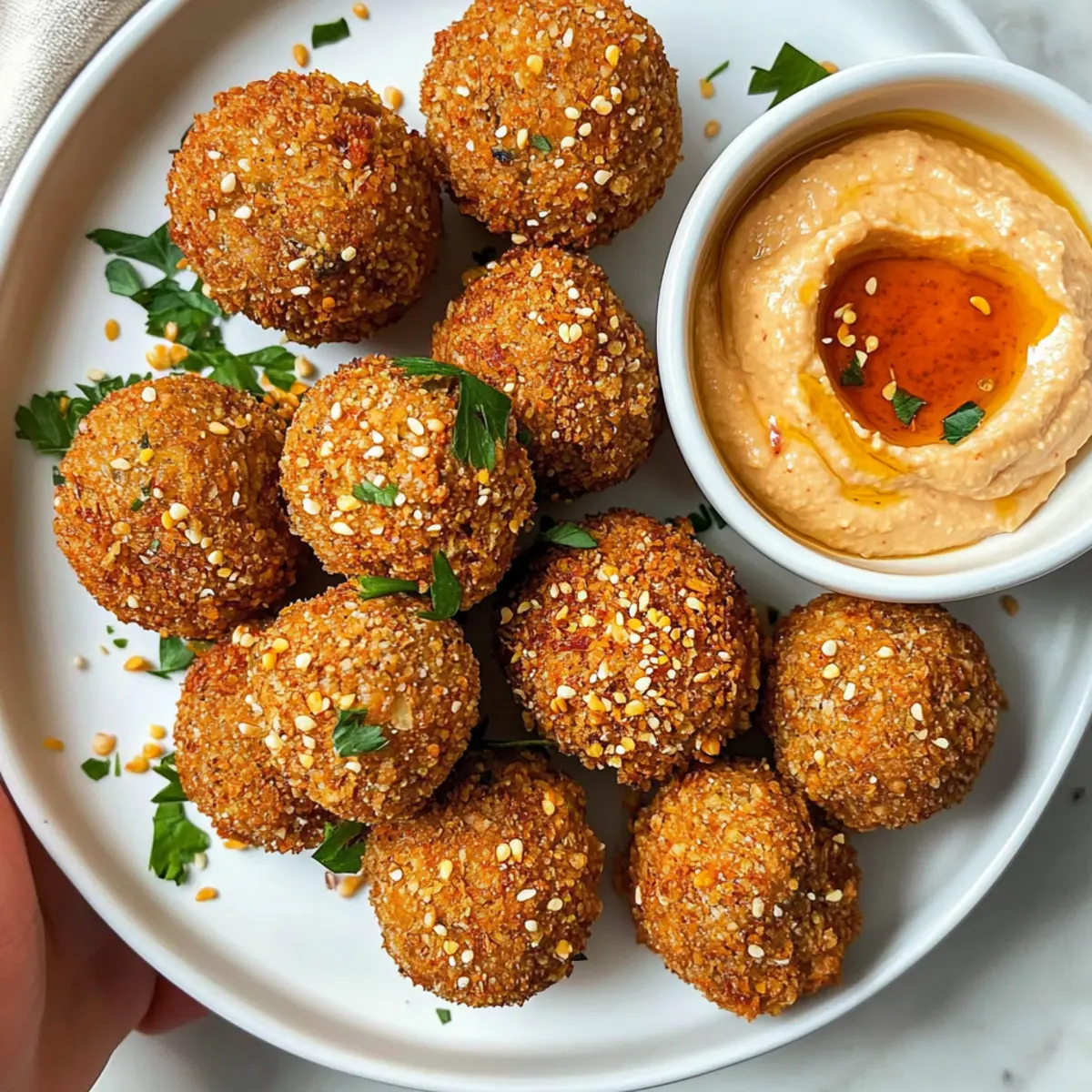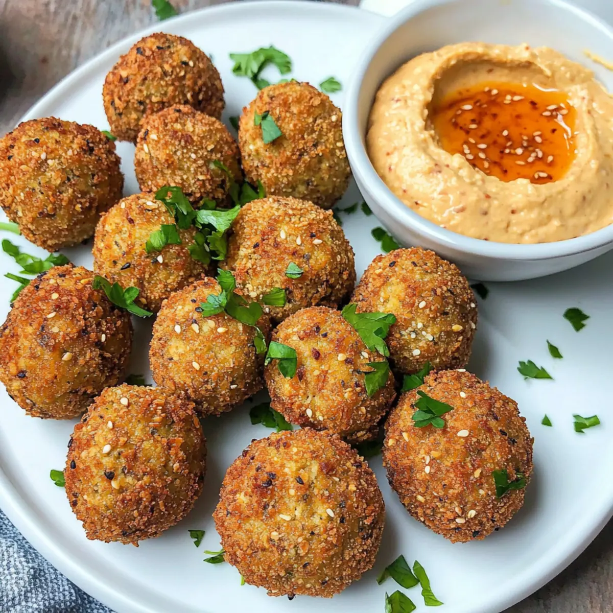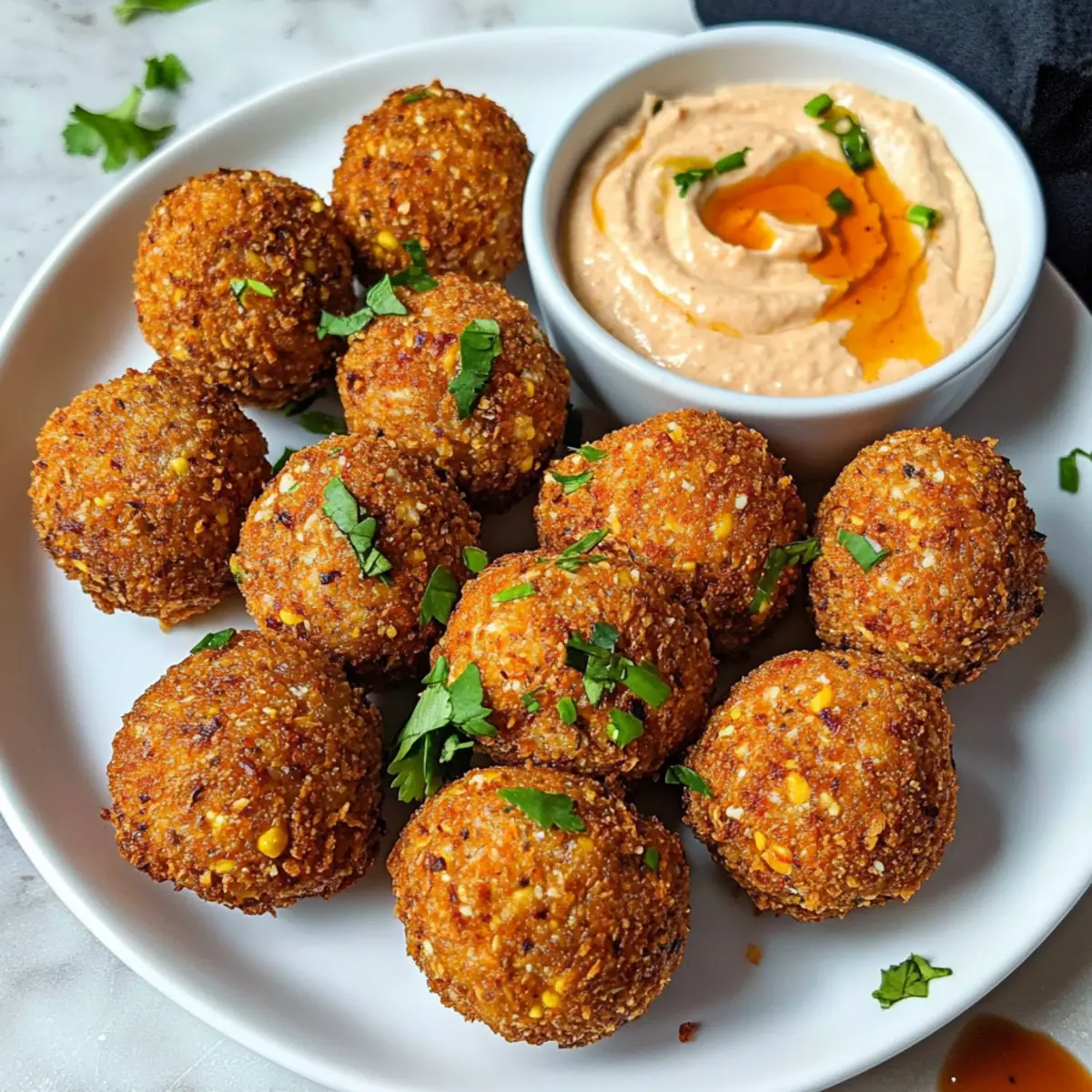 Hast du schon einmal einen Snack genossen, der so lecker und gleichzeitig gesund ist, dass du dich nicht entscheiden konntest, ob du ihn zum Mittagessen oder als Appetizer servieren sollst? Diese luftfrittieren Tofu-Bällchen sind genau das! Sie sind nicht nur eine perfekte Lösung für ein schnelles und einfaches Gericht, sondern auch ein wunderbarer Genuss für alle, die auf der Suche nach etwas Gesunden sind. Mit ihrer knusprigen Textur und dem rauchigen Paprikageschmack sind sie der ideale Begleiter zu einem cremigen Sriracha-Hummus. Ob für den nächsten Filmabend oder als Teil eines entspannten Abendessens mit Freunden – diese luftfrittieren Tofu-Bällchen werden garantiert zum Star auf deinem Tisch. Bist du bereit, dieses gesunde Snackvergnügen auszuprobieren? Warum sind luftfrittierte Tofu-Bällchen einzigartig? Einfachheit: Die Zubereitung ist ein Kinderspiel. Mit nur wenigen Schritten und leicht erhältlichen Zutaten kannst du im Handumdrehen etwas Leckeres kreieren. Gesundheitlich vorteilhaft: Diese Tofu-Bällchen sind vegan, glutenfrei und voller nahrhafter Inhaltsstoffe – perfekt für einen gesunden Snack ohne schlechtes Gewissen! Vielfältig: Du kannst sie nach Belieben anpassen! Füge verschiedene Gewürze oder frische Kräuter hinzu, um neue Geschmacksrichtungen zu entdecken. Perfekte Textur: Die Kombination aus knuspriger Außenschicht und zartem Inneren sorgt für ein rundum befriedigendes Geschmackserlebnis. Schnell: Mit der Luftfritteuse gelingen sie in kürzester Zeit – ideal für busy Days oder spontane Gäste! Ganz einfach zum Genießen: Serve sie zusammen mit Sriracha-Hummus oder einer anderen Dipsauce für einen geschmackvollen Genuss, der bei jedem Anklang findet! Luftfrittierte Tofu-Bällchen Zutaten Hinweis: Hier findest du alles, was du für diese köstlichen luftfrittieren Tofu-Bällchen benötigst! Für die Bällchen: Ungesüßte Cornflakes – Diese dienen als knusprige Panade; du kannst glutenfreie Cornflakes für eine glutenfreie Variante verwenden. Räucherpaprika – Sie verleiht dem Snack einen herrlichen rauchigen Geschmack; reguläre Paprika ist eine mildere Option. Fester Tofu – Das Hauptzutat, die für die Struktur sorgt; wähle festen oder extra festen Tofu für optimale Ergebnisse. Nährhefe – Für einen zusätzlichen Nährstoffkick sowie einen käseähnlichen Geschmack; kann für einen einfacheren Geschmack weggelassen werden. Knoblauchpulver – Für eine würzige Tiefe; frischer Knoblauch kann in gehackter Form verwendet werden. Zwiebelpulver – Verstärkt den Gesamtgeschmack; frische Zwiebeln können verwendet werden, verändern jedoch möglicherweise die Textur. Chili-Flocken – Für eine optionale scharfe Note; für mildere Bällchen weglassen. Für die Sauce: Hummus – Die cremige Basis der Sauce; verschiedene Hummus-Sorten bieten unterschiedliche Geschmacksrichtungen. Sriracha – Fügt der Sauce Würze und Geschmack hinzu; die Menge kann nach Vorliebe angepasst werden. Wasser – Verdünnt die Sauce für die gewünschte Konsistenz; verwende mehr Hummus für eine dickere Sauce. Mit diesen Zutaten zauberst du im Handumdrehen luftfrittierte Tofu-Bällchen, die nicht nur lecker, sondern auch gesund sind! Schritt-für-Schritt-Anleitung für Luftfrittierte Tofu-Bällchen Step 1: Panade vorbereiten Zerkleinere die ungesüßten Cornflakes zusammen mit der Räucherpaprika in einem Mixer, bis sie eine krümelige Textur haben. Achte darauf, dass die Mischung gut vermischt, aber nicht zu fein ist. Stelle die Panade beiseite, während du dich um die Tofu-Mischung kümmerst. Step 2: Tofu-Mischung formen Gib den festen Tofu, die Nährhefe, das Knoblauchpulver, das Zwiebelpulver und die optionalen Chili-Flocken in eine Küchenmaschine. Püriere alles, bis eine gleichmäßige und cremige Konsistenz entsteht. Es sollte leicht formbar sein. Dieser Schritt sorgt dafür, dass die Luftfrittierte Tofu-Bällchen eine tolle Grundlage haben! Step 3: Bällchen formen Nimm portionsweise die Tofu-Mischung und forme sie mit deinen Händen zu golfballgroßen Bällchen. Achte darauf, dass sie gut zusammenhalten. Rolle jede Tofu-Bällchen anschließend in der vorbereiteten Cornflake-Panade und drücke leicht, damit die Panade gut haftet. Dies gibt den luftfrittieren Tofu-Bällchen die knusprige Außenschicht. Step 4: Luftfrittieren Heize deine Luftfritteuse auf 180 °C vor. Lege die vorbereiteten Tofu-Bällchen vorsichtig in den Korb der Fritteuse, ohne dass sie sich berühren. Lasse die Bällchen für etwa 10-15 Minuten garen, bis sie goldbraun und knusprig sind. Schüttle den Korb gelegentlich, damit sie gleichmäßig garen. Step 5: Sauce zubereiten Während die Tofu-Bällchen frittieren, kannst du die Sauce zubereiten. Mische in einer Schüssel den Hummus, die Sriracha und das Wasser miteinander, bis eine glatte Konsistenz erreicht ist. Passe die Menge der Sriracha je nach gewünschter Schärfe an. Diese Sauce wird der perfekte Begleiter zu deinen luftfritten Tofu-Bällchen sein. Step 6: Servieren Serviere die luftfritten Tofu-Bällchen warm, zusammen mit der Sriracha-Hummus-Sauce auf der Seite. Diese Kombination sorgt für ein köstliches und gesundes Snack-Erlebnis, das sowohl bei Freunden als auch bei Familie gut ankommt. Genieße die knusprige Textur und den herzhaften Geschmack bei deiner nächsten Zusammenkunft! Was passt zu luftfrittierte Tofu-Bällchen? Diese knusprigen, wohlschmeckenden Bällchen sind nicht nur ein Highlight für deinen Gaumen, sondern auch die perfekte Basis für eine köstliche Mahlzeit! Frischer Salat: Ein knackiger gemischter Salat mit einem leichten Dressing bringt frische Aromen und Texturen, die die herzhafte Note der Tofu-Bällchen wunderbar ergänzen. Der frische Geschmack von Gurken und Tomaten sorgt für einen schönen Kontrast zu den knusprigen Bällchen. Quinoa-Salat: Ein erdiger Quinoa-Salat mit Zitronen-Dressing ist ideal, um die gesunden Elemente deines Gerichts zu betonen. Die Nüsse und Kräuter im Salat brin