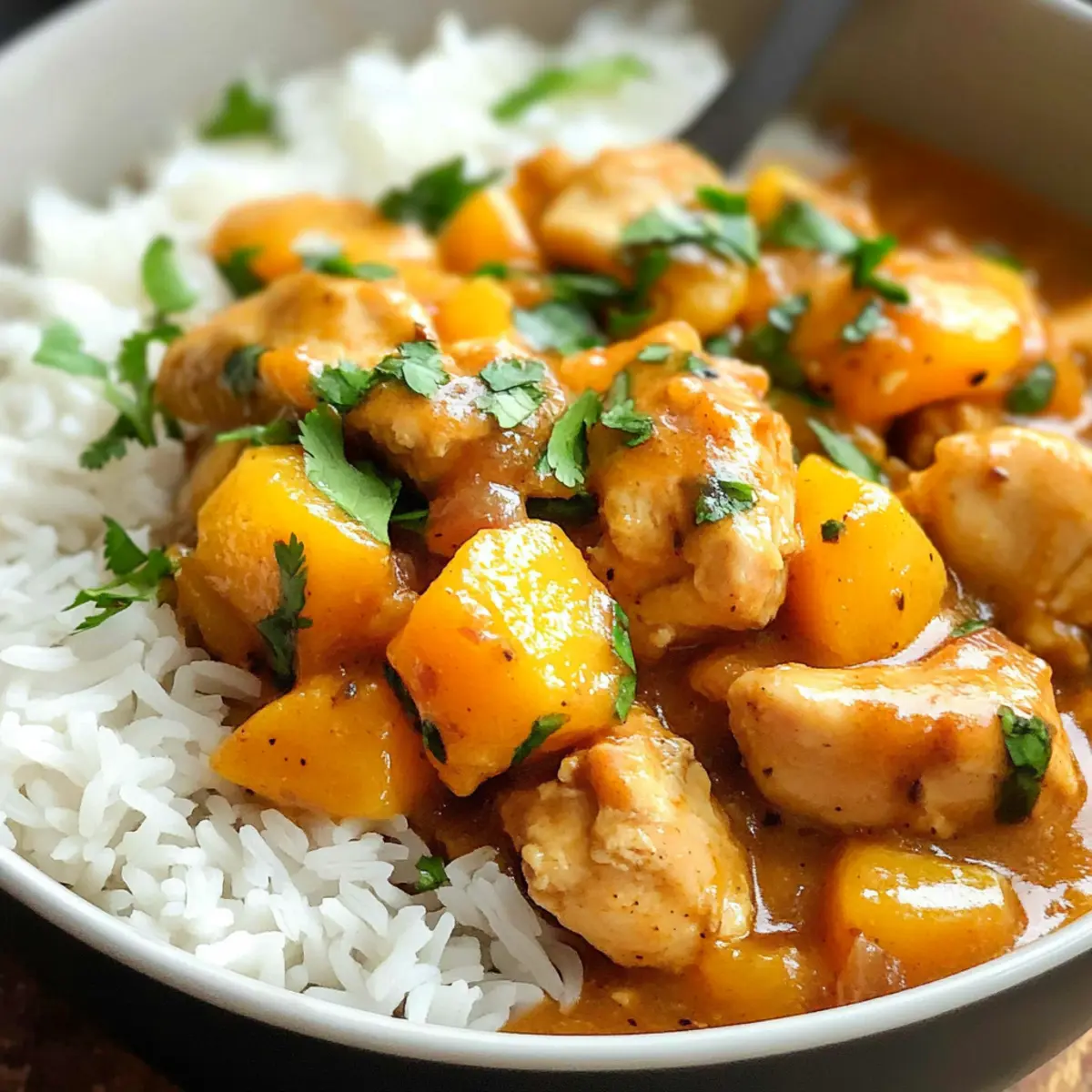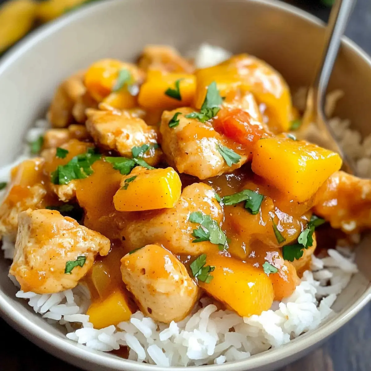 Oh, die Freude, wenn ich an meinem Küchentisch stehe und die Aromen eines köstlichen Gerichts erwachen! Heute präsentiere ich euch mein Lieblingsrezept: Mango Hähnchen und Reis. Diese gefühlsvolle, farbenfrohe Kombination eignet sich perfekt für alle, die eine einfache und gesunde Option suchen, ohne auf den Genuss zu verzichten. In nur 20 Minuten bereitet ihr eine köstliche, slow-cooked Curry-Sensation zu, die mild süß und leicht würzig ist. Mit weniger als 500 Kalorien pro Portion ist dieses Gericht nicht nur ein wahrer Genuss für den Gaumen, sondern auch eine hervorragende Wahl für die figurbewusste Küche! Möchtet ihr erfahren, wie ihr diesen tropischen Traum nachkochen könnt? Lasst uns gemeinsam in die Zubereitung eintauchen! Warum werden Sie dieses Curry lieben? Einfachheit: Die Zubereitung Ihres Mango Hähnchens und Reis ist kinderleicht! In nur 20 Minuten haben Sie alles vorbereitet. Reichhaltige Aromen: Die Kombination aus süßer Mango, würziger Currypaste und cremiger Kokosnuss sorgt für ein Geschmackserlebnis, das Ihre Geschmacksknospen verzaubert. Gesunde Wahl: Mit weniger als 500 Kalorien pro Portion ist dieses Gericht eine leichte und gesunde Alternative zu schwerem Fast Food. Vielseitigkeit: Ob mit frischen oder konservierten Mangos – Sie können ganz nach Ihrem Geschmack wählen. Kombinieren Sie es auch mit Basilikum Hähnchen Mit für ein tolles Dinner! Perfekte Texturen: Saftiges Hähnchen und eine cremige Currysauce umschmeicheln die zarten Jasminreis-Körner und schaffen ein unvergessliches Esserlebnis. Beliebtheit: Dieses Gericht ist ein Hit bei Freunden und Familie – es wird sicherlich ein vollwertiger Restaurant-Ersatz sein, den jeder genießen kann! Mango Hähnchen und Reis Zutaten Für dieses köstliche Mango Hähnchen und Reis Gericht benötigen Sie nur die besten Zutaten, die Sie entweder frisch oder aus der Dose beziehen können. Für das Curry: Hähnchenschenkel ohne Haut – Zarter und saftiger, ideal für das Curry; immer auf die Fetttrimmung achten. Mango (aus der Dose oder frisch) – Sorgt für Süße und tropischen Geschmack; verwenden Sie reife frische Mangos oder Dosen in natürlichem Saft. Tomatenpüree – Wirkt als Bindemittel; zu verwenden ist Tomatenpassata, um eine spärliche Konsistenz zu vermeiden. Kokoscreme – Fügt Reichtum und Cremigkeit hinzu; für die beste Textur immer die Vollfett-Variante wählen. Gelbe Currypaste – Grundgeschmack des Gerichts; eine reduzierte Menge empfiehlt sich für eine mildere Note. Braune Zwiebel – Aromatische Basis, die dem Curry Tiefe verleiht; fein gewürfelt verwenden. Gehackter Knoblauch – Steigert den herzhaften Geschmack; frischer Knoblauch ist vorzuziehen. Ingwerpaste – Verleiht Wärme und Gewürz; frischer Ingwer kann als Ersatz dienen. Rote Chiliflocken – Für den richtigen Schärfewert; nach Belieben anpassen. Naturjoghurt (Vollfett) – Zartes Hähnchen durch Marination; es kann auch mit einer pflanzlichen Variante ersetzt werden. Jasminreis – Serviert als Beilage; gar gekocht, um die Reichhaltigkeit des Currys auszugleichen. Küchentipp: Für noch mehr Genuss, kombinieren Sie das Mango Hähnchen mit einer Beilage aus frischem Basilikum oder probieren Sie eine andere leckere Rezeptvariante, die Ihre Freunde beeindrucken wird! Step-by-Step Instructions für Mango Hähnchen und Reis Step 1: Hähnchen vorbereiten Schneiden Sie die Hähnchenschenkel in etwa 2 cm große Stücke und legen Sie sie in eine große Schüssel. Dies ermöglicht eine gleichmäßige Garung und sorgt für zarte Stücke. Stellen Sie sicher, dass die Hähnchenstücke gut sichtbar und bereit zum Marinieren sind. Step 2: Hähnchen marinieren Vermengen Sie die Hähnchenstücke mit der Hälfte der gelben Currypaste, dem gehackten Knoblauch, der Ingwerpaste, den roten Chiliflocken und dem Naturjoghurt. Rühren Sie alles gut um, sodass das Hähnchen gleichmäßig mit den Aromen umhüllt ist. Lassen Sie die Mischung für mindestens 20 Minuten ziehen, um die Geschmäcker zu intensivieren. Step 3: Mango pürieren Nehmen Sie die Mango (ob frisch oder aus der Dose) und pürieren Sie sie mit einer Gabel oder in einem Mixer, bis sie eine glatte Konsistenz hat. Dies wird die süße Basis für die Sauce Ihres Mango Hähnchens und Reis bilden. Achten Sie darauf, die Mischung ruhig und gleichmäßig zu pürieren. Step 4: Aromatische Zutaten anbraten Erhitzen Sie eine große Pfanne über mittlerer Hitze und fügen Sie die gewürfelte Zwiebel hinzu. Braten Sie diese an, bis sie goldbraun und duftend ist. Geben Sie dann die verbleibende gelbe Currypaste, Knoblauch und Ingwer hinzu und braten Sie alles weitere 2 Minuten an, bis es aromatisch ist. Rühren Sie schließlich das Tomatenpüree unter. Step 5: Alles im Slow Cooker kombinieren Übertragen Sie die marinierten Hähnchenstücke in den Slow Cooker und fügen Sie die angebratenen Zwiebeln, die Kokoscreme und das Mangopüree hinzu. Rühren Sie alles gut durch, sodass das Hähnchen gleichmäßig mit der köstlichen Sauce überzogen ist. Überprüfen Sie, ob die Zutaten gleichmäßig verteilt sind. Step 6: Kochen Decken Sie den Slow Cooker ab und stellen Sie ihn auf die niedrige Stufe. Lassen Sie das Mango Hähnchen und Reis für etwa 6 Stunden köcheln. Die langsame Garung sorgt dafür, dass das Hähnchen zart wird und die Aromen sich optimal entfalten. Wenn die Zeit um ist, sollte das Hähnchen schön durchgegart und die Sauce cremig sein. Step 7: Servieren Servieren Sie das Mango Hähnchen heiß über frisch gekochtem Jasminreis. Der Duft und die Farben werden einladend sein und Ihre Geschmacksknospen erfreuen. Garnieren Sie nach Wunsch mit frischem Koriander oder einem zusätzlichen Klecks Kokoscreme für das perfekte Aroma! Mango Hähnchen und Reis Variationen Entdecken Sie kreative Wege, um dieses Rezept zu personalisieren und Ihren eigenen Geschmack zu verwirklichen. Dairy-Free: Ersetzen Sie den Naturjoghurt durch eine pflanzliche Alternative wie Kokosjoghurt fü