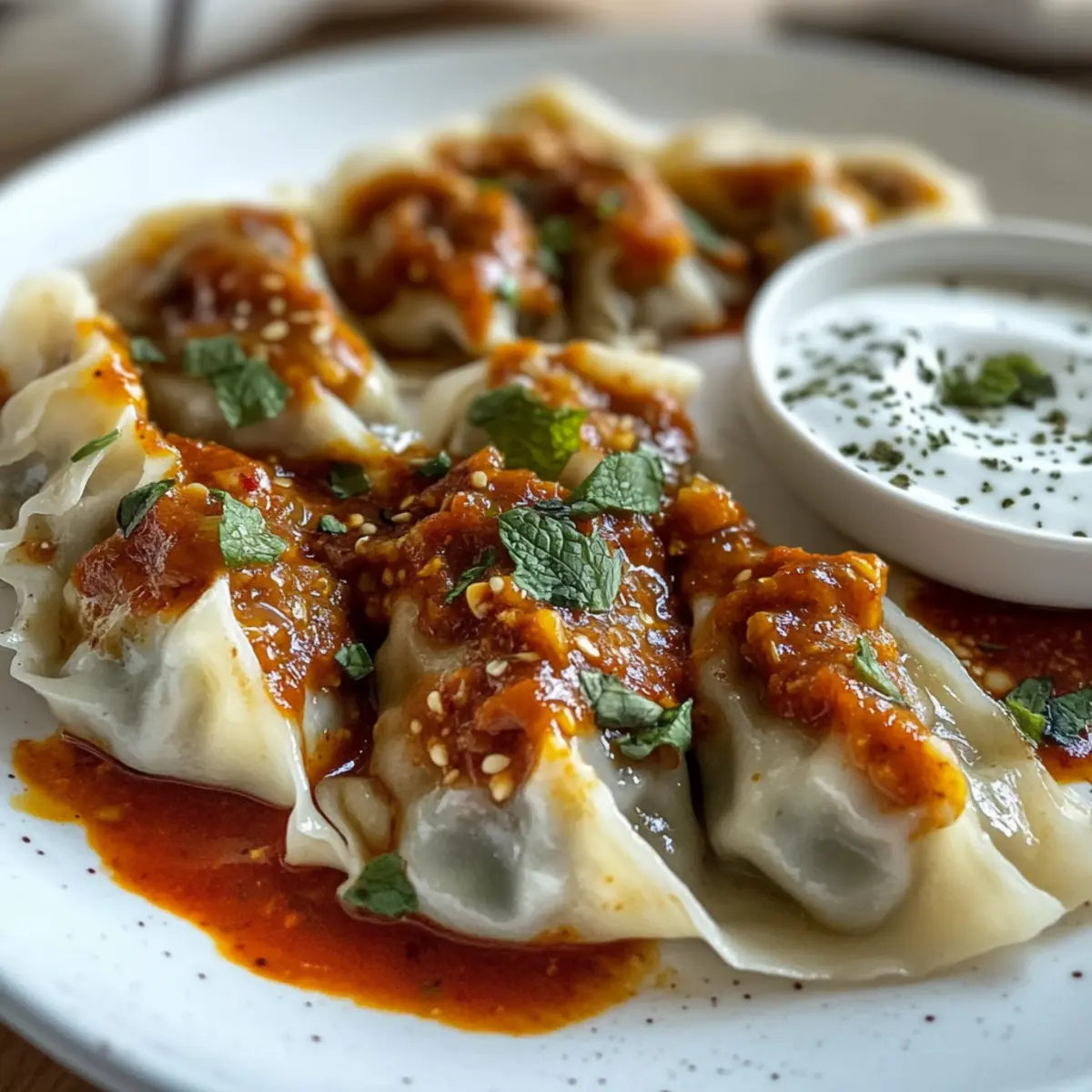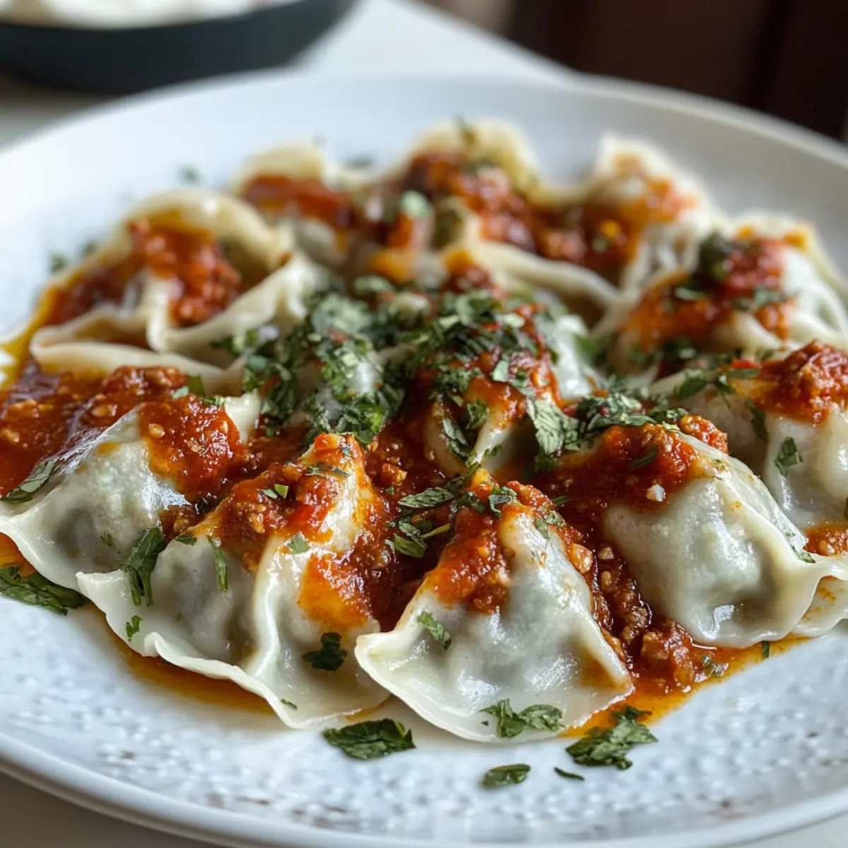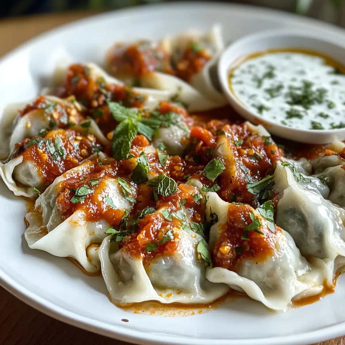 Der Duft von frisch zubereiteten Mantu zieht mich sofort in seinen Bann, während ich durch die Küche schwebe. Diese afghanischen Dumplings sind nicht nur ein Fest für die Sinne, sondern auch ein wahrer Genuss der traditionellen Küche. Die Zubereitung dieser köstlichen Mantu, gefüllt mit einer herzhaften Mischung aus Rinderhack und erlesenen Gewürzen, gelingt schnell und macht sogar den stressigsten Tag zu einem besonderen Abendessen. Ähnlich einer warmen Umarmung bieten sie nicht nur praktischen Komfort, sondern auch die Möglichkeit, mit Familie und Freunden in geselliger Runde zu genießen. Ich lade dich ein, in die Welt der Aromen einzutauchen und diese köstlichen Mantu zuzubereiten. Bist du bereit, deine Gäste mit dieser traditionellen Delikatesse zu begeistern? Warum wirst du Mantu lieben? Einzigartige Geschmackskombination: Die harmonische Mischung aus gewürztem Rindfleisch und frischen Kräutern verleiht jedem Bissen eine explosive Geschmacksexplosion. Einfache Zubereitung: Mit nur wenigen Zutaten und klaren Anweisungen gelingt dir dieser traditionelle Genuss mühelos. Perfektes Comfort Food: Diese herzhaften Teigtaschen sind die ideale Wahl für ein gemütliches Abendessen oder eine gesellige Feier. Gesunde Optionen: Dank der Verwendung von frischen Zutaten und der Möglichkeit, das Fleisch zu variieren, sind Mantu eine gesunde Alternative zu schnellem Essen. Kulturelle Verbindung: Beim Zubereiten und Teilen von Mantu erlebst du die reiche Kultur Afghanistans hautnah. Lass dich von unseren weiteren Varianten inspirieren und entdecke neue Geschmackskombinationen, während du mehr über Afghanische Küche lernst. Mantu Zutaten Achtung! Hier sind die benötigten Zutaten für deine köstlichen Mantu, die dich in die Welt der afghanischen Küche entführen werden! Für die Füllung Rinderhackfleisch – Hauptbestandteil für die Füllung, kann auch durch Lamm oder Hühnchen ersetzt werden. Zwiebel, gewürfelt – Sorgt für Süße und Tiefe in der Füllung, verwende Schalotten für einen milderen Geschmack. Knoblauch – Verstärkt den Geschmack, frischer, gehackter Knoblauch ist die beste Wahl. Rote Paprikaflocken – Fügen Schärfe hinzu; je nach Vorliebe anpassen. Koriander – Gibt eine warme, zitrusartige Note, kann durch Kreuzkümmel ersetzt werden. Kreuzkümmel – Ergänzt das Rindfleisch mit erdigen Aromen. Salz & Pfeffer – Essentiell für die Würze, nach Geschmack anpassen. Öl – Zum Anbraten verwendet, kann durch Olivenöl für ein anderes Geschmacksprofil ersetzt werden. Gelbe Spalterbsen, vorgekocht – Für zusätzliche Textur und Nährstoffe, können durch Linsen ersetzt werden. Kurkuma – Gibt Farbe und Tiefe zur Sauce. Für die Sauce Tomatenpüree – Bildet die Basis der Sauce, kann durch gehackte Tomaten oder Tomatenmark mit Wasser ersetzt werden. Für die Garnitur & Beilagen Chakkah (Joghurtsauce) – Fügt Cremigkeit und einen Hauch Frische hinzu, passe den Knoblauch nach Geschmack an. Getrocknete Minze – Für die Garnitur und aromatischen Geschmack, frisch verwenden, wenn verfügbar. Wonton-Blätter – Außenhülle der Teigtaschen, hausgemachter Teig sorgt für einen traditionellen Touch. Bereite dich darauf vor, mit diesen Mantu Zutaten ein unvergessliches Gericht zu kreieren, das Herzen erwärmt und Erinnerungen schafft. Schritt-für-Schritt-Anleitung für Mantu Step 1: Füllung vorbereiten Erhitze etwas Öl in einer Pfanne bei mittlerer Hitze und brate 500 g Rinderhackfleisch an, bis es braun wird. Füge 1 gewürfelte Zwiebel und 2 gehackte Knoblauchzehen hinzu, brate sie 3–4 Minuten lang, bis sie weich sind. Mische dann 1 Teelöffel rote Paprikaflocken, 1 Teelöffel Koriander, 1 Teelöffel Kreuzkümmel, und würze mit Salz und Pfeffer. Lass die Füllung abkühlen und stelle sie beiseite. Step 2: Sauce zubereiten In einem Topf 400 g Tomatenpüree, 1 Teelöffel Kurkuma, und Salz sowie 1 Teelöffel rote Paprikaflocken vermengen. Füge 200 g vorgekochte gelbe Spalterbsen hinzu und lasse die Sauce bei niedriger Hitze 10–15 Minuten köcheln, bis die Aromen gut verbunden sind. Rühre gelegentlich um, um ein Anbrennen zu verhindern. Die Sauce sollte dick und aromatisch sein. Step 3: Wontons vorbereiten Nimm die Wonton-Blätter und befeuchte die Ränder leicht mit Wasser. Lege einen Teelöffel der zuvor zubereiteten Füllung in die Mitte jedes Blattes. Falte die Wontons sorgfältig zusammen und drücke die Ränder gut an, um ein Auslaufen der Füllung während des Kochens zu vermeiden. Wiederhole diesen Schritt, bis alle Blätter verwendet sind. Step 4: Teigtaschen dämpfen Öle den Dämpfkorb leicht ein und lege die gefüllten Mantu hinein. Sorge dafür, dass sie sich nicht berühren, da sie beim Dämpfen etwas aufgehen. Dämpfe die Teigtaschen für mindestens 15–20 Minuten bei hohem Dampf, bis sie durch und leicht klebrig sind. Die Mantu sind fertig, wenn sie zart und durchgegart sind. Step 5: Chakkah zubereiten Mische in einer Schüssel 250 g griechischen Joghurt mit 1–2 gehackten Knoblauchzehen, einer Prise Salz und etwas Wasser, bis die Mischung eine cremige Konsistenz hat. Schmecke die Chakkah ab und passe den Knoblauch nach Belieben an. Diese Joghurtsauce wird das Gericht geschmacklich bereichern. Step 6: Mantu anrichten Verteile eine Portion der Chakkah auf einem großen Teller. Platziere die gedämpften Mantu darauf und gieße die vorbereitete Tomatensauce darüber. Garniere das Gericht mit getrockneter Minze und frisch gehacktem Koriander. Die appetitlichen Mantu sind nun bereit, serviert zu werden. Mantu Variationen und Alternativen Lass deiner Kreativität freien Lauf und passe das Rezept nach deinem Geschmack an! Fleischwechsel: Ersetze das Rinderhackfleisch durch Lamm oder Hühnchen für neue Geschmackserlebnisse. Verleihe deinem Gericht eine persönliche Note! Gemüsige Füllung: Füge geraspelte Karotten oder Zucchini zur Füllung hinzu, um mehr Nährstoffe und Farbe zu integrieren. Diese Variationen sorgen für eine spanne