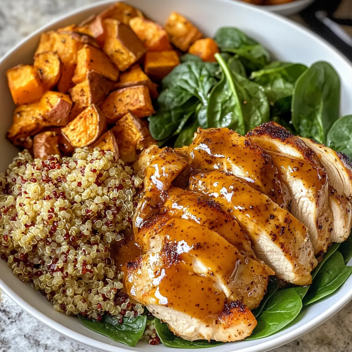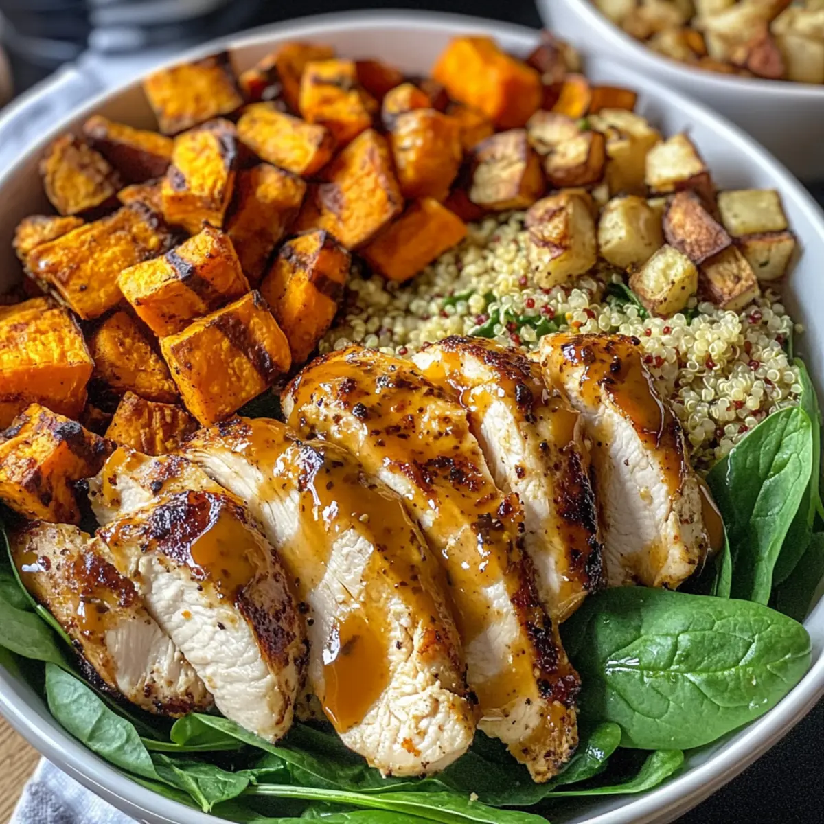 Es war ein dieser Abende, an denen ich mir nach einem langen Tag etwas Gutes gönnen wollte. Genau dann kam die Idee für meine Maple Dijon Hähnchen & Süßkartoffel Schalen – eine perfekte Kombination aus süßen und herzhaften Aromen, die wirklich glücklich macht. Diese nährstoffreiche Schale ist nicht nur einfach zuzubereiten, sondern auch ideal für Meal Prep, was sie zu einer großartigen Wahl für beschäftigte Wochen macht. Mit saftigem Hähnchen, das in einer glänzenden Ahorn-Dijon-Glasur schimmert, wird sie zusammen mit cremigen Süßkartoffeln und nussigem Quinoa zum absoluten Genuss. Sind Sie bereit, eine köstliche und gesunde Bewertung Ihres Abendessens zu erleben? Warum sind diese Schalen so besonders? Einfachheit: Dieses Rezept ist unkompliziert und erfordert nur wenige Grundkenntnisse in der Küche, perfekt für jeden Koch. Wunderbare Aromen: Die Kombination aus süßem Ahornsirup und würzigem Dijon sorgt für ein Geschmacksfeuerwerk, das Ihre Geschmacksknospen verwöhnt. Vielseitigkeit: Egal, ob Sie nach einer schnellen Mahlzeit für die Woche suchen oder sich etwas Besonderes gönnen möchten, diese Schalen sind für jede Gelegenheit geeignet. Nährstoffreich: Mit proteinreichem Hähnchen und gesunden Zutaten wie Quinoa und Süßkartoffeln sind Sie gut versorgt. Sie können auch kreative Variationen ausprobieren: Warum nicht mal mariniertes Tofu anstelle von Hähnchen verwenden? Publikumsliebling: Dieses Gericht spricht sowohl Familien als auch Einzelpersonen an, die eine gesunde, schmackhafte Mahlzeit suchen – einfach unwiderstehlich! Zeitersparnis: Mit einer Zubereitungszeit von unter 30 Minuten ist es eine zeitsparende Option für geschäftige Abende. Maple Dijon Hähnchen & Süßkartoffel Schalen Zutaten • Dieses Rezept bietet die besten Zutaten, um Ihre Maple Dijon Hähnchen & Süßkartoffel Schalen unwiderstehlich zu machen! Für das Hähnchen Hähnchenbrust – Ein Proteinlieferant, der die köstliche Glasur aufnimmt und saftig bleibt. Verwenden Sie fettarme Stücke für die beste Textur. Salz & Pfeffer – Grundgewürze, die die natürlichen Aromen von Hähnchen und Süßkartoffeln unterstützen. Unverzichtbar für den Geschmack. Olivenöl – Ideal zum Anbraten des Hähnchens und Rösten der Süßkartoffeln, um eine knusprige Textur zu erzielen. Kann durch jedes neutrale Öl ersetzt werden. Dijon-Senf – Verleiht eine würzige Note, die die Süße des Ahornsirups ausgleicht. Verwenden Sie grobkörnigen Senf für eine andere Textur. Ahornsirup – Ein natürlicher Süßstoff, der den Gerichten Reichtum und Glanz verleiht. Honig ist eine mögliche Alternative. Apfelessig – Balanciert die Süße aus und verleiht der Glasur Frische. Auch weißer Essig oder Zitronensaft können verwendet werden. Für die Süßkartoffeln Süßkartoffeln – Servieren Sie die cremige, natürliche Süße, die beim Rösten wunderbar karamellisiert. Butternusskürbis kann ebenfalls verwendet werden. Frischer Rosmarin – Fügt den Süßkartoffeln erdige Noten hinzu. Thymian oder Salbei könnten köstliche Alternativen sein. Für den Basis und den Belag Quinoa – Dient als herzhafter Grundbaustein, der Protein und Ballaststoffe liefert. Ersetzen Sie es durch Reis oder Couscous, wenn gewünscht. Babyspinat – Fügt Frische, Farbe und Nährstoffe hinzu. Kann durch Grünkohl oder Rucola ersetzt werden. Feta-Käse – Bietet einen cremigen und pikanten Kontrast zum Gericht. Für eine milchfreie Variante kann Nährhefe verwendet oder ganz weggelassen werden. Geröstete Kürbiskerne – Bringen Crunch und Nussigkeit ins Spiel. Ersetzen Sie sie durch Sonnenblumenkerne oder gehackte Mandeln, wenn gewünscht. Schritt-für-Schritt-Anleitung für Maple Dijon Hähnchen & Süßkartoffel Schalen Step 1: Ofen vorheizen Heizen Sie den Ofen auf 200°C vor. Diese Temperatur ist optimal für das Rösten der Süßkartoffeln und sorgt dafür, dass sie außen knusprig und innen weich werden. Während der Ofen aufheizt, bereiten Sie Ihr Hähnchen und die anderen Zutaten vor, um den Kochvorgang zu beschleunigen. Step 2: Hähnchen würzen Würzen Sie die Hähnchenbrust auf beiden Seiten großzügig mit Salz und Pfeffer. Diese Grundgewürze helfen, die natürlichen Aromen des Hähnchens und der Süßkartoffeln zu steigern. Achten Sie darauf, dass das Hähnchen gut bedeckt ist, um den besten Geschmack zu erzielen. Step 3: Marinade vorbereiten In einer Schüssel Olivenöl, Dijon-Senf, Ahornsirup und Apfelessig miteinander verquirlen, bis eine glatte Emulsion entsteht. Diese marinade wird dem Hähnchen eine köstliche, glänzende Glasur verleihen. Halten Sie diese Mischung bereit, da sie gleich über das Hähnchen gegeben wird. Step 4: Hähnchen anbraten Erhitzen Sie eine ofenfeste Pfanne bei mittelhoher Hitze und geben Sie etwas Olivenöl hinzu. Wenn das Öl heiß ist (es sollte schimmern), legen Sie das Hähnchen vorsichtig hinein und braten es etwa 3 Minuten pro Seite an, bis die Oberfläche goldbraun ist. Dies sorgt für eine schöne Kruste und intensiven Geschmack. Step 5: Marinade hinzufügen Gießen Sie die zubereitete Ahorn-Dijon-Mischung über das angebratene Hähnchen, sodass es gleichmäßig bedeckt ist. Diese köstliche Glasur wird beim Backen im Ofen eine wunderbar klebrige Konsistenz entwickeln. Stellen Sie sicher, dass die Pfanne auf der Herdplatte bleibt, während Sie den nächsten Schritt vorbereiten. Step 6: Hähnchen backen Übertragen Sie die Pfanne vorsichtig in den vorgeheizten Ofen. Backen Sie das Hähnchen etwa 15-20 Minuten lang, bis die Innentemperatur 74°C erreicht hat. Dies stellt sicher, dass das Hähnchen zart und saftig bleibt, während es die Aromen der Marinade aufnimmt. Step 7: Süßkartoffeln rösten Während das Hähnchen im Ofen ist, schneiden Sie die Süßkartoffeln in kleine Würfel und geben Sie diese auf ein separates Backblech. Mischen Sie sie mit frischem Rosmarin, Salz, Pfeffer und einem Schuss Olivenöl. Rösten Sie die Süßkartoffeln für etwa 20 Minuten