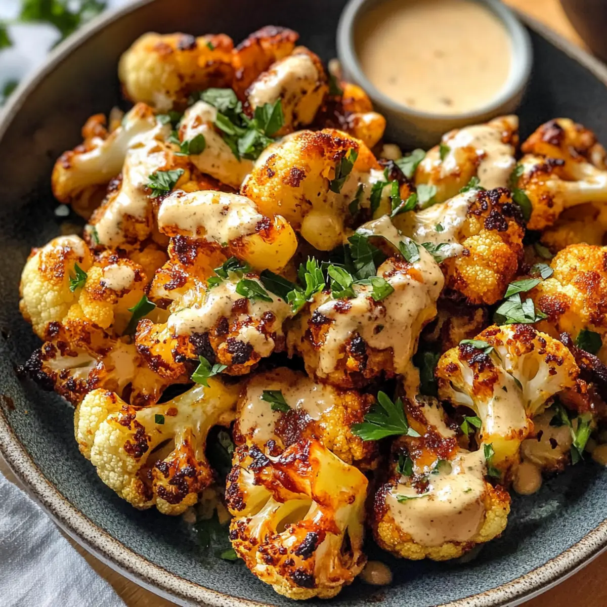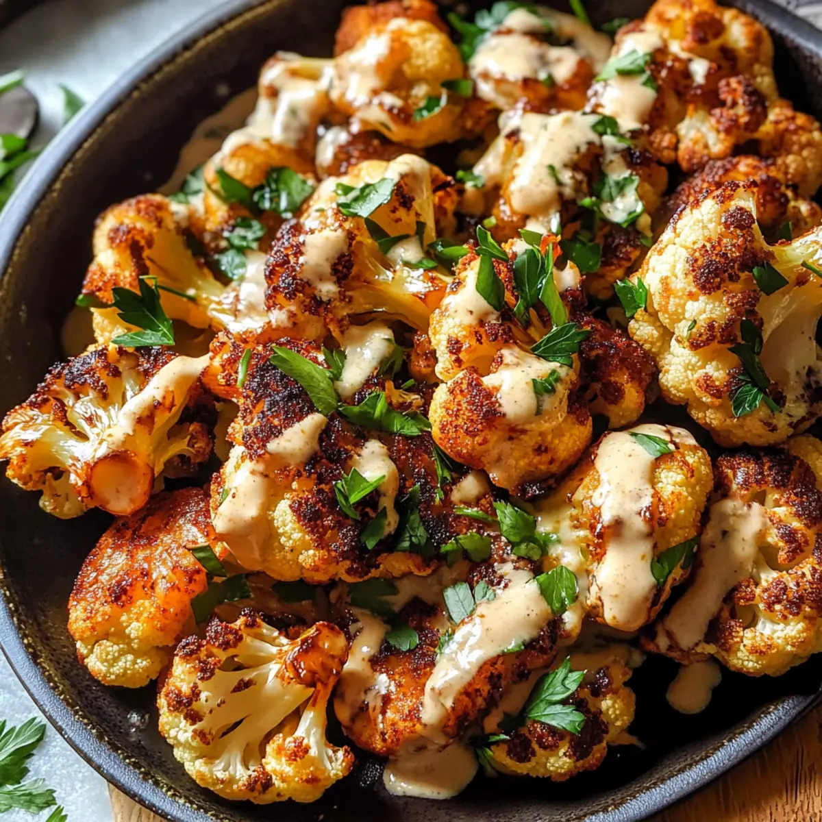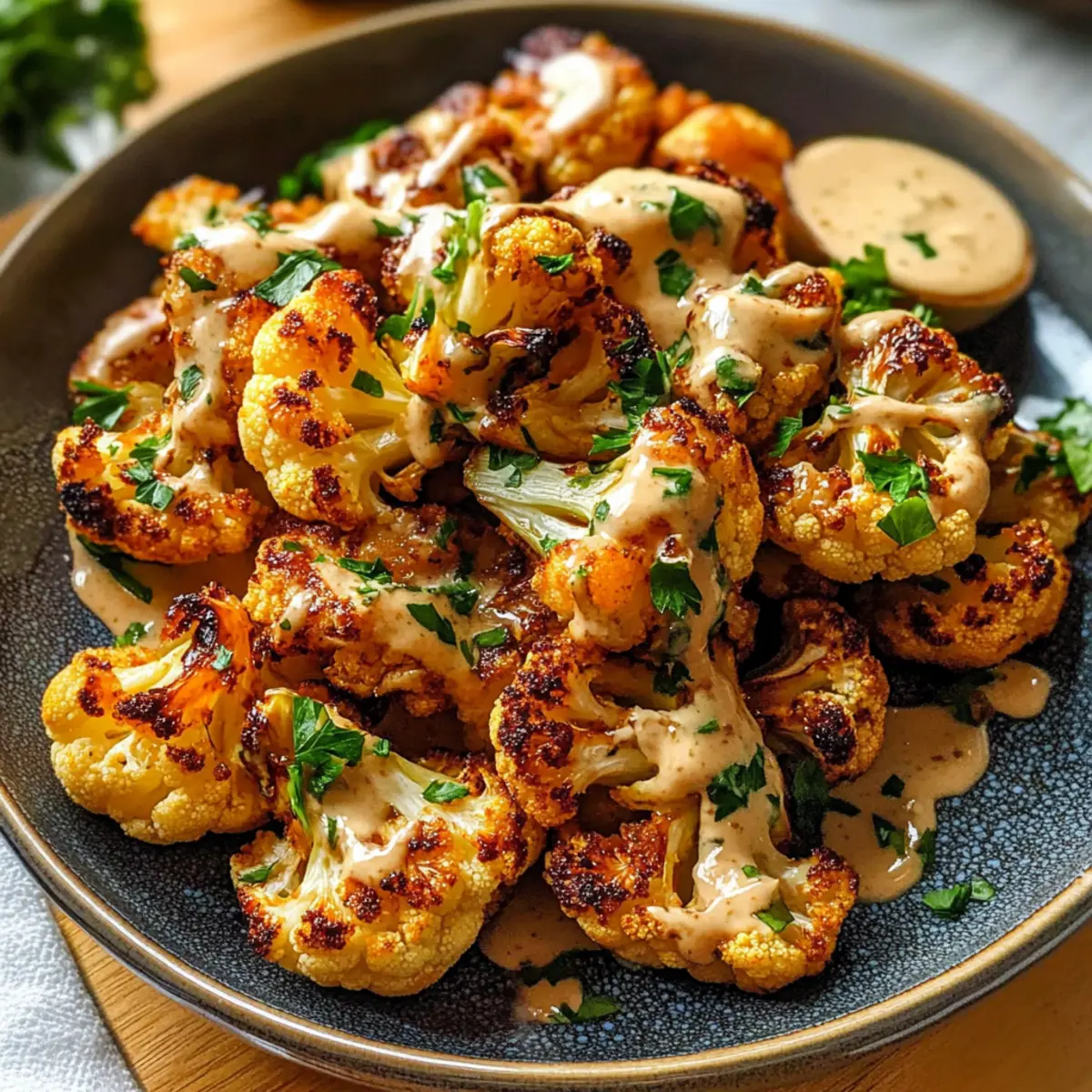6. Serviere den Blumenkohl mit der Tahini-Honig-Sauce und garniere mit Petersilie.