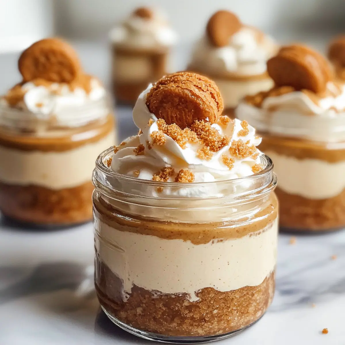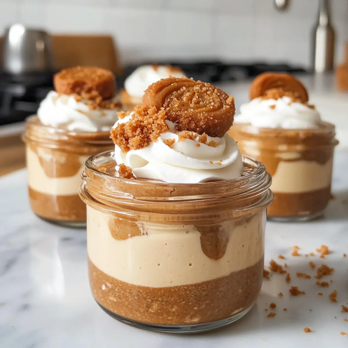6. Entferne die Förmchen, falls verwendet. Dekoriere mit Biscoff-Creme und zerbröselten Keksen und serviere.