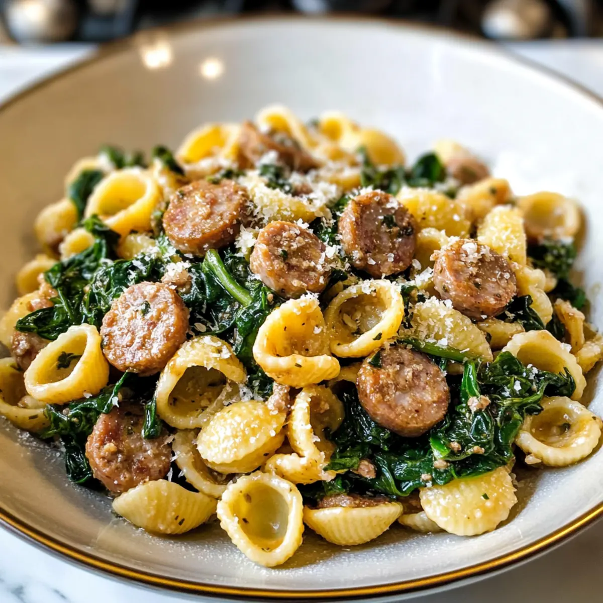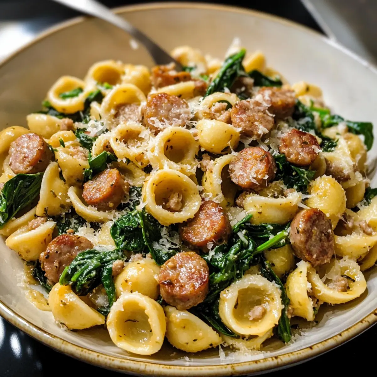 Eines Abends in meiner kleinen Küche, als der Hunger nach einer herzhaften Mahlzeit größer wurde, kam mir die Idee zu diesem schnellen Rezept: Orecchiette mit Wurst und Spinat. Diese köstliche italienische Pasta bringt nicht nur Lebendigkeit auf den Teller, sondern ist auch in etwa 30 Minuten zubereitet – perfekt für hektische Wochentage! Mit der Kombination aus würziger italienischer Wurst, frischem Spinat und einem reichen Weißweinsauce wird jede Biss zu einem kleinen Fest der Aromen. Ein weiterer Vorteil? Es ist ein zeitloses Comfort Food, das nicht nur mich, sondern auch meine Liebsten begeistert. Also, wer könnte da widerstehen? Lass uns gemeinsam in diese unkomplizierte italienische Köstlichkeit eintauchen!