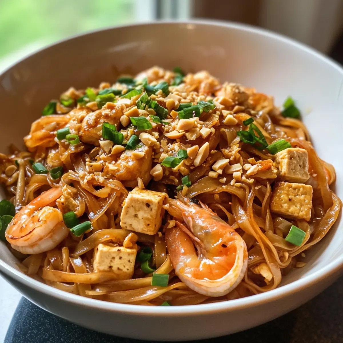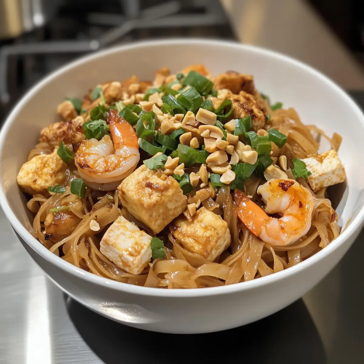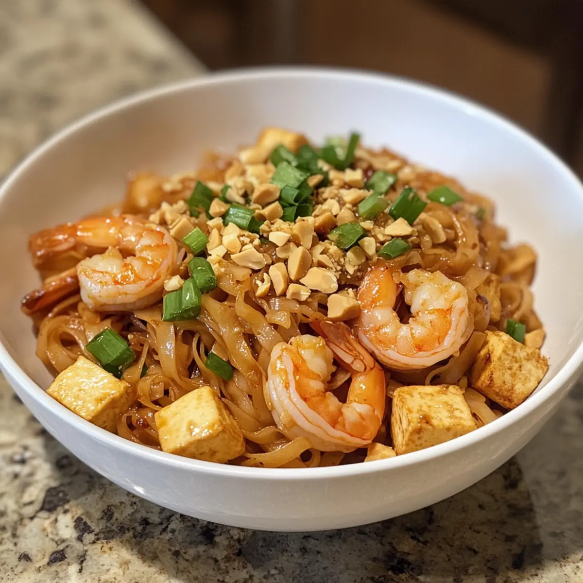 Die Aromen einer asiatischen Straße beleben meine Küche, während ich mich auf die Zubereitung meines Lieblingsgerichts vorbereite. Dieses Easy Pad Thai bringt alle Geschmäcker Thailands auf den Tisch – von der süßen und herzhaften Sauce bis hin zu den knackigen Erdnüssen, die jedem Bissen ein besonderes Flair verleihen. In nur 15 Minuten zaubern wir ein schnelles Rezept, das nicht nur in der Zubereitung ein Kinderspiel ist, sondern auch mit seinen flexiblen Proteinoptionen – sei es saftiges Hähnchen, zarte Garnelen oder cremiger Tofu – für jeden Geschmack passend ist. Perfekt für hektische Abende, wird dieses Pad Thai zu einem echten Genuss, der alle begeistern wird. Welche Proteinvariante wirst du wählen, um dein Pad Thai zu personalisieren? Warum dein Pad Thai lieben? Einfachheit, die begeistert: Die Zubereitung dieses Gerichts ist ein Kinderspiel und benötigt nur grundlegende Kochfähigkeiten. Vielseitig, wie du es magst: Wähle zwischen Hähnchen, Garnelen oder Tofu für dein perfektes Protein – du kannst die Zutaten ganz nach deinem Geschmack anpassen. Frisch, und aromatisch: Die Kombination aus wachsweich gekochten Nudeln, knackigen Erdnüssen und frischen Kräutern bringt das Urlaubsgefühl gleich zu dir nach Hause. Schnell, nur 15 Minuten: Ideal für hektische Wochentage, wenn du in Eile bist, aber trotzdem ein köstliches Dinner auf den Tisch bringen möchtest. Mach dein Essen mit diesem Rezept noch einfacher und entdecke auch unsere anderen schnellen Rezepte, die dir helfen, mehr Zeit mit deinen Lieben zu verbringen! Pad Thai Zutaten Für die Nudeln • Reisnudeln – Sie bilden die Grundlage des Gerichts und sorgen für eine perfekte Textur. Für die Sauce • Tamarindenkonzentrat – Essenziell für den authentischen Geschmack, der die Süße und Säure ausbalanciert. • Dunkle Sojasauce – Sie verleiht der Sauce eine tiefere Farbe und ein umami-reiches Aroma. • Fischsauce – Unverzichtbar für den authentischen Umami-Geschmack; kann durch Sojasauce für eine vegetarische Option ersetzt werden. • Brauner Zucker oder Palmsirup – Fügt eine angenehme Süße hinzu, die das Gericht wunderbar abrundet. Für das Gemüse • Frühlingszwiebeln – Sie bringen eine frische, aromatische Note; Chives können als Ersatz verwendet werden. • Schalotte – Sie sorgt für zusätzliche Geschmacksfülle; gelbe Zwiebel kann ebenfalls verwendet werden. • Knoblauch – Verstärkt die herzhafte Note des Gerichts; 2 Zehen, fein gehackt, genügen. • Bohnensprossen – Sie geben dem Gericht eine knackige Textur; alternativ kannst du auch mit geschnittenem Kohl arbeiten. Für das Protein • Hähnchenoberschenkel – Bietet eine herzliche Proteinquelle; kann durch Hähnchenbrust oder Tofu ersetzt werden. • Garnelen – Ein saftiges Meeresfrüchte-Element; du kannst auch mehr Hähnchen verwenden oder nur Tofu für die vegetarische Option. • Tofu – Bietet eine weitere vegetarische Proteinquelle und sorgt für eine angenehme Textur. Für das Kochen • Neutrales Öl (Raps- oder Pflanzenöl) – Das perfekte Fett für das Wok-Braten. • Eier – Fügen Reichtum hinzu und helfen, das Gericht zusammenzuhalten; können für eine vegane Version weggelassen werden. • Gehackte geröstete Erdnüsse – Sorgen für Knusprigkeit und nussigen Geschmack als Garnitur. Lass uns mit den frischen Zutaten und diesem köstlichen Rezept gleich loslegen! Schritt-für-Schritt-Anleitung für schnelles Pad Thai Schritt 1: Reisnudeln einweichen Weiche die Reisnudeln in warmem Wasser für etwa 5 Minuten ein, bis sie weich sind. Achte darauf, dass sie nicht zu matschig werden. Während die Nudeln einweichen, kannst du die anderen Zutaten vorbereiten, indem du das Gemüse und die Proteine bereitstellst. Schritt 2: Sauce herstellen Vermische das Tamarindenkonzentrat, den braunen Zucker, die dunkle Sojasauce und die Fischsauce in einer kleinen Schüssel, bis sich der Zucker vollständig aufgelöst hat. Diese Mischung bringt die aufregenden Aromen in dein schnelles Pad Thai und sorgt für die perfekte Balance zwischen süß und herzhaft. Schritt 3: Hähnchen anbraten Erhitze in einer großen Pfanne oder einem Wok bei mittelhoher Hitze einen Esslöffel neutrales Öl. Füge das Hähnchen hinzu und brate es für etwa 2-3 Minuten, bis es leicht gebräunt und durchgegart ist. Rühre ständig um, damit es gleichmäßig gart und nicht anhaftet. Schritt 4: Garnelen hinzufügen Gib die Garnelen in die Pfanne und sautiert sie für weitere 1-2 Minuten, bis sie eine rosa Farbe annehmen. Achte darauf, sie nicht zu lange zu kochen, da sie sonst zäh werden könnten. Rühre gut um, damit sie gleichmäßig gegart werden. Schritt 5: Tofu und Gemüse hinzufügen Füge den gewürfelten Tofu, die Schalotte und den Knoblauch zur Pfanne hinzu. Brate alles für zusätzlich 1-2 Minuten an, bis die Schalotten weich und der Knoblauch aromatisch ist. Diese Kombination wird dem Pad Thai zusätzliche Geschmacksnuancen verleihen. Schritt 6: Nudeln und Sauce einrühren Nimm die eingeweichten Reisnudeln aus dem Wasser und gib sie in die Pfanne. Gieße die vorbereitete Sauce über die Nudeln und schwenke alles gut durch. Brate die Mischung für 1-2 Minuten, bis die Nudeln die Sauce aufgenommen haben und gut erhitzt sind. Schritt 7: Eier hinzufügen Schiebe die Nudeln an den Rand der Pfanne und schlage die beiden Eier in die Mitte. Warte 30 Sekunden, damit sie etwas fest werden, und rühre sie dann schnell unter die Nudeln. Die Eier werden eine schöne Bindung für dein schnelles Pad Thai schaffen und ihm eine cremige Textur verleihen. Schritt 8: Bohnensprossen und Frühlingszwiebeln hinzufügen Stelle die Hitze auf hoch und füge die Bohnensprossen und die geschnittenen Frühlingszwiebeln hinzu. Brate alles für etwa 30 Sekunden unter ständigem Rühren an, bis das Gemüse knackig bleibt. Diese frischen Zutaten bringen Farbe und zusätzliche Frische in dein Gericht. Schritt 9: Anrichten und Garnieren Verteile das fertige 