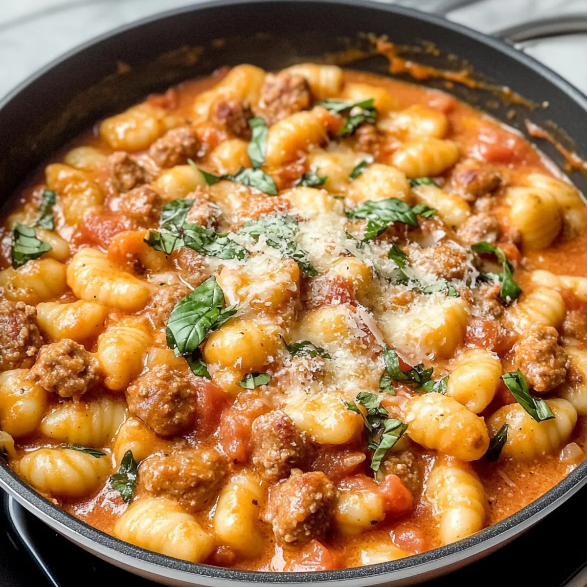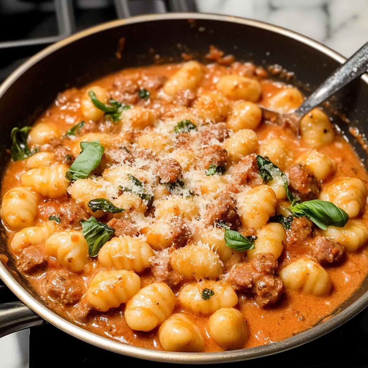 Als ich neulich in der Küche stand und den köstlichen Duft von italienischer Wurst verspürte, wusste ich, dass ein ganz spezielles Gericht ansteht: Pan cremige Gnocchi mit Wurst. Diese einfach zuzubereitende Mahlzeit vereint zarte, weiche Gnocchi mit würziger Wurst in einer reichhaltigen, cremigen Tomatensauce. In nur 30 Minuten zauberst du ein echtes Komfortessen, das nicht nur im Handumdrehen fertig ist, sondern auch garantiert alle am Tisch begeistert. Mit nur einem Topf ist es die perfekte Lösung für hektische Wochentage – weniger Geschirr, mehr Genuss! Bist du bereit, dieser klassischen italienischen Speise einen würzigen Twist zu verleihen? Warum wirst du dieses Rezept lieben? Einfachheit pur: Die Zubereitung der Pan cremigen Gnocchi mit Wurst ist kinderleicht, sodass auch Kochanfänger schnell beeindruckende Ergebnisse erzielen können. Reichhaltiger Geschmack: Die Kombination aus saftiger Wurst und cremiger Sauce sorgt für ein intensives Geschmackserlebnis und lässt Erinnerungen an italienische Trattorien aufleben. Perfekte Bequemlichkeit: In nur 30 Minuten hast du ein köstliches Gericht, das perfekt für stressige Wochentage geeignet ist. Vielseitig einsetzbar: Ob beim Familienessen oder als schnelle Lösung für unerwartete Gäste, dieses Rezept wird für Begeisterung sorgen. Gesundheitsbewusst: Du kannst die Wurst ganz einfach durch andere Proteine wie Hähnchen oder sogar pflanzliche Alternativen ersetzen, um das Gericht an deine Ernährungsbedürfnisse anzupassen. Wenn du nach mehr schnellen Rezepten suchst, die den perfekten Komfort bieten, schau dir auch meine anderen Gerichte an, die in kürzester Zeit zubereitet werden können! Pan cremige Gnocchi mit Wurst Zutaten Für die Sauce und Gnocchi Italienische Wurst – Sorgt für schmackhaftes Protein; verwende nach Belieben auch Brät oder Wurst aus der Hülle. Zwiebel – Fügt Süße und Tiefe hinzu; fein gehackt für gleichmäßiges Garen. Knoblauch – Verstärkt das Aroma, einfach fein hacken für schnellen Geschmack. Trockener Weißwein (z. B. Sauvignon Blanc) – Dient zum Ablöschen und bringt Säure; kann durch Hühnerbrühe ersetzt werden, wenn du den Alkohol vermeiden möchtest. Würfel von Tomaten (mit Saft) – Bildet die Basis der Sauce; greife zu einer hochwertigen Marke für besten Geschmack. Schlagsahne – Sorgt für eine cremige und reichhaltige Konsistenz; unerlässlich für die luxuriöse Textur. Rohe Kartoffel-Gnocchi – Kein Vorkochen nötig; sie werden während des Kochens weich und nehmen den Geschmack der Sauce auf. Frisch geriebener Parmesan – Bietet herzhaften Geschmack und Cremigkeit; frisch gerieben ist am besten zum Schmelzen. Frisches Basilikum – Gibt eine frische und aromatische Note; kann bei Bedarf durch getrocknetes Basilikum ersetzt werden. Salz & Pfeffer – Unentbehrliche Gewürze, um alle anderen Aromen zu heben. Genieße die köstlichen Pan cremigen Gnocchi mit Wurst, ein echtes Komfortessen, das nicht nur schnell zubereitet ist, sondern auch alle am Tisch begeistert! Schritt-für-Schritt-Anleitung für Pan cremige Gnocchi mit Wurst Schritt 1: Braten der Wurst und Zwiebel Erhitze eine große Pfanne bei mittlerer bis hoher Temperatur. Füge die italienische Wurst und die fein gehackte Zwiebel hinzu. Brate beides für 7–10 Minuten, bis die Wurst leicht gebräunt ist und die Zwiebel weich und transparent aussieht. Rühre gelegentlich um, damit alles gleichmäßig gegart wird. Schritt 2: Knoblauch hinzufügen Streue den gehackten Knoblauch in die Pfanne und brate ihn für etwa 30 Sekunden mit, bis er aromatisch ist. Achte darauf, dass der Knoblauch nicht verbrennt, da er sonst bitter schmeckt. Diese einfachen hinzugefügten Aromen sind entscheidend für die köstlichen Pan cremigen Gnocchi mit Wurst. Schritt 3: Ablöschen mit Wein Gieße den trockenen Weißwein in die Pfanne, um die Aromen abzulösen und die Bratsäfte zu nutzen. Lasse das Ganze für etwa eine Minute kochen, damit der Wein etwas reduziert und die Aromen intensiver werden können. Rühre gut um und achte darauf, dass die Hitze weiterhin hoch bleibt. Schritt 4: Sauce zubereiten Füge die gewürfelten Tomaten mit ihrem Saft, die Schlagsahne und die rohen Kartoffel-Gnocchi zur Pfanne hinzu. Rühre die Zutaten gut durch, bis alles gleichmäßig vermischt ist. Erhöhe die Hitze, bis die Mischung zum Kochen kommt und die Sauce zu blubbern beginnt – das schafft die Grundlage für deine Pan cremigen Gnocchi mit Wurst. Schritt 5: Simmern lassen Decke die Pfanne ab und reduziere die Hitze auf niedrige bis mittlere Stufe. Lasse die Mischung 5 Minuten lang sanft köcheln, damit die Gnocchi Geschmack aufnehmen können. Entferne den Deckel und rühre um, um sicherzustellen, dass die Gnocchi gleichmäßig garen. Koche weiter, bis sie zart sind und die Sauce eingedickt ist – dies dauert insgesamt einige Minuten. Schritt 6: Fertigstellen und Servieren Rühre den frisch geriebenen Parmesan und das frische Basilikum in die Sauce ein und schmecke sie mit Salz und Pfeffer ab. Sobald der Käse geschmolzen ist und die Sauce cremig ist, serviere die Pan cremigen Gnocchi mit Wurst sofort. Genieße sie warm, um das volle Aroma dieser köstlichen italienischen Speise zu erleben! Was passt zu Pan cremigen Gnocchi mit Wurst? Genieße eine köstliche Kombination, die den vollmundigen, cremigen Geschmack der Gnocchi ideal ergänzt und ein ganzheitliches Erlebnis schafft. Frischer Salat: Eine bunte Mischung aus Rucola, Kirschtomaten und Parmesan bringt Frische und einen knackigen Kontrast zur cremigen Sauce. Knoblauchbrot: Knuspriges, buttriges Brot ist perfekt, um die köstliche Sauce aufzusaugen und ergänzt den herzhaften Geschmack der Wurst. Geröstetes Gemüse: Zucchini und Paprika bringen eine süße, aromatische Note, die die Aromen der Gnocchi erweitert und zusätzliche Textur bietet. Weißwein: Ein Glas Sauvignon Blanc harmonisiert mit der Säure der Sauce und rundet das Gericht angenehm ab. Dessert: Serviere Tiramisu oder