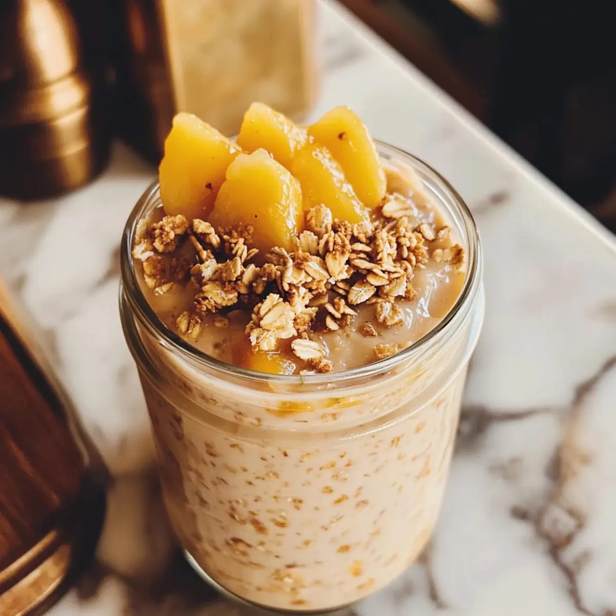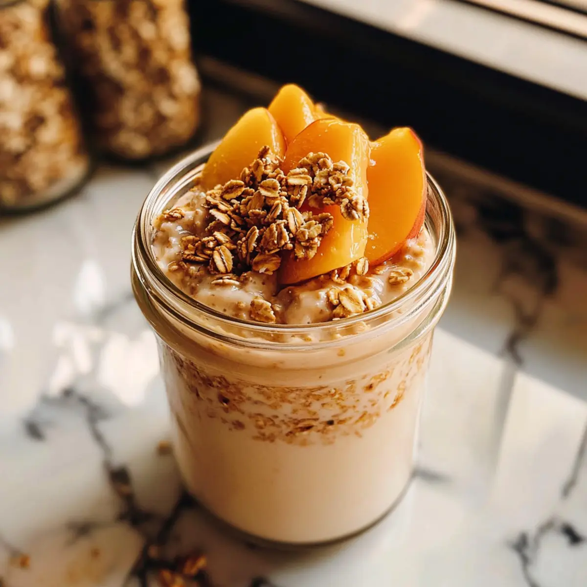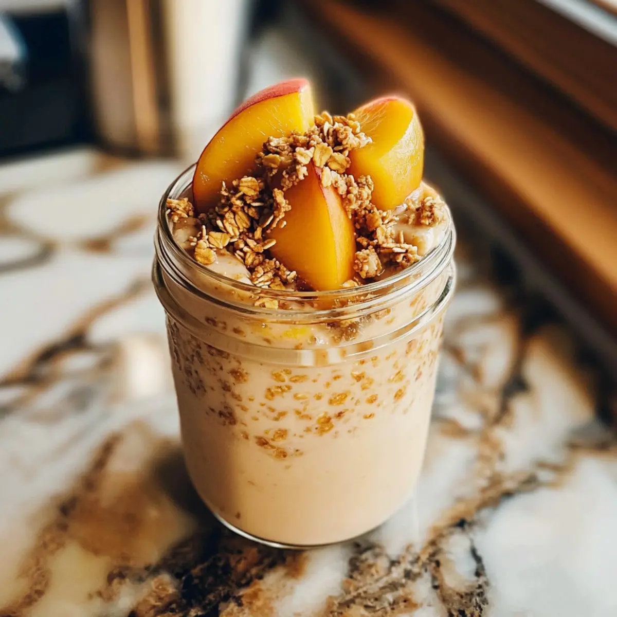 Die ersten Sonnenstrahlen durch das Fenster wecken sofort warme Erinnerungen an den Duft von frisch gebackenem Pfirsich-Cobbler. Mit meinem Rezept für Pfirsich-Cobbler-Übernacht-Haferflocken bringe ich dieses nostalgische Gefühl direkt auf den Frühstückstisch – und zwar kinderleicht! Diese cremigen, glutenfreien Haferflocken sind nicht nur eine gesunde Option, sondern brauchen auch keine Kochzeit – perfekt für hektische Morgen. Außerdem sind sie voller gesunder Zutaten, die dir den nötigen Energieschub für den Tag geben. Stelle dir vor, du öffnest den Kühlschrank und findest ein Frühstück, das wie ein Leckerbissen schmeckt und dich gleichzeitig sättigt. Neugierig, wie du dieses einfache und köstliche Rezept zubereiten kannst? Lass uns loslegen! Warum du dieses Rezept lieben wirst Einfachheit: Der Vorgang ist kinderleicht und erfordert keine Kochkünste – perfekt für alle, die es morgens eilig haben. Wundervoller Geschmack: Die Kombination aus frischen Pfirsichen, Zimt und Vanille bringt ein Gefühl von frisch gebackenem Kuchen auf den Frühstückstisch. Gesunde Wahl: Diese Haferflocken sind reich an Ballaststoffen und Proteinen, ideal für einen energiereichen Start in den Tag. Vielfalt: Du kannst die Pfirsiche ganz einfach durch andere Früchte wie Erdbeeren ersetzen, um neue Geschmackserlebnisse zu kreieren! Vorratsfreundlich: Bereite sie im Voraus vor, sie halten bis zu drei Tage im Kühlschrank und sind immer bereit, wenn der Hunger kommt. Crowd-Pleaser: Diese pfirsichhaltigen Übernacht-Haferflocken werden sicherlich bei deiner Familie oder Freunden für Begeisterung sorgen – ein echtes Frühstücksvergnügen! Pfirsich-Cobbler-Übernacht-Haferflocken-Zutaten • Bereite dich auf ein köstliches Frühstück vor! Für die Haferflocken Rolled Oats – Bieten die Grundlage und Struktur für dein Frühstück. Substitution: Nutze schnelle Haferflocken für ein schnelleres Einweichen, die Textur kann jedoch variieren. Milch – Sorgt für Cremigkeit (es gibt sowohl Milch- als auch pflanzliche Optionen). Substitution: Mandel-, Hafer- oder Kokosmilch eignen sich bestens für eine milchfreie Version. Frischer Pfirsich – Bringt natürliche Süße und einen saftigen Geschmack. Substitution: Gefrorene oder abgetropfte Dosenpfirsiche können verwendet werden, wenn frische Pfirsiche nicht verfügbar sind. Chia-Samen – Verdicken die Haferflocken und fügen Ballaststoffe hinzu. Substitution: Leinsamen können ebenfalls verwendet werden; reduziere die Milchmenge leicht. Vanilleextrakt – Verbessert den Geschmack. Tipp: Verwende reine Vanille für die besten Ergebnisse. Zimt – Fügt Wärme und Gewürz hinzu. Keine Substitution empfohlen, aber nach Geschmack anpassen. Ahornsirup oder Honig – Sorgt für Süße. Substitution: Agavendicksaft kann als vegane Option verwendet werden. Für das Topping Granola oder zerstoßene Nüsse – Fügen Crunch hinzu. Variation: Zerbröselte Graham-Cracker oder geröstete Mandeln geben unterschiedliche Texturen. Honig (optional) – Für zusätzliche Süße, falls gewünscht. Optional, je nach Vorliebe. Diese Pfirsich-Cobbler-Übernacht-Haferflocken sind eine gesunde und köstliche Möglichkeit, deinen Morgen zu beginnen – also leg los und genieße sie! Schritt-für-Schritt-Anleitung für Pfirsich-Cobbler-Übernacht-Haferflocken Step 1: Pfirsich vorbereiten Schneide ½ eines frischen Pfirsichs in kleine Stücke. Achte darauf, die Schale zu belassen, da sie zusätzliches Aroma und Farbe verleiht. Lege die geschnittenen Pfirsichstücke beiseite. Diese saftigen Stücke werden gleich in die Mischung für die Pfirsich-Cobbler-Übernacht-Haferflocken integriert. Step 2: Mischung herstellen In einem Einmachglas oder einer Schüssel kombinierst du die Haferflocken, die Milch, die Chia-Samen, den Vanilleextrakt, den Zimt und den Ahornsirup. Rühre die Zutaten gründlich mit einem Löffel um, bis sie gut vermischt sind und die Haferflocken gleichmäßig die Flüssigkeit aufnehmen. Dies sorgt dafür, dass du am nächsten Morgen eine wunderbar cremige Konsistenz erhältst. Step 3: Pfirsich hinzufügen und kühlen Füge die zuvor geschnittenen Pfirsichstücke zur Haferflocken-Mischung hinzu und rühre erneut gut um, damit die Stücke gleichmäßig verteilt sind. Decke das Glas mit einem Deckel oder Frischhaltefolie ab und stelle es für mindestens 4 Stunden oder über Nacht in den Kühlschrank. Dadurch können die Haferflocken die Flüssigkeit vollständig aufnehmen und sich entfalten. Step 4: Morgens umrühren Am nächsten Morgen nimm das Glas aus dem Kühlschrank und öffne es vorsichtig. Rühre die Haferflocken gut um und überprüfe die Konsistenz. Wenn sie dir zu dick erscheinen, füge etwas mehr Milch hinzu, um sie cremiger zu machen. Nun sind deine Pfirsich-Cobbler-Übernacht-Haferflocken bereit zum Servieren! Step 5: Topping hinzufügen und genießen Toppe die Haferflocken mit Granola oder zerstoßenen Nüssen für einen extra Crunch. Wenn du möchtest, kannst du auch einen kleinen Schuss Honig darüber träufeln, um die Süße zu intensivieren. Serviere deine Pfirsich-Cobbler-Übernacht-Haferflocken in einem hübschen Glas oder einer Schüssel und genieße ein gesundes und köstliches Frühstück! Pfirsich-Cobbler-Übernacht-Haferflocken Variationen Lass deiner Kreativität freien Lauf und passe das Rezept ganz nach deinem Geschmack an! Fruchtige Alternativen: Ersetze frische Pfirsiche durch Beeren wie Erdbeeren oder Heidelbeeren für eine überraschende Note. Diese Früchte verleihen dem Gericht zusätzliche Säure und erfrischenden Geschmack. Nussige Note: Füge eine Handvoll gehackte Walnüsse oder Pekannüsse für mehr Textur und gesunde Fette hinzu. Der knusprige Biss wird deine Geschmacksknospen erfreuen! Gewürz-Upgrade: Probiere statt Zimt auch Muskatnuss oder Ingwerpulver aus, um eine interessante Geschmacksdimension hinzuzufügen. Ein Hauch von Gewürzen kann das Aroma wunderbar verstärken. Kokos-Träumerei: Ersetze die Milch d