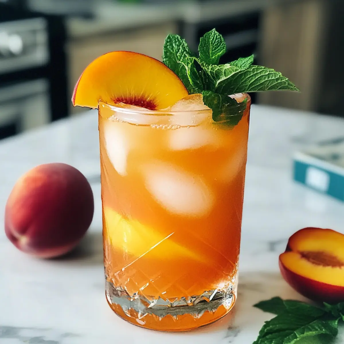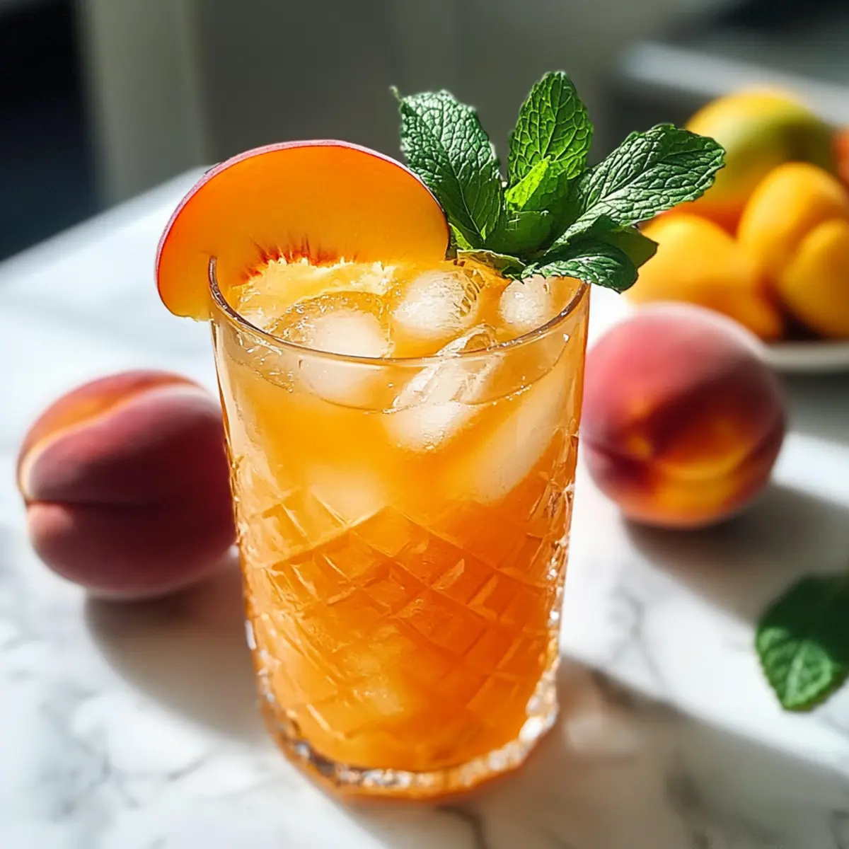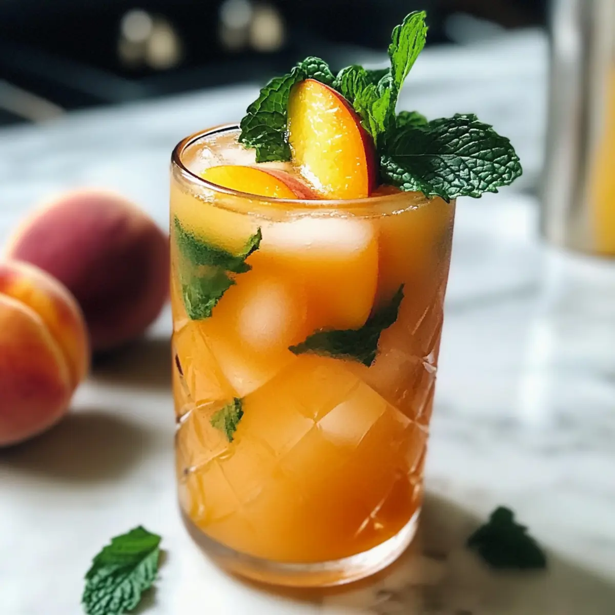 5. Garnieren mit frischen Minzblättern und Pfirsichscheiben.