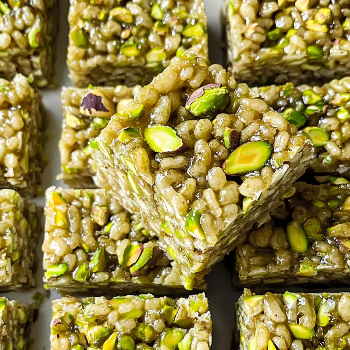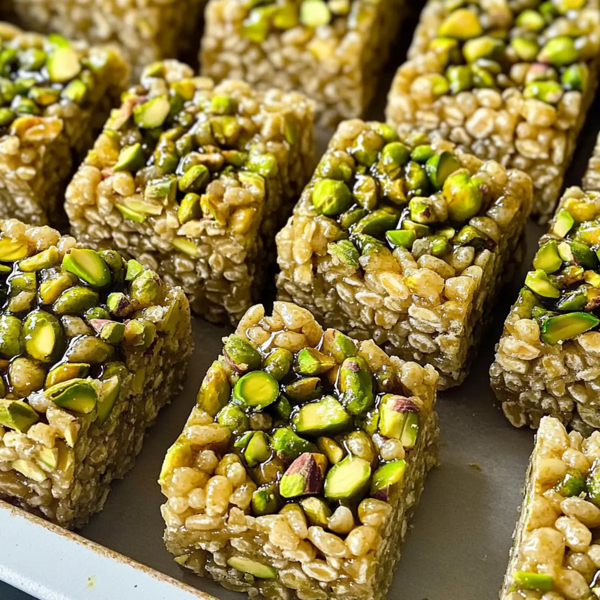 Als ich letztens auf der Suche nach einem Snack war, der sowohl nostalgisch als auch einzigartig ist, stieß ich auf die perfekten Pistazien-Reis-Krispie-Leckereien. Diese köstliche Variante bringt den klassischen Genuss mit einer reichhaltigen Pistaziennote auf ein neues Level. Ohne Marshmallows, sondern mit einer cremigen Mischung aus Pistazienbutter, Tahini und Honig, entsteht eine unwiderstehliche Bindung der Zutaten. Ein großer Vorteil? Diese Leckereien sind nicht nur glutenfrei und schnell zubereitet, sondern bringen auch gesunde Fette auf den Teller. Sie sind ideal für alle, die sich nach einer schmackhaften und nahrhaften Alternative zu herkömmlichen Snacks sehnen. Neugierig, wie einfach es ist, diese süßen Köstlichkeiten selbst zu machen? Lassen Sie uns gemeinsam in das Rezept eintauchen! Warum sind Pistazien-Reis-Krispie-Leckereien großartig? Einzigartiger Geschmack: Diese Leckereien bringen mit ihrem nussigen Pistazienaroma einen ganz neuen Twist in Ihre Snackroutine. Gesunde Zutaten: Statt Marshmallows verwenden wir gesunde Fette wie Pistazienbutter und Tahini, was sie zu einer nahrhaften Wahl macht. Schnell und einfach: Ohne Ofen zubereitet sind sie perfekt für jede Gelegenheit, besonders wenn die Zeit knapp ist. Glutenfrei: Ideal für alle, die glutenfreie Optionen suchen, ohne auf Genuss zu verzichten. Vielseitig: Experimentieren Sie mit verschiedenen Nüssen oder Aromen für noch mehr Abwechslung. Neugierig auf weitere schmackhafte Rezepte? Probieren Sie auch unsere Cremige Rinder Nudeln oder Zartes Rinderbraten Mit! Pistazien-Reis-Krispie-Leckereien Zutaten • Stellen Sie sich vor, wie einfach und schnell diese köstlichen Snacks zubereitet werden können – hier sind die Zutaten, die Sie benötigen! Für die Basis Reisflocken – Sie sorgen für die Struktur und den Crunch; suchen Sie nach glutenfreien Optionen, wenn nötig. Gehackte Pistazien – Sie fügen eine wunderbare Textur und den vollen Pistaziengeschmack hinzu; verwenden Sie rohe, ungesalzene Pistazien für die besten Ergebnisse. Pistazienbutter – Diese cremige, nussige Zutat bindet alles zusammen; selbstgemacht wird empfohlen für den optimalen Geschmack. Tahini – Sie sorgt für zusätzliche Cremigkeit und einen weiteren Hauch von Nussgeschmack; kann durch Mandelbutter ersetzt werden, falls gewünscht. Honig – Dieser natürliche Süßstoff bindet die Zutaten und sorgt für Süße; verwenden Sie Agavensirup für eine vegane Option. Vanilleextrakt – Er hebt den Gesamteindruck des Geschmacks; verwenden Sie reinen Vanilleextrakt für die besten Ergebnisse. Salz – Ein kleiner Hauch balanciert die Süße aus; eine Prise reicht aus. Diese Pistazien-Reis-Krispie-Leckereien sind nicht nur einfach zuzubereiten, sondern auch eine gesunde und leckere Wahl, die jeden Snackmoment verschönern wird! Schritt-für-Schritt-Anleitung für Pistazien-Reis-Krispie-Leckereien Step 1: Backform vorbereiten Legen Sie eine 9×9 Zoll große Backform mit Backpapier aus. Achten Sie darauf, dass das Papier an den Rändern übersteht, damit Sie die Leckereien später einfach herausheben können. Dies ist der erste Schritt, um sicherzustellen, dass Ihre Pistazien-Reis-Krispie-Leckereien nicht an der Form kleben bleiben. Step 2: Zutaten mischen In einer großen Schüssel die Reisflocken und die gehackten Pistazien gut vermengen. Nehmen Sie sich Zeit, um sicherzustellen, dass alles gleichmäßig verteilt ist, da dies der Crunch-Faktor Ihrer leckeren Snacks ist. Stellen Sie die Mischung beiseite, während Sie die cremige Bindung vorbereiten. Step 3: Cremige Mischung zubereiten In einem kleinen Topf Honig, Tahini, Pistazienbutter, Vanilleextrakt und eine Prise Salz zusammengeben. Erhitzen Sie alles bei niedriger Temperatur, bis es warm und leicht blubbert – etwa 5 Minuten. Rühren Sie kontinuierlich, um eine klumpenfreie und glänzende Mischung zu erhalten, die Ihre Pistazien-Reis-Krispie-Leckereien lecker bindet. Step 4: Zutaten kombinieren Gießen Sie die warme, cremige Mischung vorsichtig über die Reisflocken und Pistazien in der Schüssel. Falten Sie alles sanft mit einem Spatel, sodass sich die trockenen Zutaten gleichmäßig mit der feuchten Mischung verbinden. Sehen Sie, wie alles zusammenkommt – bald haben Sie eine köstliche, klebrige Masse! Step 5: In die Form drücken Verteilen Sie die Mischung gleichmäßig in der vorbereiteten Backform. Verwenden Sie eine Messbecher oder ein Glas mit flachem Boden, um die Mischung fest in die Ecken zu drücken und gut zu komprimieren. Dies stellt sicher, dass Ihre Pistazien-Reis-Krispie-Leckereien nach dem Kühlen ihre Form behalten und eine angenehme Konsistenz haben. Step 6: Dekorieren und Kühlen Bestreuen Sie die Oberfläche mit zusätzlichen gehackten Pistazien für zusätzlichen Crunch und eine ansprechende Optik. Decken Sie die Form mit Frischhaltefolie ab und stellen Sie sie in den Gefrierschrank. Lassen Sie die Leckereien mindestens 1 Stunde fest werden, damit Sie sie anschließend mühelos in Stücke schneiden können. Step 7: Servieren und genießen Nach dem Kühlen nehmen Sie die Pistazien-Reis-Krispie-Leckereien aus der Form. Heben Sie das Backpapier hoch und schneiden Sie die Leckereien in beliebig große Stücke. Servieren Sie sie als schmackhaften Snack oder süße Belohnung und erfreuen Sie sich an dem nussigen Aroma und Geschmack, die diese besonderen Leckereien auszeichnen! Was passt zu Pistazien-Reis-Krispie-Leckereien? Diese köstlichen Snacks sind perfekt, um ein harmonisches und genussvolles Erlebnis zu schaffen. Kräutertee: Ein warmer Kräutertee ergänzt die nussigen Aromen und sorgt für ein entspannendes Gefühl. Ideal für eine beruhigende Auszeit. Dunkle Schokolade: Der herbe Geschmack von dunkler Schokolade harmoniert wunderbar mit der Süße der Leckereien und bringt eine angenehme Balance. Frische Früchte: Servieren Sie sie mit saftigen Beeren oder geschnittenen Äpfeln, um frische, fruchtige Noten zu setzen und zusätzliche Vitamine zu gen