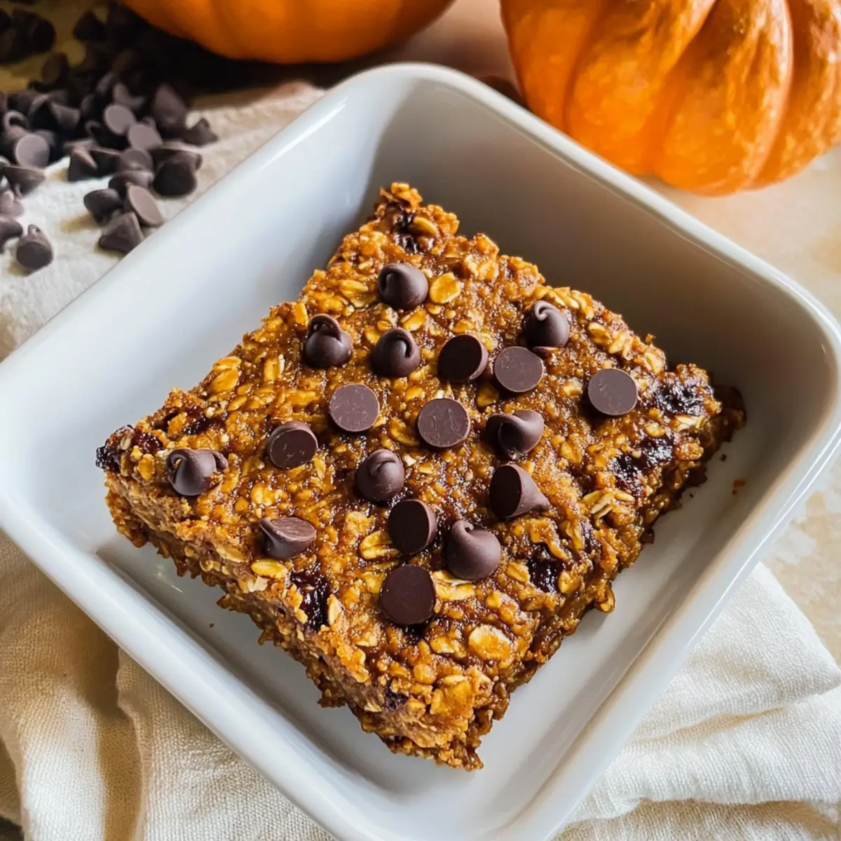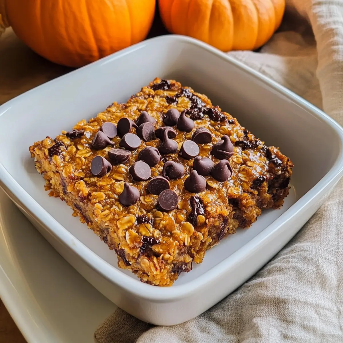 Ein knisterndes Geräusch durchbrach die Stille in meiner Küche, als ich die Schüssel mit den Zutaten für mein höheres Protein-Kürbis-Baked Oatmeal umrührte. Diese köstliche Mischung aus glutenfreien Haferflocken, cremigem Kürbispüree und schokoladigen Überraschungen wird nicht nur schnell zubereitet, sondern versorgt dich auch mit der Energie, die du für einen tollen Tag brauchst. Mit der richtigen Balance aus Ballaststoffen und Proteinen ist dieser gesunde Frühstücksgenuss genau das Richtige, um den Tag nachhaltig zu starten und den Hunger bis zur nächsten Mahlzeit zu stillen. Neugierig, wie man in nur wenigen Schritten dieses wohltuende Frühstück zaubert? Lass uns gemeinsam eintauchen! Warum wirst du dieses Rezept lieben? Einfachheit: Die Zubereitung ist kinderleicht und benötigt keine speziellen Kochkünste. Reichhaltiger Geschmack: Die Kombination aus Kürbispüree und Schokolade sorgt für einen köstlichen Genuss, der deine Geschmacksknospen verwöhnt. Hoher Proteingehalt: Mit 12 Gramm Protein pro Portion ist dieses Frühstück ideal für einen energiereichen Start in den Tag. Vielseitigkeit: Variiere nach Belieben mit Nüssen oder Trockenfrüchten für zusätzliche Textur und Aromen – ganz nach deinem Geschmack! Zeitersparnis: In nur 35–45 Minuten aus dem Ofen fertig, perfekt für hektische Morgen. Genieße dazu einen Löffel griechischen Joghurt und einen Schuss Ahornsirup – so wird dein Frühstück noch leckerer! Und wenn du nach weiteren gesunden Ideen suchst, schau dir auch unseren Bunter Gemuese Hack oder die Zitronen Huehnchen Suppe an! Zutaten für das proteinreiche Kürbis-Baked Oatmeal Für die Basis • Haferflocken – liefern die Struktur und Ballaststoffe; du kannst glutenfreie Varianten verwenden. • Proteinpulver – gibt einen Proteinschub (12 Gramm pro Portion); kann durch ungeschmackliches Protein ersetzt werden. • Hanfherzen – bieten gesunde Fette und zusätzliches Protein; ersetzbar durch gemahlene Leinsamen. Für die Würze • Kürbiskuchengewürz – verleiht den herbstlichen Geschmack; alternativ kannst du Zimt, Muskatnuss und Ingwer mischen. • Zimt – steigert die Wärme und Tiefe des Geschmacks. • Backpulver – sorgt für eine fluffige Konsistenz. • Salz – balanciert die Süße und hebt die Aromen hervor. Für die Süße und Feuchtigkeit • Banane – sorgt für natürliche Süße und Feuchtigkeit. • Kürbispüree – der Hauptgeschmacksträger, der Feuchtigkeit und Reichhaltigkeit bietet; greife auf die Konserve zurück, um Zeit zu sparen. • Eier – binden die Zutaten und fügen Protein hinzu. • Milch – sorgt für Feuchtigkeit, kann durch pflanzliche Milch ersetzt werden. • Ahornsirup – natürliches Süßungsmittel, das perfekt mit Kürbis harmoniert; kann durch Honig oder Agavensirup ersetzt werden. • Vanilleextrakt – verbessert den Gesamtgeschmack. Für den Genuss • Zartbitter-Schokoladenstückchen – fügen Süße und Reichhaltigkeit hinzu; optional für mehr Genuss vor dem Backen. Mit diesen Zutaten kannst du dein besseres proteinreiches Kürbis-Baked Oatmeal zaubern und dich auf einen köstlichen, gesunden Start in den Tag freuen! Step-by-Step Instructions for Proteinreicher Kürbis-Baked Oatmeal mit Schokolade Step 1: Ofen vorheizen und Backform vorbereiten Heize den Ofen auf 175°C vor und bereite eine 20×20 cm oder 23×33 cm große Backform vor, indem du sie einfettest oder mit Backpapier auslegst. Dies verhindert, dass das Kürbis-Baked Oatmeal anhaftet und sorgt dafür, dass es gleichmäßig backt. Step 2: Trockene Zutaten vermengen In einer großen Schüssel kombinierst du die Haferflocken, das Proteinpulver, die Hanfherzen, das Backpulver, das Kürbiskuchengewürz, den Zimt und das Salz. Rühre alles gut um, damit sich die Zutaten gleichmäßig verteilen und die Basis für dein köstliches Frühstück bilden. Step 3: Feuchte Zutaten mischen In einer separaten Schüssel zerdrückst du die Banane und fügst das Kürbispüree, die Eier, die Milch, den Ahornsirup und den Vanilleextrakt hinzu. Schlage die Mischung mit einem Schneebesen gut durch, bis sie cremig ist und alle Zutaten gut miteinander verbunden sind. Step 4: Trockene und feuchte Zutaten kombinieren Gieße die feuchte Mischung in die Schüssel mit den trockenen Zutaten und rühre sanft um, bis alles gerade so verbunden ist. Achte darauf, nicht zu übermixen, damit das Kürbis-Baked Oatmeal die richtige Konsistenz behält. Falte dann die Zartbitter-Schokoladenstückchen vorsichtig unter. Step 5: In die Backform geben Gieße die Mischung in die vorbereitete Backform und streiche die Oberfläche glatt. Wenn gewünscht, kannst du weitere Schokoladenstückchen darauf streuen, um einen Extra-Genuss zu bieten. Bereite dich auf den köstlichen Duft vor, der deinen Raum erfüllen wird, während es bäckt. Step 6: Backen und prüfen Backe das Kürbis-Baked Oatmeal für 35-45 Minuten im vorgeheizten Ofen. Achte darauf, dass die Ränder goldbraun sind und die Mitte fest ist, aber sich noch leicht wackelig anfühlt. Dies sorgt für die perfekte Textur und verhindert, dass es zu trocken wird. Step 7: Abkühlen und servieren Lass das gebackene Oatmeal etwas abkühlen, bevor du es in Stücke schneidest. Serviere es optional mit einem Löffel griechischem Joghurt, einem Spritzer Kürbiskuchengewürz und einem weiteren Schuss Ahornsirup für den extra Genuss. Genieße dein gesundes Frühstück! Was passt zu proteinreiches Kürbis-Baked Oatmeal mit Schokolade? Genieße eine köstliche Kombination, die dein Frühstück perfekt abrundet und den Gaumen begeistert. Griechischer Joghurt: Seine Cremigkeit ergänzt das Baked Oatmeal ideal und fügt zusätzliches Protein hinzu. Ein Löffel in der Mitte sorgt für einen frischen Kontrast zu den süßen Aromen. Frisches Obst: Schneide Äpfel oder Birnen in Scheiben und serviere sie dazu. Die knackige Frische und natürliche Süße bringen eine wunderbare Balance zu den warmen Gewürzen des Baked Oatmeals