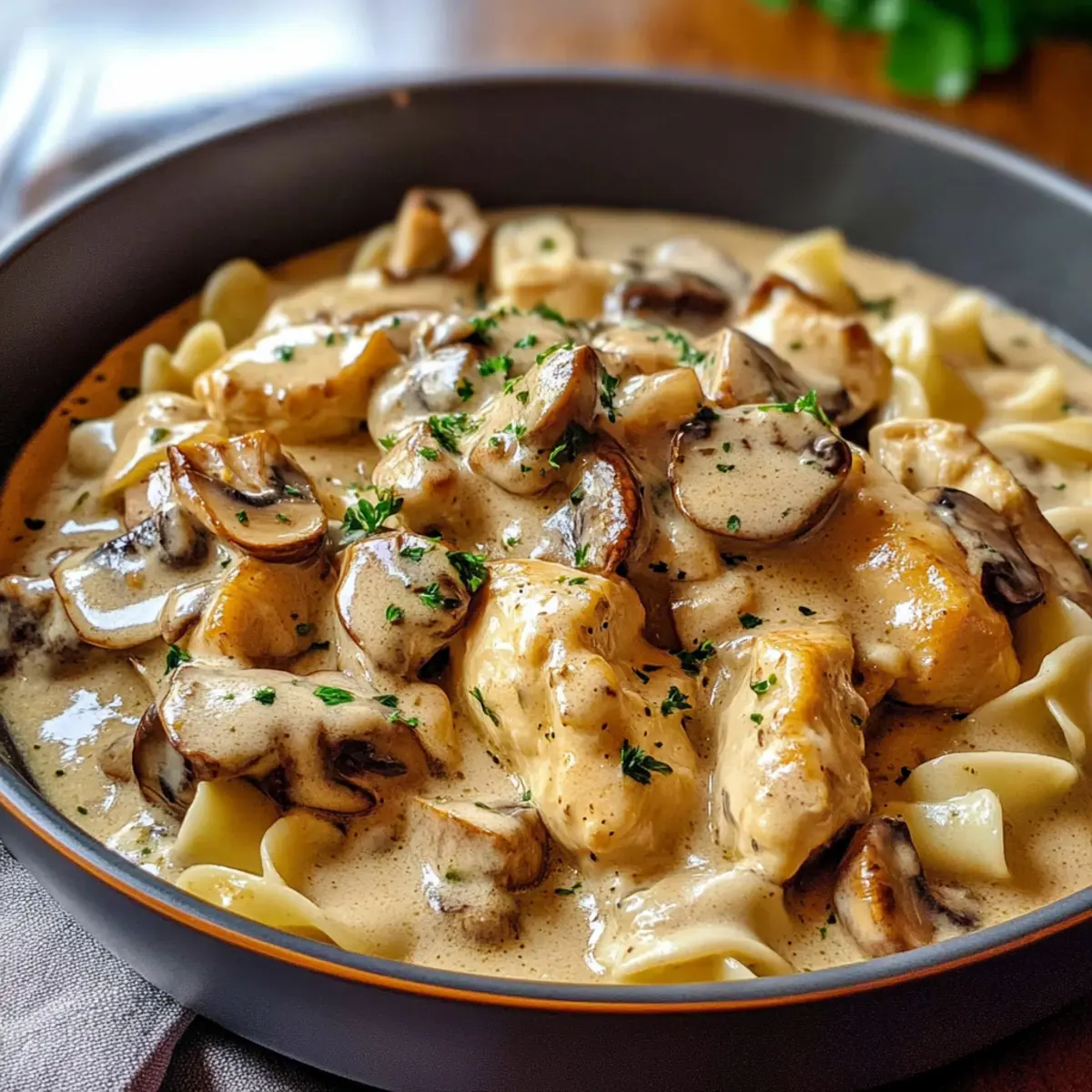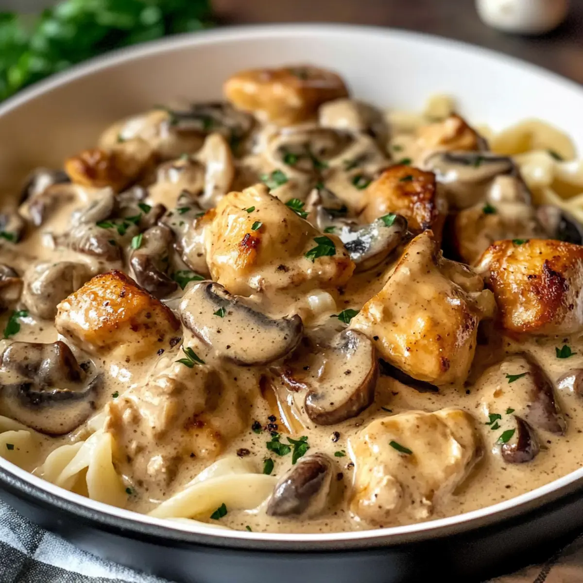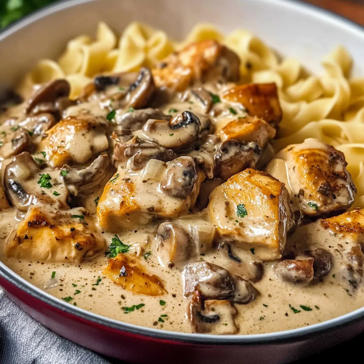 Hast du schon einmal den unwiderstehlichen Duft eines herzhaften Gerichts in der Küche verspürt, während du auf das perfekte Abendessen wartest? Genau so fühlt es sich an, wenn man den Reiche Hähnchen Stroganoff zubereitet. Dieses Gericht ist mehr als nur ein schnelles Rezept; es vereint zarte Hühnchenstücke und aromatische Pilze in einer cremigen Sauce, die einfach zu lieben ist. In nur 30 Minuten steht ein köstliches, ein-Pfannen-Mahl auf dem Tisch – ideal für hektische Wochentage. Es ist nicht nur ein Comfort Food, das die ganze Familie begeistert, sondern auch eine flexible Basis, die Raum für verschiedene Zutaten bietet. Also, bist du bereit, deine Liebsten mit diesem einfachen Küchenzauber zu überraschen? Warum solltest du Hähnchen Stroganoff lieben? Schnelligkeit: Diese köstliche Mahlzeit ist in nur 30 Minuten fertig, perfekt für hektische Wochentage. Ein-Pfannen-Mahl: Minimaler Aufwand bei der Zubereitung und Reinigung – weniger Geschirr, mehr Genuss! Herzhaft und beruhigend: Die Kombination aus zartem Hähnchen und reichhaltiger Pilzcremesauce wird dich umhauen. Vielseitigkeit: Ob mit Reis oder Nudeln, du kannst nach Belieben variieren; sogar Gemüse wie Zucchini oder Brokkoli passen hervorragend dazu. Wenn du nach weiteren einfachen Rezepten suchst, schau dir auch unseren Gurkensalat Feta Kichererbsen oder Pasta mit Spargel an! Reiche Hähnchen Stroganoff Zutaten • Ein köstliches Gericht, das du lieben wirst! Für das Hähnchen Hähnchenbrust – Hauptproteinquelle; du kannst auch Hähnchenschenkel verwenden, um mehr Zartheit zu erzielen. Knoblauchpulver – Verleiht einen herzhaften Geschmack; frisch gehackter Knoblauch kann für eine intensivere Note verwendet werden. Salz & Pfeffer – Verstärkt alle Aromen; je nach Geschmack anpassen. Mehl – Um das Hähnchen zu beschichten und eine goldene Kruste zu schaffen; glutenfreies Mehl ist eine gute Alternative. Für die Sauce Olivenöl – Zum Braten des Hähnchens; je nach Pfannentrocknung anpassen. Butter – Verleiht der Sauce Reichhaltigkeit; pflanzliche Margarine ist eine gute Substitute für eine milchfreie Option. Cremini-Pilze – Bieten einen erdigen Geschmack; auch Champignons oder eine Mischung sind möglich. Zwiebel – Bereichert den Geschmack mit Süße; Schalotten können für einen milderen Geschmack verwendet werden. Für das Würzen Dijon-Senf – Fügt der Sauce Würze hinzu; optional, je nach persönlicher Vorliebe. Worcestershire-Sauce – Vertieft den Umami-Geschmack; Sojasauce ist eine glutenfreie Alternative. Hühnerbrühe – Fügt notwendige Flüssigkeit hinzu; Gemüsebrühe für eine leichtere Version verwenden. Schmand – Sorgt für eine cremige Sauce und reichert den Geschmack an; griechischer Joghurt ist eine gesunde Alternative. Schritt-für-Schritt-Anleitung für Reiche Hähnchen Stroganoff Step 1: Hähnchen vorbereiten Schneide die Hähnchenbrust in 2,5 cm große Stücke und würze sie mit Knoblauchpulver, Salz und Pfeffer. Wälze das Hähnchen in Mehl, sodass es gleichmäßig bedeckt ist. Dies sorgt für eine schöne goldene Kruste beim Braten und hilft, die Aromen im Reiche Hähnchen Stroganoff zu intensivieren. Step 2: Hähnchen anbraten Erhitze Olivenöl in einer großen Pfanne bei mittelhoher Hitze. Brate das Hähnchen in Chargen für etwa 3-5 Minuten pro Seite an, bis es goldbraun und durchgegart ist (mindestens 75°C Innentemperatur). Nimm das Hähnchen aus der Pfanne und stelle es beiseite, während du mit der Sauce fortfährst. Step 3: Gemüse anbraten Reduziere die Hitze auf mittlere Stufe und füge Butter und etwas Olivenöl in die Pfanne hinzu. Gib die geschnittenen Cremini-Pilze und Zwiebeln hinein und brate sie für 6-8 Minuten, bis die Flüssigkeit verdampft ist und die Pilze goldbraun sind. Dies bringt tiefere Aromen in dein Reiche Hähnchen Stroganoff. Step 4: Sauce würzen Rühre den Dijon-Senf, die Worcestershire-Sauce und eine Prise zusätzliches Knoblauchpulver in die Pilzmischung ein. Koche diese Mischung für etwa eine Minute, bis sie duftet und die Aromen sich entfalten. Dies fügt dem Gericht eine tolle Würze hinzu. Step 5: Ablöschen und Hähnchen zurückgeben Lösche die Pfanne mit der Hühnerbrühe ab, dabei die angebrannten Reste am Boden mit einem Holzlöffel lösen. Gib das gebratene Hähnchen zurück in die Pfanne und lasse alles für 2 Minuten leicht köcheln, damit sich die Aromen verbinden und das Hähnchen in der Sauce wärmt. Step 6: Sauce verfeinern Reduziere die Hitze auf niedrig und rühre den Schmand ein, bis er gut eingearbeitet ist und die Sauce cremig wird. Achte darauf, dass die Mischung nicht kocht, um das Verklumpen des Schmands zu vermeiden. Schmecke das Reiche Hähnchen Stroganoff ab und passe die Gewürze nach Belieben an. Aufbewahrungstipps für Reiche Hähnchen Stroganoff Kühlschrank: Bewahre übrig gebliebenen Reiche Hähnchen Stroganoff in einem luftdichten Behälter für bis zu 4 Tage auf. Die Aromen intensivieren sich über Nacht. Gefrierschrank: Du kannst das Gericht bis zu 3 Monate einfrieren. Achte darauf, es in einem geeigneten Behälter oder Gefrierbeutel zu verpacken, um Gefrierbrand zu vermeiden. Wiedererwärmen: Zum Aufwärmen, erwärme die Portionen sanft auf dem Herd. Füge einen Spritzer Hühnerbrühe hinzu, um die Sauce wieder cremig zu machen, ohne sie zum Kochen zu bringen. Variationen für Reiche Hähnchen Stroganoff Lass deiner Kreativität freien Lauf und passe dieses Rezept nach deinem Geschmack an, um neue Geschmackserlebnisse zu genießen! Dairy-Free: Tausche den Schmand gegen eine pflanzliche Alternative wie Kokoscreme oder Cashew-Sahne, um ein cremiges, milchfreies Gericht zu zaubern. Vegan: Ersetze das Hähnchen durch Tofuwürfel und nutze pflanzliche Brühe, um ein köstliches und herzhaftes veganes Stroganoff zu kreieren. Tofu nimmt die Aromen besonders gut auf, was deinem Gericht einen tollen Geschmack verleiht. Gluten-Free: Verwende glutenfreies Mehl für die Hähnchenbeschichtung und tausc