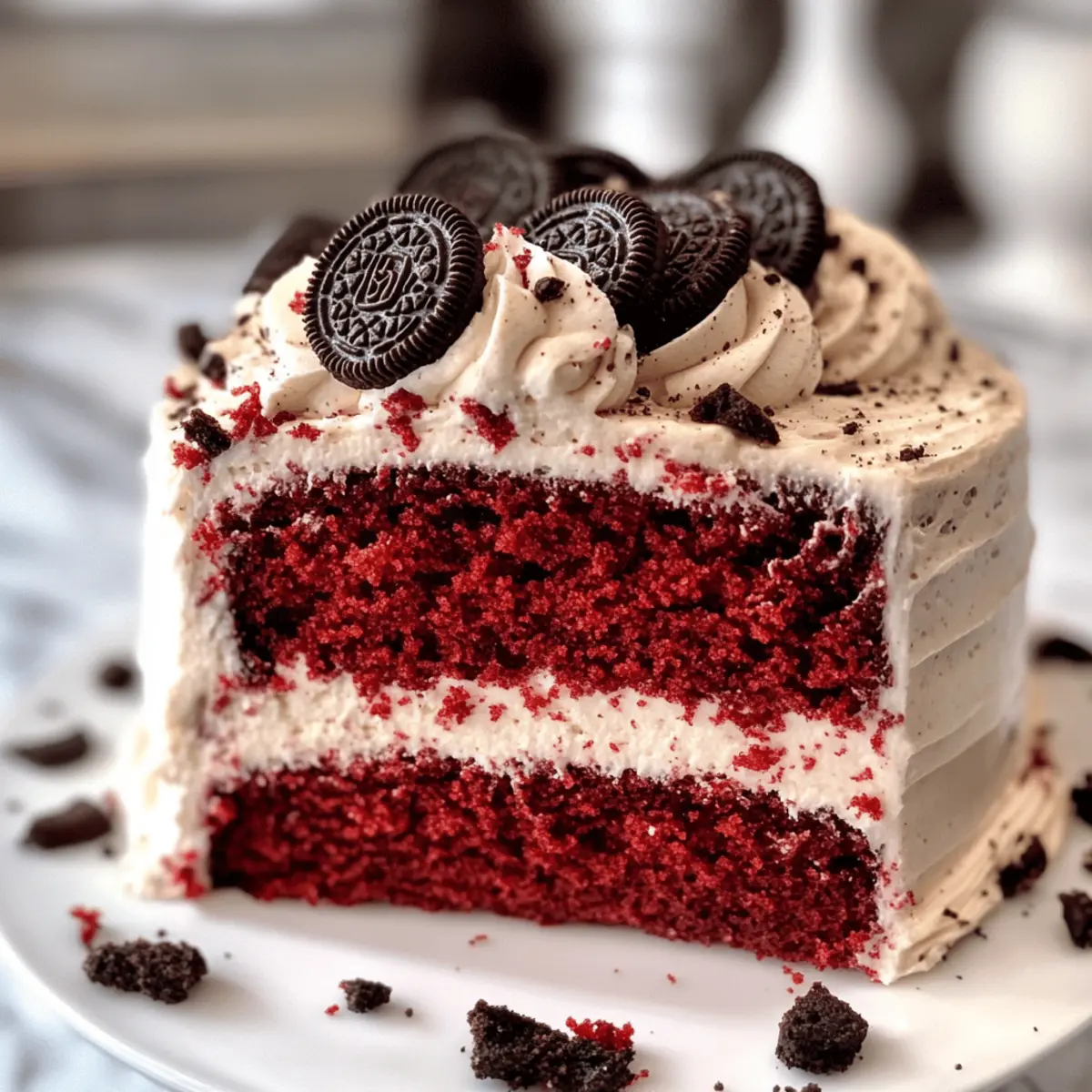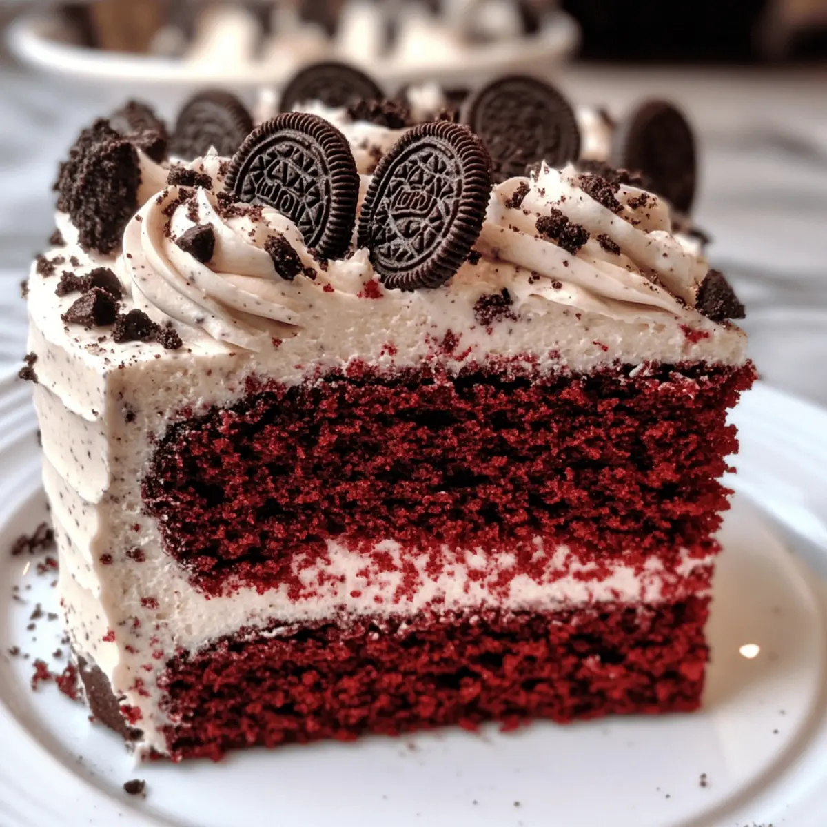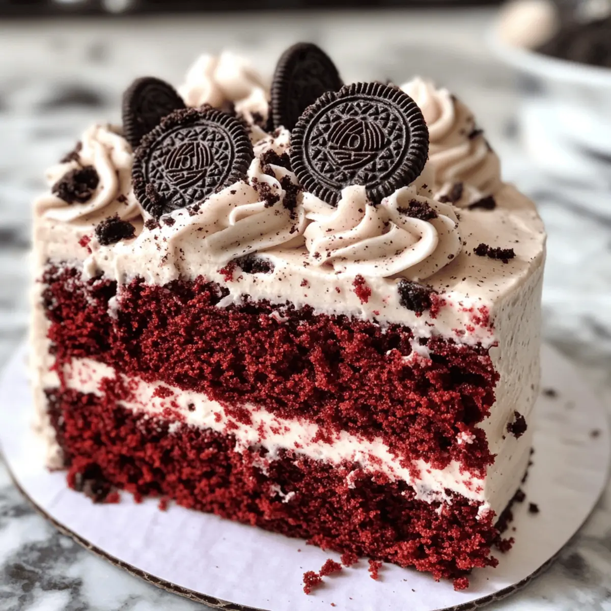 Es war einmal bei einer gemütlichen Feier, als ich den köstlichen Duft von frisch gebackenem Kuchen wahrnahm. Neugierig öffnete ich die Tür zur Küche und entdeckte den atemberaubenden Rot-Velvet-Oreo-Kuchen, der darauf wartete, serviert zu werden. Mit seinen saftigen, samtigen Schichten und dem verführerischen Oreo-Cream-Cheese-Frosting wird dieser Kuchen nicht nur die Herzen aller Naschkatzen erobern, sondern auch zum absoluten Star Ihrer nächsten Feier. Ideal für spontane Zusammenkünfte oder besondere Anlässe, verspricht dieser Rot-Velvet-Oreo-Kuchen nicht nur Geschmack, sondern auch eine belebende Abwechslung zu herkömmlichen Desserts. Bereiten Sie sich darauf vor, Ihren Gästen ein ganz neues Geschmackserlebnis zu bieten! Haben Sie schon einmal darüber nachgedacht, wie Sie diesen Kuchen in Ihre nächste Feier integrieren können? Warum dieser Rot-Velvet-Oreo-Kuchen unwiderstehlich ist Einzigartiger Genuss: Die Kombination aus samtigem Rot-Velvet-Kuchen und knusprigen Oreo-Stücken lässt jedes Stück zum Erlebnis werden. Einfache Zubereitung: Selbst Anfänger in der Küche können diesen dezenten Kuchen problemlos nachbacken. Vielseitig und anpassbar: Ob mit Schokoladengeschmack oder in Mini-Form – Variationen ausprobieren machen Spaß und sind jederzeit möglich. Perfekte Abwechslung: Er bietet die Ideale Lösung, sich von herkömmlichen Desserts abzuwenden und sorgt für Wow-Effekte bei Ihren Gästen. Platz für Kreativität: Lassen Sie Ihrer Fantasie freien Lauf beim Dekorieren – die Möglichkeiten sind endlos! Rot-Velvet-Oreo-Kuchen Zutaten • Für alle, die den perfekten Rot-Velvet-Oreo-Kuchen kreieren möchten, finden Sie hier die notwendigen Zutaten: Für den Kuchen Kuchenmehl – sorgt für eine luftige Textur; allzweck Mehl kann für eine dichtere Variante verwendet werden. Zucker – bringt Süße und Feuchtigkeit; brauner Zucker fügt eine tiefere Note hinzu. Kakaopulver – verleiht dem Kuchen einen Hauch von Schokolade; achten Sie darauf, ungesüßtes Kakaopulver zu verwenden. Backnatron – hilft dem Kuchen beim Aufgehen. Salz – hebt die Geschmäcker der anderen Zutaten hervor; unerlässlich für die Balance der Süße. Butter – sorgt für Reichtum im Kuchen; verwenden Sie ungesalzene Butter für bessere Kontrolle beim Salzen. Große Eier – liefern Feuchtigkeit und Struktur; Zimmertemperatur-Eier lassen sich besser vermischen. Essig – reagiert mit Backnatron für einen besseren Auftrieb des Kuchens; kann durch Zitronensaft ersetzt werden. Rote Lebensmittelfarbe (Gel) – sorgt für die ikonische rote Farbe des Kuchens; Gel ist effektiver als flüssige Farbe für intensivere Ergebnisse. Buttermilch – trägt zur Feuchtigkeit und zum Geschmack bei; bei Bedarf selbst herstellen, indem man Milch mit Essig mischt. Öl – hält den Kuchen saftig; kann zur leichteren Variante zur Hälfte durch Apfelmus ersetzt werden. Vanilleextrakt – fügt Tiefe zum Geschmack hinzu; verwenden Sie reinen Vanilleextrakt für beste Ergebnisse. Oreos (zerkleinert) – verleiht dem Kuchen Geschmack und Textur; in feine Stücke zerdrücken, um Klumpen zu vermeiden. Für das Frosting Frischkäse – Basis für das Frosting, das für einen cremigen und leicht säuerlichen Geschmack sorgt; verwenden Sie Vollfett für mehr Geschmack. Ungesalzene Butter (für das Frosting) – sorgt für Cremigkeit; lassen Sie sie weich werden für einfaches Mischen. Puderzucker – süßt und stabilisiert das Frosting; nach Geschmack anpassen. Whole Oreos (für die Dekoration) – sorgt für dekorative Zwecke; stellen Sie sicher, dass sie frisch sind für die beste Präsentation. Mit diesen Zutaten wird Ihr Rot-Velvet-Oreo-Kuchen ein echter Hit! Schritt-für-Schritt-Anleitung für den Rot-Velvet-Oreo-Kuchen Step 1: Ofen vorheizen Heizen Sie Ihren Ofen auf 175 °C vor und bereiten Sie drei 20-cm-Kuchenformen vor, indem Sie den Boden mit Pergamentpapier auslegen und die Ränder leicht einfetten. Dies sorgt dafür, dass sich der Kuchen nach dem Backen leicht aus der Form lösen lässt. Step 2: Trockene Zutaten mischen In einer Rührschüssel einer Küchenmaschine kombinieren Sie das Kuchenmehl, den Zucker, das Kakaopulver, das Backnatron und das Salz. Mischen Sie die Zutaten bei niedriger Geschwindigkeit, bis sie gut vermengt sind, um sicherzustellen, dass sich die trockenen Bestandteile gleichmäßig verteilen. Step 3: Butter und Öl cremigen Fügen Sie die weich gewordene Butter und das Öl zu den trockenen Zutaten hinzu. Pürieren Sie diese Mischung bei niedriger Geschwindigkeit für etwa 1 Minute, bis eine cremige Konsistenz entsteht, die gut in die trockenen Zutaten eingearbeitet ist. Step 4: Nasse Zutaten kombinieren Fügen Sie nach und nach die Eier, die Buttermilch, den Vanilleextrakt, die rote Lebensmittelfarbe und den Essig hinzu. Mischen Sie alles bei mittlerer bis niedriger Geschwindigkeit weiter und kratzen Sie die Seiten der Schüssel ab, um eine glatte und homogene Masse für Ihren Rot-Velvet-Oreo-Kuchen zu erhalten. Step 5: Oreos einarbeiten Zerkleinern Sie die Oreos in einem Gefrierbeutel, bis sie feine Krümel ergeben. Falten Sie diese vorsichtig unter den Kuchenteig, sodass die Oreos gleichmäßig verteilt sind, ohne die Luftigkeit der Mischung zu verlieren. Step 6: Backen Gießen Sie den Teig gleichmäßig auf die drei vorbereiteten Kuchenformen. Backen Sie die Kuchen für etwa 25 Minuten im vorgeheizten Ofen, bis ein Zahnstocher in der Mitte sauber herauskommt. Achten Sie darauf, dass die Oberflächen leicht nachgeben, wenn Sie leicht darauf drücken. Step 7: Abkühlen Lassen Sie die Kuchen für 5-10 Minuten in den Formen abkühlen, damit sie sich setzen. Danach nehmen Sie sie vorsichtig heraus und lassen sie auf einem Kuchengitter vollständig auskühlen, damit sie die optimale Textur für den Frosting erhalten. Step 8: Frosting vorbereiten Zerkleinern Sie die Oreos in einer Küchenmaschine, bis sie sehr fein sind. In einer Rührschüssel mischen Sie den Frischkäse und d