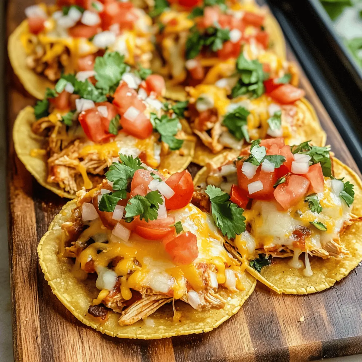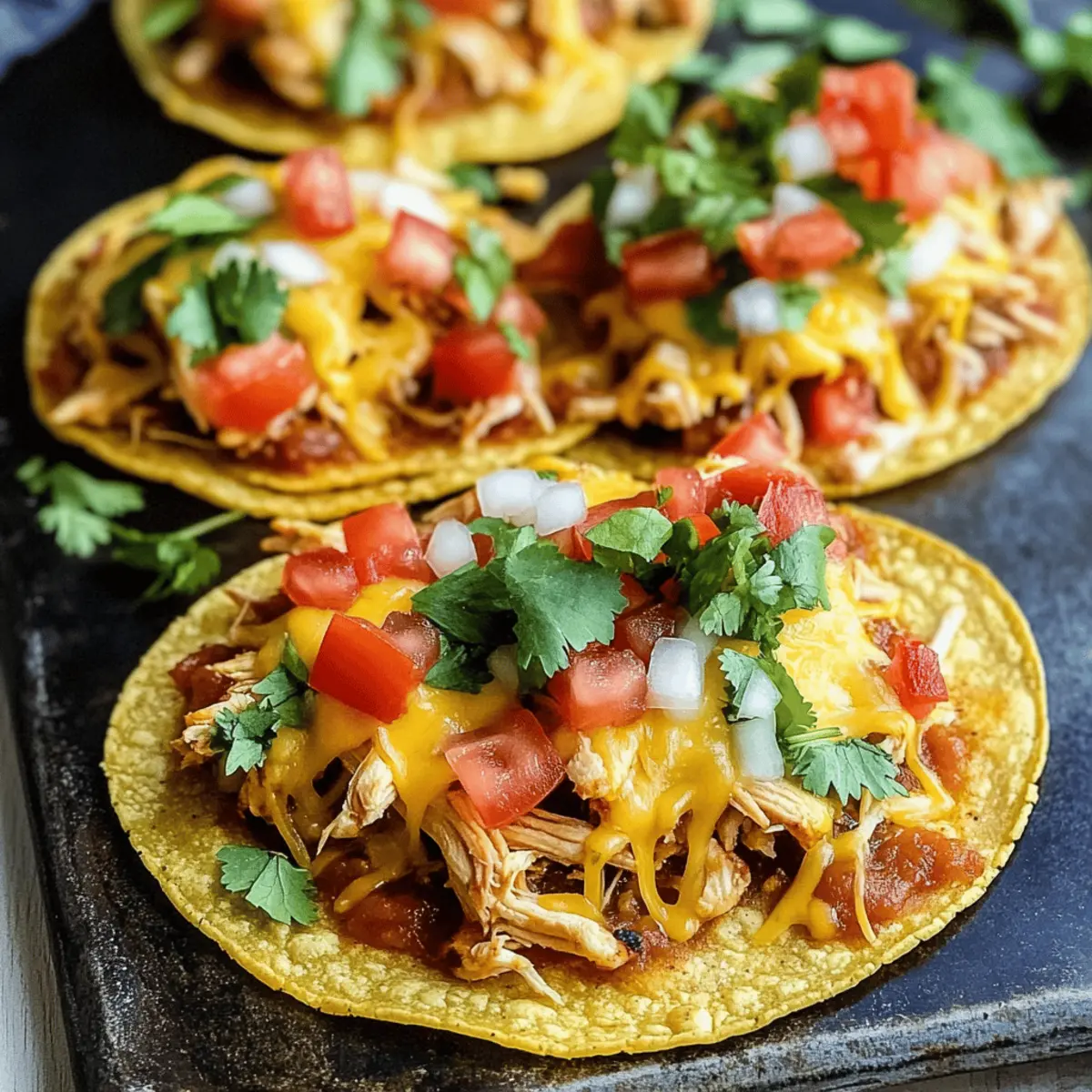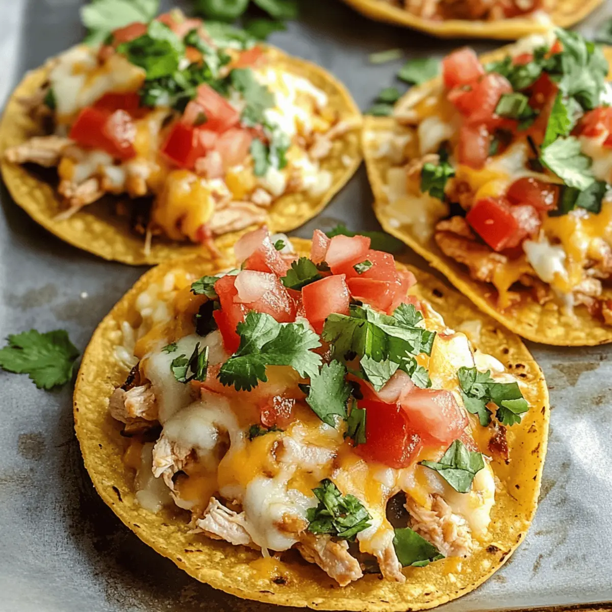 Als ich das erste Mal den köstlichen Klang von goldbraunen, knusprigen Tortillas hörte, wusste ich, dass ich eine besondere Entdeckung gemacht hatte: Rotisserie-Hähnchen-Tostadas! Diese unkomplizierte Rezeptur bringt im Handumdrehen ein wenig mexikanischen Flair in meine Küche. Sie sind nicht nur schnell zubereitet, sondern ermöglichen auch, dass jeder am Tisch die Toppings nach seinem eigenen Geschmack anpassen kann – perfekt, um kleine Feinschmecker zu begeistern! Ein weiterer Bonus ist die Verwendung von zartem, gewürztem Rotisserie-Hähnchen, das uns jede Menge Zeit im Vergleich zum traditionellen Kochen spart. Wer kann dazu schon Nein sagen? Bereit, in ein spritziges Geschmackserlebnis einzutauchen? Lass uns loslegen! Warum sind Rotisserie-Hähnchen-Tostadas so beliebt? Kreativität: Dieses Rezept erlaubt es dir, zu experimentieren und deine Lieblingszutaten zu verwenden – von frischem Gemüse bis zu schmelzendem Käse. Schnelligkeit: Mit vorgekochtem Rotisserie-Hähnchen bereitest du in wenigen Minuten ein köstliches Abendessen zu, das perfekt für hektische Wochentage ist. Geselligkeit: Jeder kann seine Tostadas nach eigenem Geschmack belegen, was sie ideal für Familienessen oder gesellige Abende macht. Nährstoffreich: Vollgepackt mit Proteinen und Ballaststoffen aus Hähnchen und Bohnen, sind diese Tostadas eine gesunde Alternative zu Fast Food, die lecker und sättigend ist. Kinderfreundlich: Selbst die wählerischsten Esser werden begeistert sein, ihre eigenen Kreationen zu gestalten. Dies könnte sogar den kleinen Feinschmeckern helfen, neue Geschmäcker zu entdecken! Schau dir auch unsere Variation Ideen an, um noch mehr Abwechslung zu genießen! Rotisserie-Hähnchen-Tostadas Zutaten • Hier sind die Zutaten, um diese köstlichen Rotisserie-Hähnchen-Tostadas zuzubereiten! Für die Tortillas Mais-Tortillas – Die perfekte Basis für Tostadas, die beim Backen knusprig werden. Hinweis: Mit etwas Öl bestreichen für optimale Knusprigkeit. Für das Hähnchen Rotisserie-Hähnchen – Spart Kochzeit und bringt köstliches, zartes Hähnchen. Substitution: Gekochte Hähnchenbrust kann verwendet werden, wenn kein Rotisserie-Hähnchen verfügbar ist. Taco-Gewürz – Fügt dem Hähnchen entscheidenden Geschmack hinzu. Hausgemischte oder gekaufte Mischungen sind beide geeignet. Für die Toppings Schwarze Bohnen – Liefert Proteine und Textur. Stelle sicher, dass sie abgespült und abgetropft sind, um Matschen zu vermeiden. Mais – Süßer und knuspriger Zusatz für die Toppings. Verwende Dosen-, gefrorenen oder frischen Mais, je nach Verfügbarkeit. Käse (z.B. geriebener Cheddar) – Schmilzt und fügt Cremigkeit und Geschmack hinzu. Nutze gerne Queso Fresco oder Monterey Jack für eine andere Note. Frische Toppings (z.B. Gurke, Tomaten, Koriander) – Bringt Frische und Farbe ins Spiel. Variiere mit deinen Lieblingsgemüsen wie Avocados oder Paprika. Mit dieser Auswahl an Zutaten bist du bereit, deine eigenen köstlichen Rotisserie-Hähnchen-Tostadas zu kreieren und deinen Gaumen zu verwöhnen! Schritt-für-Schritt-Anleitung für Rotisserie-Hähnchen-Tostadas Schritt 1: Ofen vorheizen Heize deinen Ofen auf 232 °C (450 °F) vor. Diese hohe Temperatur sorgt dafür, dass die Tortillas schön knusprig werden. Stelle sicher, dass du bereit bist, denn wir wollen gleich mit dem Backen der Tortillas beginnen, um eine perfekte Grundlage für die Rotisserie-Hähnchen-Tostadas zu schaffen. Schritt 2: Tortillas vorbereiten Lege die Mais-Tortillas gleichmäßig auf ein Backblech und bestreiche beide Seiten mit etwas Canola-Öl. Dies verbessert nicht nur den Geschmack, sondern sorgt auch für die gewünschte Knusprigkeit. Achte darauf, dass jede Tortilla gut bedeckt ist, um die beste Textur zu erzielen, während sie im Ofen ruhen. Schritt 3: Tortillas backen Schiebe das Backblech mit den Tortillas in den vorgeheizten Ofen und backe sie etwa 10 Minuten. Wende die Tortillas nach der Hälfte der Zeit, um sicherzustellen, dass sie gleichmäßig goldbraun und knusprig werden. Du wirst wissen, dass sie fertig sind, wenn die Ränder leicht aufgebläht und goldbraun sind. Schritt 4: Hähnchenmischung zubereiten In einer Pfanne erhitzt du auf mittlerer Hitze das zerkleinerte Rotisserie-Hähnchen zusammen mit Salsa, Taco-Gewürz, Mais und schwarzen Bohnen. Rühre die Mischung gut um und lass sie etwa 5 Minuten erwärmen, bis alles gut durchgemischt und heiß ist. So wird die Füllung perfekt für deine Rotisserie-Hähnchen-Tostadas. Schritt 5: Tortillas belegen Nach dem Backen der Tortillas nimmst du sie aus dem Ofen und beginnst, jede Tortilla gleichmäßig mit etwa ½ Tasse der Hähnchenmischung zu belegen. Die Wärme der Tortillas sorgt dafür, dass alles perfekt zusammenkommt, während du die schmackhafte Füllung darauf verteilt. Schritt 6: Käse hinzufügen Streue großzügig etwa ¼ Tasse Käse über jede belegte Tortilla. Setze die Tostadas für weitere 5 Minuten zurück in den Ofen, bis der Käse schmilzt und leicht blubbert. Der geschmolzene Käse wird die Aromen vereinen und die Rotisserie-Hähnchen-Tostadas besonders köstlich machen. Schritt 7: Tostadas garnieren und servieren Nach dem Backen holst du die Tostadas aus dem Ofen und garnierst sie mit frischem Koriander und gewürfelten Tomaten. Serviere sie sofort, damit sie schön warm und knusprig bleiben. Diese bunten Tostadas sind ein wahrer Genuss und bringen jeden zum Schlemmen! Was serviert man zu Rotisserie-Hähnchen-Tostadas? Die perfekte Begleitung zu diesem bunten Gericht bringt noch mehr Freude und Geschmack auf den Tisch. Frischer Guacamole: Die cremige Textur von Guacamole ergänzt die knusprigen Tostadas perfekt und sorgt für einen schönen Kontrast. Zesty Limetten-Dressing: Dieses spritzige Dressing bringt einen tollen Kick und harmoniert wunderbar mit den Aromen der Tostadas. Käse-Quesadillas: Einfach zuzubereiten und ein Hit bei Kindern! Der geschmolzene Käse ist eine tolle Ergänzung, die für einen herzhaf