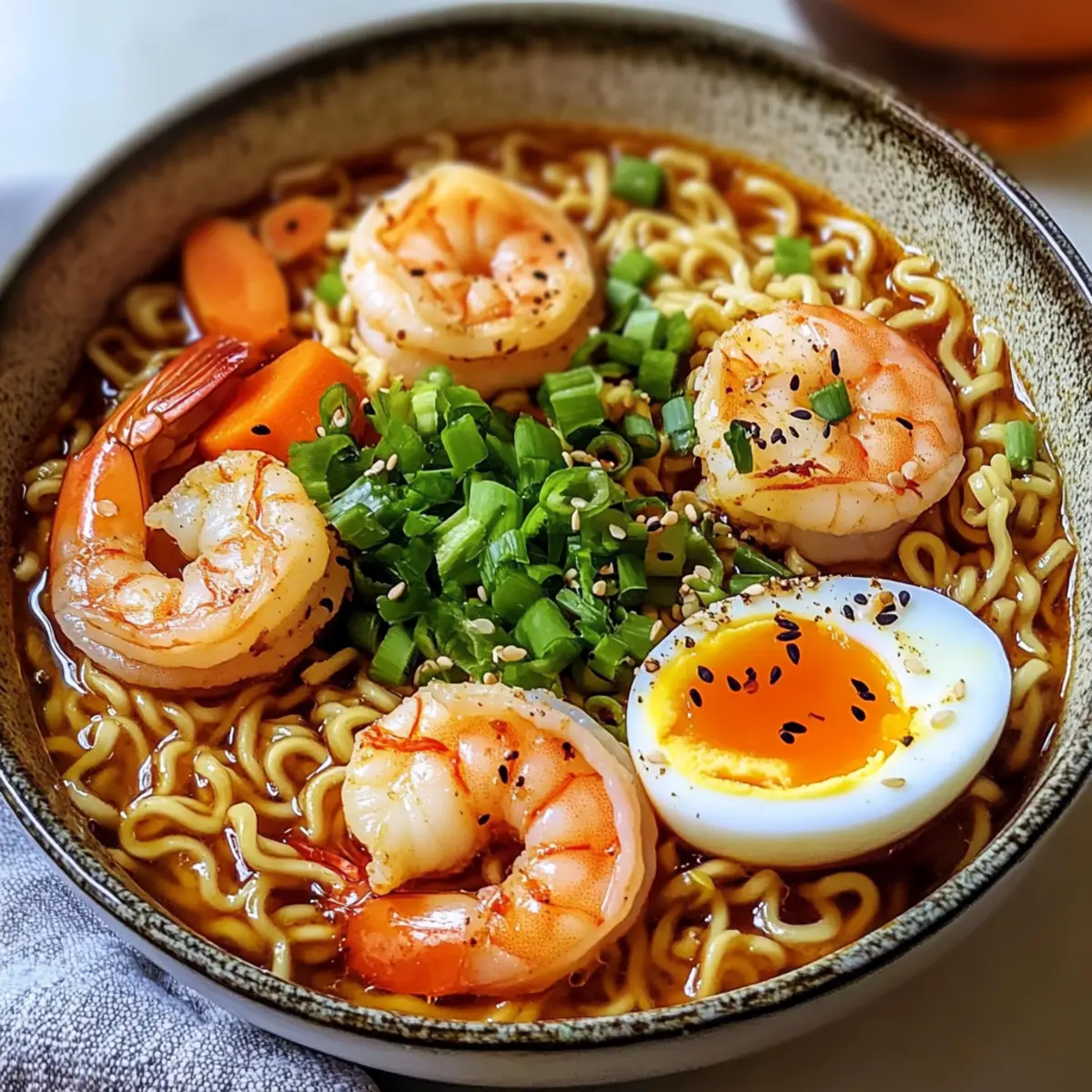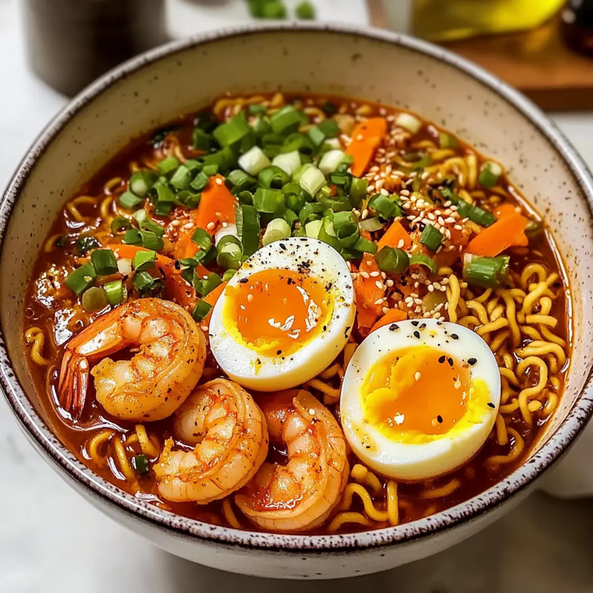Das Quietschen von frischen Zutaten auf dem Schneidebrett, der aromatische Duft, der die Küche erfüllt – es ist Zeit für etwas Besonderes! Heute zauber ich einen Teller scharfer Garnelen Ramen Nudeln, der nicht nur mich, sondern auch jede Menge Freunde begeistern wird. Mit einem herzhaften, würzigen Brühe, zarten Garnelen und der Möglichkeit, die Zutaten nach Lust und Laune anzupassen, wird dieses Gericht zum ultimativen Komfortessen für stressige Abende. Die Kombination aus weichen, perfekt gekochten Eiern und frischem Gemüse macht es zu einem schnellen Abendessen, das fast wie im Restaurant anmutet. Bereit, diese kulinarische Reise zu wagen? Lass uns starten! Warum wirst du dieses Rezept lieben? Einfachheit, die begeistert: Die Zubereitung der scharfen Garnelen Ramen Nudeln erfordert keine komplizierten Kochfähigkeiten und ist schnell in weniger als 30 Minuten gemacht. Vielfältige Anpassungsmöglichkeiten: Mit flexiblen Zutaten kannst du die Ramen ganz nach deinem Geschmack gestalten, sei es mit Tofu, Hühnchen oder verschiedenen Gemüsesorten. Herzhafter Geschmack: Die Kombination aus würziger Brühe, zarten Garnelen und frisch gekochten Nudeln sorgt für ein unvergessliches Geschmackserlebnis, das deine Geschmacksknospen erfreuen wird! Perfekte Texturen: Die Mischung aus zartem Gemüse, knusprigen Toppings und der reichhaltigen Brühe schafft ein harmonisches Zusammenspiel, das zum Schlemmen einlädt. Familienfreundlich: Diese Rezeptur eignet sich hervorragend für ein schnelles Familienessen, bei dem jeder seine eigene Schüssel nach Lust und Laune zusammenstellen kann. Hervorragend für Reste: Alle Übrigen Zutaten können im Kühlschrank bis zu drei Tage aufbewahrt werden, was es besonders praktisch für Meal Prep macht – ideal für stressige Wochen! Zutaten für Scharfe Garnelen Ramen Nudeln • Die perfekte Grundlage für ein schnelles und köstliches Abendessen! Für die Brühe Sesamöl – Verleiht der Brühe eine nussige Tiefe; kann durch neutrales Öl ersetzt werden. Chili Pulver (3,5 TL) – Fügt der Brühe die gewünschte Schärfe hinzu; nach persönlichem Geschmack anpassen. Schalotten (2, fein gehackt) – Bringt Süße und Geschmack in die Brühe; Zwiebeln sind ein guter Ersatz. Ingwer (1 Zoll, frisch gerieben) – Sorgt für ein warmes, pikantes Aroma; gemahlener Ingwer kann in geringer Menge verwendet werden. Knoblauch (2 Zehen, gehackt) – Fügen Sie eine herzhafte Tiefe hinzu; frischer Knoblauch ist ideal, aber Knoblauchpulver funktioniert auch. Hühnerbrühe (8 Tassen) – Dient als Basis der Suppe; nutze eine natriumarme Variante für bessere Kontrolle über die Salzigkeit. Limettensaft (1/4 Tasse) – Bringt Frische und Säure in die Brühe; Reisessig ist eine gute Alternative. Sojasauce (1/4 Tasse) – Fügt umami und Salzigkeit hinzu; Tamari ist eine glutenfreie Option. Fischsauce (1 EL) – Verstärkt den herzhaften Geschmack der Brühe; weglassen für eine vegetarische Version oder durch Sojasauce ersetzen. Weiße Pfeffer (1/4 TL) – Für eine subtile Schärfe; schwarzer Pfeffer kann ebenfalls verwendet werden. Für die Garnelen und Nudeln Garnelen (1 lbs) – Der Hauptprotagonist; frische oder gründlich aufgetaute gefrorene Garnelen sind ideal. Ramen Nudeln (5 Stück) – Hauptbestandteil an Kohlenhydraten; frisch oder getrocknet, je nach Vorliebe. Für das Gemüse Spinat (2 Tassen) – Fügt Farbe, Textur und Nährstoffe hinzu; Grünkohl oder Bok Choy können ersetzt werden. Zusätzliche Toppings – Limettenviertel, Karotten, Frühlingszwiebeln, Sesamkerne, Hoisinsauce – Diese optionalen Toppings heben den Geschmack und die Optik des Gerichts hervor. Für die Eier Eier (4, weichgekocht) – Sorgt für eine cremige Konsistenz und reichhaltigen Geschmack; befolge die Kochzeiten für perfekt gekochte Eier. Schritt-für-Schritt-Anleitung für Scharfe Garnelen Ramen Nudeln Step 1: Eier vorbereiten Bringe in einem kleinen Topf Wasser zum Kochen. Lege vorsichtig die Eier hinein und koche sie für genau 6 Minuten. Nach der Kochzeit nimm die Eier aus dem Wasser und lege sie sofort in ein Eisbad, um den Garprozess zu stoppen. So erhältst du perfekt weichgekochte Eier für deine Scharfen Garnelen Ramen Nudeln. Step 2: Zutaten vorbereiten Schäle und hacke die Schalotten und den Knoblauch fein, reibe den Ingwer und schneide die Frühlingszwiebeln in Ringe. Julienne die Karotten und röste die Sesamkörner in einer trockenen Pfanne, bis sie duften. Diese frischen Zutaten sind das Herz deiner scharfen Garnelen Ramen Nudeln und tragen zu einem köstlichen Aroma bei. Step 3: Garnelen kochen Erhitze 1,5 Esslöffel Sesamöl in einem großen Topf bei mittlerer Hitze. Füge die Garnelen und 1,5 Teelöffel Chili-Pulver hinzu und brate sie für 2-3 Minuten pro Seite an, bis sie rosa und durchgegart sind. Nimm die Garnelen aus dem Topf und stelle sie beiseite. Dies ist der erste Schritt, um den köstlichen Geschmack deiner Scharfen Garnelen Ramen Nudeln zu kreieren. Step 4: Brühe aufbauen Gib das restliche Sesamöl in denselben Topf und füge die Schalotten hinzu. Sauté für etwa 3 Minuten, bis sie weich und durchscheinend sind. Füge dann den Knoblauch und den Ingwer hinzu und koche alles zusammen für eine weitere Minute. Dieser Schritt sorgt für eine aromatische Basis in deiner Brühe. Step 5: Brühenbestandteile kombinieren Gieße die Hühnerbrühe in den Topf und füge Limettensaft, Sojasauce, Fischsauce sowie das verbleibende Chili-Pulver hinzu. Lass die Brühe bei niedriger Hitze etwa 10 Minuten köcheln. Diese Zeit erlaubt den Aromen, sich zu vereinen und gibt deiner Suppe den reichen Geschmack, der die Basis für die Scharfen Garnelen Ramen Nudeln ist. Step 6: Nudeln vorbereiten Bringe die Brühe erneut zum Kochen und füge die zerbrochenen Ramen-Nudeln hinzu. Koche die Nudeln für 2-3 Minuten, bis sie weich, aber noch al dente sind. Achte darauf, dass die Nudeln nicht zu weich werden, da sie in der Suppe weitergaren werden. Step 7: Spinat und G