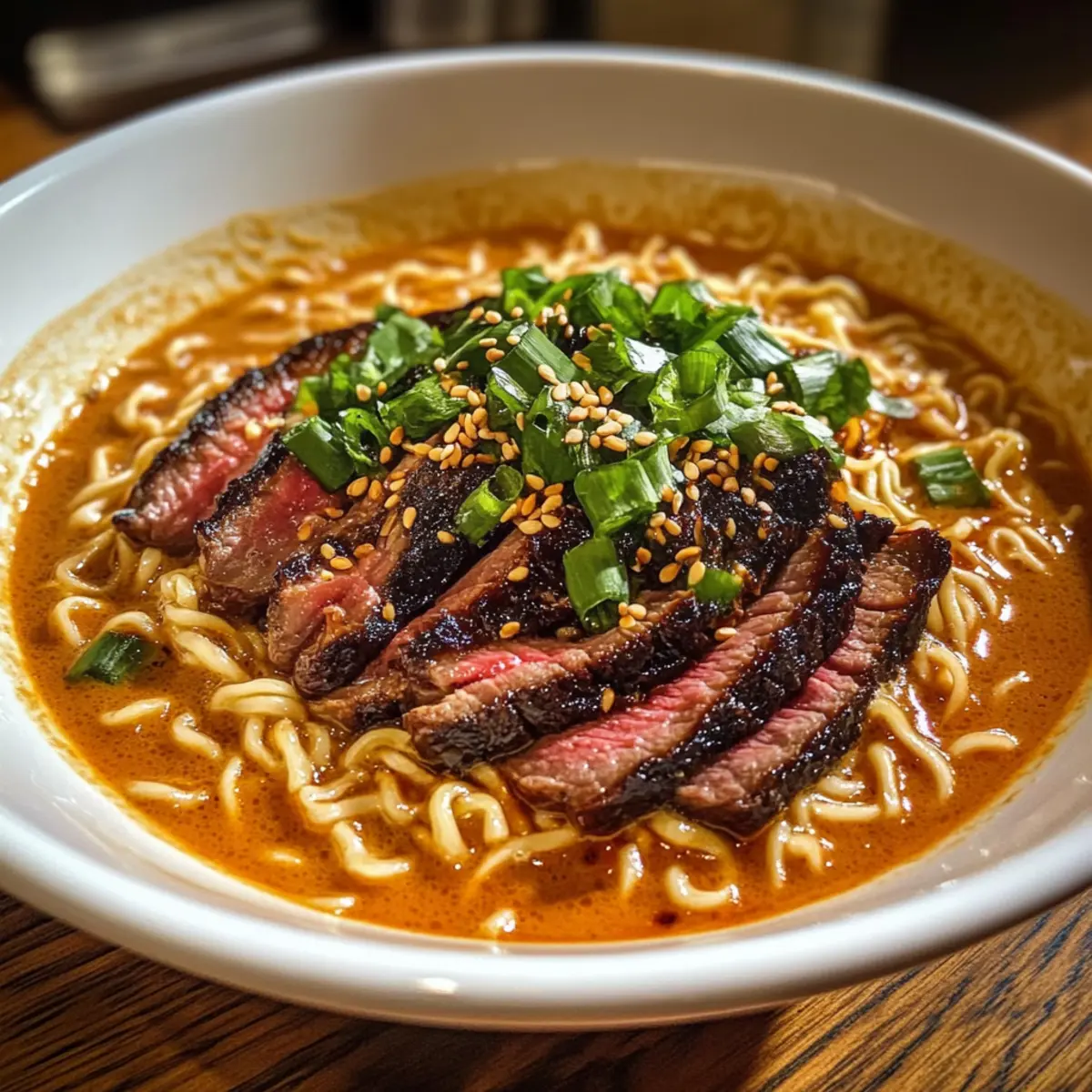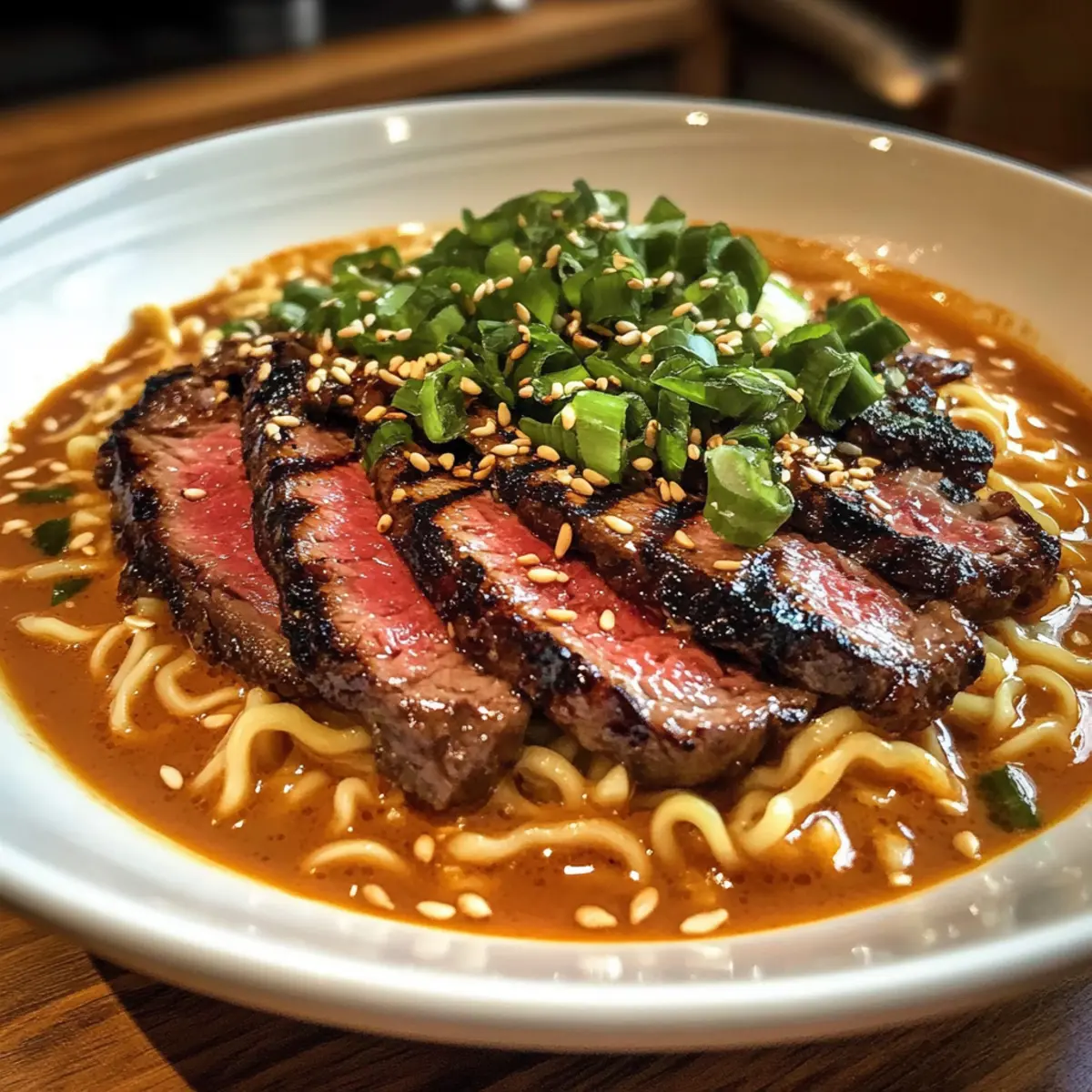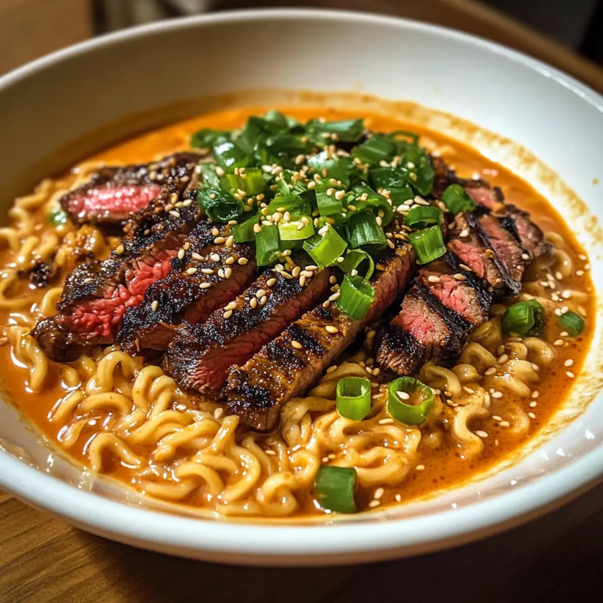 Ich saß in einem gemütlichen kleinen Restaurant in Seoul, umgeben von dem verführerischen Duft von Gewürzen und frisch zubereitetem Essen. Plötzlich wurde mir bewusst, dass ich mir diese Aromen und dieses Gefühl ganz einfach nach Hause holen kann – mit meinen eigenen scharfen koreanischen Nudeln! In nur 45 Minuten kann ich köstliche Spicy Korean Ramen mit gegrilltem Rindfleisch und einer cremigen Sauce zaubern. Dieses Gericht ist nicht nur perfekt für stressige Wochentage, sondern es beeindruckt auch jeden, der einen Hauch von Fernost auf dem Teller liebt. Wenn du auf der Suche nach einer schnellen, herzhaften und gleichzeitig aufregenden Mahlzeit bist, dann lass uns zusammenkochen! Welche proteinreiche Variante wirst du ausprobieren – ist es das zarte Rindfleisch oder vielleicht eine vegetarische Option? Warum sind diese scharfen koreanischen Nudeln besonders? Authentischer Geschmack: Jede Schüssel bietet ein reiches Aroma, das Erinnerungen an das pulsierende Seoul hervorruft. Vielseitigkeit: Mit Optionen wie Hähnchen oder Tofu kannst du das Gericht nach deinem Geschmack anpassen. Schnelle Zubereitung: In nur 45 Minuten hast du ein köstliches Essen, ideal für hektische Wochentage. Kreative Variationen: Spiele mit der Schärfe, indem du Gochujang oder Gochugaru nach Belieben anpasst. Beeindruckend: Dein Besuch wird von der Kombination aus zartem Rindfleisch und cremiger Sauce begeistert sein. Perfekt kombinierbar mit köstlichem Kimchi oder einem Spiegelei für den extra Genuss. Zutaten für scharfe koreanische Nudeln • Diese Zutaten machen dein Essen unvergleichlich lecker! Für die Marinade Rindersteak (300g) – Achte darauf, es gegen die Faser zu schneiden, damit es schön zart bleibt. Sojasauce (2 EL) – Verleiht der Marinade eine umami-reiche Tiefe. Tamari ist eine glutenfreie Alternative. Gochujang (1 EL) – Diese koreanische Chili-Paste sorgt für Pepp; ersetze sie durch Gochugaru für weniger Schärfe. Sesamöl (2 EL insgesamt) – Fügt eine nussige Note hinzu und wird sowohl in der Marinade als auch in der Brühe verwendet. Olivenöl kann bei Bedarf verwendet werden. Brauner Zucker (1 TL) – Balance für die Aromen in der Marinade; Honig ist ebenfalls ein guter Ersatz. Knoblauch (2 Zehen, gehackt) – Intensiviert das Aroma; kann weggelassen werden, falls du empfindlich auf Knoblauch reagierst. Schwarzer Pfeffer (½ TL) – Sorgt für eine zusätzliche Würze. Frisch gemahlen ist am besten. Für die Nudeln und Brühe Instant Ramen-Nudeln (2 Packungen) – Die perfekte Grundlage für das Gericht; die Gewürzpakete kannst du wegwerfen. Udon oder Soba sind tolle Alternativen. Hühnchen- oder Rinderbrühe (2 Tassen) – Die geschmackvolle Flüssigkeit für die Brühe. Gemüsebrühe ist ein großartiger Ersatz für eine vegetarische Option. Gochugaru (1 EL) – Koreanische Chiliflocken für zusätzlichen Schwung; rot paprika ist eine gute Ersatzoption. Reisessig (1 TL) – Hellt den Geschmack der Brühe auf; ersatzweise kannst du Apfelessig verwenden. Für die cremige Sauce Mayonnaise (3 EL, vorzugsweise Kewpie) – Basis der cremigen Sauce; normale Mayo oder griechischer Joghurt sind leichtere Alternativen. Sriracha (1 EL) – Geschmackliche Anpassung für die Schärfe; du kannst sie auch weglassen. Sesamöl, Knoblauchpulver und Zucker (je ½ TL) – Verbessern die cremige Sauce und sorgen für eine ausgewogene Süße. Für die Garnierung Frühlingszwiebeln (2 EL, gehackt) – Für Frische und Crunch. Schwarze Sesamsamen (1 TL, geröstet) – Ein weiterer schöner Akzent, der zugleich nussig ist. Diese Zutaten machen deine scharfen koreanischen Nudeln zu einem echten Geschmackserlebnis. Lass uns gemeinsam in die Zubereitung eintauchen! Step-by-Step Instructions für scharfe koreanische Nudeln mit gegrilltem Rindfleisch Step 1: Steak marinieren Vermische in einer Schüssel die Sojasauce, Gochujang, das Sesamöl, den braunen Zucker, den gehackten Knoblauch und den schwarzen Pfeffer. Lege das Rindersteak in die Marinade und stelle sicher, dass es gut bedeckt ist. Lass das Steak mindestens 30 Minuten bei Zimmertemperatur marinieren, um die Aromen einziehen zu lassen. Step 2: Steak grillen Erhitze den Grill oder eine Pfanne auf mittelhoher Stufe. Grill die marinierten Steakstücke für 3-4 Minuten auf jeder Seite, bis sie eine schöne Grillmarkierung haben und innen zart und rosa sind. Lasse das Steak danach 5 Minuten ruhen, damit sich die Säfte setzen können, bevor du es in dünne Scheiben schneidest. Step 3: Ramen-Nudeln kochen Kochen die Instant Ramen-Nudeln gemäß den Anweisungen auf der Verpackung in einem großen Topf mit kochendem Wasser für etwa 2-3 Minuten, bis sie weich sind, aber noch einen leichten Biss haben. Gieße die Nudeln ab und stelle sie beiseite, um sie später in die Schalen zu geben. Step 4: Brühe zubereiten In einem großen Topf die Hühnchen- oder Rinderbrühe bei mittlerer Hitze erhitzen. Füge die Gochugaru, die Sojasauce, den Reisessig und das Sesamöl hinzu und lasse die Brühe für ca. 2 Minuten sanft köcheln. Achte darauf, dass die Brühe gut vermischt ist und Aromafülle aufweist, bevor du sie vom Herd nimmst. Step 5: Cremige Sauce herstellen In einer separaten Schüssel die Mayonnaise, Sriracha, Sesamöl, Knoblauchpulver und den optionalen Zucker gut vermengen, bis eine glatte Konsistenz erreicht ist. Diese cremige Sauce wird eine leckere Ergänzung zu deiner Schüssel scharfer koreanischer Nudeln sein. Step 6: Ramen-Schalen anrichten Verteile die gekochten Ramen-Nudeln gleichmäßig auf die Schalen. Gieße die heiße Brühe über die Nudeln und lege die in Scheiben geschnittenen Steaks darauf. Träufle die cremige Sauce großzügig über die Nudeln und garniere das Gericht mit frisch gehackten Frühlingszwiebeln und gerösteten schwarzen Sesamsamen für extra Textur und Geschmack. Meal Prep für scharfe koreanische Nudeln Diese scharfen koreanischen Nudeln sind ideal für die Vorbereitung im Voraus! Du kannst das Rindersteak 