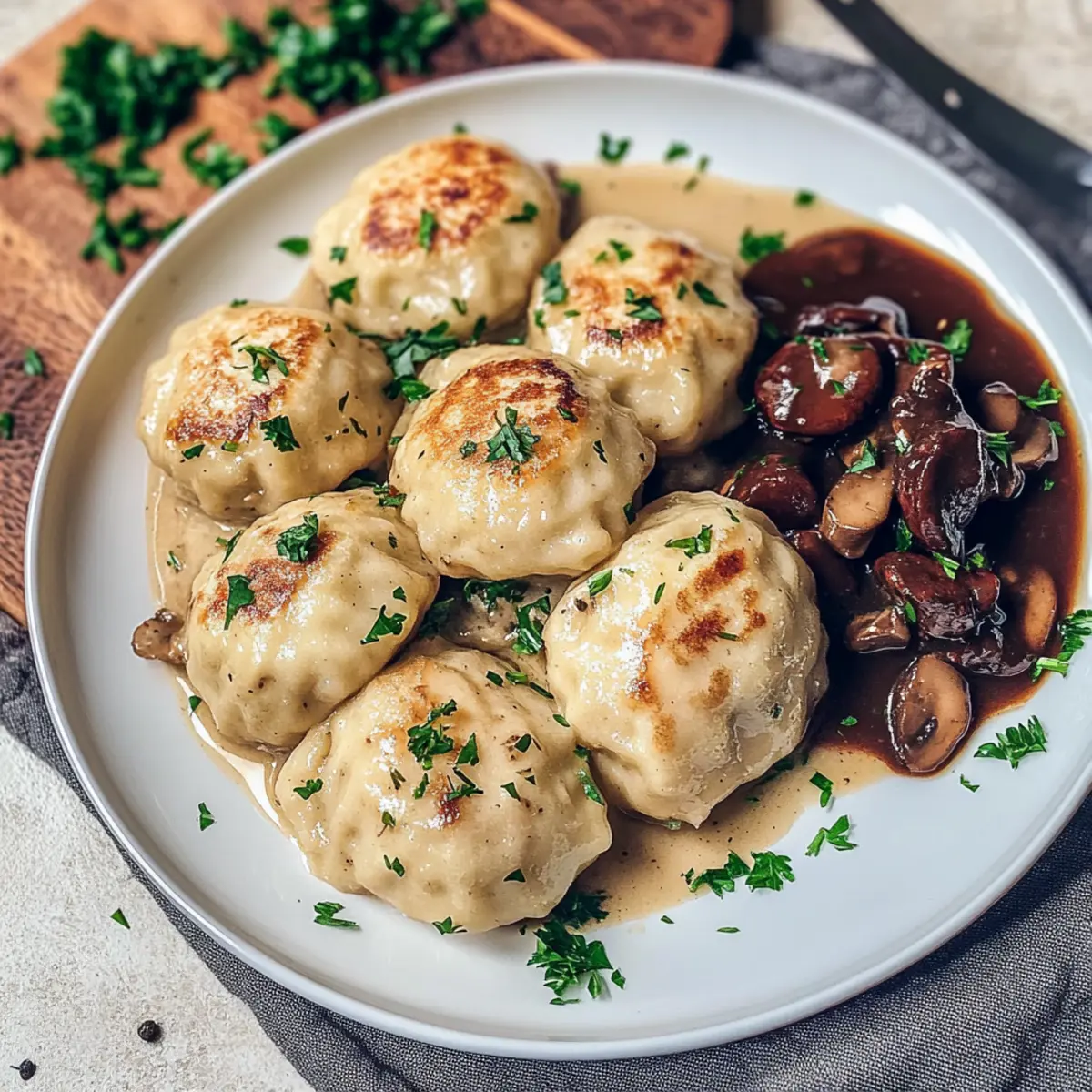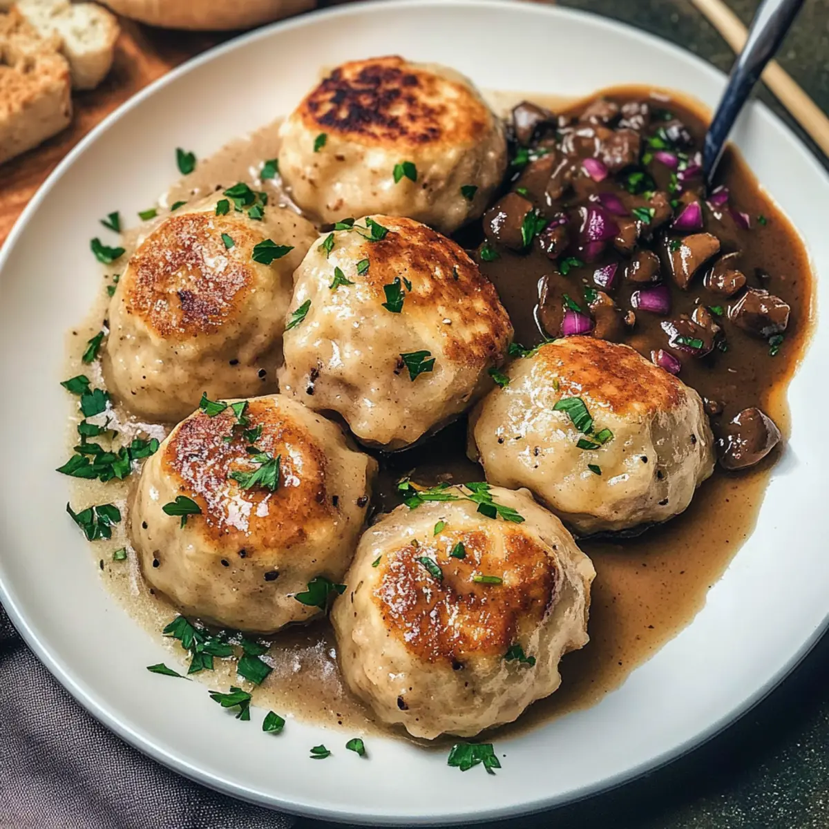 Als ich letztens in der Küche stand und an die herzhaften Gerichte meiner Kindheit dachte, kam mir die Idee, etwas ganz Besonderes zuzubereiten: Vegane Semmelknödel. Diese klassischen deutschen Brot-Dumplings sind nicht nur einfach zubereitet, sondern passen auch hervorragend zu cremigen Saucen oder veganen Gerichten mit Pilzen. Die besten Sachen entstehen oft aus der Notwendigkeit, übrig gebliebene Brötchen zu verwerten, und genau das macht dieses Rezept zu einem praktischen Comfort Food für jede Gelegenheit. Mit ihrer fluffigen Textur und dem reichen Geschmack von Zwiebeln und frischen Kräutern sind diese Semmelknödel eine perfekte Ergänzung zu festlichen Anlässen wie Thanksgiving oder einfach für ein gemütliches Abendessen zu Hause. Bist du bereit, deine Küche in eine kleine deutsche Tradition zu verwandeln? Warum wirst du diese Semmelknödel lieben? Einfachheit pur: Die Zubereitung dieser veganen Semmelknödel erfordert nur einige grundlegende Kochfähigkeiten und ist kinderleicht nachzuvollziehen. Vielfältige Verwendung: Diese Knödel eignen sich hervorragend als Beilage zu cremigen Saucen, veganem Braten oder sogar als Snack mit Gemüse – du kannst kreativ sein! Köstlicher Geschmack: Mit der Kombination aus Zwiebeln, frischen Kräutern und einem Hauch von Muskatnuss bieten diese Semmelknödel ein Geschmacksprofil, das deine Gäste begeistern wird. Rettung für übrig gebliebene Brötchen: Perfekt um alten Brot-Restbestände zu verwerten – eine nachhaltige und köstliche Lösung! Ideales Comfort Food: Die fluffige Textur und der herzliche Geschmack machen sie zu einem wahren Wohlfühlgericht, perfekt für jede Jahreszeit. Semmelknödel Zutaten Für die Knödel • Brotbrötchen – Verwende am besten altbackene Brötchen, um die beste Textur zu erzielen. • Sojamilch – Dient als Bindemittel anstelle von Eiern; andere Pflanzenmilch könnte die Struktur beeinträchtigen. • Pflanzenöl – Sorgt für Feuchtigkeit; kann durch Raps-, Avocado- oder Sonnenblumenöl ersetzt werden. • Zwiebel – Verbessert den Geschmack durch das Sautieren; fein würfeln für gleichmäßiges Kochen. • Petersilie – Füge Frische und Farbe hinzu; frisch ist am besten, kann aber durch andere Kräuter ersetzt werden. • Salz – Essentiell für den Geschmack und die Balance; nicht vergessen! • Muskatnuss – Sorgt für Wärme und Tiefe im Geschmack; verwende gemahlene Muskatnuss für die praktische Zubereitung. Schritt-für-Schritt-Anleitung für Vegane Semmelknödel Step 1: Brot vorbereiten Schneide die altbackenen Brötchen in kleine Stücke und gib sie in eine große Schüssel. Übergieße die Stücke mit lauwarmer Sojamilch und lasse die Mischung für etwa 10 Minuten ziehen, damit das Brot die Flüssigkeit aufsaugt und weich wird. Step 2: Zwiebeln sautieren Erhitze 2 Esslöffel Pflanzenöl in einer Pfanne bei mittlerer Hitze. Füge die fein gewürfelten Zwiebeln hinzu und sautieren sie für cirka 3 Minuten, bis sie glasig und leicht goldbraun sind. Mische dann die gehackte Petersilie darunter und brate sie für eine weitere Minute mit an, bis alles gut duftet. Step 3: Mischung kombinieren Gib die Zwiebel-Petersilien-Mischung, das Salz und die Muskatnuss in die Schüssel mit dem eingeweichten Brot. Knete die Mischung gründlich mit den Händen, bis sie gut verbunden ist und eine formbare Konsistenz erreicht. Achte darauf, dass keine großen Stücke mehr vorhanden sind. Step 4: Knödel formen Befeuchte deine Hände leicht mit Wasser, um ein Ankleben zu verhindern, und forme aus der Mischung acht gleich große Knödel. Platziere die geformten Knödel auf einem Teller und achte darauf, dass genügend Platz zwischen ihnen bleibt, damit sie beim Kochen nicht zusammenkleben. Step 5: Knödel kochen Bringe einen großen Topf mit gesalzenem Wasser zum Kochen. Reduziere dann die Hitze auf niedrige Stufe, sodass das Wasser nur leicht simmert. Gib die Semmelknödel vorsichtig ins Wasser und koche sie für 15-20 Minuten, bis sie an die Oberfläche steigen. So bleiben sie intakt und fallen nicht auseinander. Step 6: Abgießen und servieren Nutze einen Schaum-löffel, um die Knödel vorsichtig aus dem Wasser zu heben. Lass sie kurz abtropfen und serviere sie warm, gerne mit veganer Sauce oder als Beilage zu einem Hauptgericht. Die veganen Semmelknödel sind jetzt bereit, genossen zu werden! Die perfekte Vorbereitung für Vegane Semmelknödel Die veganen Semmelknödel eignen sich hervorragend für die Vorbereitung im Voraus, um dir wertvolle Zeit während der Woche zu sparen! Du kannst die Knödel bis zu 24 Stunden vor dem Kochen formen und im Kühlschrank aufbewahren – einfach mit Frischhaltefolie abdecken, um ein Austrocknen zu verhindern. Alternativ kannst du auch die gesamte Mischung bis zu 3 Tage im Voraus zubereiten: die Zwiebeln sautieren und alles zusammen in einer Schüssel halten. Wenn du bereit bist, die Semmelknödel zu genießen, koche sie einfach wie gewohnt für 15-20 Minuten in leicht siedendem Wasser. So bleiben deine veganen Semmelknödel genauso lecker und frisch wie an ihrem Zubereitungstag! Was passt zu Vegan Semmelknödel? Die perfekte Ergänzung zu diesen köstlichen, veganen Semmelknödeln lässt dein Gericht noch herzlicher und einladender erscheinen. Cremige Pilzsoße: Mit ihrer samtigen Textur und dem erdigen Geschmack der Pilze harmoniert die Soße wunderbar mit den fluffigen Knödeln und macht jedes Bissen zum Genuss. Veganer Braten: Ein saftiger, pflanzlicher Braten ist die ideale Hauptspeise, die sich perfekt mit den Semmelknödeln kombinieren lässt. Der reichhaltige Geschmack des Bratens unterstreicht die Leichtigkeit der Knödel. Rote Kohl-Beilage: Diese süß-säuerliche Beilage bringt eine frische und würzige Note, die im Kontrast zu den herzhaften Semmelknödeln steht und für ein ausgewogenes Gericht sorgt. Vegane Bratensoße: Ein intensives Aroma und die sämige Konsistenz der Bratensoße umhüllen die Knödel förmlich, was zu einem köstlichen und e