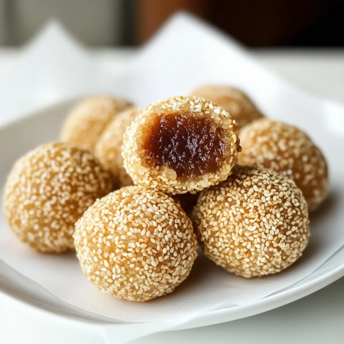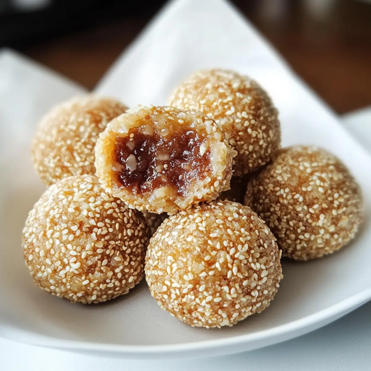 Als ich zum ersten Mal die knusprigen Sesamkugeln zubereitete, war ich überrascht, wie einfach und gleichzeitig köstlich dieses traditionelle asiatische Dessert ist. Diese süßen kleinen Bällchen, gefüllt mit roter Bohnenpaste, sind nicht nur ein Genuss für die Sinne, sondern auch mit nur fünf Zutaten und in nur anderthalb Stunden zubereitet. Perfekt für festliche Anlässe wie das Neujahrsfest oder einfach als himmlischer Snack zwischendurch! Die Kombination aus einer außen knusprigen und innen zähen Textur wird dich sofort in ihren Bann ziehen. Und das Beste ist, sie sind glutenfrei, wenn du die richtigen Zutaten verwendest! Lust auf eine süße Entdeckung? Lass uns gemeinsam in die Welt der Sesamkugeln eintauchen! Warum sind Sesamkugeln ein Muss? Einfachheit: Die Zubereitung dieser köstlichen Sesamkugeln ist so simpel, dass sie auch für Anfänger in der Küche geeignet ist. Mit nur fünf Zutaten gelingt dir ein echtes Meisterwerk! Vielseitigkeit: Du kannst die Füllung nach Belieben anpassen, egal ob mit roter Bohnenpaste, Lotuspaste oder sogar einer fruchtigen Variante. Perfekte Textur: Außen knusprig, innen zäh – diese Kombination sorgt für ein unvergleichliches Geschmackserlebnis, das die ganze Familie lieben wird. Schnelle Zubereitung: In nur anderthalb Stunden hast du ein traumhaftes Dessert parat, das sich perfekt für jede Feier eignet. Glutenfrei genießen: Mit den richtigen Zutaten kannst du dieses traditionell asiatische Dessert auch glutenfrei zubereiten – fantastisch für alle, die auf Gluten verzichten möchten! Überzeuge dich selbst von der Magie dieser kleinen Bällchen und entdecke auch andere asiatische Desserts! Sesamkugeln Zutaten Hinweis: Diese köstlichen Sesamkugeln sind einfach zuzubereiten und eignen sich perfekt für festliche Anlässe! Für den Teig Glutinous Rice Flour – sorgt für die richtige Textur und Elastizität; achte darauf, dass du kein normales Reis Mehl verwendest, da es die Konsistenz verändert. Heißes Wasser – aktiviert den Teig und hilft, eine glatte Textur zu erreichen; koche das Wasser vorher gut auf. Zucker – verleiht eine subtile Süße; du kannst auch Kokoszucker oder Stevia verwenden, wenn du eine Alternative möchtest. Für die Füllung Rote Bohnenpaste (fertig gekauft) – bringt Süße und Geschmack in die Bällchen; alternativ kannst du auch Lotuspaste oder Kürbispaste verwenden. Für die Beschichtung Sesam Samen – gibt den Bällchen den knusprigen Überzug und einen nussigen Geschmack; verwende frische Samen für den besten Geschmack. Mach dich bereit, deine Liebsten mit diesen leckeren Sesamkugeln zu überraschen! Schritt-für-Schritt-Anleitung für Krosse Sesamkugeln mit roter Bohnenfüllung Step 1: Heißes Wasser vorbereiten Zuerst bringst du einen kleinen Topf mit Wasser zum Kochen. Sobald es kocht, fügst du den Zucker hinzu und rührst, bis er sich vollständig aufgelöst hat. Diese süße Mischung wird später essenziell für den Teig unserer Sesamkugeln sein, also achte darauf, dass das Wasser kontinuierlich sprudelt. Step 2: Teig zubereiten In einer großen Schüssel vermängst du 200 g klebriges Reismehl mit dem heißen Zuckermischung. Rühre kräftig mit einem Löffel, bis der Teig zusammenkommt. Wenn der Teig cool genug zum Anfassen ist, knetest du ihn mit den Händen, bis er glatt und elastisch ist. Lass den Teig für etwa 30 Minuten abgedeckt ruhen, damit er sich setzen kann. Step 3: Formen und Füllen Nach der Ruhezeit teilst du den Teig in kleine Portionen, etwa tennisballgroß. Jede Portion flattenst du vorsichtig in deiner Handfläche. Platziere einen Teelöffel rote Bohnenpaste in der Mitte und formst die Außenseite über der Füllung, um sie zu versiegeln. Rolle die gefüllten Kugeln zwischen deinen Händen, um eine gleichmäßige Form zu erhalten. Step 4: Beschichten Nimm die geformten Sesamkugeln und befeuchte sie leicht mit Wasser, damit die Sesamkörner besser haften. Rolle jede Kugel dann in einer Schüssel mit Sesamkörnern, bis sie rundherum vollständig bedeckt ist. Achte darauf, dass die Körner gleichmäßig verteilt sind, um den typischen nussigen Crunch zu erhalten. Step 5: Frittieren Erhitze genug Öl in einem Wok oder einer tiefen Pfanne auf etwa 150°C. Die Temperatur kannst du überprüfen, indem du einen kleinen Teigklumpen ins Öl gibst; wenn er hochkommt und brutzelt, ist das Öl bereit. Die Sesamkugeln frittierst du in Chargen für etwa 10 Minuten. Wende sie während des Frittierens, damit sie gleichmäßig goldbraun werden. Step 6: Finale Frittierung Nach den ersten 10 Minuten erhöhst du die Hitze auf 180°C und frittierst die Sesamkugeln weitere 3 bis 5 Minuten, bis sie eine schöne goldbraune Farbe erreicht haben. Achte darauf, sie regelmäßig zu bewegen, um ein Ankleben zu verhindern. Wenn sie fertig sind, nehme sie vorsichtig mit einem Schaumlöffel heraus und lass sie auf einem Küchenpapier abtropfen. Step 7: Servieren und Genießen Sobald die Sesamkugeln abgetropft sind, serviere sie warm und genieße die Kombination aus knuspriger Außenschicht und zarter, süßer Füllung. Diese köstlichen Krosse Sesamkugeln sind perfekt für jedes Fest oder einfach als süßer Snack zwischendurch! Tipps für die besten Sesamkugeln • Teigkonsistenz prüfen: Achte darauf, dass der Teig weder zu trocken noch zu feucht ist; dies beeinflusst die Textur der Sesamkugeln. • Frisches Öl verwenden: Nutze hochwertiges Öl und erhitze es ausreichend, damit die Bällchen gleichmäßig frittieren und nicht festsitzen. • Nicht überfüllen: Frittiere die Sesamkugeln in kleinen Chargen, um eine gleichmäßige Hitzeverteilung und eine schöne goldene Farbe sicherzustellen. • Wasser für die Beschichtung: Befeuchte die Kugeln leicht mit Wasser, bevor du sie in Sesamkörnern wälzt, damit sie besser haften. • Variationen ausprobieren: Experimentiere mit verschiedenen Füllungen, um deine Sesamkugeln noch individueller und schmackhafter zu gestalten. Was passt zu Krossen Sesa