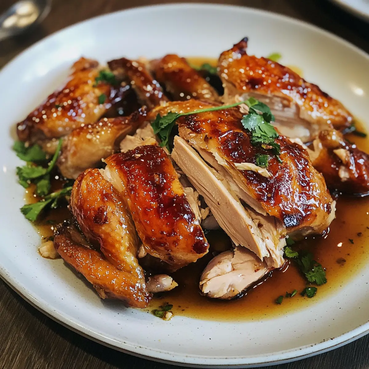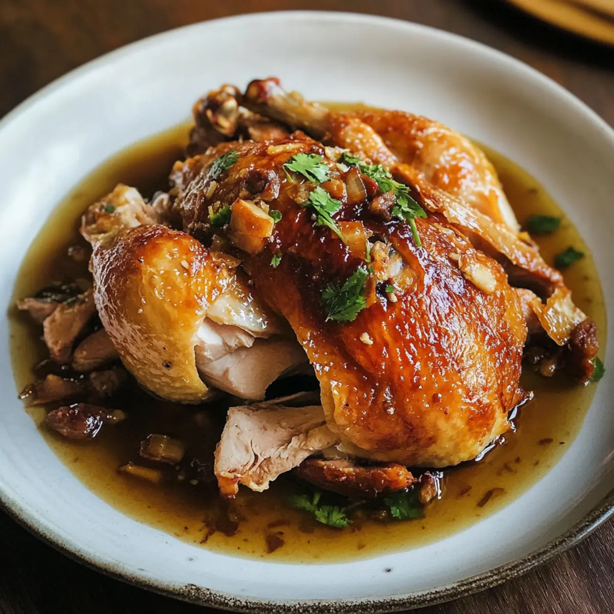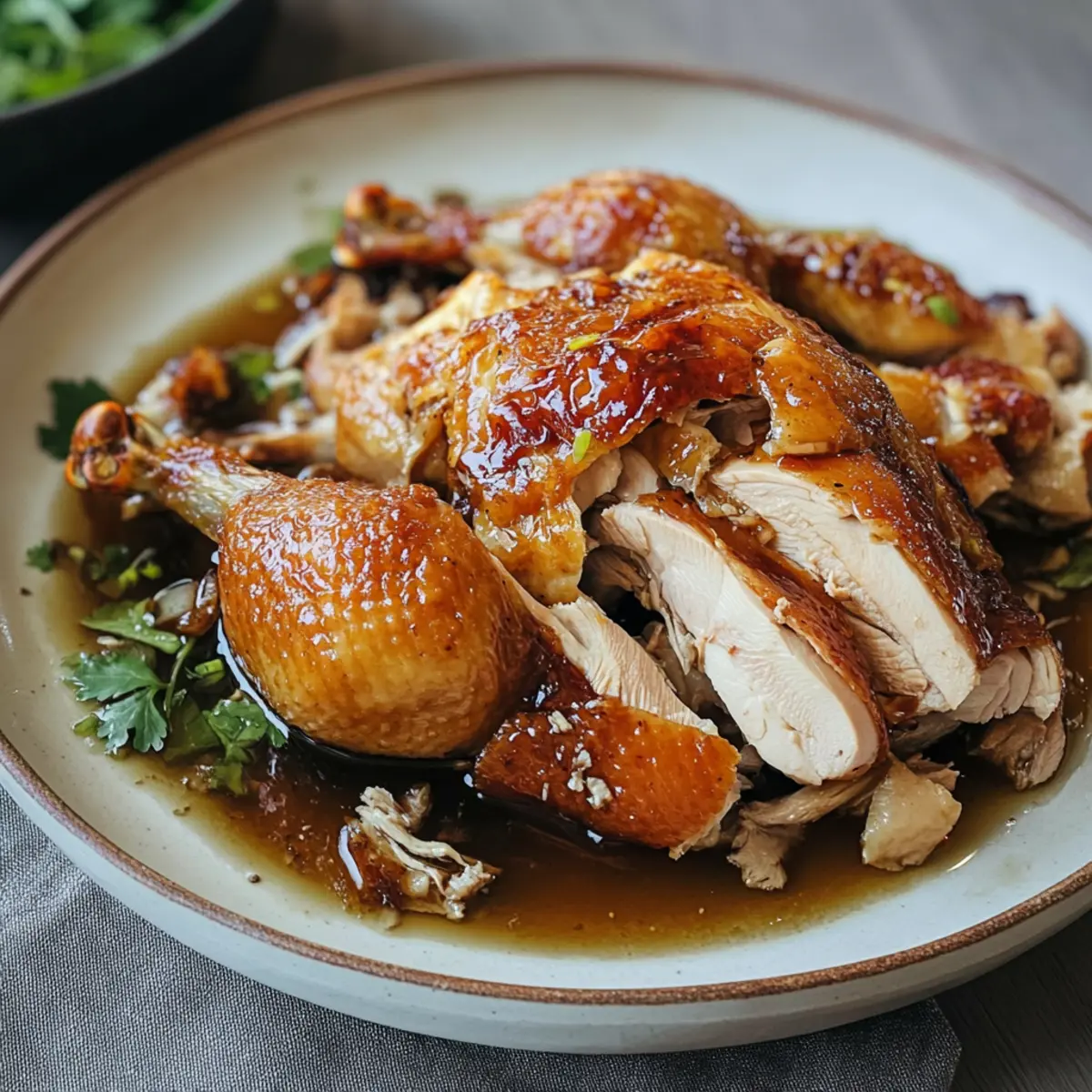 Der Duft von frisch gebratenem Hähnchen liegt in der Luft, und ich kann kaum warten, euch das Rezept für Shandong Brathähnchen mit aromatischer Essigsoße vorzustellen. Dieses Gericht ist eine perfekte Kombination aus knuspriger Haut und zartem Fleisch, das man ganz einfach zu Hause zubereiten kann. Ihr müsst nicht auf die Herausforderungen des Frittierens zurückgreifen, um den authentischen Geschmack der chinesischen Küche zu genießen. Egal, ob für ein Familienessen oder ein gemütliches Treffen mit Freunden, dieses Rezept ist nicht nur unkompliziert, sondern verbindet auch salzige, süße und saure Aromen auf harmonische Weise. Wollt ihr erfahren, wie ihr mit wenigen Zutaten ein Geschmackserlebnis zaubern könnt, das eure Liebsten garantiert begeistert? Warum wird euch dieses Rezept begeistern? Einfachheit: Die Zubereitung des Shandong Brathähnchens ist denkbar einfach und erfordert nur grundlegende Kochkenntnisse. Aromatische Vielfalt: Die Kombination aus aromatischem Essig, Sojasauce und frischen Gewürzen sorgt für einen vollmundigen Geschmack, der die Sinne verzaubert. Perfekte Konsistenz: Mit knuspriger Haut und zartem, saftigem Fleisch ist dieses Gericht ein wahrer Genuss, der an Restaurantqualität erinnert. Vielfältige Variationen: Experimentiert mit verschiedenen Gewürzen oder ersetzt das Hähnchen durch Tofu für eine schmackhafte vegetarische Version. Zeitersparnis: Dieses Rezept verlangt keine langen Kochzeiten, sodass ihr schnell das köstliche Ergebnis genießen könnt. Beliebtheit: Ob beim Familienessen oder beim Treffen mit Freunden, dieses Gericht wird garantiert zum Star auf eurem Tisch! Shandong Brathähnchen Zutaten Hinweis: Hier sind die Zutaten für ein köstliches Shandong Brathähnchen, das eure Geschmacksknospen verzaubern wird! Für das Hähnchen Ganzes Freilandhähnchen (ca. 1,6 kg) – Das Hauptprotein des Gerichts; wählt ein Freilandhähnchen für besseren Geschmack und Textur. Salz (1/2 TL) – Verstärkt den Geschmack und hilft beim Würzen des Hähnchens. Für die Marinade Dunkle Sojasauce (1 EL) – Fügt Tiefe und Farbe hinzu; für weniger Salz könnt ihr weniger verwenden. Shaoxing-Wein (1 EL) – Traditioneller Wein für ein reichhaltiges Aroma; durch trockenen Sherry substituierbar, wenn nicht verfügbar. Ingwersaft (1 TL, frisch geriebener Ingwer, nur der Saft) – Sorgt für eine aromatische Wärme; frischer Ingwer ist ideal für intensiveren Geschmack. Für die Sauce Schwarzer Essig (1/4 Tasse) – Verleiht den charakteristischen süß-sauren Geschmack; Chinkiang-Essig wird empfohlen für Authentizität. Sojasauce (2 TL) – Steigert den Umami-Geschmack; für weniger Salz könnt ihr eine natriumarme Sojasauce verwenden. Zucker (2 TL) – Balanciert die Säure in der Sauce; brauner Zucker sorgt für ein reichhaltigeres Aroma. Vogelaugen-Chilis (2) – Fügt einen scharfen Kick hinzu; passt die Menge nach eurem Schärfewunsch an. Korianderwurzel (1, fein gehackt) – Bietet einen erdigen Geschmack; die Blätter können als Garnitur verwendet werden. Knoblauch (4 Zehen, geschält und fein gehackt) – Fügt aromatische Schichten zur Sauce hinzu. Mit diesen Zutaten zaubert ihr ein nahezu perfektes Shandong Brathähnchen, das eure Lieben bestimmt begeistern wird! Schritt-für-Schritt-Anleitung für Shandong Brathähnchen Step 1: Hähnchen vorbereiten Reibt das gesamte Hähnchen innen und außen mit Salz ein, damit es gut gewürzt wird. Bringt anschließend Wasser zum Kochen und übergießt das Hähnchen damit, um die Haut zu straffen. Dies sorgt für eine knusprigere Konsistenz beim Rösten. Lasst das Hähnchen dann abkühlen und bereitet die Marinade vor. Step 2: Marinade anrühren In einer Schüssel kombiniert ihr die dunkle Sojasauce, den Shaoxing-Wein und den Ingwersaft. Reibt diese Mischung sorgfältig über das Hähnchen, sodass es überall gut bedeckt ist. Um den Geschmack zu intensivieren, lasst das Hähnchen über Nacht im Kühlschrank marinieren oder verwendet einen Haartrockner, um die Haut zu trocknen, was ebenfalls die Knusprigkeit verbessert. Step 3: Hähnchen rösten Heizt den Ofen auf 200°C vor. Legt das marinierte Hähnchen auf ein mit Backpapier ausgelegtes Backblech. Bratet das Hähnchen für etwa 1 Stunde, bis die Haut goldbraun und knusprig ist. Um sicherzustellen, dass es richtig gegart ist, prüft mit einem Messer, ob der Saft an der Gelenkstelle klar ist. Step 4: Hähnchen ruhen lassen Nehmt das Hähnchen nach dem Rösten aus dem Ofen und lasst es für 15 Minuten ruhen. Dies ermöglicht, dass sich die Säfte im Fleisch setzen, was zu einem saftigeren und zarteren Ergebnis führt. Während das Hähnchen ruht, könnt ihr die Sauce zubereiten. Step 5: Sauce vorbereiten In einer Schüssel vermischt ihr den schwarzen Essig, die Sojasauce, den Zucker, die Vogelaugen-Chilis, die fein gehackte Korianderwurzel und den Knoblauch. Rührt gut um, bis sich der Zucker vollständig aufgelöst hat. Für zusätzlichen Geschmack könnt ihr einige Tropfen vom ausgelassenen Hähnchenfett aus der Bratform hinzufügen. Step 6: Servieren Zerteilt das Hähnchen in Stücke und träufelt großzügig die aromatische Sauce über die Stücke. Die Kombination aus dem saftigen Hähnchen und der intensiven Sauce macht das Shandong Brathähnchen zu einem unvergleichlichen Geschmackserlebnis. Serviert es mit gedämpftem Reis und geschmortem Gemüse für ein komplettes Gericht. Tipps für das beste Shandong Brathähnchen Haut straffen: Gießt das Hähnchen mit kochendem Wasser, um die Haut zu straffen. Dies führt zu einer besonders knusprigen Textur nach dem Rösten. Optimale Marinierzeit: Lasst das Hähnchen idealerweise über Nacht marinieren. Zu langes Marinieren kann es zu salzig machen, also achtet auf die Zeit. Prüft die Garzeit: Das Hähnchen ist perfekt, wenn der Saft an der Gelenkstelle klar läuft. Nutzt ein Fleischthermometer, um die Kerntemperatur zu überprüfen. Extravagante Sauce: Fügt für einen besonders intensiven Geschmack ein