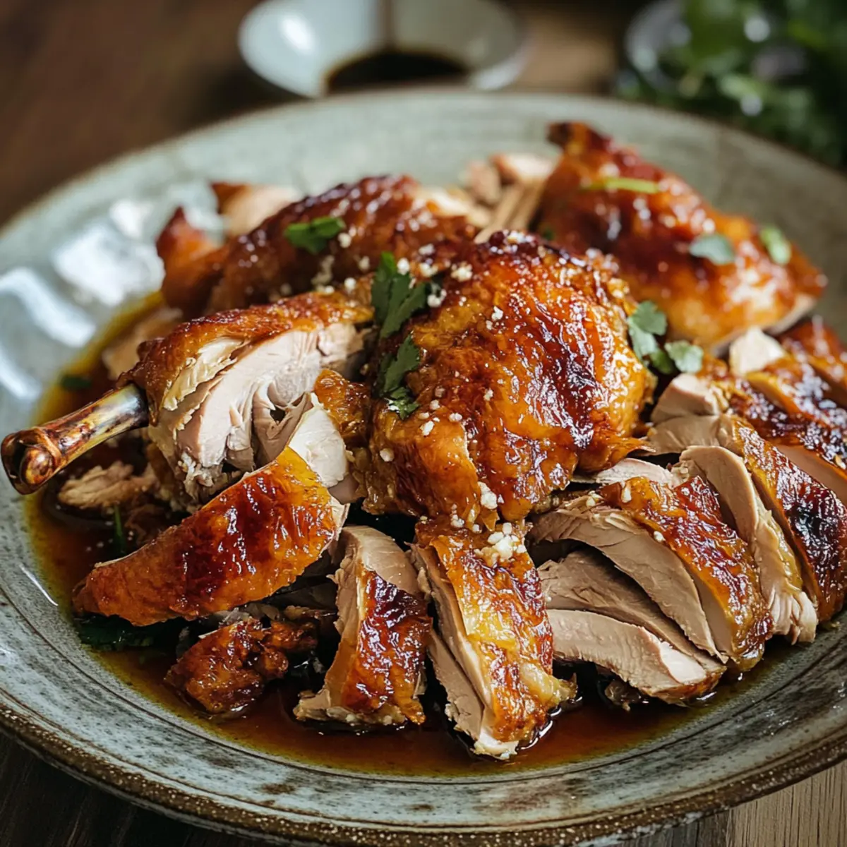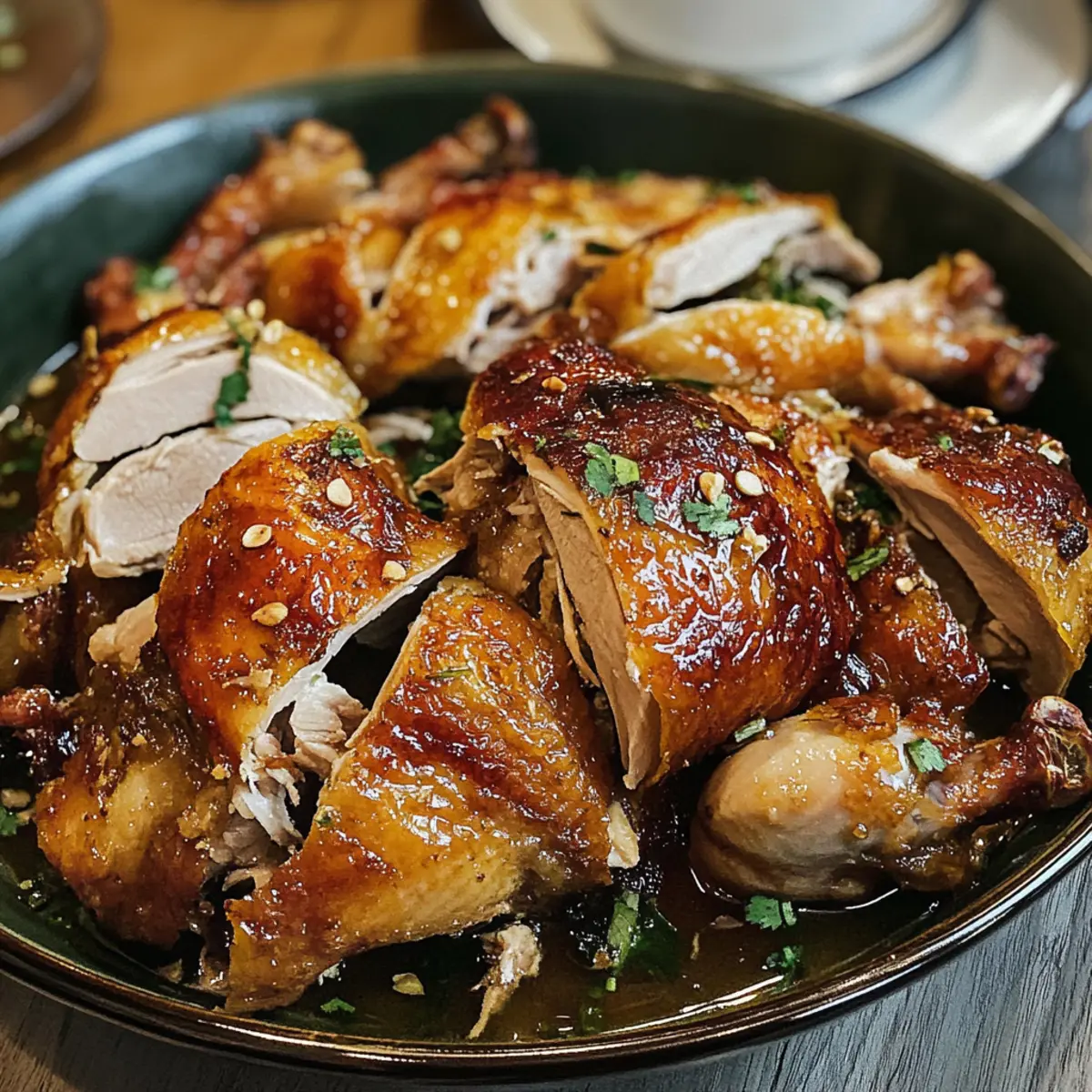 Gerade als ich in meine Küche trat, überwältigte mich der verführerische Duft von geröstetem Hähnchen, der wie eine Einladung an die Sinne wirkte. Heute teile ich mit euch mein Rezept für das legendäre Shandong-Rösthähnchen, ein Gericht, das nicht nur mit knuspriger Haut begeistert, sondern auch durch eine süß-saure Sauce, die den Gaumen verführt. Diese Zubereitung ist nicht nur unkompliziert und schnell, sondern auch eine hervorragende Alternative zum frittieren – die perfekte Wahl, um Familie und Freunde zu beeindrucken. Mit saftigem Fleisch und einer aromatischen Sauce wird dieses Gericht zum Herzstück eines jeden Abendessens. Habt ihr schon die perfekte Beilage im Kopf? Lasst uns gemeinsam in die Welt der Aromen eintauchen! Warum ist Shandong-Rösthähnchen unverzichtbar? Unvergleichlicher Geschmack: Das zarte Hähnchen kombiniert perfekt mit der süß-sauren Sauce, die die Aromen intensiviert. Einfache Zubereitung: Selbst wenn du kein Küchenprofi bist, ist dieses Rezept unkompliziert und macht Spaß! Knusprige Haut: Das Geheimnis eines perfekt gerösteten Hähnchens liegt in der knusprigen Haut, die selbst nach dem Backen bleibt. Vielfältige Beilagen: Serviere es mit gedämpften Reis oder frischem Gemüse; die Möglichkeiten sind schier endlos! Weniger Zeitaufwand: Mit wenigen Zutaten und einer einfachen Anleitung zauberst du im Handumdrehen ein Festmahl für Familie und Freunde. Verpasse nicht, wie du mit diesem Rezept die Herzen deiner Liebsten erobern kannst! Shandong-Rösthähnchen Zutaten • Für die Marinade: Salz – ½ Teelöffel bringt den Geschmack des Hähnchens zur Geltung. Dunkle Sojasauce – 1 Esslöffel verleiht dem Hähnchen eine tiefere Farbe und Umami-Geschmack. Shaoxing-Wein – 1 Esslöffel sorgt für ein aromatisches Tiefenprofil, trockener Sherry kann eine gute Alternative bieten. Geriebener Ingsaft – 1 Teelöffel bringt eine angenehme Wärme, frischer Ingwer ist hier die beste Wahl. • Für das Hähnchen: Ganzes Freilandhähnchen (ca. 1,6 kg) – Das Hauptprotein, wähle Freilandhähnchen für besseren Geschmack. • Für die Sauce: Schwarzer Essig – ¼ Tasse ist das Hauptgeschmackselement, welches Säure und Süße balanciert, als Ersatz kann Balsamico-Essig verwendet werden. Sojasauce – 2 Teelöffel zusätzliches Würzen, wahlweise regulär oder mit wenig Natrium. Zucker – 2 Teelöffel harmonisieren die Säure des Essigs, brauner Zucker sorgt für ein reichhaltigeres Aroma. Vogelaugen-Chilis – 2 Stück für etwas Schärfe, bei Bedarf weglassen. Korianderwurzel (fein gehackt) – 1 Stück fügt eine aromatische Note hinzu, frische Korianderstiele sind ein guter Ersatz. Knoblauch (fein gehackt) – 4 Zehen verstärken das Geschmacksprofil; variiere die Menge nach Belieben. Das Shandong-Rösthähnchen ist eine köstliche Kombination aus knuspriger Haut und aromatischer Sauce, die jedem Gericht eine besondere Note verleiht! Schritt-für-Schritt-Anleitung für das perfekte Shandong-Rösthähnchen Schritt 1: Hähnchen einreiben Reibe das ganze Freilandhähnchen gründlich mit ½ Teelöffel Salz ein, um das Fleisch zu würzen und die Haut zu exfolieren. Achte darauf, dass das Salz gleichmäßig verteilt ist, insbesondere unter der Haut, um den Geschmack während des Garens zu intensivieren. Dies sollte etwa 5 Minuten in Anspruch nehmen. Schritt 2: Mit kochendem Wasser überbrühen Bringe in einem großen Topf Wasser zum Kochen und gieße es vorsichtig über das Hähnchen. Dieser Schritt hilft, die Haut zu straffen, und trägt zur knusprigen Textur bei. Achte darauf, dass das Hähnchen gut abgedeckt ist, damit es gleichmäßig von allen Seiten mit Wasser in Kontakt kommt. Lass es für etwa 2 Minuten überbrühen. Schritt 3: Marinade zubereiten In einer Schüssel vermische 1 Esslöffel dunkle Sojasauce, 1 Esslöffel Shaoxing-Wein und 1 Teelöffel geriebenen Ingsaft. Rubbele die Marinade großzügig auf das Hähnchen, achte darauf, dass sie in die Haut einzieht. Decke das Hähnchen ab und lasse es für mindestens 1 Stunde, idealerweise über Nacht, im Kühlschrank marinieren, um die Aromen intensivieren zu können. Schritt 4: Ofen vorheizen Heize den Ofen auf 200°C (400°F) vor. Diese Temperatur ist optimal für das Garen und ermöglicht es, die Haut knusprig zu rösten. Bereite währenddessen ein Backblech mit Backpapier vor, um das Hähnchen gleichmäßig zu garen und später das Anhaften zu verhindern. Schritt 5: Hähnchen rösten Lege das marinierte Hähnchen auf das Backpapier im vorgeheizten Ofen und röste es für etwa 1 Stunde. Überprüfe das Hähnchen nach der Hälfte der Garzeit. Die Haut sollte goldbraun und knusprig sein – drehe es gegebenenfalls, um eine gleichmäßige Bräunung zu gewährleisten. Schritt 6: Hähnchen ruhen lassen Sobald das Hähnchen eine schöne goldbraune Farbe hat und der interne Kern eine Temperatur von 75°C (165°F) erreicht hat, nimm es aus dem Ofen und lasse es für etwa 15 Minuten ruhen. Durch das Ruhen bleibt das Fleisch saftig, und die Säfte können sich optimal verteilen. Schritt 7: Sauce zubereiten In einer Schüssel kombiniere ¼ Tasse schwarzen Essig, 2 Teelöffel Sojasauce, 2 Teelöffel Zucker, die fein gehackten Vogelaugen-Chilis, die Korianderwurzel und 4 fein gehackte Knoblauchzehen. Rühre alles gut durch, bis der Zucker vollständig aufgelöst ist. Diese Sauce wird eine süß-saure Note für das Shandong-Rösthähnchen bieten. Schritt 8: Hähnchen schneiden und servieren Schneide das ruhende Hähnchen in Stücke und lege es auf eine Servierplatte. Gieße die vorbereitete Shandong-Sauce gleichmäßig über die Hähnchenteile, sodass sie mit dem aromatischen Genuss überzogen sind. Serviere das Gericht warm, idealerweise mit gedämpftem Reis oder frischem Gemüse als Beilage. Expertentipps für Shandong-Rösthähnchen Haut vorbereiten: Achte darauf, die Haut des Hähnchens gründlich zu exfolieren, um zusätzliche Knusprigkeit zu gewährleisten. Dies ist entscheidend für das Enderge