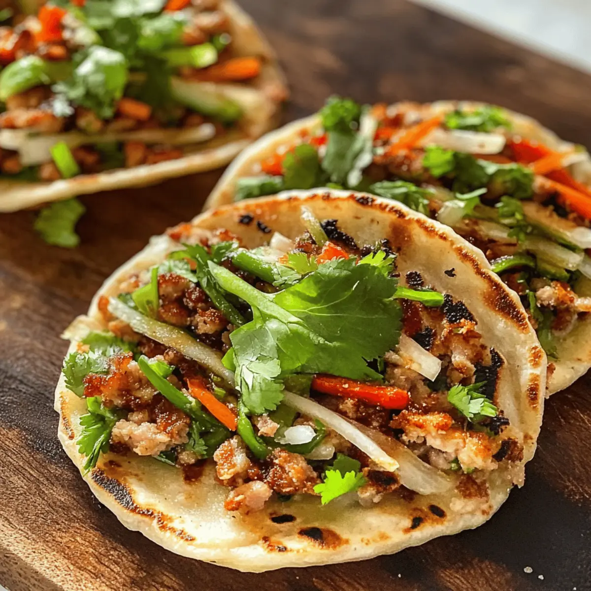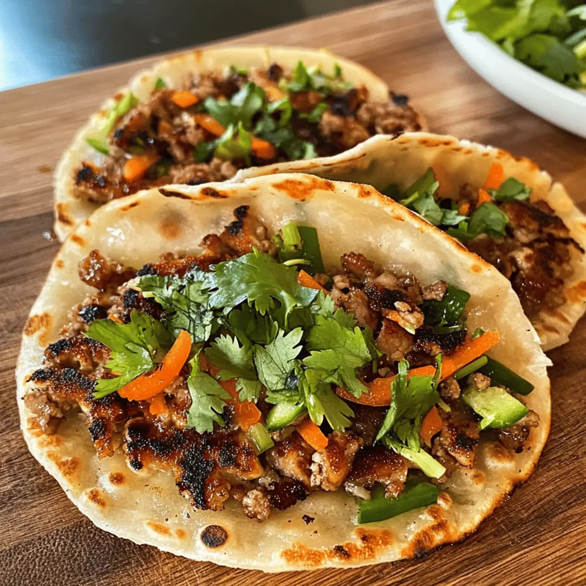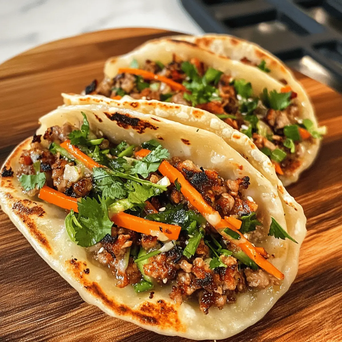 Eines Abends in der Küche, als ich meinen Kühlschrank durchforstete, stieß ich auf einen spannenden Gedanken: Wie wäre es, wenn ich meine Liebe zur asiatischen und mexikanischen Küche vereinen könnte? So entstand die zündende Idee zu Smash Dumpling Tacos – einer köstlichen Fusion, die dich begeistern wird! Diese Tacos kombinieren knusprige, gebratene Teigwaren mit herzhaften Füllungen und sind nicht nur einfach zuzubereiten, sondern auch ein Hit bei der ganzen Familie. Egal, ob du sie als schnelles Abendessen nach einem langen Tag oder für eine Dinnerparty mit Freunden servierst, sie bieten ein wahrhaft unvergessliches Geschmackserlebnis. Bist du bereit, deine nächste Taco-Nacht zu revolutionieren und mit uns auf diese Geschmacksreise zu gehen? Warum wirst du diese Tacos lieben? Simplicity: Die Zubereitung der Smash Dumpling Tacos ist unkompliziert und erfordert nur grundlegende Kochfähigkeiten. Vielseitigkeit: Genieß deine Tacos mit verschiedenen Füllungen wie Schweinehack, Hähnchen oder Tofu. Ideal für jeden Geschmack! Crispy Crunch: Die Kombination aus knusprigen Teigwaren und saftigen Füllungen sorgt für ein aufregendes Geschmackserlebnis, das du nicht vergessen wirst. Familienfreundlich: Diese Tacos sind ein Hit bei Kindern und Erwachsenen, perfekt für eine gesellige Runde. Zeitersparnis: Mit wenigen Zutaten und einer schnellen Zubereitung sind sie das ideale Gericht für stressige Wochentage – schneller Genuss ohne viel Aufwand! Entdecke auch, wie du diese Tacos mit einer [würzigen asiatischen Gurkensalat] kombinieren kannst, um dein Geschmackserlebnis zu vervollständigen! Smash Dumpling Taco Zutaten • Entdecke die köstlichen Zutaten für die perfekten Fusion-Tacos! Dumpling Wrapper – Ideal als Basis für die Tacos, wähle zwischen selbstgemacht oder den praktischen Fertigen. Weißes Mehl – Gibt den hausgemachten Dumpling-Wrappers Struktur; kann durch glutenfreies Mehl ersetzt werden. Kochen Wasser – Hydriert den Teig für die Wrapper; lasse es leicht abkühlen, um das Mischen zu erleichtern. Salz – Verleiht sowohl den Wrappers als auch der Füllung mehr Geschmack. Schweinehackfleisch – Hauptbestandteil, der für Geschmack und Textur sorgt; verwende für eine vegetarische Option eine Mischung aus Champignons und Tofu. Frühlingszwiebeln & Schnittlauch – Frische Aromen, die der Füllung eine gewisse Schärfe und Helligkeit verleihen; rote Zwiebeln sind für intensiven Geschmack und Frühlingszwiebeln für mildere Noten geeignet. Koriander – Für frische Kräuternoten, ersetze mit Petersilie für einen milderen Geschmack. Knoblauch & Ingwer – Unverzichtbare Geschmacksverstärker; Zwiebeln können Knoblauch ersetzen, und du kannst Ingwerpulver statt frischem Ingwer nutzen. Helle und Dunkle Sojasauce – Sorgen für Umami und Tiefe; verwende Tamari für eine glutenfreie Option. Sesamöl – Fügt einen nussigen Geschmack hinzu; ersetze es mit Erdnuss- oder Olivenöl für eine andere Note. Reiswein-Essig – Bringt eine angenehme Säure; Apfelessig oder Limettensaft fungieren als Alternativen. Ei – Bindet die Füllung; ersetze es mit einem Flaxseed “Ei” für eine vegane Option. Toppings (Karotte, Gurke, Frühlingszwiebeln, Koriander, Chiliöl) – Sorgfältig ausgewählt, um Crunch, Frische und Schärfe hinzuzufügen; Radieschen können Gurken ersetzen, und Minze statt Koriander sorgt für eine frische Note. Schritt-für-Schritt-Anleitung für Smash Dumpling Tacos Step 1: Teig vorbereiten Mische das Weißmehl mit einer Prise Salz in einer großen Schüssel. Gieße langsam das leicht abgekühlte kochende Wasser hinzu und rühre mit einem Löffel, bis ein grober Teig entsteht. Knete den Teig 10 Minuten lang auf einer leicht bemehlten Oberfläche, bis er glatt und elastisch ist. Decke den Teig mit einem feuchten Tuch ab und lasse ihn 30 Minuten ruhen. Step 2: Füllung zubereiten Vermenge in einer Schüssel das Schweinehackfleisch mit fein gewürfelten Frühlingszwiebeln, Knoblauch, Ingwer, Sojasauce, Sesamöl, Reiswein-Essig und einem Ei. Füge Salz, Pfeffer und frische Korianderblätter hinzu. Mische alle Zutaten gründlich, bis sie gut kombiniert sind und die Mischung leicht klebrig wird. Lass die Füllung während der Zubereitung der Wrapper ruhen. Step 3: Wrapper formen Teile den ruhenden Teig in 12 gleichmäßige Portionen. Rolle jede Portion auf einer bemehlten Fläche zu einem dünnen Kreis aus, etwa 10 cm im Durchmesser. Achte darauf, dass die Ränder dünner sind als die Mitte, um ein gleichmäßiges Falten zu ermöglichen. Lege die ausgerollten Wrapper auf ein bemehltes Backblech und decke sie mit einem Tuch ab, um ein Austrocknen zu verhindern. Step 4: Dumplings füllen Nehme einen Wrapper und platziere einen Esslöffel der vorbereiteten Füllung in die Mitte. Falte den Wrapper halbmondförmig und drücke die Ränder vorsichtig zusammen, um sie zu versiegeln. Stelle sicher, dass keine Luftblasen eingeschlossen werden, da dies beim Kochen zu Rissen führen könnte. Wiederhole diesen Schritt mit den restlichen Wrappern und der Füllung. Step 5: Kochen Erhitze eine große Pfanne bei mittelhoher Hitze und füge etwas Öl hinzu. Lege die gefüllten Dumplings vorsichtig in die Pfanne und drücke sie leicht flach, um eine gleichmäßige Bräunung zu erzielen. Brate sie 2 Minuten lang, bis die Unterseite goldbraun ist. Gieße dann 60 ml Wasser in die Pfanne und decke sie mit einem Deckel ab, um die Dumplings 1 Minute lang zu dämpfen. Step 6: Crispen und servieren Nachdem das Wasser verdampft ist, nimm den Deckel ab und lasse die Dumplings weitere 2-3 Minuten braten, bis sie schön knusprig und goldbraun sind. Serviere die Smash Dumpling Tacos heiß und garniere sie mit frisch geriebenem Gemüse wie Karotten, Gurken und etwas Chiliöl für zusätzliche Schärfe. Perfekte Vorbereitung für Smash Dumpling Tacos Du bist ein viel beschäftigter Koch? Keine Sorge! Die Smash Dumpling Tacos sind ideal für die Vorbereitung im Voraus. Du kannst 