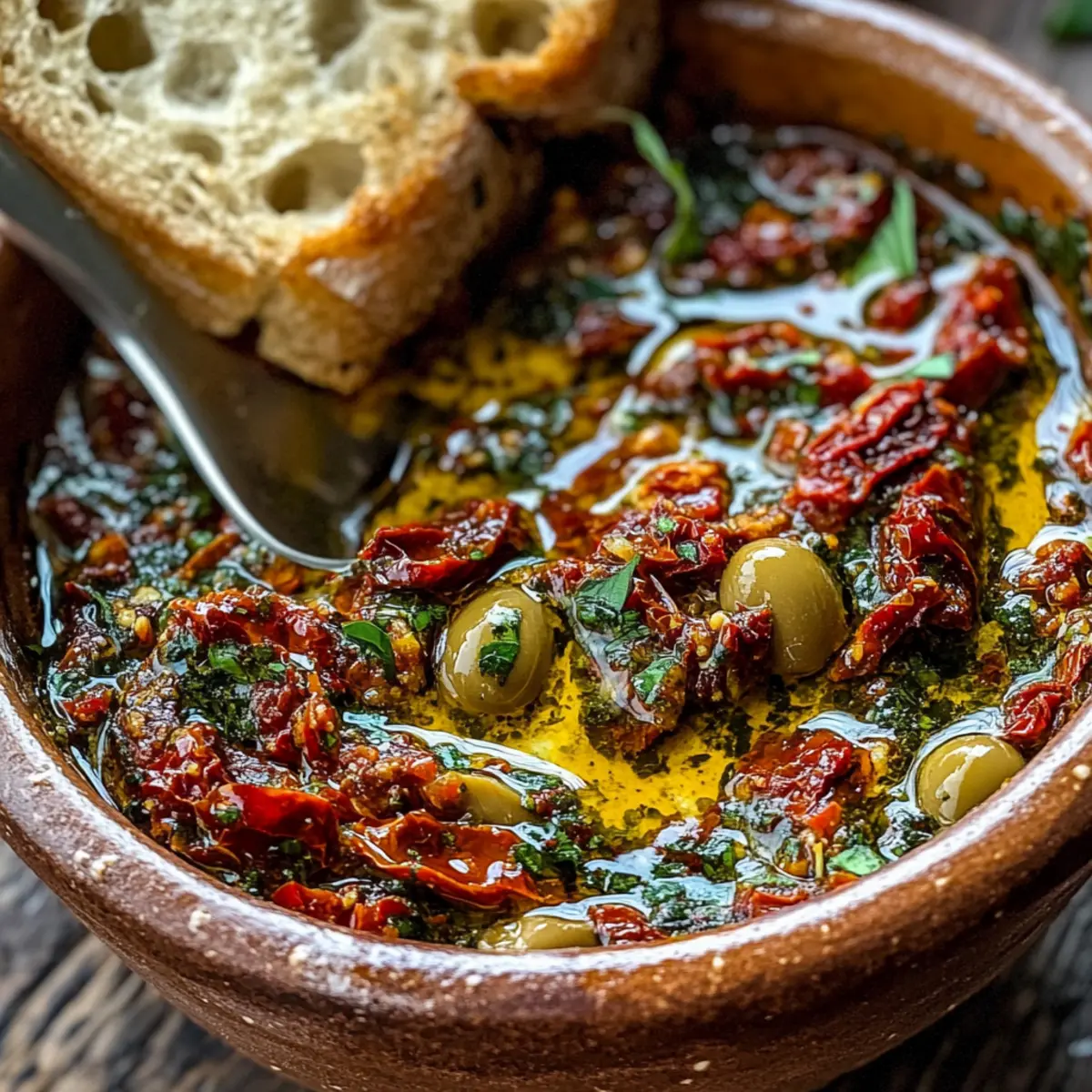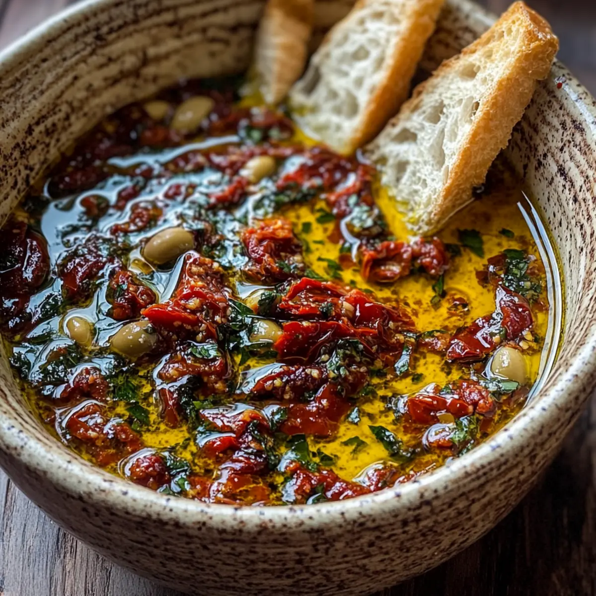Einfachheit, dieser Sonnengetrocknete Tomaten Olivenöl Brot Dip ist in nur 10 Minuten fertig – perfekt für spontane Zusammenkünfte. Reiche Aromen kommen von der Kombination aus sonnengetrockneten Tomaten, Oliven und frischem Knoblauch, die begeistert. Vielseitig einsetzbar, servieren Sie ihn zu knusprigem Brot, Crackern oder frischem Gemüse. Vegetarisch und einladend, dieser Dip ist eine großartige Wahl für jeden, der neue Geschmackserlebnisse entdecken möchte. Wenn Sie nach einer weiteren köstlichen Vorspeise suchen, probieren Sie auch unser Rezept für Knoblauchbrot Mit Kaese.
