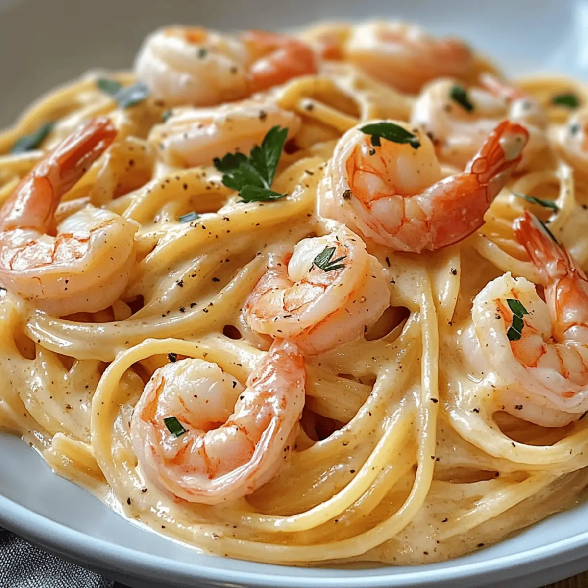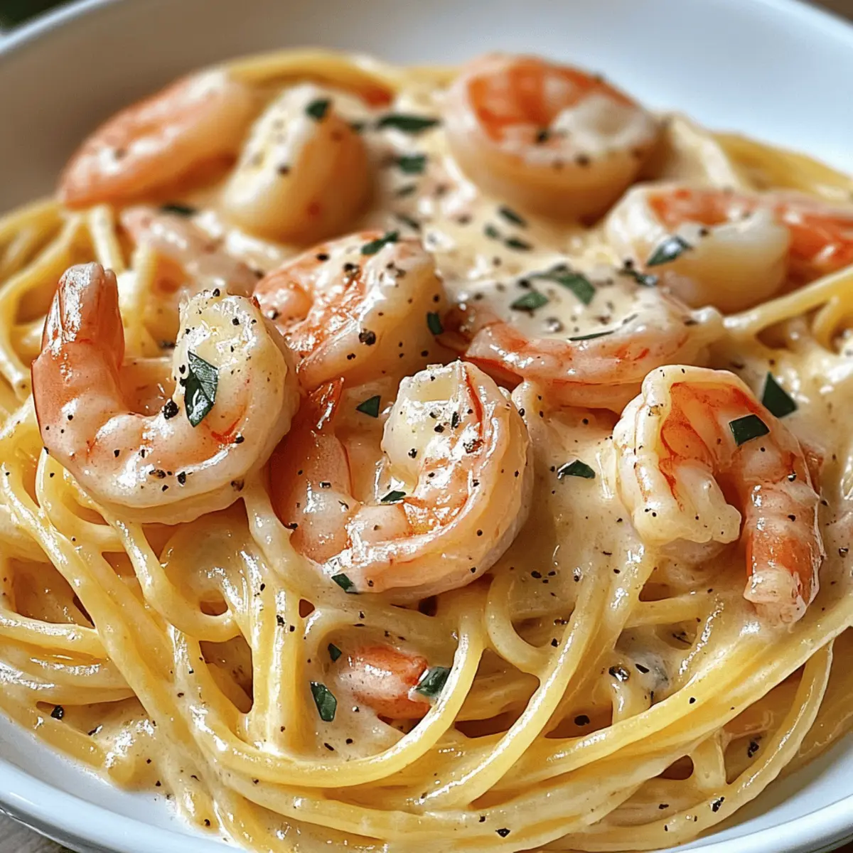 Könntest du dir ein einfaches Abendessen vorstellen, das dich mit jedem Bissen ans Mittelmeer entführt? Mein Spaghetti mit Garnelen in Frischkäsesauce ist genau das! Diese köstliche Kreation bringt zarte Garnelen und perfekt al dente Spaghetti in einer samtigen, cremigen Sauce zusammen – und das alles in weniger als 30 Minuten. Ideal für alle, die sich nach einem schnellen, aber dennoch raffinierten Gericht sehnen, das nicht nur den Gaumen erfreut, sondern auch ein echter Publikumsliebling ist! Ob als leichtes Abendessen oder Mittagsgenuss, diese Rezeptur bietet dir den perfekten Mix aus Einfachheit und Genuss. Bereit, dir einen Happen italienischen Glücks zu gönnen? Lass uns gemeinsam in die Welt der Aromen eintauchen! Warum wirst du dieses Rezept lieben? Einfachheit: Dieses Rezept ist kinderleicht und benötigt keine speziellen Kochkünste. Bereits nach 30 Minuten kannst du ein köstliches Mahl auf den Tisch bringen! Cremiger Genuss: Die Kombination aus Frischkäse und Gemüsebrühe sorgt für eine reichhaltige, cremige Sauce, die die perfekt al dente Spaghetti umhüllt. Meeresfrüchte: Zarte Garnelen bringen nicht nur Geschmack, sondern auch einen Hauch von mediterraner Eleganz auf deinen Teller. Vielseitigkeit: Du kannst die Garnelen durch andere Proteine ersetzen oder Gemüse hinzufügen, um deinem persönlichen Geschmack gerecht zu werden. Liebhaber: Dieses Gericht wird garantiert zum Hit bei Familie und Freunden, perfekt für ein unkompliziertes Abendessen! Probiere auch meine anderen köstlichen Pastarezepte für noch mehr Inspiration. Spaghetti mit Garnelen in Frischkäsesauce Zutaten Für die Pasta Spaghetti – Die Grundlage des Gerichts, du kannst auch andere Pastaformen verwenden. Für die Garnitur Garnelen – Dein proteinreicher Hauptdarsteller; wähle frische oder gefrorene Garnelen und lasse sie vorher auftauen. Für das Anbraten Olivenöl – Zum Sautieren von Zwiebeln und Knoblauch; butter kann für einen reichhaltigeren Geschmack verwendet werden. Zwiebel – Liefert Süße und Tiefe; Schalotten sind eine gute Alternative. Knoblauch – Sorgt für Aroma; frischer Knoblauch ist hier am besten. Für die Sauce Frischkäse – Kreiert die cremige Textur der Sauce; ricotta kann für eine leichtere Version genutzt werden. Gemüsebrühe – Verstärkt den Geschmack der Sauce; Hühnervorname kann verwendet werden, wenn du nicht Vegetarier bist. Schlagsahne (optional) – Steigert die Cremigkeit; kann weggelassen werden für eine leichtere Sauce. Salz und Pfeffer – Essenziell für das Würzen; nach Geschmack anpassen. Chiliflocken (optional) – Für einen Hauch von Schärfe; einfach weglassen, wenn du es milder möchtest. Zitronensaft – Bringt Frische und hebt die Aromen; frischer Zitronensaft ist am besten. Für die Garnitur Frische Kräuter (z. B. Peterli oder Basilikum) – Für das gewisse Extra; nutze die frischen Kräuter, die du zur Hand hast. Dieses Rezept für Spaghetti mit Garnelen in Frischkäsesauce ist nicht nur einfach zuzubereiten, sondern wird auch deine Geschmacksnerven verwöhnen. Lass uns gemeinsam loslegen! Schritt-für-Schritt-Anleitung für Spaghetti mit Garnelen in Frischkäsesauce Step 1: Wasser kochen Bring einen großen Topf mit reichlich gesalzenem Wasser zum Kochen. Füge die Spaghetti hinzu und koche sie für etwa 8-10 Minuten al dente, bis sie weich, aber noch bissfest sind. Vergiss nicht, 100 ml vom Kochwasser aufzuheben, bevor du die Nudeln abgießt. Step 2: Zwiebeln und Knoblauch anbraten Erhitze in einer großen Pfanne bei mittlerer Hitze 2 Esslöffel Olivenöl. Füge die gehackte Zwiebel hinzu und brate sie etwa 3-4 Minuten an, bis sie glasig ist. Gib dann den fein gehackten Knoblauch dazu und brate ihn für weitere 30 Sekunden, bis er aromatisch ist. Step 3: Garnelen garen Füge die vorbereiteten Garnelen in die Pfanne und brate sie für 2-3 Minuten, bis sie pink und durchgegart sind. Achte darauf, dass du sie nicht überkochst, da sie sonst zäh werden. Beträufle sie mit Zitronensaft, nehme sie dann aus der Pfanne und lege sie beiseite. Step 4: Sauce zubereiten Gib in die gleiche Pfanne den Frischkäse und die Gemüsebrühe hinzu. Rühre die Mischung bei mittlerer Hitze, bis sie glatt und cremig ist. Wenn du eine reichhaltigere Sauce möchtest, füge die Schlagsahne hinzu. Würe die Sauce mit Salz, Pfeffer und optional mit Chiliflocken. Step 5: Spaghetti kombinieren Füge die abgetropften Spaghetti und die gebratenen Garnelen zurück in die Pfanne. Mische alles gut durch, damit die Nudeln von der cremigen Sauce umhüllt sind. Falls nötig, füge schrittweise das aufbewahrte Kochwasser hinzu, um die Konsistenz der Sauce anzupassen. Step 6: Servieren Erhitze das Gericht vorsichtig, bis alles warm ist, ohne die Sauce zu überhitzen. Serviere die Spaghetti mit Garnelen in Frischkäsesauce heiß und garniere sie nach Belieben mit frischen Kräutern wie Petersilie oder Basilikum für einen zusätzlichen Frischekick. Was passt zu Spaghetti mit Garnelen in Frischkäsesauce? Der perfekte Begleiter zu deinem köstlichen Pasta-Gericht kann das Esserlebnis auf ein neues Level heben. Frischer grüner Salat: Ein leichtes und knackiges Salatbett sorgt für einen erfrischenden Kontrast zur cremigen Sauce und bietet eine optimale Balance. Verfeinere ihn mit einem einfachen Zitronen-Dressing, um die Aromen der Spaghetti zu unterstreichen. Crusty Brot: Knuspriges Baguette oder Ciabatta ist ideal, um die köstliche Sauce aufzusaugen. Es fügt nicht nur Textur hinzu, sondern ist auch perfekt für ein gemütliches Dinner. Weißwein: Ein Glas Sauvignon Blanc oder Pinot Grigio passt herrlich zu den Garnelen, verstärkt die Meeresfrüchte-Aromen und erfrischt den Gaumen. Die fruchtigen Noten ergänzen den delikaten Geschmack der Sauce. Gedämpftes Gemüse: Überrasche deine Gäste mit leicht gedämpften Brokkoli oder Spargel. Sie bringen nicht nur Farbe auf den Tisch, sondern auch eine gesunde Komponente knuspriger Frische, die das Gericht abrundet. 