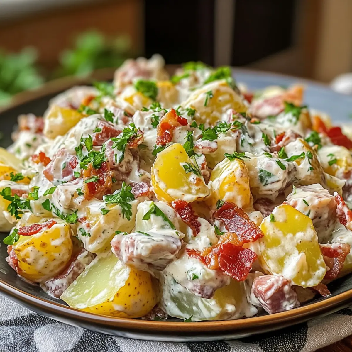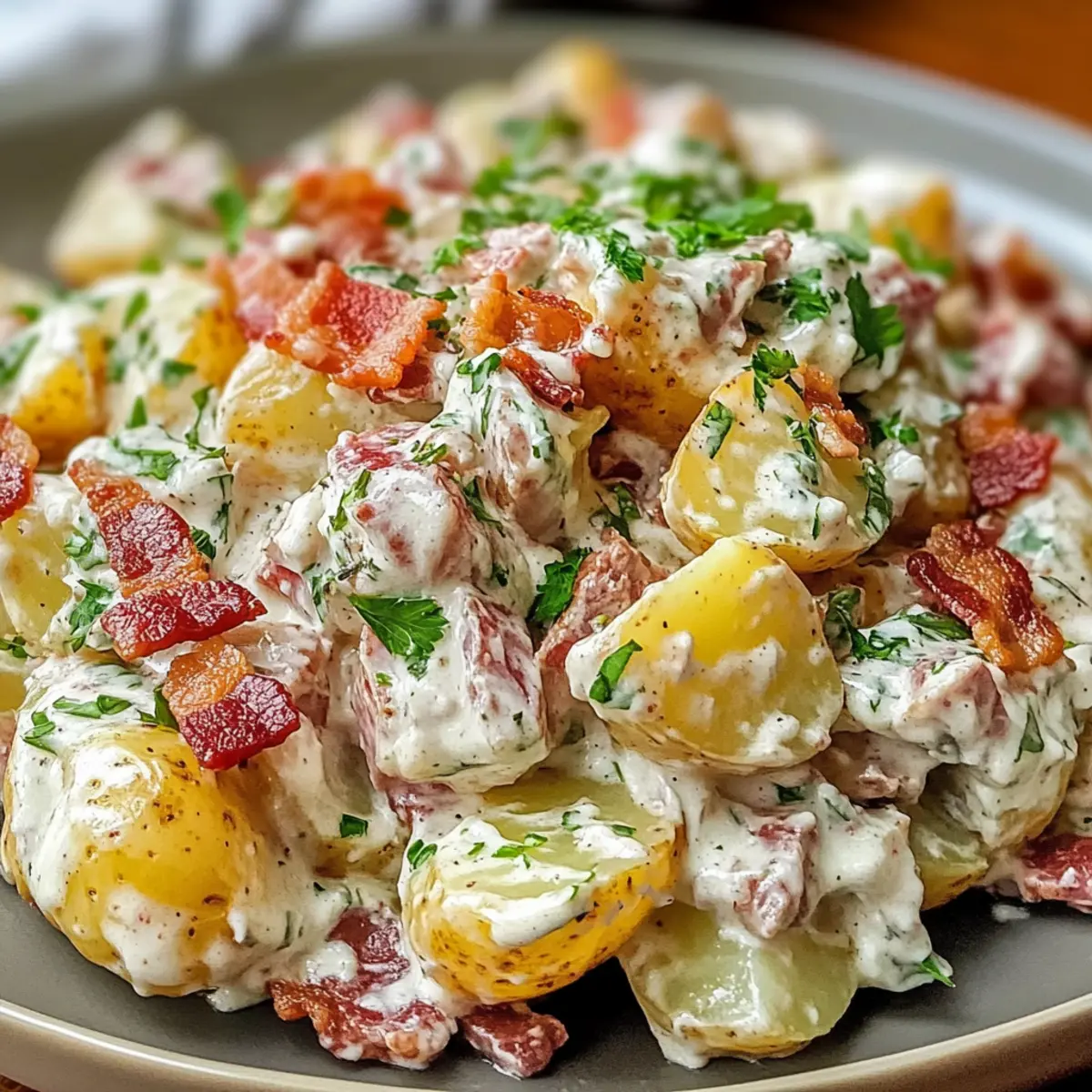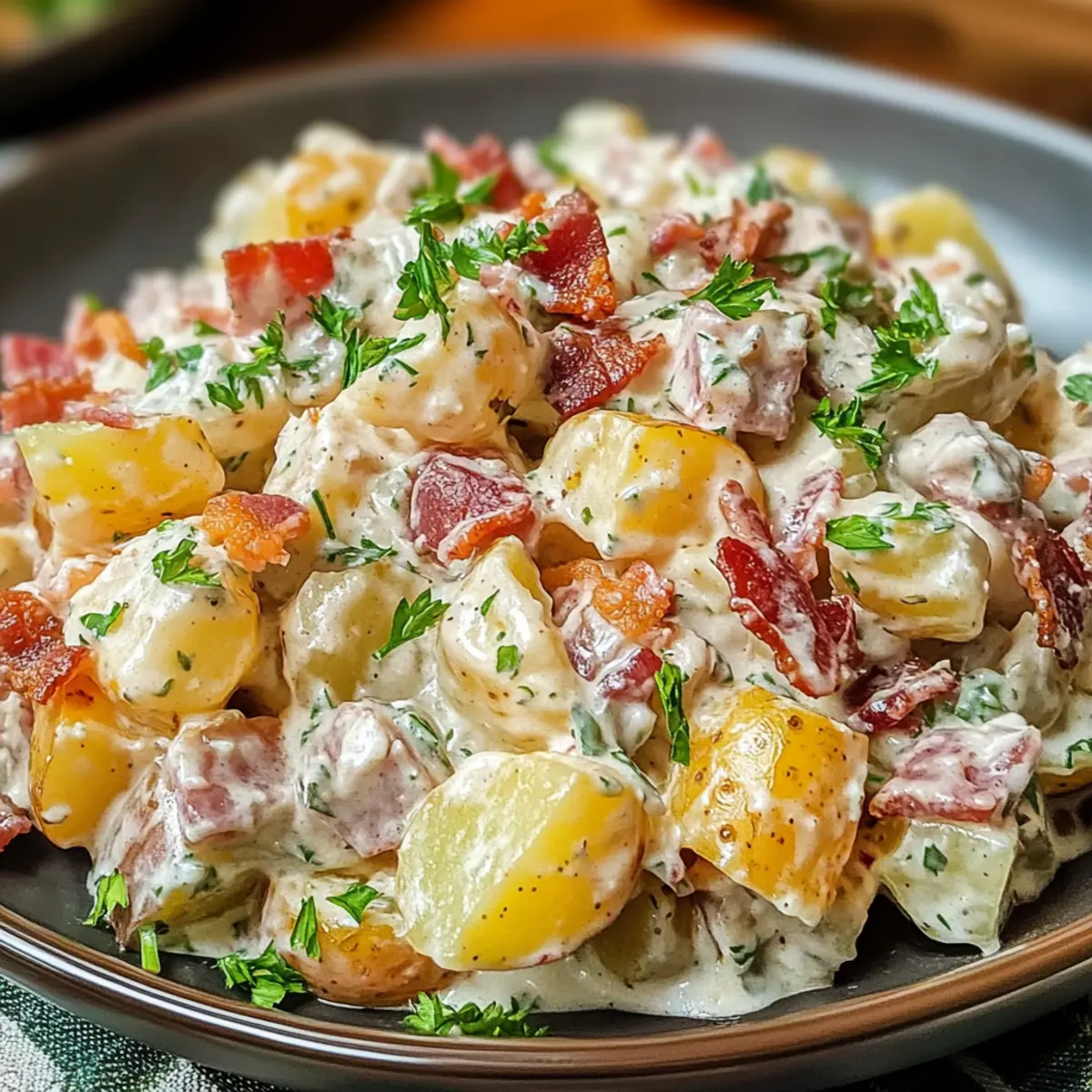 Wenn ich an ein gemütliches BBQ denke, kommt sofort der Gedanke an einen köstlichen Steakhouse Kartoffelsalat. Dieser cremige Begleiter verwandelt jede Grillfeier in ein Fest für die Sinne! Zarte rote Kartoffeln, knuspriger Speck und eine pikante Dijon-Senf-Dressing vereinen sich zu einem wahrhaft unwiderstehlichen Erlebnis. Das Beste daran? Dieser salzige Publikumsliebling ist nicht nur kinderleicht zuzubereiten, sondern auch vollkommen anpassbar – so kannst du deine eigenen Lieblingszutaten hinzufügen und jeden Geschmack zufriedenstellen. Perfekt für den Vorrat oder als kühler Snack an heißen Tagen: Der Steakhouse Kartoffelsalat sorgt für Begeisterung bei Familie und Freunden. Neugierig geworden, wie du dieses Rezept ganz einfach selbst zubereiten kannst? Lass uns gleich loslegen! Warum wirst du diesen Kartoffelsalat lieben? Kremige Textur: Der steakhouse Kartoffelsalat bietet eine unvergleichlich cremige Basis dank zarter roter Kartoffeln und einer köstlichen Mischung aus Mayonnaise und Sauerrahm. Vielfältige Anpassungen: Lass deiner Kreativität freien Lauf! Ergänze dein Rezept mit diced celery oder frischen Kräutern, um jedem Biss eine persönliche Note zu verleihen. Zeitersparnis: Perfekt zum Vorbereiten – dieser Salat lässt sich einen Tag im Voraus zubereiten, ideal für stressfreie Grillabende. Crowd-Pleaser: Egal, ob bei einem Familienfest oder BBQ, dieser Salat sorgt garantiert für begeisterte Rückmeldungen. Jeder wird nach dem Rezept fragen! Frische Aromen: Mit einer Prise frischen Dill und knusprigem Speck wird der Geschmack zu einem echten Genuss – warum nicht auch mal mit Kartoffelsalat Speck Kaese kombinieren? So machst du das Beste aus beiden Welten! Steakhouse Kartoffelsalat Zutaten • Für die Kartoffeln Rote Kartoffeln – bilden die cremige Basis; du kannst die Schale für mehr Textur dranlassen oder sie schälen. • Für das Dressing Mayonnaise – sorgt für die Cremigkeit; als Alternative kann griechischer Joghurt verwendet werden, um das Gericht zu erleichtern. Sauerrahm – verstärkt den Geschmack und die Reichhaltigkeit; ebenfalls durch griechischen Joghurt ersetzbar. Dijon-Senf – bringt eine würzige Note; probiere auch grobkörnigen Senf für einen anderen Geschmack. Apfelessig – sorgt für die nötige Säure und balanciert die Aromen. • Für die zusätzlichen Zutaten Rote Zwiebel – fein gehackt für Geschmack und Biss; ersetze sie durch Frühlingszwiebeln für eine mildere Variante. Knuspriger Speck – verleiht dem Salat einen herzhaften Crunch; versuche Puten-Bacon für eine leichtere Option. Geriebener Käse – Cheddar ist klassisch für zusätzlichen Geschmack; jede andere schmelzende Käsesorte kann ebenfalls verwendet werden. Essiggurken – bringen eine pikante Note; als Ersatz eignen sich auch Kapern oder Oliven für eine besondere Note. Frische Petersilie & Schnittlauch – für das Garnieren und frische Aromen. Schritt-für-Schritt-Anleitung für Steakhouse Kartoffelsalat Step 1: Kartoffeln kochen Wasche 900 g rote Kartoffeln gründlich und lege sie in einen großen Topf. Bedecke sie mit kaltem, gesalzenem Wasser und bringe alles zum Kochen. Lasse die Kartoffeln 10-15 Minuten köcheln, bis sie mit einer Gabel leicht durchstochen werden können. Gieße das Wasser ab und lasse die Kartoffeln vollständig abkühlen, damit sie den Dressing nicht verwässern. Step 2: Dressing zubereiten In einer großen Schüssel vermengst du 240 ml Mayonnaise, 120 ml Sauerrahm, 2 Esslöffel Dijon-Senf und 1 Esslöffel Apfelessig. Mit einem Schneebesen alles gut verrühren, bis eine glatte, cremige Masse entsteht. Dieser Dressing sorgt für die unverwechselbare Cremigkeit des Steakhouse Kartoffelsalats, also nimm dir Zeit, um alle Zutaten gut zu kombinieren. Step 3: Zutaten mischen Wenn die Kartoffeln abgekühlt sind, schneide sie in mundgerechte Stücke und gib sie in eine große Schüssel. Füge fein gehackte rote Zwiebel, knusprigen Speck, geriebenen Käse, Petersilie und gewürfelte Essiggurken hinzu. Falte die vorbereitete Dressing-Mischung vorsichtig unter die Kartoffeln, sodass jeder Bissen gleichmäßig bedeckt ist und die leckeren Zutaten verbunden werden. Step 4: Abschmecken Füge nach Geschmack Salz und Pfeffer hinzu, um die Aromen des Steakhouse Kartoffelsalats zu betonen. Rühre sanft um, um die Gewürze gleichmäßig zu verteilen, ohne die Kartoffeln zu zerdrücken. Probiere vor dem Servieren, um sicherzugehen, dass die Gewürze deinen Vorlieben entsprechen. Step 5: Salat kühlen Decke die Schüssel mit Frischhaltefolie ab oder fülle den Salat in ein luftdichtes Behältnis um. Stelle den Steakhouse Kartoffelsalat für mindestens 1 Stunde in den Kühlschrank, damit sich die Aromen gut entfalten. Je länger er kühlt, desto besser wird der Geschmack – also lass ihm Zeit! Step 6: Garnieren und Servieren Vor dem Servieren nimm den Salat aus dem Kühlschrank und rühre ihn vorsichtig nochmal durch, damit alles gleichmäßig verteilt ist. Garniere ihn mit frischem Schnittlauch oder Petersilie für einen Farbtupfer und zusätzlichen Geschmack. Serviere den Steakhouse Kartoffelsalat gut gekühlt und genieße ihn als perfekten Begleiter zu deinem BBQ! Lagerungstipps für Steakhouse Kartoffelsalat Raumtemperatur: Bei Raumtemperatur nicht länger als 2 Stunden aufbewahren, um die Qualität zu sichern. Kühlschrank: Im Kühlschrank hält sich der Steakhouse Kartoffelsalat bis zu 3 Tage in einem luftdichten Behälter. Vor dem Servieren nochmals gut durchmischen. Einfrieren: Für längere Lagerung kann der Salat bis zu einem Monat eingefroren werden. Denke daran, ihn über Nacht im Kühlschrank auftauen zu lassen und ggf. mit zusätzlicher Mayonnaise aufzufrischen. Wiederehitzen: Der Salat sollte nicht erneut erhitzt, sondern direkt kalt serviert werden, um die frischen Aromen zu bewahren. Steakhouse Kartoffelsalat Variationen Lass deiner Kreativität freien Lauf und entdecke, wie du diesen köstlichen Kartoffelsalat nach deinem Geschm