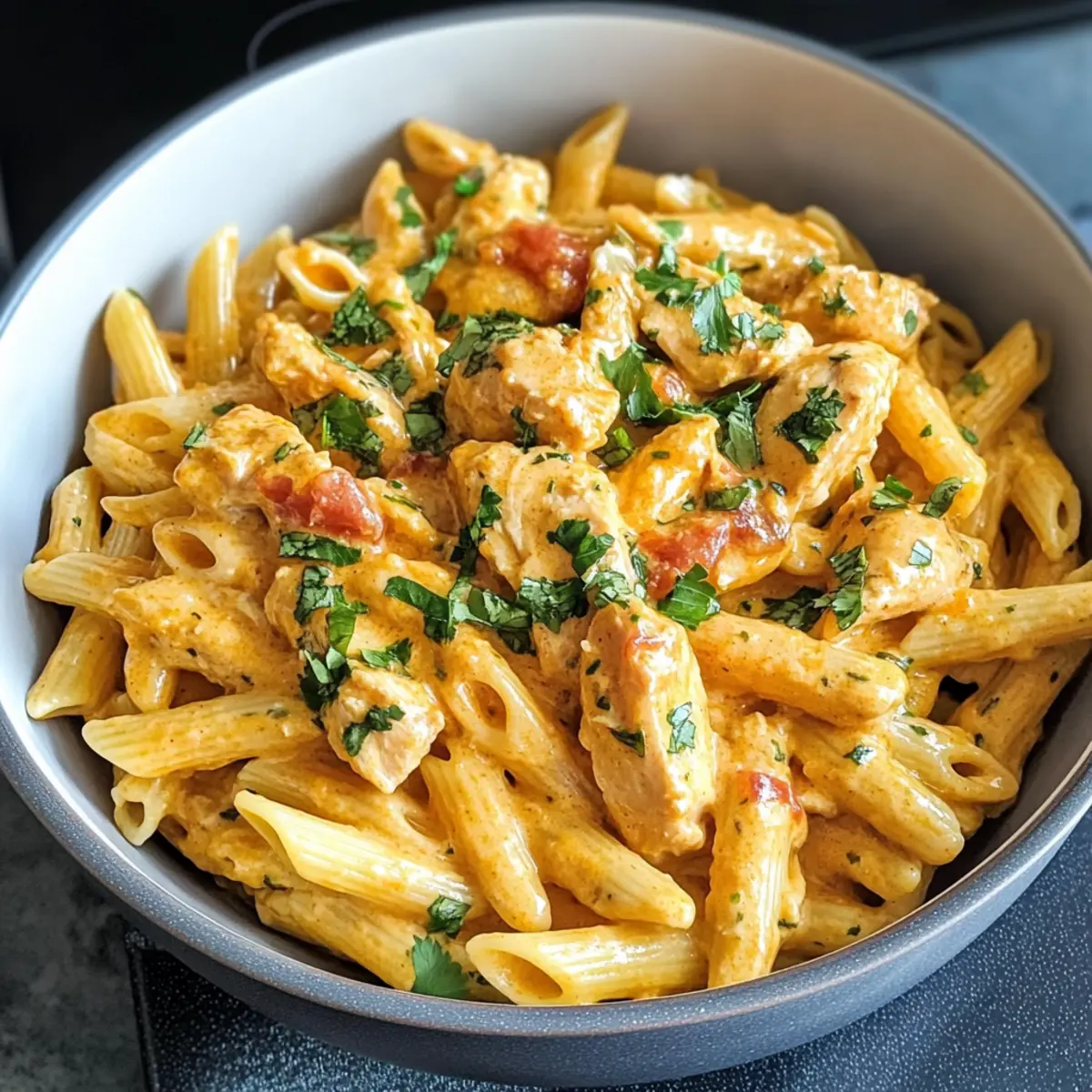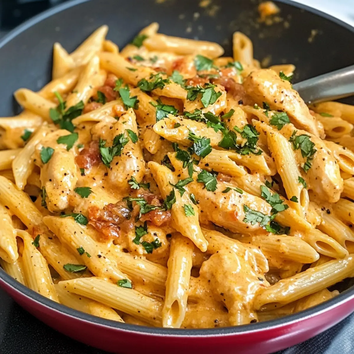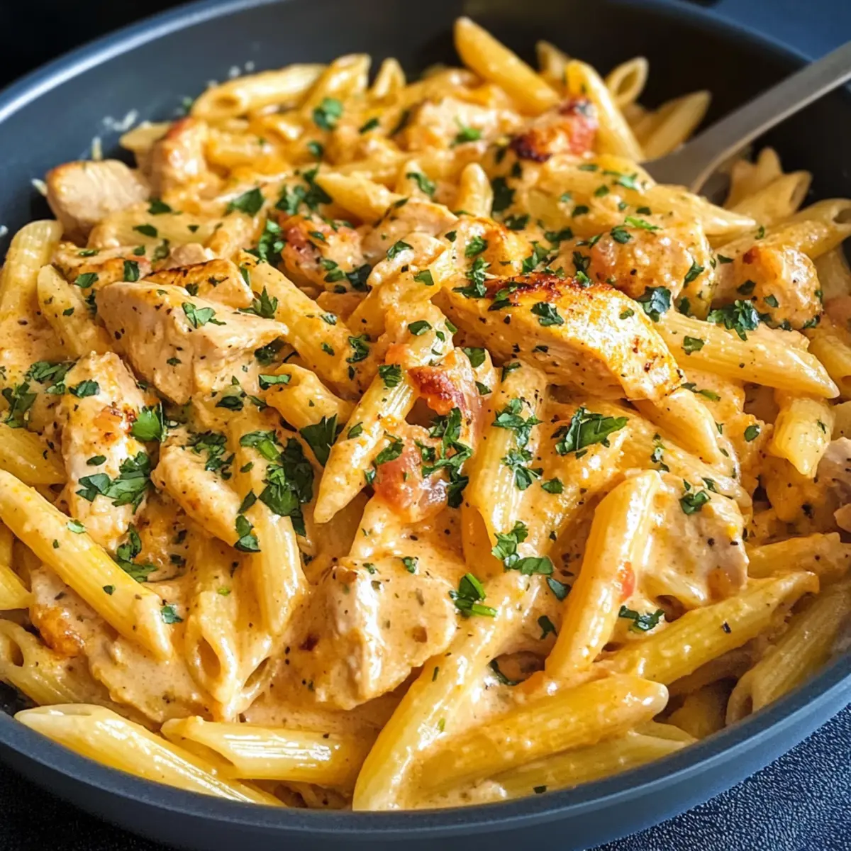 „Könnte bitte jemand das Abendessen übernehmen?“ hörte ich meine Familie seufzen, während sie auf die Uhr schaute. Manchmal ruft das Leben einfach nach schnellen Lösungen, aber ich bin hier, um dir zu zeigen, dass ein köstliches, hausgemachtes Gericht keine große Herausforderung sein muss. Mein Rezept für das Südwestliche Hähnchen Alfredo bringt würzige Aromen und eine cremige Textur auf den Tisch – es ist nicht nur ein schnelles Abendessen, sondern auch ein echter Publikumsliebling. Die Kombination aus zarten Hühnchenstücken, einer unwiderstehlichen Käsesauce und perfekt al dente Penne-Pasta verwandelt jede Mahlzeit in ein geschmackliches Fest. Wer könnte da widerstehen? Lass uns gemeinsam herausfinden, wie einfach dieses Rezept zubereitet werden kann! Warum wirst du dieses Rezept lieben? Einfachheit: Die Zubereitung ist kinderleicht und erfordert nur grundlegende Kochfähigkeiten – perfekt für hektische Abende! Würzige Aromen: Die Kombination aus zarten Hähnchenstücken und einer cremigen Käsesauce sorgt für ein geschmackliches Erlebnis, das sich von typischen Nudelgerichten abhebt. Familienfreundlich: Dieses Gericht sind bei Groß und Klein beliebt und machen selbst wählerische Esser glücklich! Vielseitigkeit: Du kannst mühelos Gemüse wie Spinat oder Paprika hinzufügen, um das Gericht noch gesünder zu gestalten. Schnelles Abendessen: In unter 30 Minuten zubereitet – der perfekte Alltagsheld für deine Familienessen! Wenn du auf der Suche nach weiteren einfachen und leckeren Pasta-Rezepten bist, schau dir auch unser Rezept für cremige Pasta mit Lachs an! Südwestlichen Hähnchen Alfredo Zutaten • Um dir beim Kochen zu helfen, habe ich die Zutaten für das köstliche Südwestliche Hähnchen Alfredo aufgelistet. Penne Pasta – Halten die Sauce perfekt und können durch Rotini, Ziti oder Farfalle ersetzt werden. Hähnchenbrust – Liefert wertvolles Eiweiß; benutze auch Haut- und Knochenteile für mehr Geschmack. Dosen-Tomaten – Fügt Feuchtigkeit hinzu und kann durch zerdrückte Tomaten ersetzt werden. Schlagsahne – Kreiert die cremige Sauce; für eine leichtere Variante kannst du verdampfte Milch verwenden. Cheddar-Käse – Verleiht Geschmack und Cremigkeit; scharfer oder milder Cheddar ergänzt das Gericht hervorragend. Zwiebel – Fügt Süße und Tiefe hinzu; gelbe, weiße oder süße Zwiebeln sind alle geeignet. Knoblauchzehen – Bringt einen aromatischen Geschmack; frisch gehackter Knoblauch sorgt für beste Ergebnisse. Honig – Balanciert die herzhaften Elemente; Ahornsirup kann als Alternative verwendet werden. Koriander – Ausgabe einen frischen Geschmack als Garnitur; kann durch Petersilie ersetzt oder weggelassen werden. Olivenöl – Unentbehrlich zum Anbraten des Hähnchens; kann durch Rapsöl ersetzt werden. Butter – Sorgt für einen reichen Geschmack der Sauce; sowohl gesalzene als auch ungesalzene Varianten sind akzeptabel. Chilipulver, Kreuzkümmel, Oregano, Paprika, schwarzer Pfeffer, Salz, Cayenne – Sorgt für das Südwestliche Geschmacksprofil; die Menge kann je nach Schärfewunsch angepasst werden. Jetzt bist du bereit für die Zubereitung dieses leckeren Gerichts! Schritt-für-Schritt-Anleitung für das Südwestliche Hähnchen Alfredo Schritt 1: Gewürze vorbereiten Mische in einer kleinen Schüssel das Chilipulver, Kreuzkümmel, Oregano, Paprika, schwarzen Pfeffer, Salz und Cayennepfeffer. Dies wird deinem Südwestlichen Hähnchen Alfredo den perfekten würzigen Kick verleihen. Stelle die Mischung beiseite, während du die weiteren Zutaten vorbereitest. Schritt 2: Hähnchen würzen In einer großen Schüssel kombinierst du die zugeschnittenen Hähnchenstücke mit Honig und der Hälfte der vorbereiteten Gewürzmischung. Tossiere das Hähnchen gut, sodass es gleichmäßig bedeckt ist. Lass es einige Minuten ruhen, damit die Aromen einziehen können. Schritt 3: Pasta kochen Bringe in einem großen Topf ausreichend Wasser zum Kochen und füge eine Prise Salz hinzu. Koche die Penne-Pasta gemäß der Verpackungsanleitung al dente (ca. 10-12 Minuten). Wenn sie fertig sind, gieße sie ab und stelle sie beiseite, während du die Sauce zubereitest. Schritt 4: Hähnchen anbraten Erhitze in einer großen Pfanne bei mittlerer Hitze etwas Olivenöl. Füge das gewürzte Hähnchen hinzu und brate es etwa 6-8 Minuten lang, bis es goldbraun und vollständig durchgegart ist (die Innentemperatur sollte 75°C betragen). Nimm das Hähnchen anschließend aus der Pfanne und lege es auf einen Teller. Schritt 5: Gemüse anbraten Gib die Butter in die gleiche Pfanne und füge die gewürfelte Zwiebel hinzu. Brate sie ca. 3-4 Minuten, bis sie weich und leicht goldbraun ist. Füge dann den frisch gehackten Knoblauch hinzu und brate ihn eine weitere Minute, bis er aromatisch ist. Schritt 6: Sauce zubereiten Rühre die Dosentomaten und die restlichen Gewürze in die Pfanne ein. Lass die Mischung sanft köcheln und verrühre sie gut. Nach ein paar Minuten fügst du die Schlagsahne langsam hinzu und rührst kontinuierlich, bis die Sauce schön cremig und gut vermischt ist. Senke die Hitze auf ein niedriges Köcheln. Schritt 7: Hähnchen und Käse hinzufügen Gib das gebratene Hähnchen zurück in die Pfanne und füge den geriebenen Cheddar-Käse hinzu. Rühre gut um, bis der Käse geschmolzen ist und die Sauce eine schöne, cremige Konsistenz hat. Schritt 8: Kombination Füge die gekochte Penne-Pasta in die Pfanne hinzu und vermische alles gründlich, sodass die Pasta gleichmäßig mit der leckeren Sauce ummantelt ist. Lass das Gericht einige Minuten ruhen, damit die Aromen sich entfalten, bevor du es mit frischem Koriander garnierst und servierst. Expertentipps für Südwestlichen Hähnchen Alfredo Richtige Temperatur: Achte darauf, dass das Hähnchen bei 75°C (165°F) durchgegart ist, um Saftigkeit und Sicherheit zu gewährleisten. Einfache Abwandlungen: Um mehr Geschmack hinzuzufügen, kannst du auch schwarze Bohnen oder Mais zur Sauce geben,