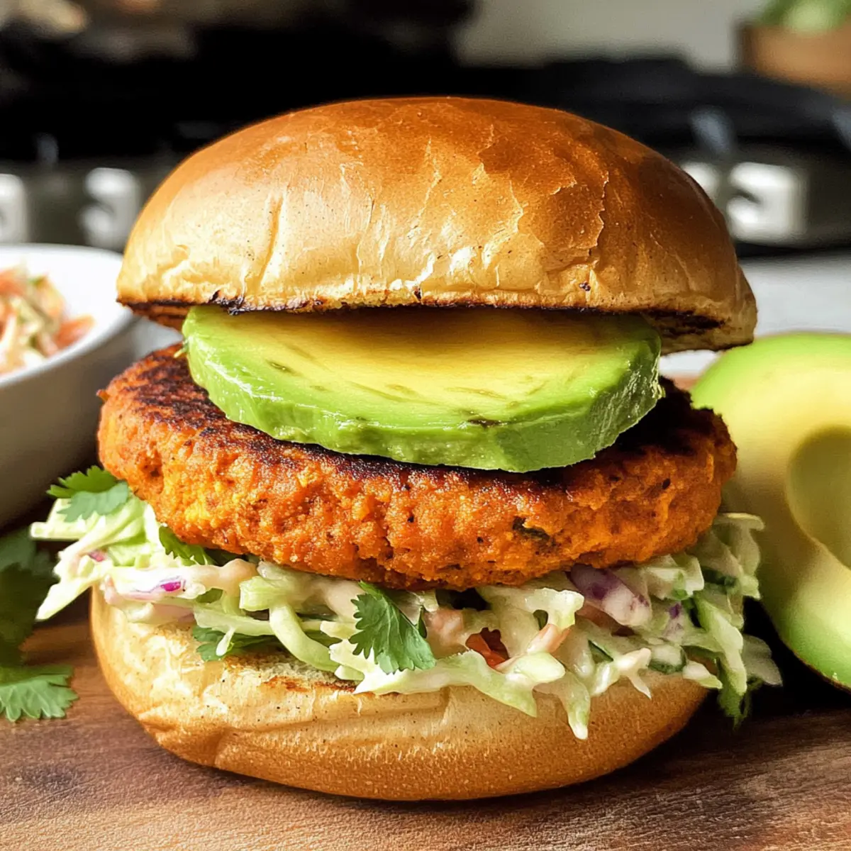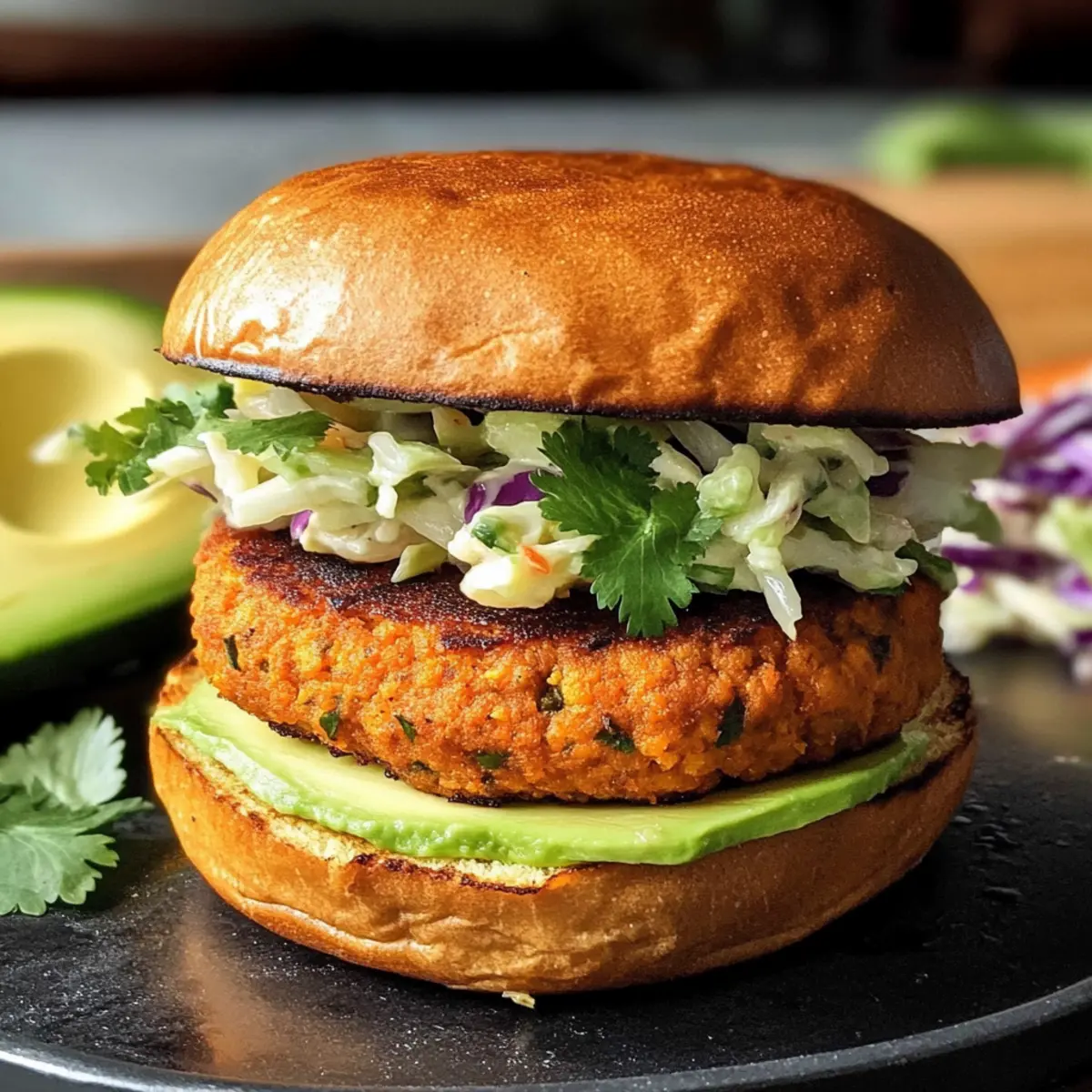 5. Burger auf Brötchen anrichten und mit Avocado oder Coleslaw garnieren.