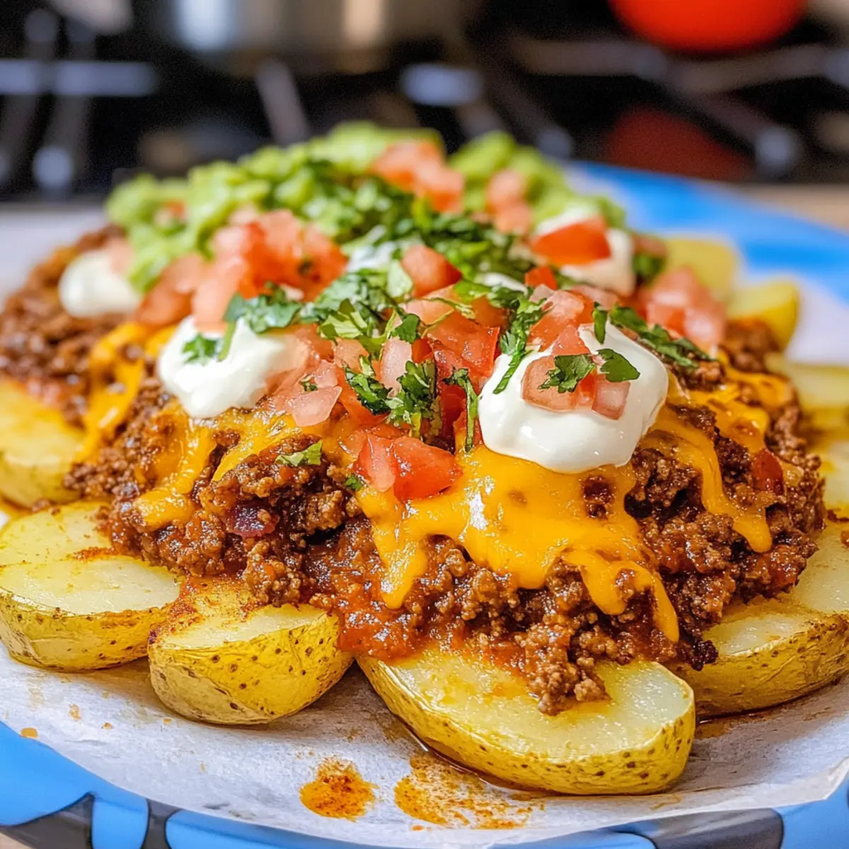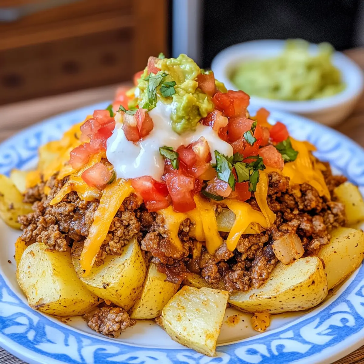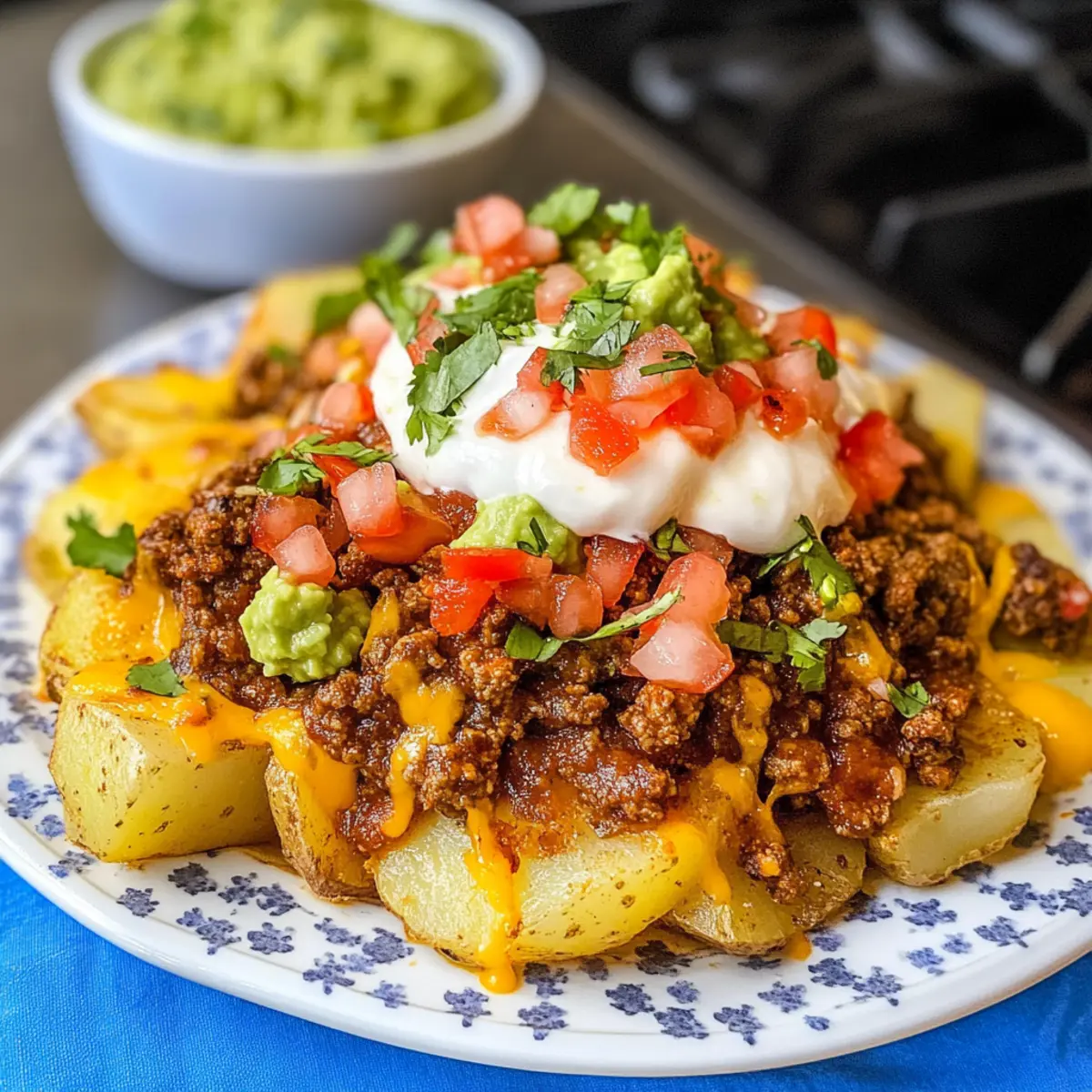 Während ich kürzlich in meiner Küche stand, überkam mich ein herrlicher Duft, der mich direkt an einen lebhafteren Markt in Mexiko erinnerte. Taco Kartoffeln sind mein neuestes Lieblingsrezept, das in nur 30 Minuten eine köstliche Kombination aus knusprigen Kartoffeln und der würzigen Füllung von Tacos bietet. Diese kreative Abwandlung vereint die gemütlichen Texturen von Bratkartoffeln mit dem beliebten Geschmack von Tacos – perfekt für alle, die auf der Suche nach schnellem Komfortessen sind. Du kannst die Taco Kartoffeln nach deinen Wünschen anpassen, indem du verschiedene Beläge und Gewürze wählst, sodass jeder Biss ein neues Erlebnis wird. Bist du bereit, mit mir in die Welt der Taco Kartoffeln einzutauchen und deine nächste Dinner-Party zu einem Hit zu machen? Warum sind Taco Kartoffeln ein Hit? Unvergleichlicher Geschmack: Die Kombination aus würzigem Hackfleisch, schmelzendem Käse und knusprigen Kartoffeln ist einfach unwiderstehlich. Schnelligkeit: In nur 30 Minuten zubereitet, sind sie die perfekte Lösung für hektische Tage. Vielseitigkeit: Du kannst sie einfach nach deinem Geschmack anpassen, indem du verschiedene Toppings wie Guacamole oder Pico de Gallo hinzufügst. Geselligkeit: Ideal, um sie bei einem gemütlichen Abendessen mit Freunden zu servieren – jeder kann seine Taco Kartoffeln individuell gestalten! Einfache Zubereitung: Selbst Kochanfänger können mit diesem Rezept punkten und jeden begeistern. Wenn du nach alternativen und ebenso köstlichen Gerichten suchst, probiere auch Spargelauflauf Kartoffeln Schinken oder Hähnchen Bohnen Kartoffeln aus. Taco Kartoffeln Zutaten Für die Kartoffeln Russet Kartoffeln (900 g) – bieten eine herzhafte Basis für dein Gericht; du kannst auch rote oder Süßkartoffeln für andere Geschmäcker verwenden. Öl (3-4 Esslöffel) – sorgt dafür, dass die Kartoffeln im Airfryer knusprig werden; verwende Olivenöl oder Rapsöl nach Vorliebe. Salz (1 ½ Teelöffel) – hebt den Geschmack hervor; passe die Menge nach deinem persönlichen Geschmack an. Schwarzer Pfeffer (½ Teelöffel) – fügt eine leichte Schärfe hinzu; du kannst die Menge erhöhen, wenn du es heißer magst. Knoblauchpulver (1 Teelöffel) – bringt eine aromatische Tiefe ins Gericht; frischer Knoblauch kann für einen intensiveren Geschmack verwendet werden. Zwiebelpulver (1 Teelöffel) – ergänzt den Knoblauch und verleiht eine süßliche Note dazu; frische Zwiebeln sind ebenfalls möglich, erfordern jedoch eine Anpassung der Kochschritte. Für die Füllung Rinderhackfleisch (450 g) – die Hauptproteinquelle; kann durch Putenhackfleisch oder pflanzliche Alternativen ersetzt werden. Taco-Gewürzmischung (1 Päckchen) – sorgt für den perfekten Geschmack des Hackfleisches; ziehe hausgemachte Mischungen in Betracht, um Zusatzstoffe zu vermeiden. Wasser – menge nach den Anweisungen der Taco-Gewürzmischung; wichtig für die richtige Gewürzaufnahme. Für das Topping Mexikanischer Käse-Mix (225 g) – schmilzt köstlich über den Kartoffeln; du kannst auch Cheddar oder eine milchfreie Mischung verwenden. Optionale Toppings – Pico de Gallo, Guacamole, saure Sahne; passe sie je nach Vorliebe und Verfügbarkeit an. Die Taco Kartoffeln sind nicht nur köstlich, sondern auch anpassungsfähig und schnell zubereitet. Lass deiner Kreativität freien Lauf und genieße jede Bissen! Schritt-für-Schritt-Anleitung für Taco Kartoffeln Step 1: Airfryer vorheizen Heize deinen Airfryer auf 200°C (400°F) vor. Dies dauert etwa 5 Minuten und sorgt dafür, dass die Taco Kartoffeln von Anfang an schön knusprig werden. Während der Vorheizzeit kannst du deine Kartoffeln vorbereiten. Step 2: Kartoffeln vorbereiten Schäle die Russet Kartoffeln und schneide sie in gleichmäßige Würfel. Gib die Kartoffelwürfel in eine Schüssel und füge 3-4 Esslöffel Öl sowie Salz, Pfeffer, Knoblauchpulver und Zwiebelpulver hinzu. Vermische alles gut, sodass die Würfel gleichmäßig mit den Gewürzen und dem Öl bedeckt sind. Step 3: Kartoffeln im Airfryer garen Platziere die gewürzten Kartoffeln gleichmäßig im Airfryer-Korb, sodass sie nicht überlappen. Gare die Kartoffeln bei 200°C für 18-20 Minuten, schüttel den Korb alle 6-7 Minuten, um sicherzustellen, dass sie gleichmäßig goldbraun und knusprig werden. Step 4: Rinderhackfleisch anbraten Erhitze während die Kartoffeln garen eine Pfanne bei mittlerer Hitze. Gib das Rinderhackfleisch in die Pfanne und brate es an, bis es gleichmäßig gebräunt und krümelig ist. Das dauert etwa 5-7 Minuten. Lasse überschüssiges Fett abtropfen, um das Gericht leichter zu machen. Step 5: Taco-Gewürz hinzufügen Füge das Taco-Gewürz und die benötigte Wassermenge hinzu, die auf der Gewürzmischung angegeben ist. Rühre gut um und lasse die Mischung für 3-5 Minuten köcheln, bis das Wasser reduziert ist und die Gewürze gut in das Fleisch eingezogen sind. Step 6: Taco Kartoffeln zusammensetzen Wenn die Kartoffeln goldbraun und knusprig sind, nimm sie aus dem Airfryer. Schichte zuerst die Kartoffeln auf einen Teller, gefolgt von der gewürzten Hackfleischmischung. Streue den Mexikanischen Käse-Mix großzügig darüber, sodass er gleichmäßig schmilzt und eine leckere, klebrige Schicht bildet. Step 7: Optional Toppings hinzufügen Gestalte deine Taco Kartoffeln lebendig mit verschiedenen Toppings. Ergänze sie mit frischem Pico de Gallo, cremiger Guacamole oder einem Klecks saurer Sahne. Diese kreativen Elemente verleihen dem Gericht nicht nur Farbe, sondern auch zusätzliche Geschmäcker und Texturen. Step 8: Servieren Serviere die Taco Kartoffeln heiß und genieße sie sofort! Diese Kombination aus knusprigen Kartoffeln, würzigem Hackfleisch und geschmolzenen Käse kann jede Dinner-Party zum Erfolg machen – perfekt, um Freunde und Familie zu erfreuen! What to Serve with Taco Kartoffeln Lass uns gemeinsam eine köstliche Mahlzeit kreieren, die mit den würzigen Taco Kartoffeln harmoniert! Cremiger Guacamole: Seine