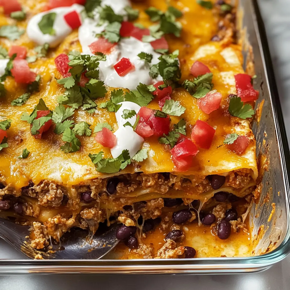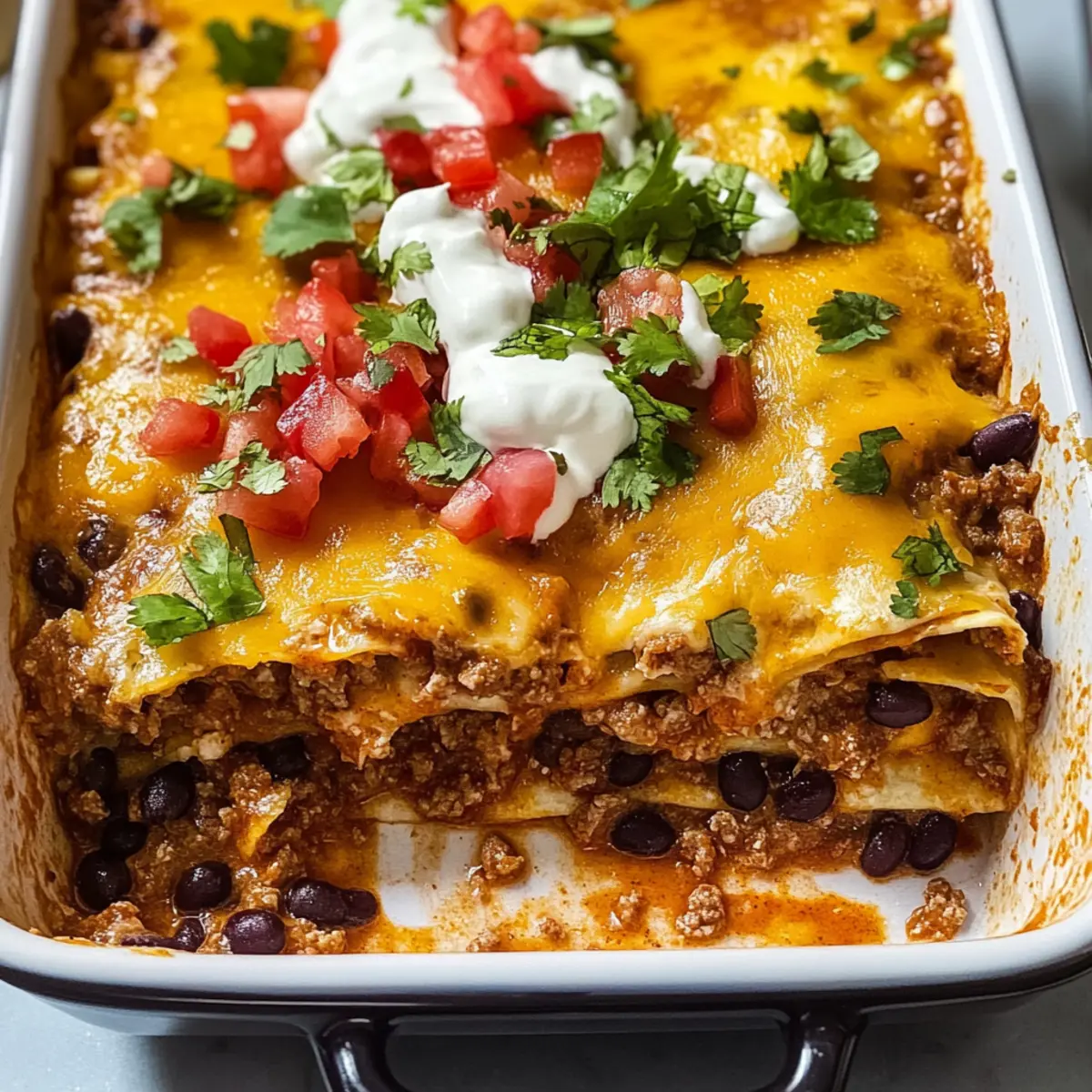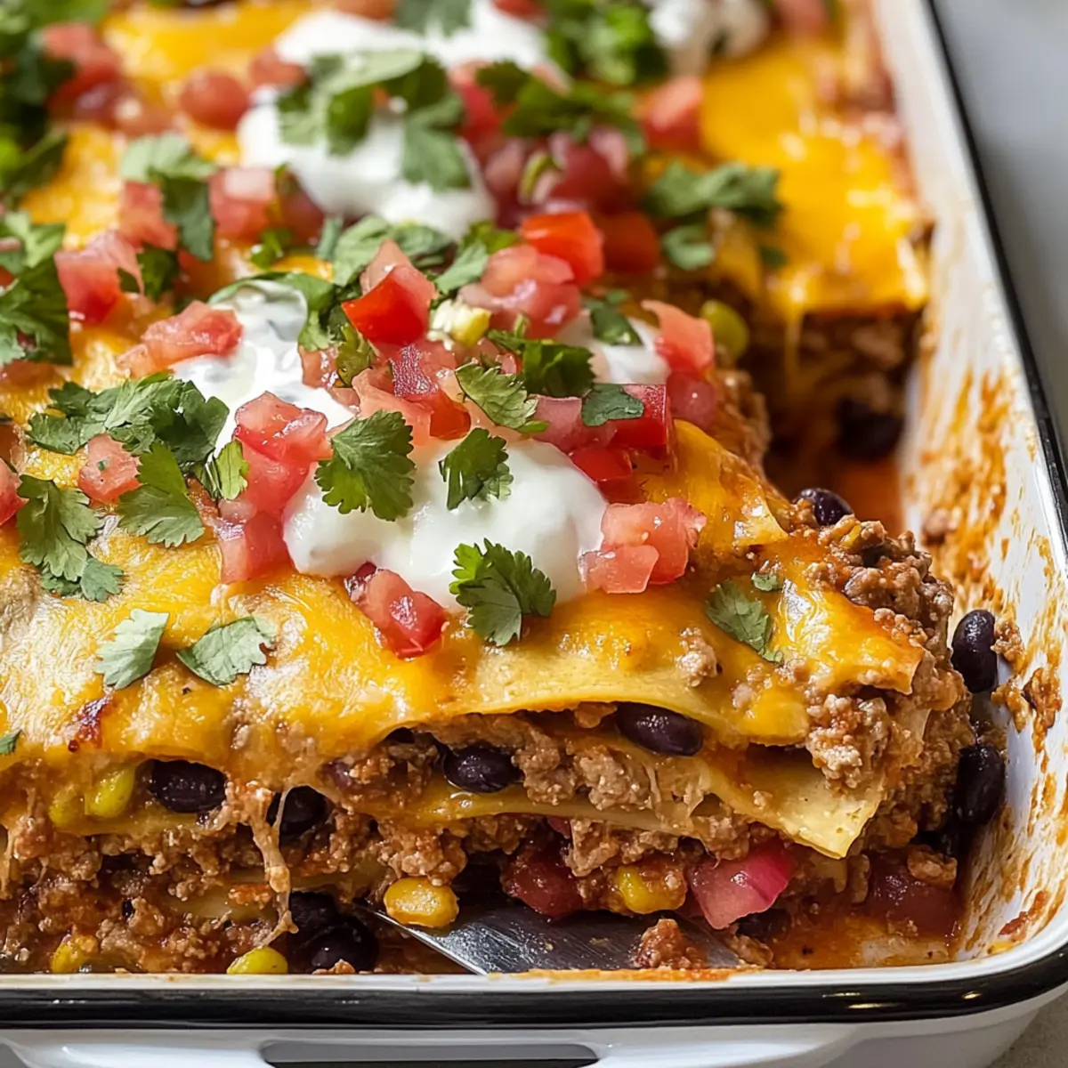 „Ich kann einfach nicht aufhören, von meiner letzten Dinner-Party zu schwärmen! Während wir an einem Tisch voller Lachen und Gesprächen saßen, präsentierte ich mein neuestes Küchenerlebnis: eine herzhafte Taco Lasagne, die alle Erwartungen übertraf. Diese Kombination aus geschmackvollen Tex-Mex-Aromen und cremigen Käseschichten sorgt nicht nur für einen zufriedenen Gaumen, sondern lässt sich auch spielend leicht an verschiedene Ernährungsbedürfnisse anpassen. Egal, ob du nach einer glutenfreien Variante oder einem Rezept ohne Milchprodukte suchst, diese Taco Lasagne bietet dir die perfekte Basis für ein gemütliches Abendessen mit der Familie oder Freunden. Bist du bereit, deine Küche in einen Ort voller köstlicher Düfte zu verwandeln?“ Warum ist Taco Lasagne so beliebt? Herzhafter Genuss: Diese Taco Lasagne vereint die besten Tex-Mex-Aromen und sorgt für ein sicheres Geschmackserlebnis. Einfache Zubereitung: Mit minimalem Aufwand und einfachen Zutaten ist diese Lasagne im Handumdrehen fertig. Anpassungsfähig: Egal ob du glutenfreie Tortillas oder pflanzliche Alternativen verwendest, dieses Rezept lässt sich leicht an verschiedene Vorlieben anpassen. Köstliche Schichtung: Die harmonische Kombination aus schmelzendem Käse, würzigem Fleisch und frischen Zutaten macht jeden Bissen zu einem Genuss. Familienfreundlich: Perfekt für gesellige Abende, sorgt diese Lasagne garantiert für zufriedene Gesichter am Tisch. Kombiniere sie mit einem leckeren Avocado-Tomate-Salat oder probiere dazu einen erfrischenden Cocktail! Länger genießen: Reste können problemlos aufbewahrt und später aufgewärmt werden, sodass du auch nach dem ersten Abendessen noch in den Genuss kommst. Taco Lasagne Zutaten Für die Füllung Pflanzenöl – Ideal zum Fetten der Pfanne und Anbraten von Gemüse; du kannst auch Olivenöl verwenden. Mittlere Zwiebel – Sorgt für Süße und Geschmackstiefe; rote Zwiebeln sind eine mildere Alternative. Paprika – Bringt Farbe und Textur ins Gericht; Zucchini oder Mais können auch hinzugefügt werden. Knoblauch – Verstärkt den Gesamteindruck der Aromen; frischer Knoblauch ist vorzuziehen. Rinderhackfleisch (85% mager) – Hauptproteine, die reichhaltigen Geschmack bieten; für eine leichtere Variante kann es durch Putenhackfleisch oder pflanzliche Brösel ersetzt werden. Für die Würzung Koscheres Salz & schwarzer Pfeffer – Unverzichtbar für die richtige Abgleichung der Aromen; nach Belieben anpassen. Chilipulver – Für den klassischen Taco-Geschmack; je nach persönlichem Schärfeempfinden anpassen. Allzweckmehl – Wird im Taco-Gewürzmix verwendet, um die Füllung zu binden; für glutenfreie Optionen kann auch Maisstärke verwendet werden. Kreuzkümmel – Gibt erdige Untertöne; ein Schlüsselgeschmack für Taco-Gewürze. Für die Lasagne Schwarze Bohnen (15 oz. Dose) – Fügen Ballaststoffe und Volumen hinzu; Kidneybohnen oder Pintobohnen sind auch möglich. Mittelscharfe Salsa (15 oz. Glas) – Als Feuchtigkeits- und geschmackliche Basis; wähle die Schärfe nach deinem Geschmack. Weiche Tortillas (8 Zoll) – Bilden die Schichten der Lasagne; für eine glutenfreie Option kannst du Mais-Tortillas verwenden. Scharfer Cheddar-Käse (8 oz.) – Sorgt für Cremigkeit und Würze; Mozzarella ist eine mildere Alternative. Pepper Jack Käse (8 oz.) – Bringt eine cremige, gewürzte Note; für eine weniger scharfe Variante kannst du nur Cheddar verwenden. Cremiger Mais (14,75 oz. Dose) – Fügt Süße und Feuchtigkeit hinzu; kann weggelassen werden, wenn du eine weniger süße Lasagne möchtest. Für das Topping Sauerrahm, gehackte Tomaten und frischer Koriander – Für den frischen und hellen Abschluss, perfekt zum Servieren. Step-by-Step Instructions for Taco Lasagne Step 1: Ofen vorheizen und Pfanne vorbereiten Heize den Ofen auf 200 °C (400 °F) vor und fette eine 13″x9″ große Auflaufform mit Pflanzenöl ein. Achte darauf, dass die Kante der Form gut eingefettet ist, um ein Anhaften der Zutaten zu verhindern. Der Ofen sollte währenddessen komplett auf Temperatur kommen, um die Taco Lasagne gleichmäßig zu backen. Step 2: Zwiebeln und Paprika anbraten Erhitze etwas Pflanzenöl in einer großen Pfanne bei mittlerer Hitze und füge die gehackten Zwiebeln und Paprika hinzu. Brate diese für etwa 5–7 Minuten, bis die Zwiebeln weich und leicht goldbraun sind. Diese Grundlagen verleihen der Taco Lasagne eine wunderbare Geschmacksbasis und Aromen. Step 3: Knoblauch und Hackfleisch hinzufügen Gebe den gehackten Knoblauch in die Pfanne und füge das Rinderhackfleisch hinzu. Koche alles unter gelegentlichem Rühren für ca. 7–10 Minuten, bis das Fleisch gleichmäßig gebräunt ist. Schöpfe überschüssiges Fett ab, um die Füllung weniger fettig zu machen und den Fokus auf die Aromen zu legen. Step 4: Gewürze einmischen Streue das Chilipulver, das Allzweckmehl und den Kreuzkümmel über das Hackfleisch und die Zwiebelmischung in der Pfanne. Rühre gut um und koche weitere 1–2 Minuten, bis alles gut vermischt ist. Diese Gewürze sind entscheidend für den charakteristischen Geschmack der Taco Lasagne. Step 5: Bohnen und Salsa hinzufügen Füge die schwarzen Bohnen, die Salsa und ein wenig Wasser in die Pfanne hinzu. Rühre gut um und kratze den Boden der Pfanne, um alle köstlichen Aromen zu lösen. Lass die Mischung 2–3 Minuten köcheln, bis sie leicht eingedickt ist und die Aromen sich entfalten. Step 6: Taco Lasagne schichten Beginne mit einer Schicht der Fleischsauce am Boden der großen Auflaufform. Lege dann eine Schicht Tortillas darauf und streue etwas von den Käsesorten darüber. Wiederhole diesen Schichtvorgang, indem du Tortillas, Sauce, und Käse mehrmals abwechselst, bis alle Zutaten aufgebraucht sind, und schließe mit einer Schicht Käse ab. Step 7: Backen der Taco Lasagne Decke die Auflaufform mit Aluminiumfolie ab und backe die Taco Lasagne für 30 Minuten im vorgeheizten Ofen, bis sie blubbert und der Käse gesch