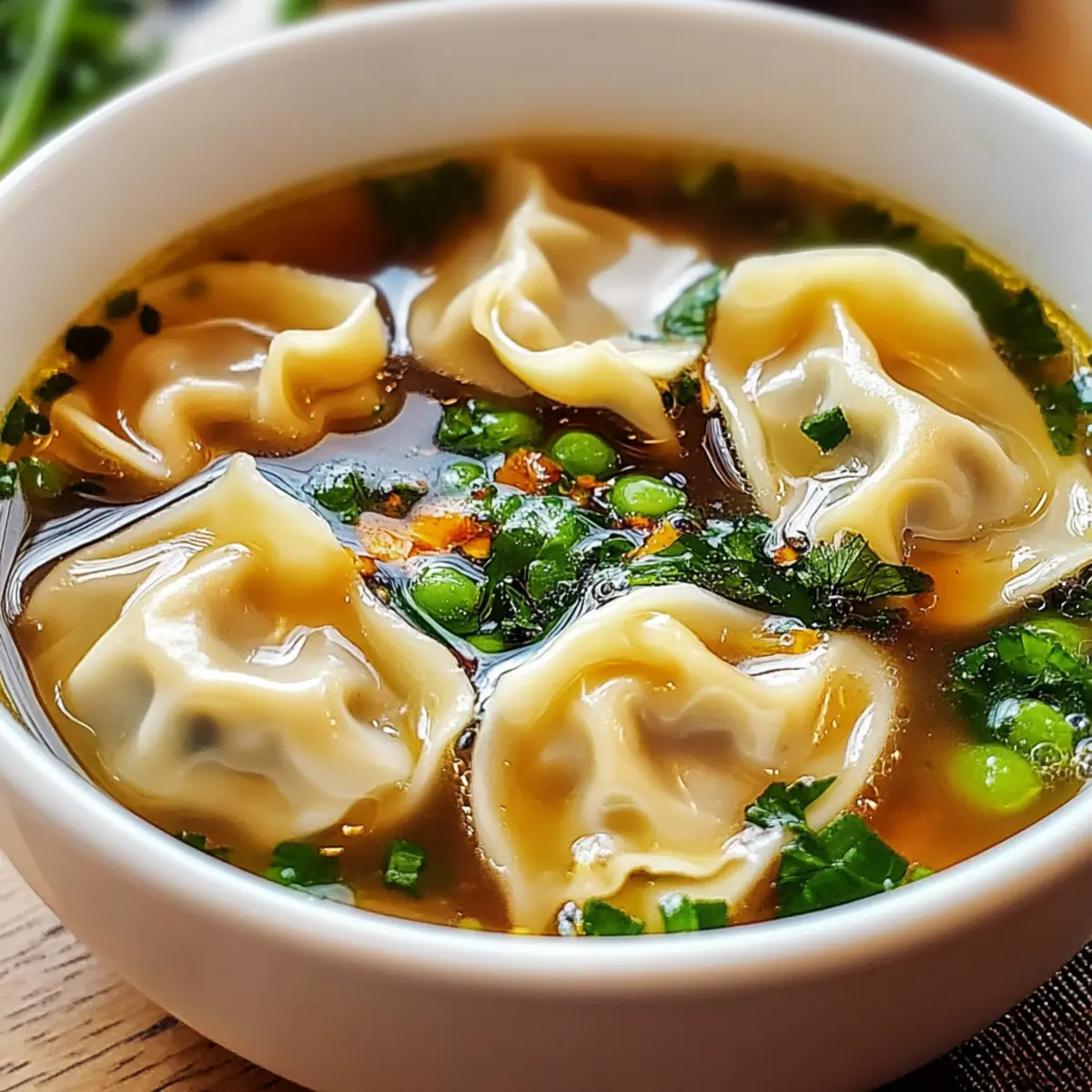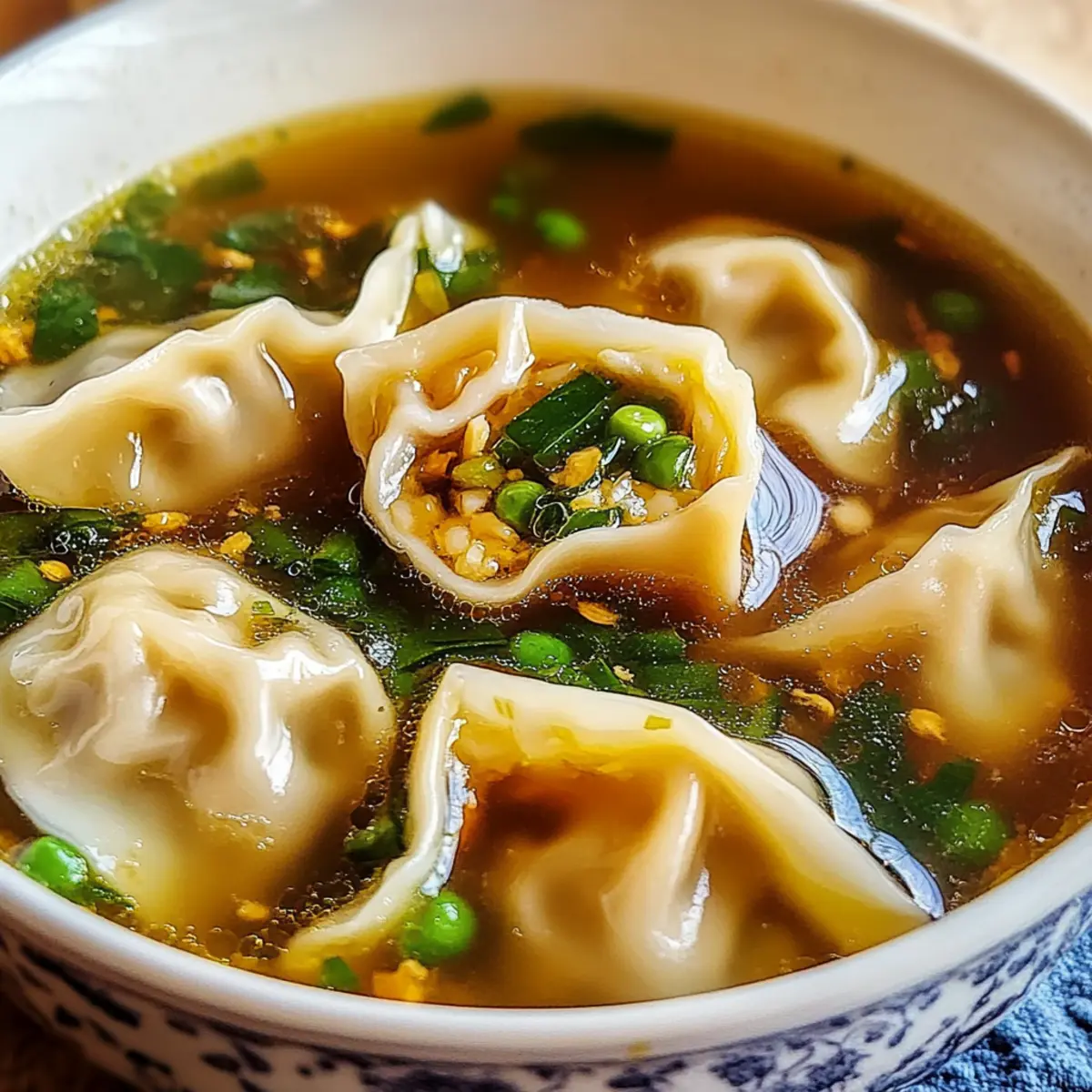 Teigtasche Suppe vereint zarte Teigtaschen mit einer aromatischen Brühe aus Ingwer und Knoblauch für ein wohltuendes Erlebnis.