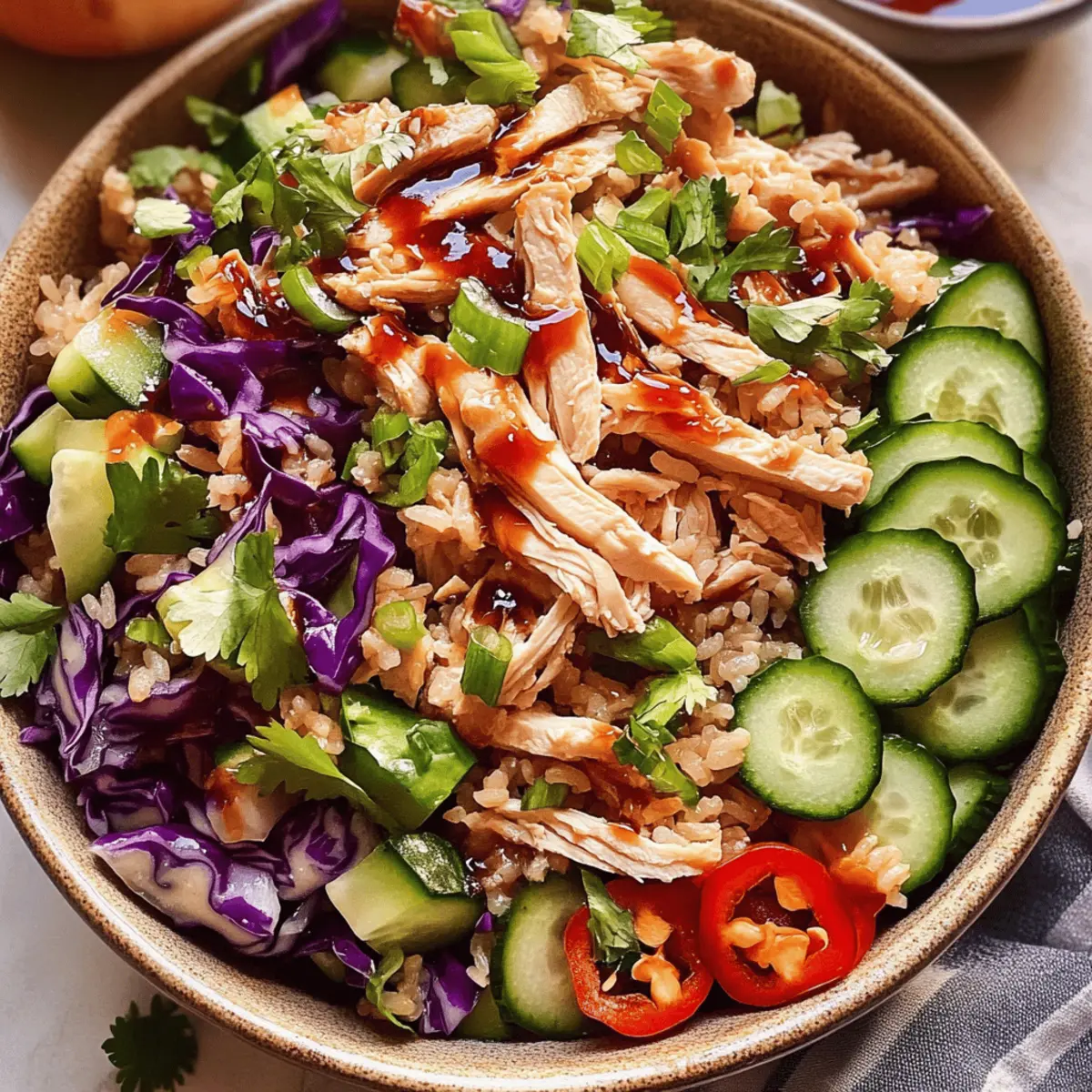 Als ich letztens in meiner Küche stand, um etwas Frisches und Leckeres zu zaubern, fiel mein Blick auf eine Kombination, die einfach unwiderstehlich ist: Teriyaki-Hähnchen-Crispy-Reis-Salat! Diese schnell zuzubereitende, glutenfreie Speise verbindet die süßen und salzigen Aromen des Teriyaki-Hähnchens mit knackigem Gemüse und perfekt gebackenem, knusprigem Reis. Ideal für geschäftige Wochentage, bei denen man dennoch etwas Hausgemachtes genießen möchte, überzeugt dieses Rezept durch seinen einfachen Einsatz von Rotisserie-Hähnchen. Perfekt für Meal Prep oder als leichtes Abendessen – der Genuss ist garantiert! Bereitest du dich darauf vor, deine Familie mit diesem farbenfrohen und nahrhaften Gericht zu begeistern? Lass uns loslegen und das Rezept gemeinsam entdecken! Warum wirst du dieses Rezept lieben? Einfachheit pur: Die Zubereitung erfordert nur grundlegende Kochfähigkeiten und ist damit perfekt für jeden. Vielseitigkeit: Variiere die Zutaten, indem du entweder Shrimps oder Tofu für die Proteinquelle wählst – so bleibt das Gericht spannend! Knusprige Textur: Der perfekt gebackene Reis sorgt für ein herzhaftes Knuspererlebnis, das du lieben wirst. Schnelle Zubereitung: Ein ideales Rezept für geschäftige Tage, das in weniger als 40 Minuten auf deinem Tisch steht. Gesunde Zutaten: Mit frischem Gemüse und einer cremigen Sesamdressing ist jede Portion nicht nur köstlich, sondern auch nahrhaft. Crowd-Pleaser: Perfekt für Familientreffen oder als leichtes Mittagessen – dieser Salat begeistert garantiert jeden! Probiere auch unser schnelles und einfaches Rezept für Teriyaki-Sauce aus, um den Geschmack zu intensivieren! Teriyaki-Hähnchen-Crispy-Reis-Salat Zutaten • Die Hauptzutaten für dieses köstliche Rezept warten auf dich! Für den Reis Gekochter Reis – Basis des Salates; Jasminreis ist ideal, aber jede Reissorte funktioniert. Achte darauf, dass er abgekühlt ist, bevor du ihn bäckst. Sesamöl – Verleiht dem knusprigen Reis einen reichen, nussigen Geschmack. Teriyaki-Sauce (für Reis) – Gibt dem knusprigen Reis eine herzhafte Note; kann hausgemacht oder gekauft sein. Für das Hähnchen Rotisserie-Hähnchen – Die Hauptproteinquelle; einfach zerrupfen für eine schnelle Zubereitung. Teriyaki-Sauce (für Hähnchen) – Verstärkt den Geschmack des Hähnchens und hält es saftig. Für das Gemüse Persische Gurken – Sorgt für Knackigkeit und Frische; kann durch englische Gurken ersetzt werden. Rote Kohle – Fügt Farbe und Textur hinzu; fein geschnitten für bessere Integration. Koriander – Frisches Kraut, das das Gericht aufhellt; kann weggelassen werden, wenn nicht gewünscht. Gesalzene Erdnüsse – Bietet Crunch und Salzigkeit; kann durch andere Nüsse oder Samen ersetzt werden. Rote Paprika – Bringt Süße und Farbe; klein gewürfelt für gleichmäßige Verteilung. Grüne Zwiebeln – Fügt einen milden Zwiebelschmack hinzu; fein gehackt zum gut vermischen. Für das Dressing Olivenöl – Grundlage für das Dressing, hilft beim Emulgieren der Flüssigkeiten. Geröstetes Sesamöl – Vertieft das Geschmacksprofil des Dressings. Sojasauce oder Kokosaminos – Bietet umami Geschmack; benutze Kokosaminos für eine sojafreie Option. Reisessig – Fügt Säure und Frische zum Dressing hinzu. Ahornsirup – Natürliche Süße, die die herzhaften Aromen im Dressing ausgleicht. Cashewbutter – Cremigkeit im Dressing; kann durch Mandelbutter oder Tahini ersetzt werden. Knoblauch – Verleiht ein würziges Aroma; muss zerdrückt werden für gleichmäßige Verteilung. Frischer Ingwer – Fügt Wärme und Gewürz ins Dressing hinzu. Schritt-für-Schritt-Anleitung für Teriyaki-Hähnchen-Crispy-Reis-Salat Step 1: Ofen vorheizen Heize den Ofen auf 200°C vor und lege ein Backblech mit Backpapier aus, um ein Ankleben des Reises zu verhindern. Diese Vorbereitung ist entscheidend, damit dein Teriyaki-Hähnchen-Crispy-Reis-Salat gleichmäßig gebacken wird. Step 2: Reis vorbereiten Koche den Reis und lasse ihn abkühlen, bevor du ihn gleichmäßig auf dem Backblech verteilst. Mische ihn dann mit Sesamöl und Teriyaki-Sauce, um ihm einen herzhaften Geschmack zu verleihen. Diese Kombination ist der Grundstein für die knusprige Reisbasis in deinem Salat. Step 3: Reis backen Backe den vorbereiteten Reis für 30-40 Minuten im vorgeheizten Ofen. Rühre die Mischung nach der Hälfte der Zeit um, damit der Reis gleichmäßig knusprig wird. Achte darauf, dass er goldbraun und knusprig wird, was ihm eine köstliche Textur für den Salat verleiht. Step 4: Hähnchen zerkleinern Entferne die Knochen vom Rotisserie-Hähnchen und zerkleinere das Fleisch in mundgerechte Stücke. Mische das zerkleinerte Hähnchen anschließend mit Teriyaki-Sauce, um es saftig und geschmackvoll zu halten. Dies wird die Hauptproteinquelle für deinen Salat sein. Step 5: Gemüse vorbereiten Hacke die Gurken, den Rotkohl, den Koriander, die grünen Zwiebeln, die Paprika und die gesalzenen Erdnüsse fein. Gib sie in eine große Schüssel, um eine bunte und frische Basis für deinen Salat zu schaffen. Diese knackigen Zutaten verleihen dem Teriyaki-Hähnchen-Crispy-Reis-Salat eine herrliche Frische. Step 6: Salat zusammenstellen Füge das zerkleinerte Hähnchen und den knusprigen Reis zur vorbereiteten Gemüsemischung hinzu. Mische alles vorsichtig, damit die Zutaten gleichmäßig verteilt werden und ein harmonisches Geschmacksprofil entsteht. Der Salat wird dadurch schön bunt und einladend. Step 7: Dressing zubereiten Vermenge die Dressing-Zutaten – Olivenöl, geröstetes Sesamöl, Sojasauce oder Kokosaminos, Reisessig, Ahornsirup, Cashewbutter, zerdrückten Knoblauch und frischen Ingwer – in einem Mixer. Püriere die Mischung, bis sie schön cremig ist. Dies verleiht deinem Teriyaki-Hähnchen-Crispy-Reis-Salat eine aromatische Tiefe. Step 8: Salat kombinieren Gieße das Dressing über den vorbereiteten Salat und vermische alles gut, sodass das Gemüse, Hähnchen und der knusprige Reis gle