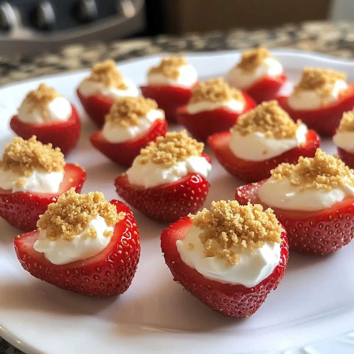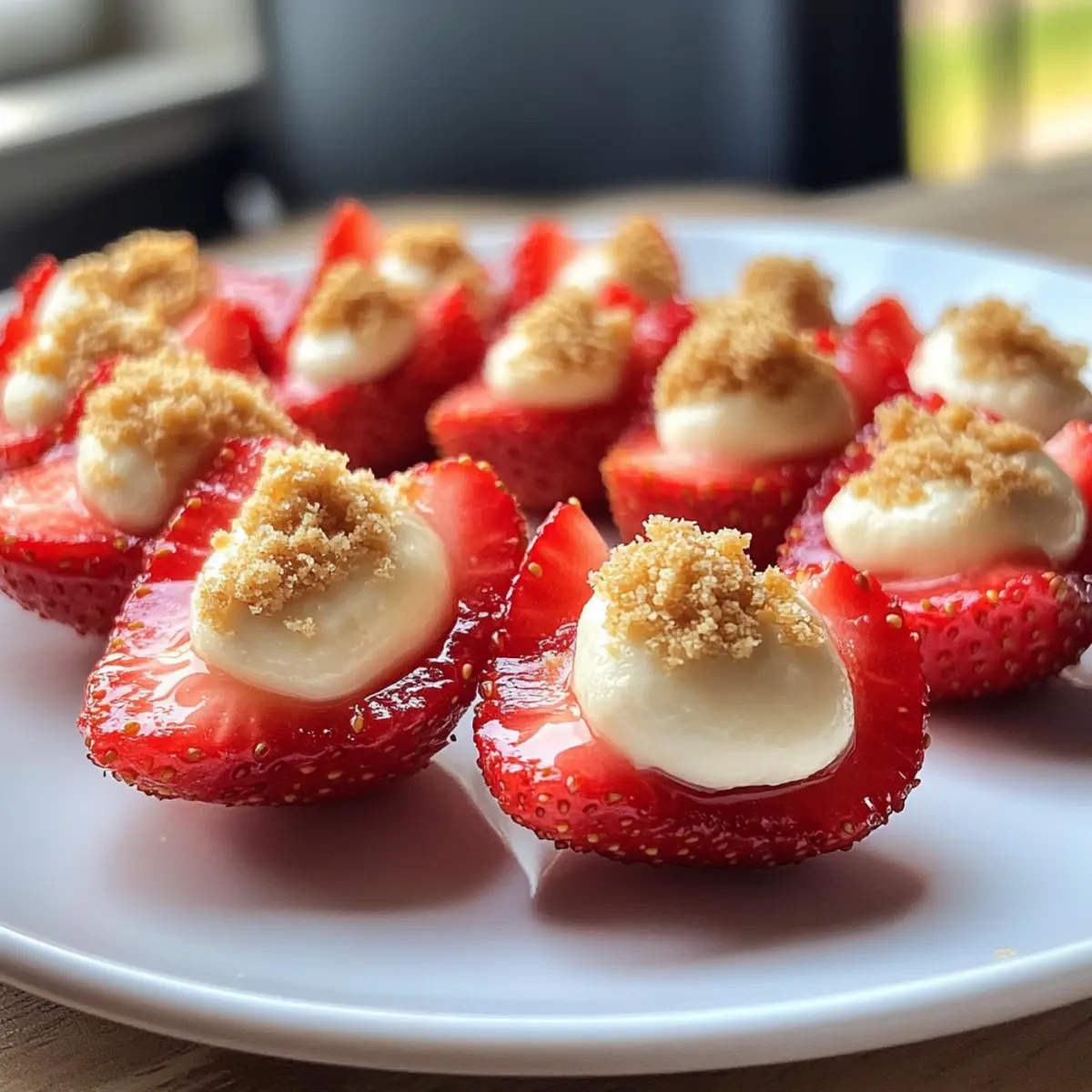 Stellen Sie sich vor, Sie beißen in eine süße, saftige Erdbeere, die innen von einer himmlischen Käsekuchen-Creme gefüllt ist – das ist genau das, was Ihnen bei unseren Teufelserdbeeren erwartet! Diese köstlichen kleinen Häppchen kombinieren die angesagten Aromen eines klassischen Erdbeerkäsekuchens und verwandeln sie in einen einfach zuzubereitenden Snack, der Ihre Gäste begeistern wird. Mit einer luftigen Füllung aus Frischkäse und einem knackigen Topping aus Graham-Cracker-Streuseln sind sie nicht nur eine Augenweide, sondern auch eine wunderbare Option für jede Party oder ein Potluck. Wer kann da schon widerstehen? Neugierig, wie Sie dieses verführerische Rezept nachkochen können? Warum sind Teufelserdbeeren so beliebt? Einfachheit: Die Zubereitung dieser Teufelserdbeeren ist kinderleicht und erfordert keine komplizierten Zutaten oder Techniken. Aromatische Füllung: Die Kombination aus süßer Käsekuchen-Creme und frischen Erdbeeren bringt das Beste aus beiden Welten zusammen. Optisches Highlight: Ihre leuchtenden Farben und die ansprechende Präsentation machen diese Häppchen zum Mittelpunkt jeder Feier. Vielseitigkeit: Ob als Dessert oder Fingerfood, sie passen zu jeder Gelegenheit – von zwanglosen Zusammenkünften bis hin zu eleganten Partys. Zeitersparnis: Bereiten Sie die Füllung einen Tag zuvor vor und füllen Sie die Erdbeeren kurz vor dem Servieren, um Zeit zu sparen. Keto-freundlich: Mit Ersatzstoffen können diese Leckereien auch zuckerfrei zubereitet werden, sodass sie für verschiedene Diäten geeignet sind. Teufelserdbeeren Zutaten • Diese Zutaten machen Ihre Teufelserdbeeren unwiderstehlich! Für die Füllung: Erdbeeren – Diese süßen, saftigen Früchte bilden die Basis, verwenden Sie 18-24 große Erdbeeren. Schlagsahne – Sie sorgt für eine luftige und cremige Konsistenz in der Füllung; kann durch eine pflanzliche Alternative ersetzt werden. Frischkäse – Die Hauptzutat für die Füllung, die den typischen Käsekuchen-Geschmack verleiht; verwenden Sie weichen Frischkäse für eine einfachere Verarbeitung. Saurer Rahm – Macht die Füllung cremiger und verleiht eine angenehme Säure; kann weggelassen werden, wenn eine weniger saure Note gewünscht ist. Weißer Zucker – Sorgt für die nötige Süße; lässt sich auch durch einen kohlenhydratarmen Süßstoff für zuckerfreie Varianten ersetzen. Vanilleextrakt – Ergänzt die Füllung um eine warme Note; verwenden Sie reinen Vanilleextrakt für die besten Ergebnisse. Frischer Zitronensaft – Optional, bringt einen spritzigen Geschmack, der die Süße unterstreicht. Graham-Cracker-Brösel – Für das Topping, das Textur und den Geschmack einer klassischen Käsekuchenkruste hinzufügt; kann durch gemahlene Nüsse für eine glutenfreie Option ersetzt werden. Schritt-für-Schritt-Anleitung für Teufelserdbeeren mit Cheesecake-Füllung Step 1: Erdbeeren vorbereiten Waschen Sie 18–24 große Erdbeeren gründlich und entfernen Sie die Stiele. Halten Sie die Erdbeeren auf einer stabilen Oberfläche und schneiden Sie sie vorsichtig in der Mitte durch. Mit einem Melonenportionierer höhlen Sie eine kleine Sektion aus jeder Erdbeere aus, um Platz für die luftige Cheesecake-Füllung zu schaffen. Stellen Sie die vorbereiteten Erdbeeren auf einen Servierteller. Step 2: Sahne schlagen In einer mittelgroßen Schüssel schlagen Sie die Schlagsahne mit einem elektrischen Mixer bei hoher Geschwindigkeit für etwa 5 Minuten, bis steife Spitzen entstehen. Achten Sie darauf, dass die Sahne fest, aber nicht übergeschlagen ist. Die fluffige Konsistenz der Sahne wird später die Teufelserdbeeren leicht und luftig machen. Step 3: Füllung anrühren In einer separaten Schüssel kombinieren Sie den weichgemachten Frischkäse, den sauren Rahm, den Zucker, den Vanilleextrakt und den frischen Zitronensaft. Mischen Sie alles gut mit einem Handmixer oder einem Schneebesen, bis eine glatte, cremige Konsistenz entsteht. Diese Füllung wird die Hauptattraktion Ihrer Teufelserdbeeren sein! Step 4: Mischungen kombinieren Sobald die Füllung glatt ist, fügen Sie vorsichtig die geschlagene Sahne hinzu. Verwenden Sie einen Teigschaber, um die Sahne sanft unter die Frischkäsemischung zu heben, bis alles gut vermischt ist. Seien Sie behutsam, um die Luftigkeit der Sahne nicht zu verlieren, die Ihrer Cheesecake-Füllung die perfekte Leichtigkeit verleiht. Step 5: Füllung auftragen Füllen Sie einen Spritzbeutel mit der Cheesecake-Füllung. Setzen Sie eine große Sterntülle an die Spitze des Beutels, um einen hübschen Effekt zu erzielen. Spritzen Sie die Füllung großzügig in jede halbierte Erdbeere. Sorgen Sie dafür, dass die Füllung leicht über den Rand der Erdbeere quillt, um eine ansprechende Präsentation zu erzielen. Step 6: Dekorieren und Servieren Streuen Sie die Graham-Cracker-Brösel gleichmäßig über die gefüllten Erdbeeren, um einen extra Crunch zu erzeugen. Anrichten Sie die Teufelserdbeeren auf einem schönen Servierteller und servieren Sie sie sofort oder stellen Sie sie bis zum Servieren im Kühlschrank kühl. Diese frischen, schmackhaften Teufelserdbeeren sind eine wunderbare Ergänzung für jede Feier! Teufelserdbeeren Variationen & Alternativen Lassen Sie Ihrer Kreativität freien Lauf und passen Sie dieses Rezept nach Ihrem Geschmack an! Schokoladige Füllung: Fügen Sie Kakao-Pulver zur Frischkäsefüllung hinzu, um einen reichhaltigen, schokoladigen Genuss zu erzeugen. Die Kombination aus Schokolade und Erdbeere ist unwiderstehlich. Fruchtige Akzente: Experimentieren Sie mit verschiedenen Fruchtpürees, wie Mango oder Himbeere, die der Füllung eine fruchtige Note verleihen können. So erhalten die Teufelserdbeeren eine erfrischende Wendung. Nussige Crunch: Ersetzen Sie die Graham-Cracker-Brösel durch gehackte Nüsse oder Mandeln für extra Knusprigkeit und einen nussigen Geschmack. Das gibt den Erdbeeren eine neue Textur und bessert das Aroma. Keto-Option: Verwenden Sie einen kalorienfreien